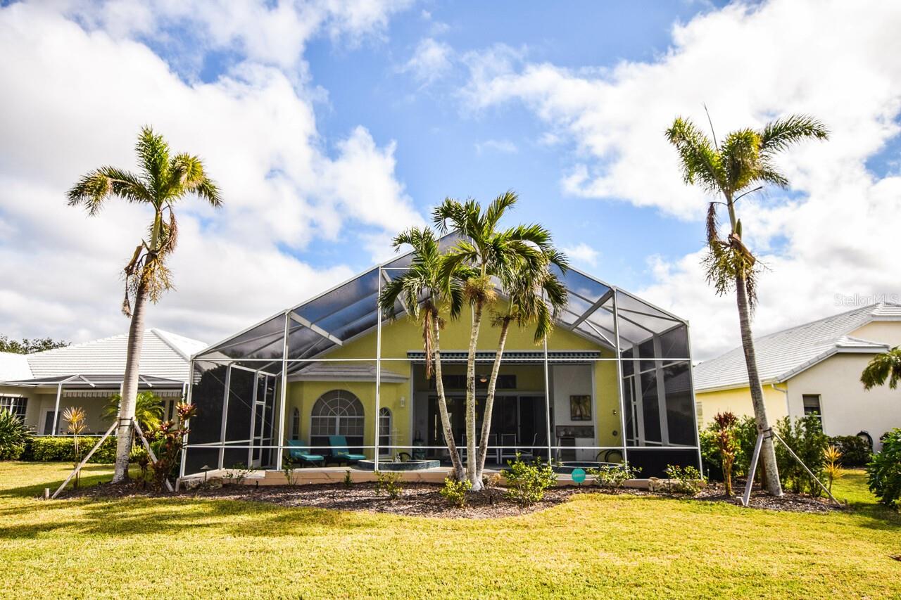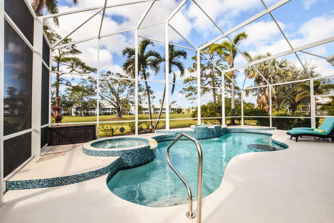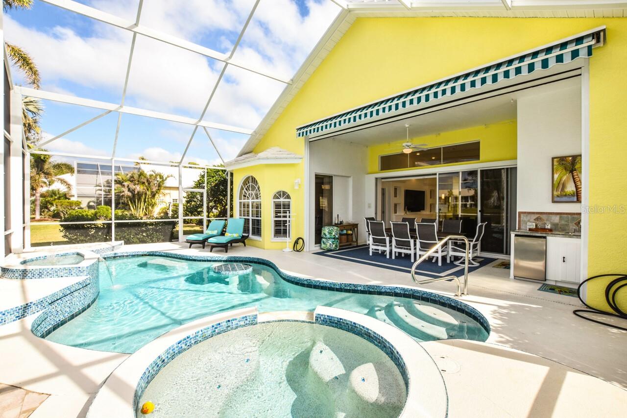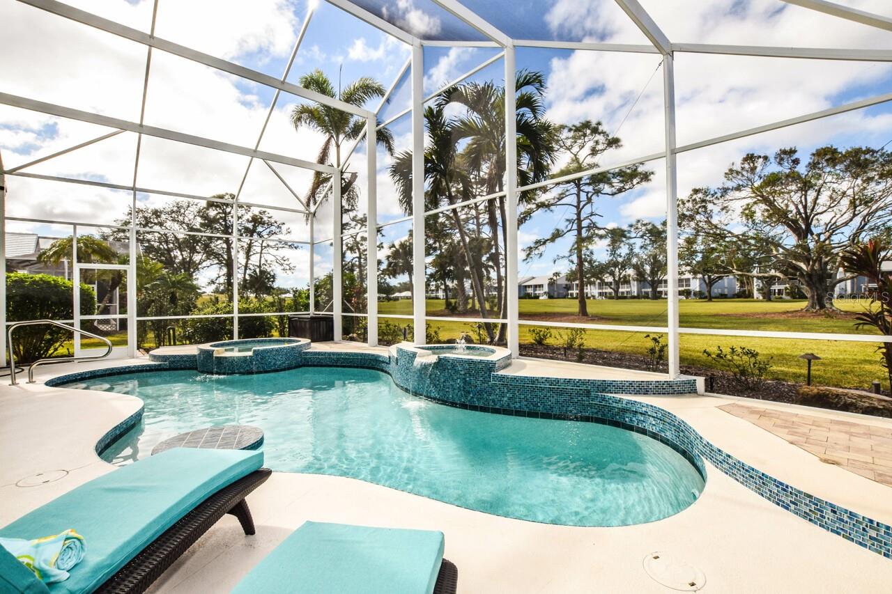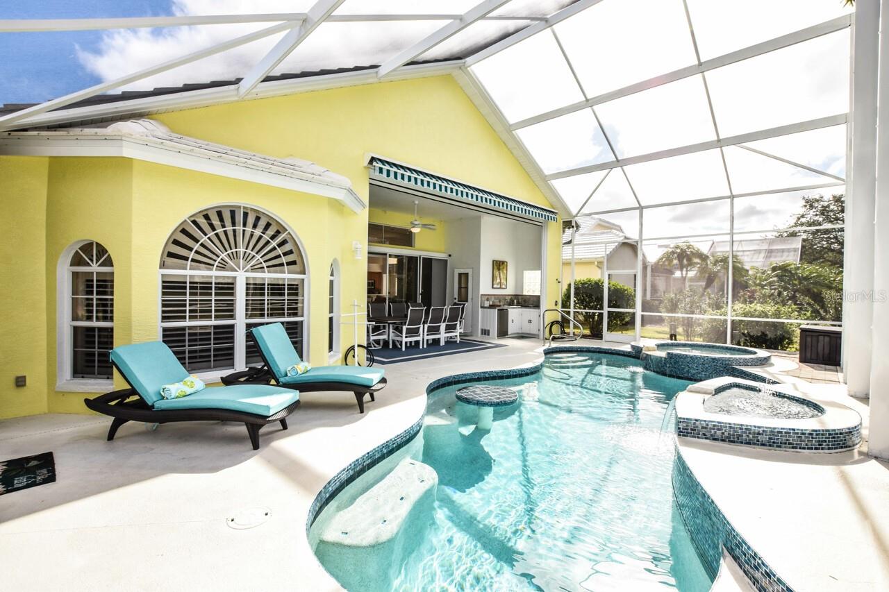 Welcome to this stunning pool home with a wonderful golf course view. This meticulously maintained home boasts freshly painted walls and ceilings, brand new landscape around home and all new sod, new landscape lighting and irrigation heads (2024). Brand new plantation shutters throughout the home, fresh paint on walls and ceilings, new lighting, and let us not forget the completely renovated pool (2024). The pool was resurfaced with glass tile sparkles for added reflection, beautiful glass tile walls, spa and fountain. Newer pool pump and reconditioned pool heater. You will feel relaxation the minute you open the front doors to the open dining and living room. The view of the 2nd hole on Bobcat at the Plantation Golf and Country Club is a showstopper. Unwind in the pool’s spa, grab or drink or grill out by the outdoor kitchen or just sit on the in-pool bar seating. Open the brand-new retractable awning or extend the living room TV to catch the game. The design elements in this home are worth your perusal. The new electronic hurricane blind descends with the touch of a button to protect this home from weather and also can be used as a sunshade for those who seek it. The primary bedroom is located poolside, complete with a beautiful ensuite bathroom features a jetted tub, separate walk-in dual head shower, double sinks, enclosed water closet, linen closet and a large walk-in closet. All bedrooms have new (2025) antimicrobial carpet and pads. Bedroom 2 has built-in closet and wonderful view and Bedroom 3 has ample storage and can also be used as an office/sitting room. The kitchen is full of light and open to the living room has a reverse osmosis system, wine rack cupboard and undercabinet lighting. The eat-in banquette is a great place to relax on custom cushions and provides added storage. Conveniently located to this space is an office/butler’s pantry/mudroom. The 2 car garage has ample storage with access to attic storage. This home was previously loved by 2 new retirees that embraced this home and are sure you will too. Give it a look! The Plantation area is a wonderful place, the people here are so friendly. It’s a great place to learn to be retired, learn new things, find wonderful friendships, and embrace life. It all starts here! See you soon!