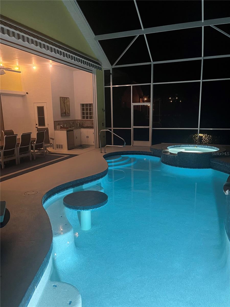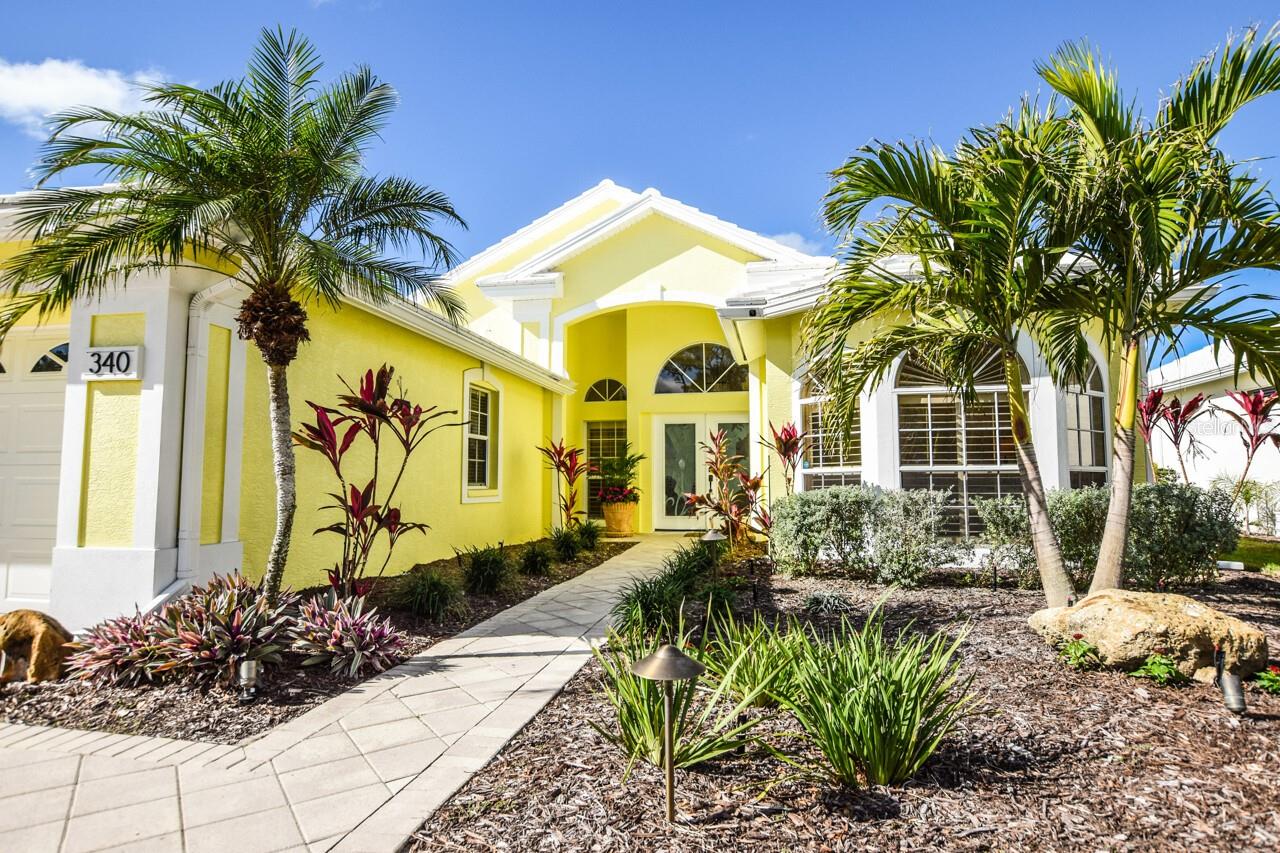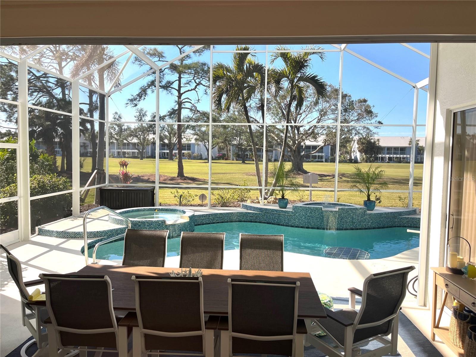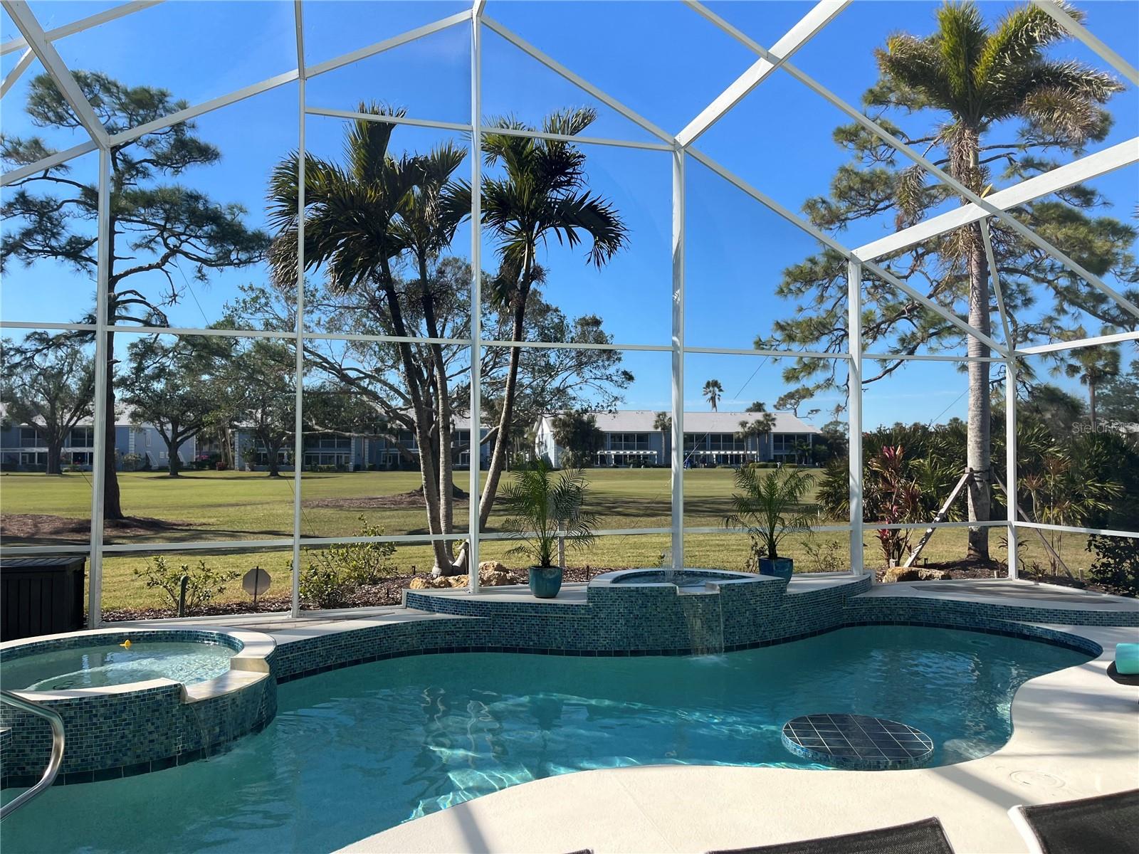 Welcome to this stunning pool home with a wonderful golf course view. This meticulously maintained home boasts freshly painted walls and ceilings, brand new landscape around home and all new sod, new landscape lighting and irrigation heads (2024). Brand new plantation shutters throughout the home, fresh paint on walls and ceilings, new lighting, and let us not forget the completely renovated pool (2024). The pool was resurfaced with glass tile sparkles for added reflection, beautiful glass tile walls, spa and fountain. Newer pool pump and reconditioned pool heater. You will feel relaxation the minute you open the front doors to the open dining and living room. The view of the 2nd hole on Bobcat at the Plantation Golf and Country Club is a showstopper. Unwind in the pool’s spa, grab or drink or grill out by the outdoor kitchen or just sit on the in-pool bar seating. Open the brand-new retractable awning or extend the living room TV to catch the game. The design elements in this home are worth your perusal. The new electronic hurricane blind descends with the touch of a button to protect this home from weather and also can be used as a sunshade for those who seek it. The primary bedroom is located poolside, complete with a beautiful ensuite bathroom features a jetted tub, separate walk-in dual head shower, double sinks, enclosed water closet, linen closet and a large walk-in closet. All bedrooms have new (2025) antimicrobial carpet and pads. Bedroom 2 has built-in closet and wonderful view and Bedroom 3 has ample storage and can also be used as an office/sitting room. The kitchen is full of light and open to the living room has a reverse osmosis system, wine rack cupboard and undercabinet lighting. The eat-in banquette is a great place to relax on custom cushions and provides added storage. Conveniently located to this space is an office/butler’s pantry/mudroom. The 2 car garage has ample storage with access to attic storage. This home was previously loved by 2 new retirees that embraced this home and are sure you will too. Give it a look! The Plantation area is a wonderful place, the people here are so friendly. It’s a great place to learn to be retired, learn new things, find wonderful friendships, and embrace life. It all starts here! See you soon!