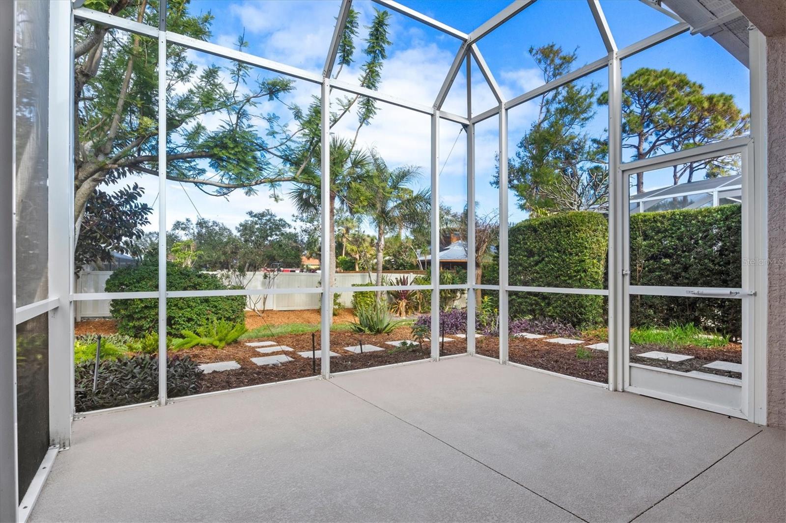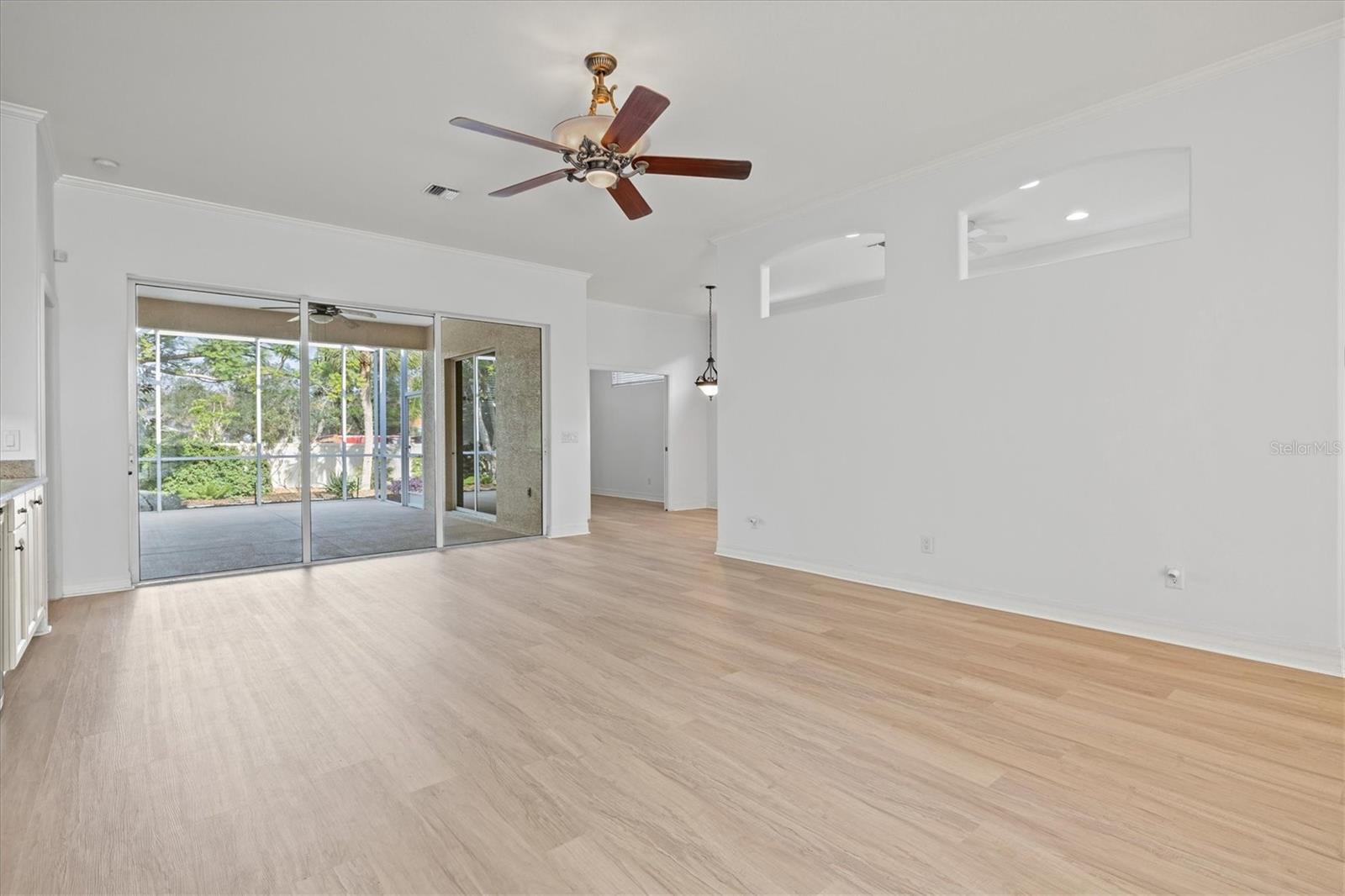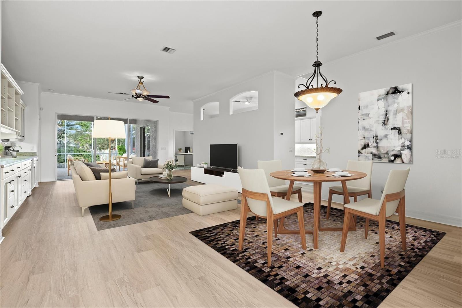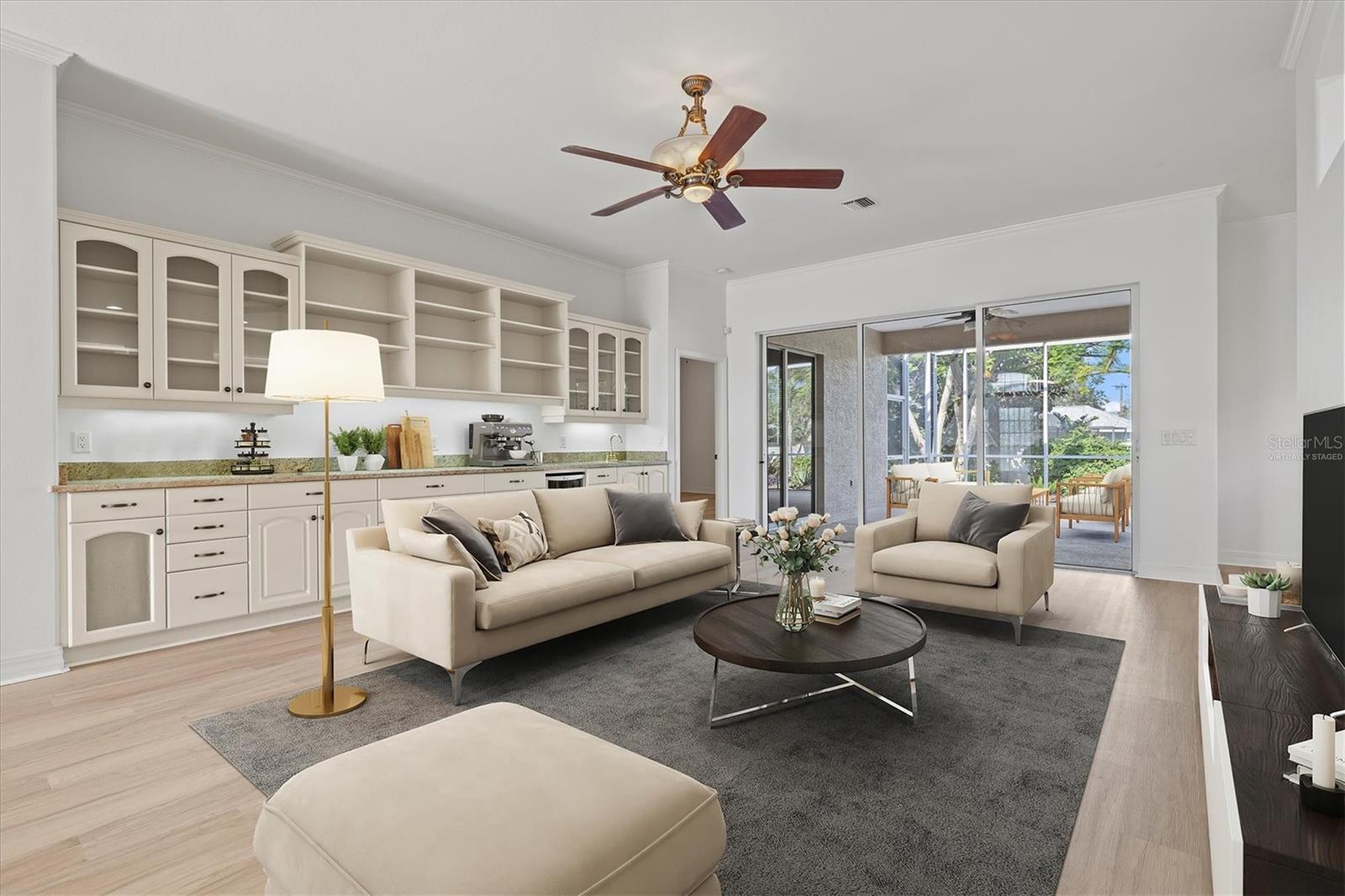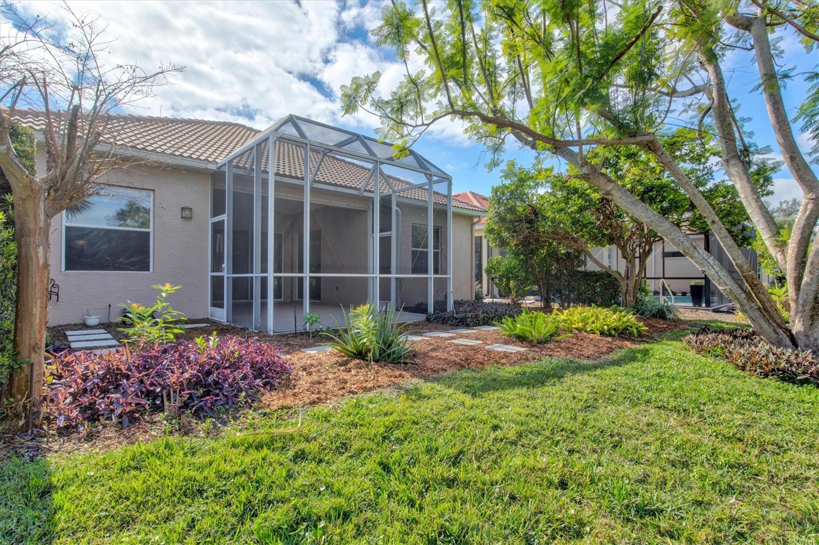 One or more photo(s) has been virtually staged. Classic Florida Elegance Meets Modern Comfort in the Heart of Venice! Nestled on the coveted Island of Venice, this spacious and contemporary home offers a perfect blend of classic Florida charm and modern design. Just minutes from shopping, dining, entertainment, and a host of outdoor activities, this home is ideally located to take full advantage of everything the Island lifestyle has to offer. From the moment you arrive, you’ll notice this home’s eye-catching curb appeal. A pair of elegant rain-glass double entry doors set the tone for the luxurious interior that awaits. Inside, you’re welcomed by an expansive open floor plan highlighted by soaring 10-foot ceilings, crown molding, and brand-new luxury vinyl plank flooring throughout. Perfectly crafted for gatherings, the open great room and dining room provide a spacious setting for family and friends to relax, dine, and socialize. A custom-built entertainment center, featuring a wet bar and wine cooler, doubles as a functional buffet and offers ample storage space. The kitchen is thoughtfully separated from the main living area by a privacy wall, allowing the chef to work their magic but still feel part of any gathering. With white Shaker V-Groove cabinetry, under-cabinet lighting, tile countertops and backsplash, and newer stainless-steel appliances, it’s a space that combines beauty and function. A cozy dining nook and bright den, complete with double pocket doors and sliding glass doors to the lanai, further enhance the home's charm and flow. The primary suite is a private sanctuary, featuring direct access to the covered lanai and views of lush Florida landscaping. Two large walk-in closets, a separate water closet, and a spacious vanity offer both comfort and convenience, while the walk-around shower is the perfect place to unwind. Two additional guest bedrooms and a guest bath are positioned at the front of the home, with a pocket door that can be closed for privacy. Three sets of sliders lead to an expansive covered lanai and extended screened patio, creating an inviting outdoor living space that spans an impressive 25’ x 13’. The serene setting is perfect for relaxation or entertaining, and there’s ample space to add a pool or spa if desired. Lovingly maintained by the original owner, this home is move-in ready. Upgrades include new luxury vinyl plank flooring, fresh interior paint, hurricane fabric for the lanai and front doors, a whole-house water filter, and a new water heater installed in 2017. Have peace of mind regarding insurance knowing the property was constructed to newer building codes, is located above the high-risk flood plain, and has a good 4-Point Inspection as well. Amora is a quaint deed-restricted community of just 21 homes with low monthly fees that cover lawn maintenance, yard pest control, tree and shrub trimming, irrigation maintenance, and irrigation water. Just a short stroll or bike ride away, you'll find a marina, a variety of restaurants, and the scenic Venetian Waterway Trail. Historic Downtown Venice and the Gulf beaches are only 1.5 miles away, offering endless opportunities for fun and relaxation. Amora offers a rare opportunity to experience the best of Venice Island living in a landscape maintenance-free environment with a low-cost HOA and no CDD fees. Homes in this community rarely come on the market, so don’t miss your chance to call this special place home!