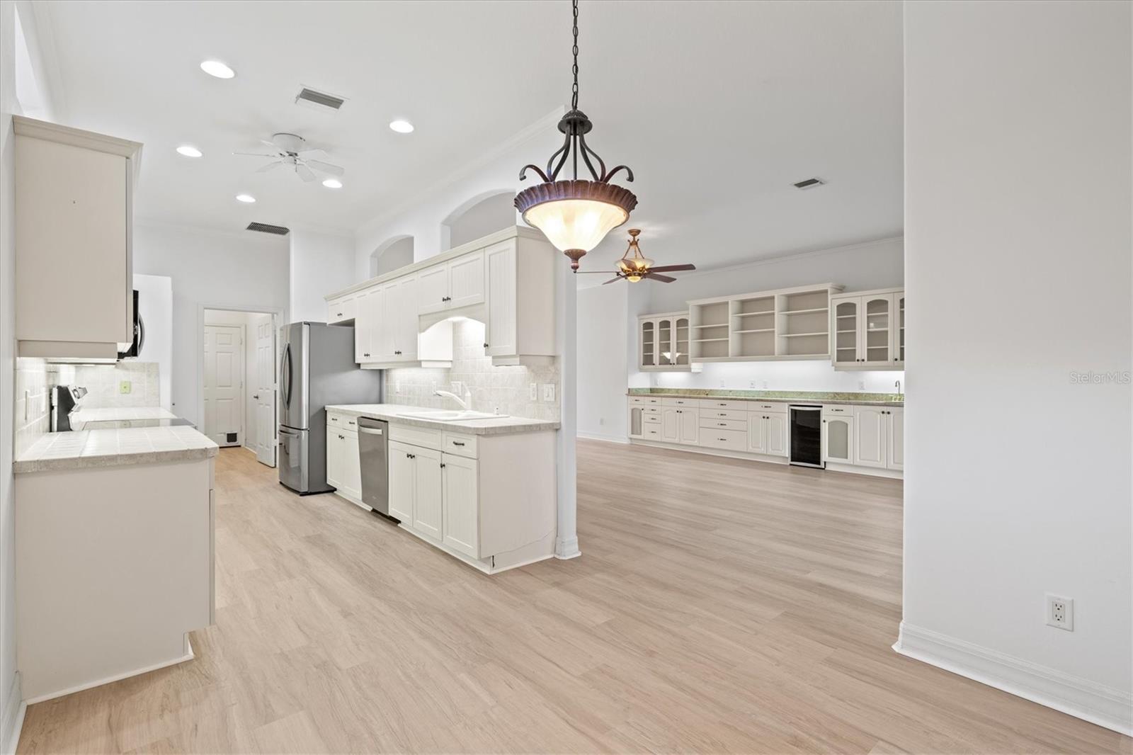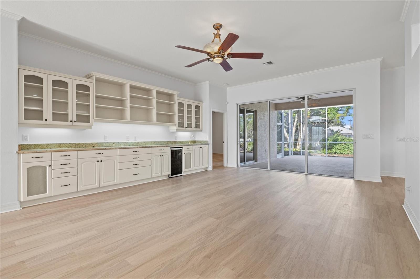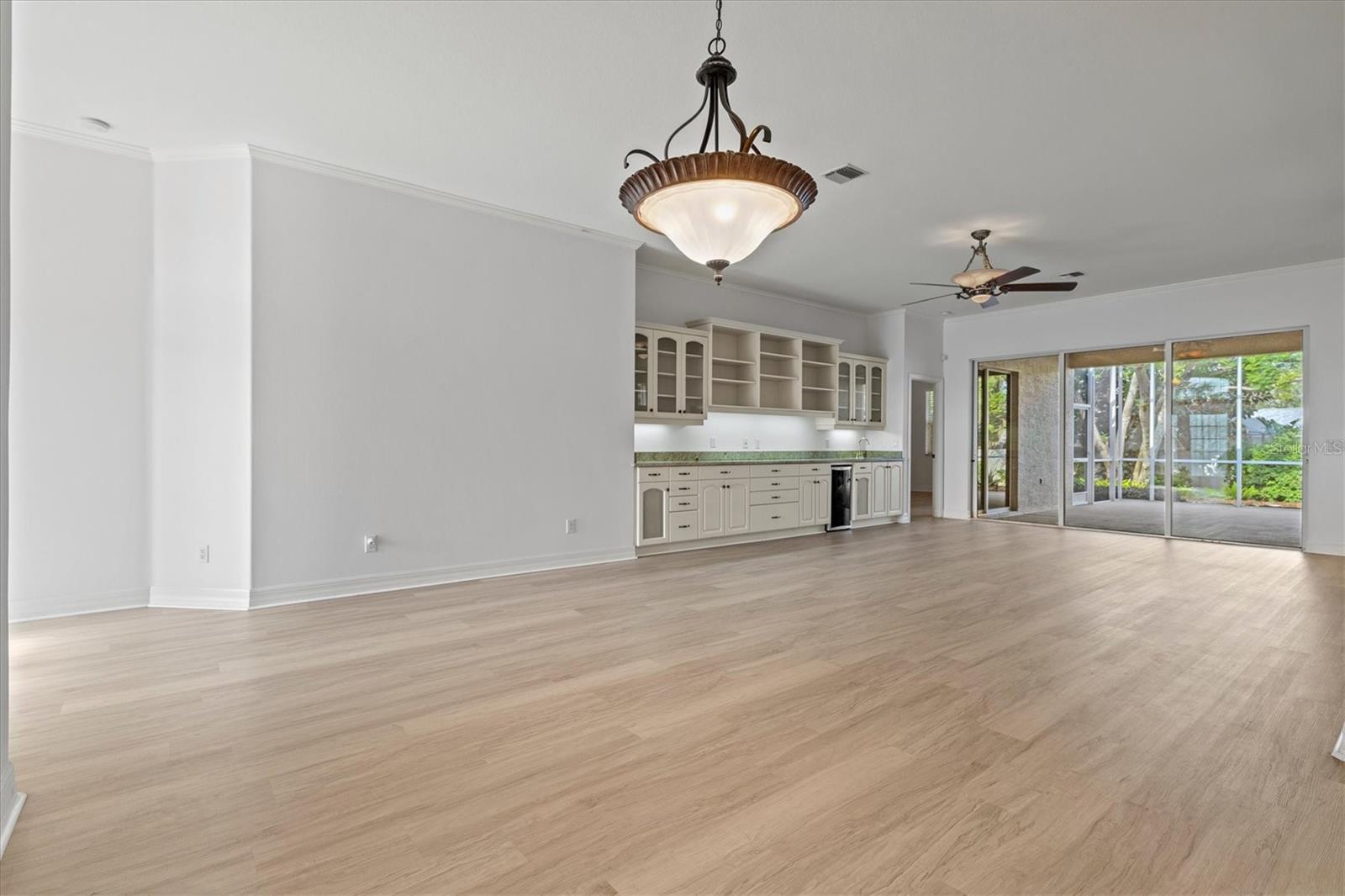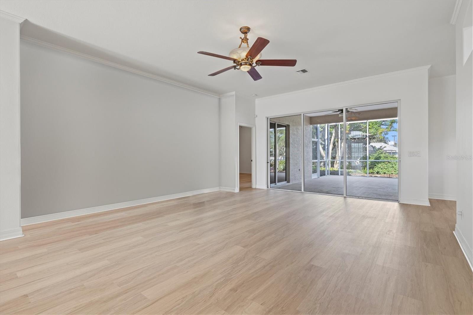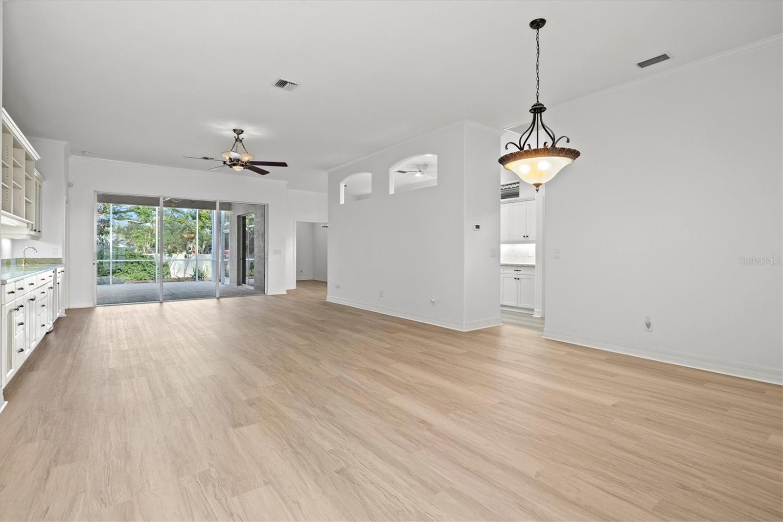 One or more photo(s) has been virtually staged. Classic Florida Elegance Meets Modern Comfort in the Heart of Venice! Nestled on the coveted Island of Venice, this spacious and contemporary home offers a perfect blend of classic Florida charm and modern design. Just minutes from shopping, dining, entertainment, and a host of outdoor activities, this home is ideally located to take full advantage of everything the Island lifestyle has to offer. From the moment you arrive, you’ll notice this home’s eye-catching curb appeal. A pair of elegant rain-glass double entry doors set the tone for the luxurious interior that awaits. Inside, you’re welcomed by an expansive open floor plan highlighted by soaring 10-foot ceilings, crown molding, and brand-new luxury vinyl plank flooring throughout. Perfectly crafted for gatherings, the open great room and dining room provide a spacious setting for family and friends to relax, dine, and socialize. A custom-built entertainment center, featuring a wet bar and wine cooler, doubles as a functional buffet and offers ample storage space. The kitchen is thoughtfully separated from the main living area by a privacy wall, allowing the chef to work their magic but still feel part of any gathering. With white Shaker V-Groove cabinetry, under-cabinet lighting, tile countertops and backsplash, and newer stainless-steel appliances, it’s a space that combines beauty and function. A cozy dining nook and bright den, complete with double pocket doors and sliding glass doors to the lanai, further enhance the home's charm and flow. The primary suite is a private sanctuary, featuring direct access to the covered lanai and views of lush Florida landscaping. Two large walk-in closets, a separate water closet, and a spacious vanity offer both comfort and convenience, while the walk-around shower is the perfect place to unwind. Two additional guest bedrooms and a guest bath are positioned at the front of the home, with a pocket door that can be closed for privacy. Three sets of sliders lead to an expansive covered lanai and extended screened patio, creating an inviting outdoor living space that spans an impressive 25’ x 13’. The serene setting is perfect for relaxation or entertaining, and there’s ample space to add a pool or spa if desired. Lovingly maintained by the original owner, this home is move-in ready. Upgrades include new luxury vinyl plank flooring, fresh interior paint, hurricane fabric for the lanai and front doors, a whole-house water filter, and a new water heater installed in 2017. Have peace of mind regarding insurance knowing the property was constructed to newer building codes, is located above the high-risk flood plain, and has a good 4-Point Inspection as well. Amora is a quaint deed-restricted community of just 21 homes with low monthly fees that cover lawn maintenance, yard pest control, tree and shrub trimming, irrigation maintenance, and irrigation water. Just a short stroll or bike ride away, you'll find a marina, a variety of restaurants, and the scenic Venetian Waterway Trail. Historic Downtown Venice and the Gulf beaches are only 1.5 miles away, offering endless opportunities for fun and relaxation. Amora offers a rare opportunity to experience the best of Venice Island living in a landscape maintenance-free environment with a low-cost HOA and no CDD fees. Homes in this community rarely come on the market, so don’t miss your chance to call this special place home!
