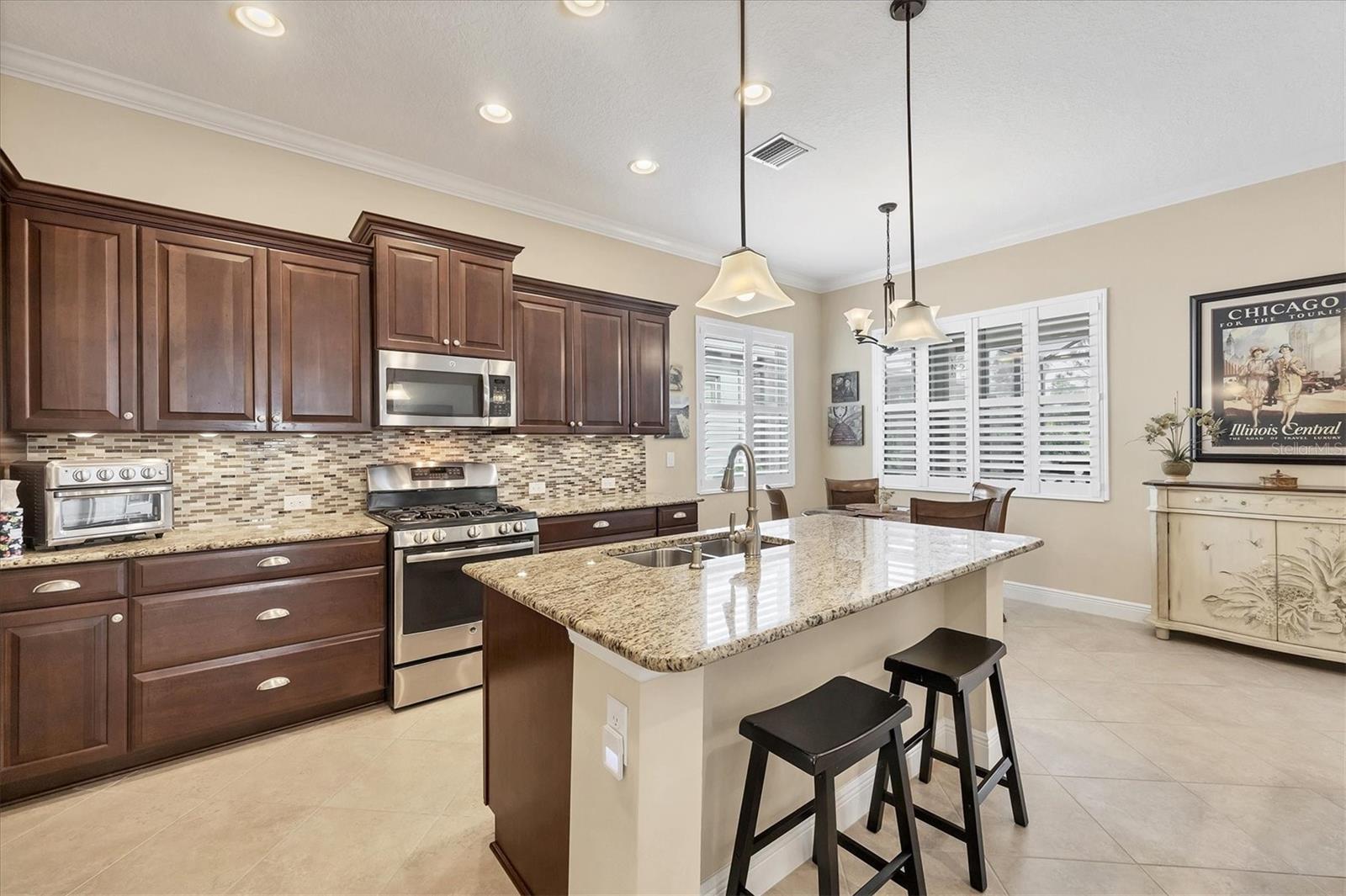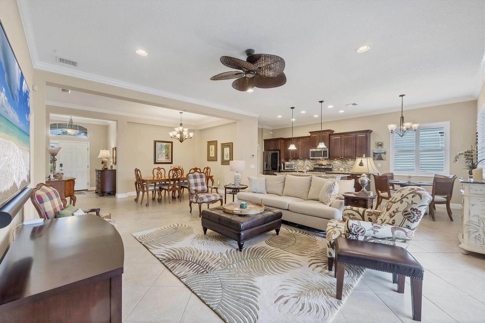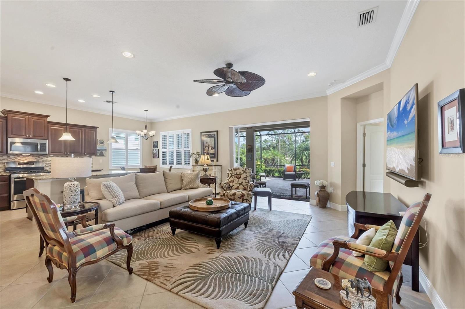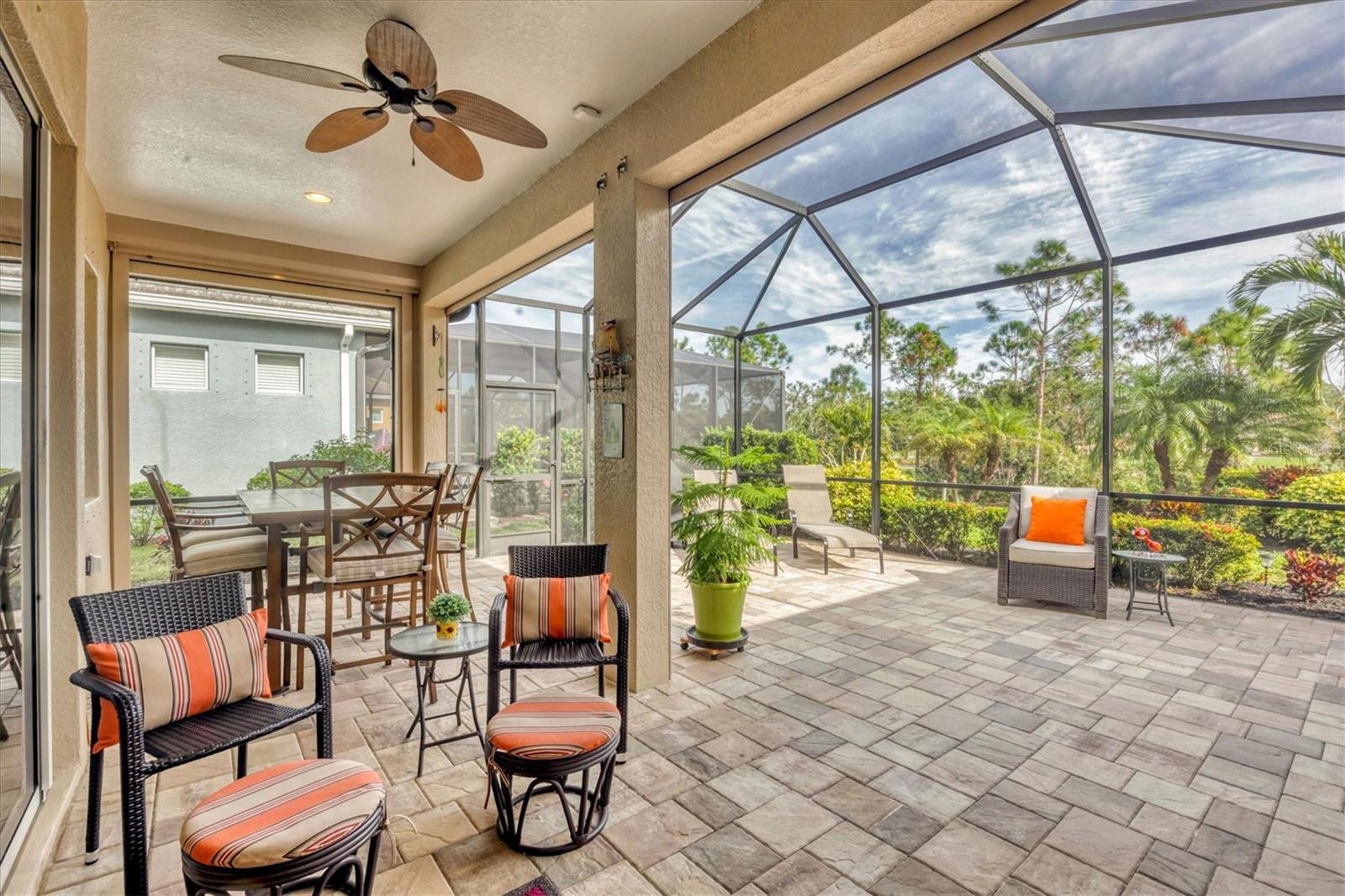Welcome to this exquisite 3-bedroom, 2-bathroom home with a dedicated office, offering a lifestyle of comfort and elegance. From the moment you arrive, you'll be captivated by the impeccable curb appeal—lush palm trees, vibrant shrubs, and colorful flowers surround both the front and back of the property, creating a true tropical oasis that welcomes you home. Step inside to discover an immaculate interior where pride of ownership shines through. The owners have meticulously maintained every detail, ensuring the home is in pristine condition. The spacious great room offers the perfect layout for easy living, with a dining area flowing seamlessly into the living area and a beautifully appointed kitchen to one side. The kitchen is a chef's delight, featuring numerous updates, including a corner pantry, a sleek Moen faucet, a gas range for precise cooking, upgraded cabinets and hardware, additional drawers for convenience, and a stylish backsplash that ties it all together. The great room is designed for effortless entertaining, with pocket sliding doors that lead out to a vast 26' x 26' lanai. Whether you want to dine al fresco, relax with a good book, entertain guests, or perhaps add a hot tub, the lanai offers plenty of space for it all. The primary suite is nothing short of a dream. It features a wide entry hallway leading into a spacious bathroom with a beautiful walk-in shower, a large bedroom and two generous walk-in closets. Practicality meets luxury with a well-equipped laundry room, complete with cabinets for storage and a convenient laundry tub. For your peace of mind, the home has Storm Smart Motorized Hurricane Shades on the lanai and front entrance, and slide in hurricane protection on all the windows. Located in Grand Palm, which is a gorgeous community with a focus on nature and preservation of the natural landscape. Enjoy the natural vegetation and palm trees along the curved streets. Grand Palm has a few lakes with the largest being 32 acres, where you can kayak and paddleboard. There’s storage at the lake to store your kayak and paddleboard. They make it easy to stay healthy with miles of walking paths and bicycle trails, and a 10-acre Exploration Park. This home is located in The Cove which has a heated pool with a grill/barbeque area for use by the 85 homes located in there. Homes in The Cove also have lawn care, landscape care, and irrigation provided. There’re 3 other community pools in Grand Palm, along with two clubhouses, pickleball, tennis, basketball, beach volleyball, a large gym, dog park, splash pad, and more. Kayak or paddleboard on the 32-acre lake which has storage for kayaks and paddleboards. Also, enjoy nearby Downtown Wellen Park with daily entertainment, shopping and restaurants, along with walking paths and bike trails. The Cool Today Park is within a few miles... this is the spring training stadium for the Atlanta Braves, plus it has additional entertainment year long. A short drive will have you at the beautiful Gulf of Mexico beaches and/or in historical downtown Venice with numerous shops, restaurants, along with a theater, art galleries, wine bars, and more. Motivated seller, bring an offer.