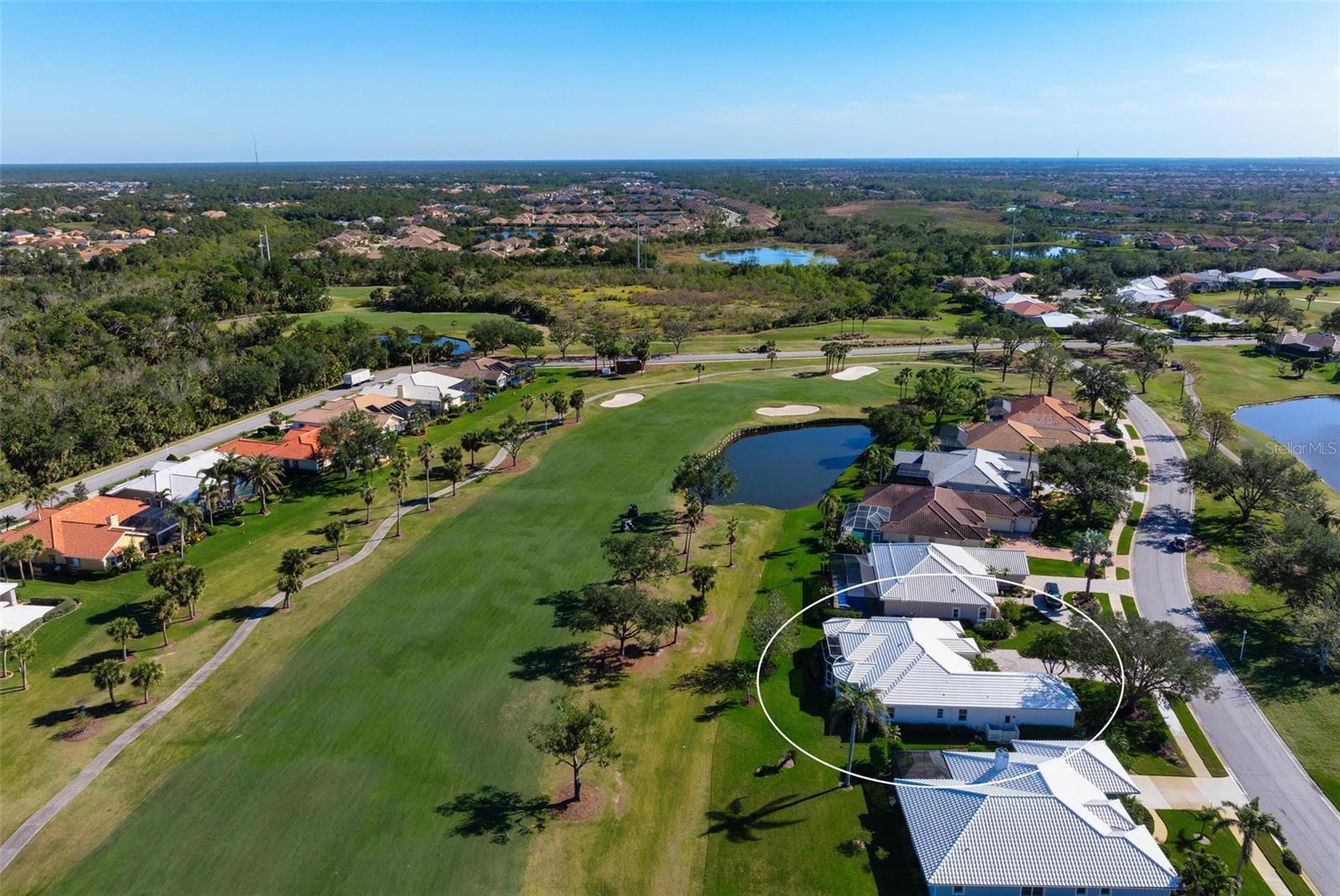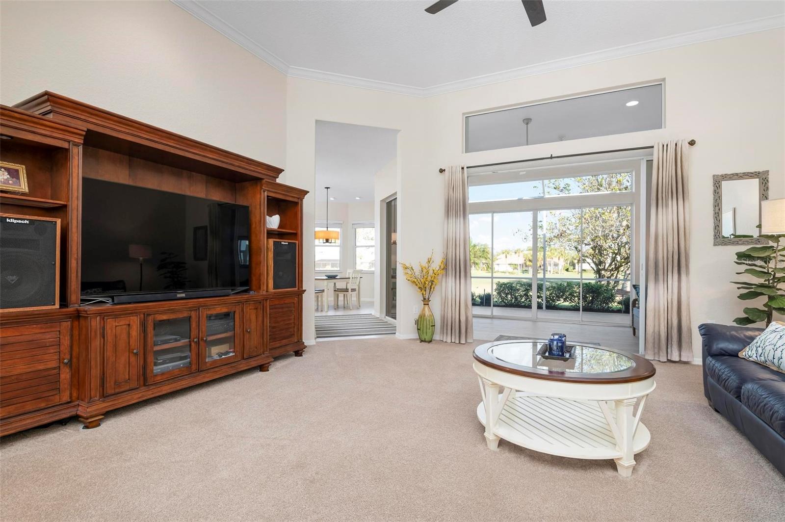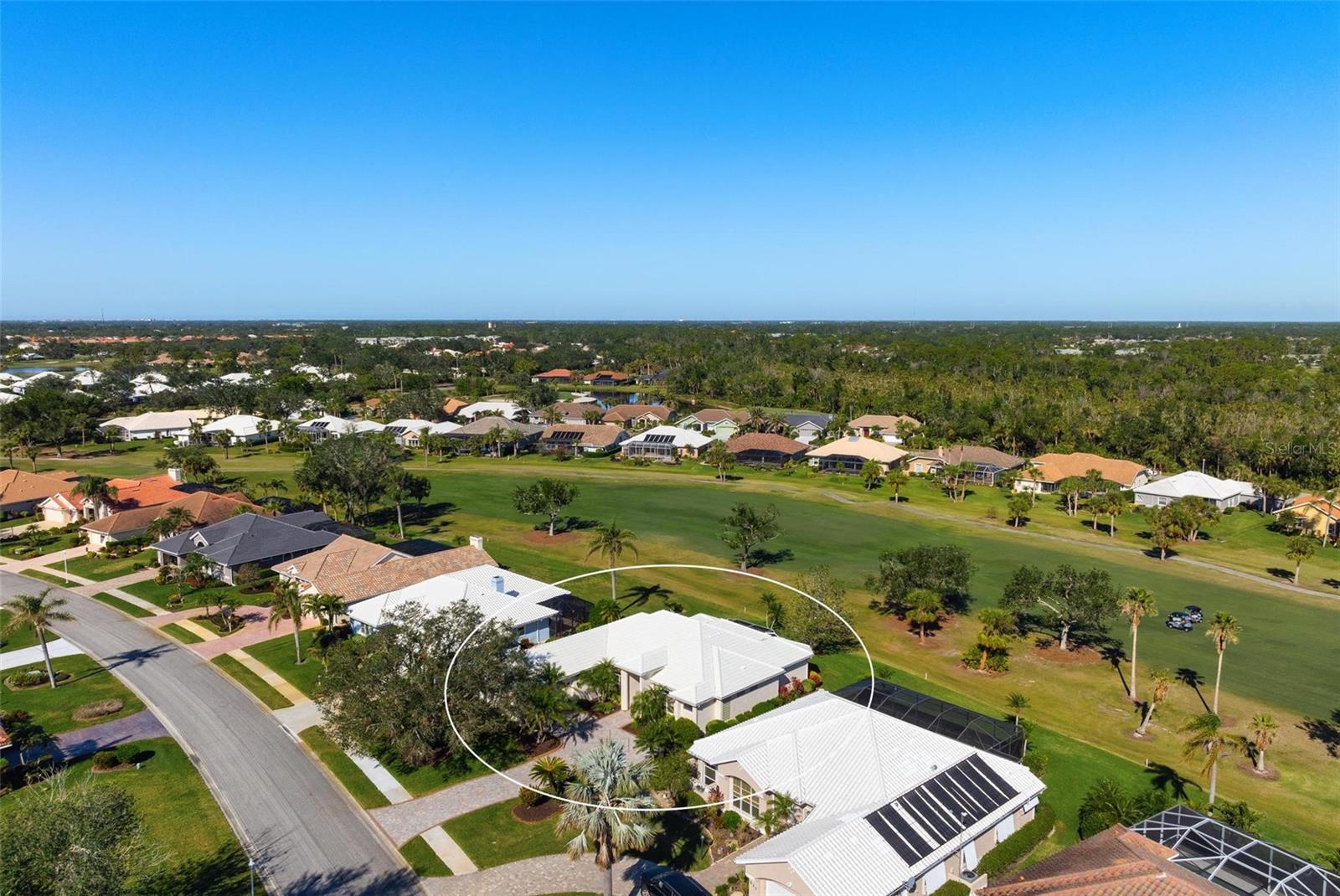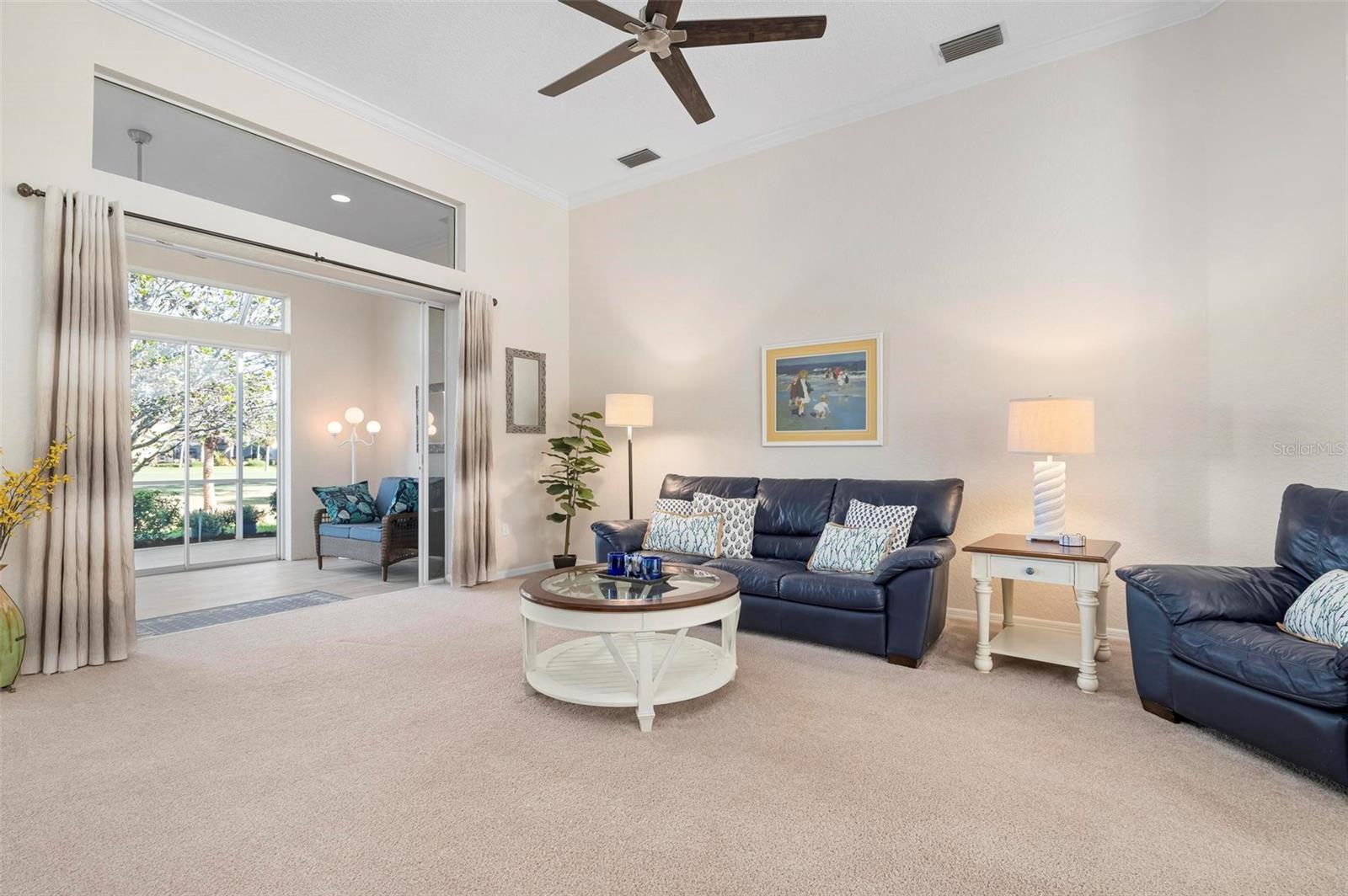 Premier Custom Country Club Home located in the highly desirable gated Governors Green neighborhood at The Plantation offers the lifestyle you desire. From the moment you arrive, you will be engaged by the meticulous care and attention this home has experienced, starting with the gorgeous paver driveway and mature tropical landscaping leading to the beautiful leaded glass entry door. Beyond the entry and spacious great room with its 12 foot ceilings, you'll love this home's sun-splashed split plan creating the perfect flow for entertaining family and guests. Walls of glass open to the tiled Florida sun-room and screened lanai, where you will enjoy expansive golf views of the 16th fairway of the Panther golf course. There's plenty of room for a pool if you decide to add one in the future. The great room plan offers volume 12 foot and 10 foot ceilings throughout the 3 large bedrooms, 2 ½ baths, formal dining room, spacious breakfast room, large and bright kitchen with lots of cabinet space, large pantry, and stainless steel appliances, plus the pleasant den/office for working at home or hiding away curled up with a good book. The large bay windows of the breakfast room and the master suite allow panoramic views of the golf course. Storage is never a problem with 11 closets and a super-sized 2+ car garage, perfect for storing your Florida beach toys. Rest easy knowing the home has full storm protection. Recent upgrades include new appliances and AC in 2023, new roof in 2018, HWH in 2020, and exterior paint, paver driveway, and ceiling lights and fans in 2024. Although membership in The Plantation Golf and Country Club is not mandatory, their two premier golf courses, tennis facilities, pool, and dining are a golfer’s paradise and the best of country club living. For the non-golfers, the beauty of the courses and the neighborhood certainly add to the charm of this delightful home. Located minutes from Historic Venice Island with its quaint shops, dining, beaches, biking/walking trails, fishing, performing arts center, and other cultural venues, and easy access to I-75 for quick trips to Sarasota and area airports.