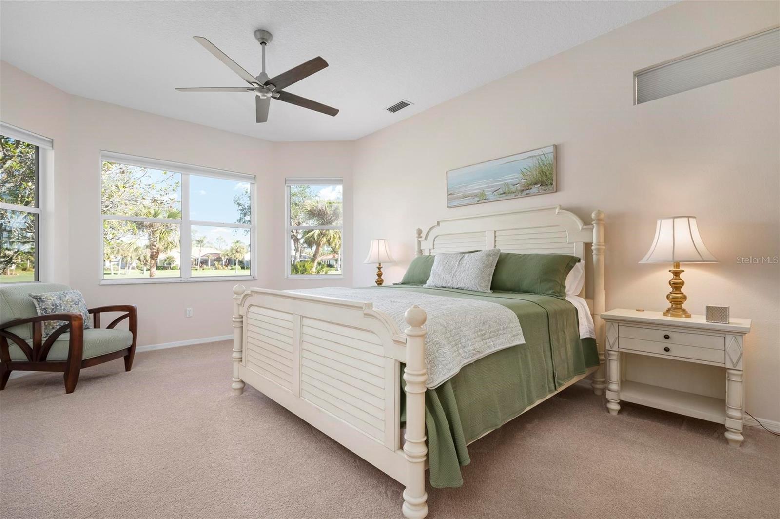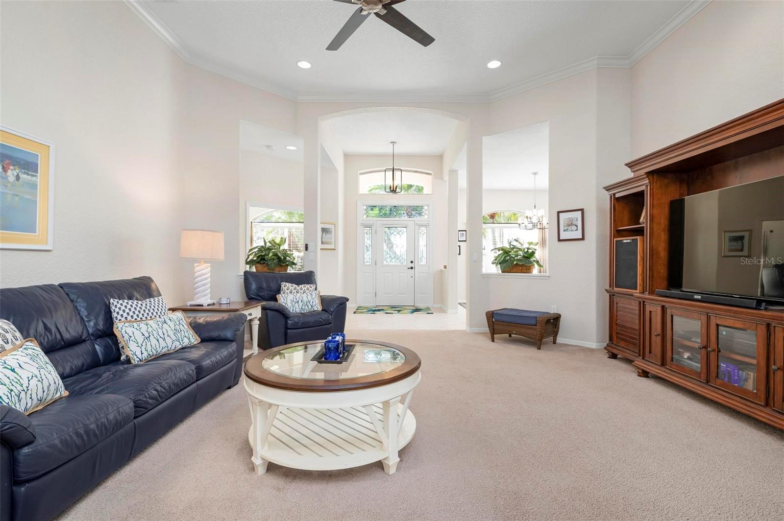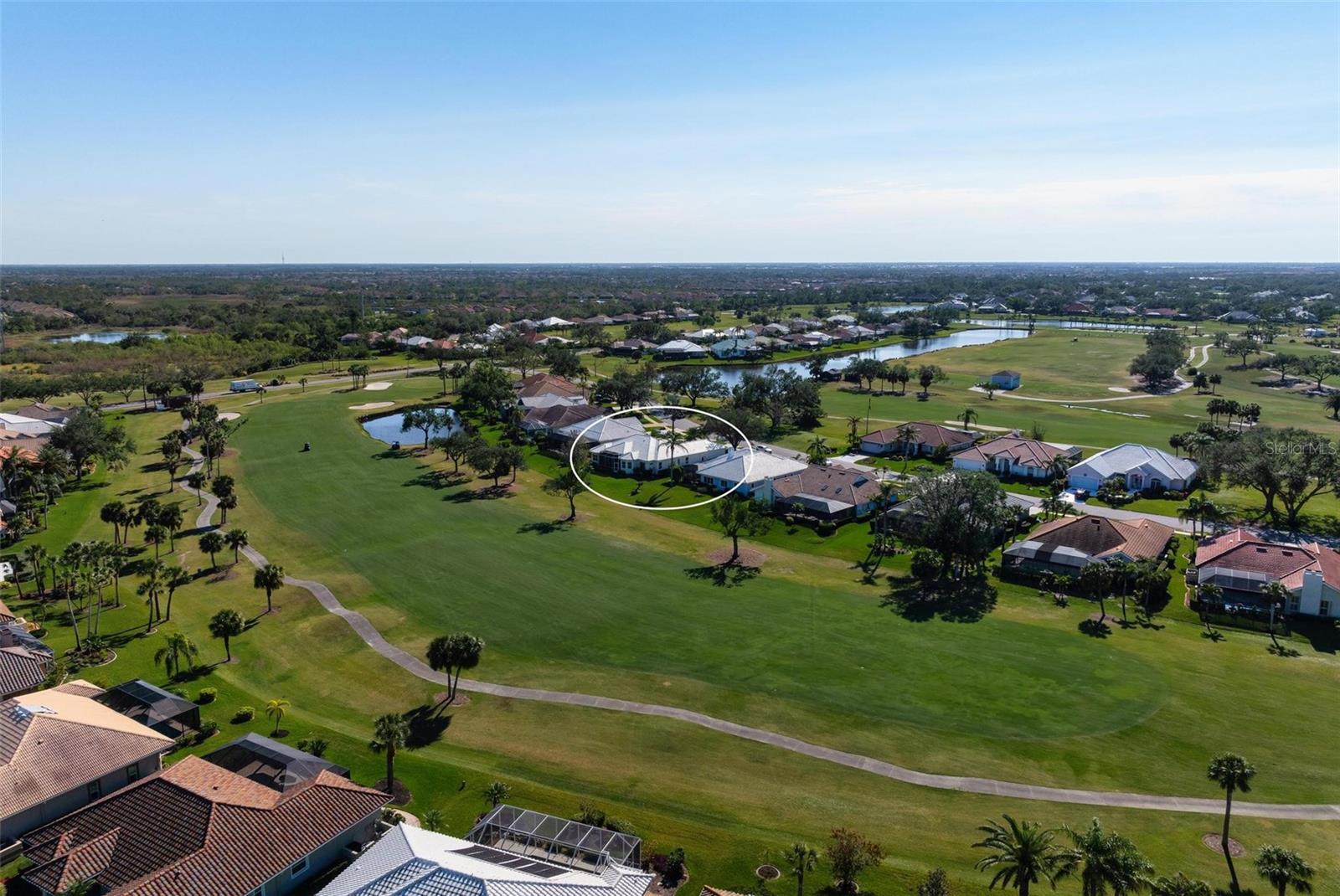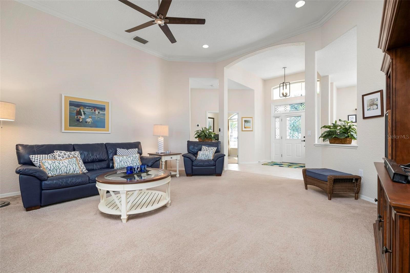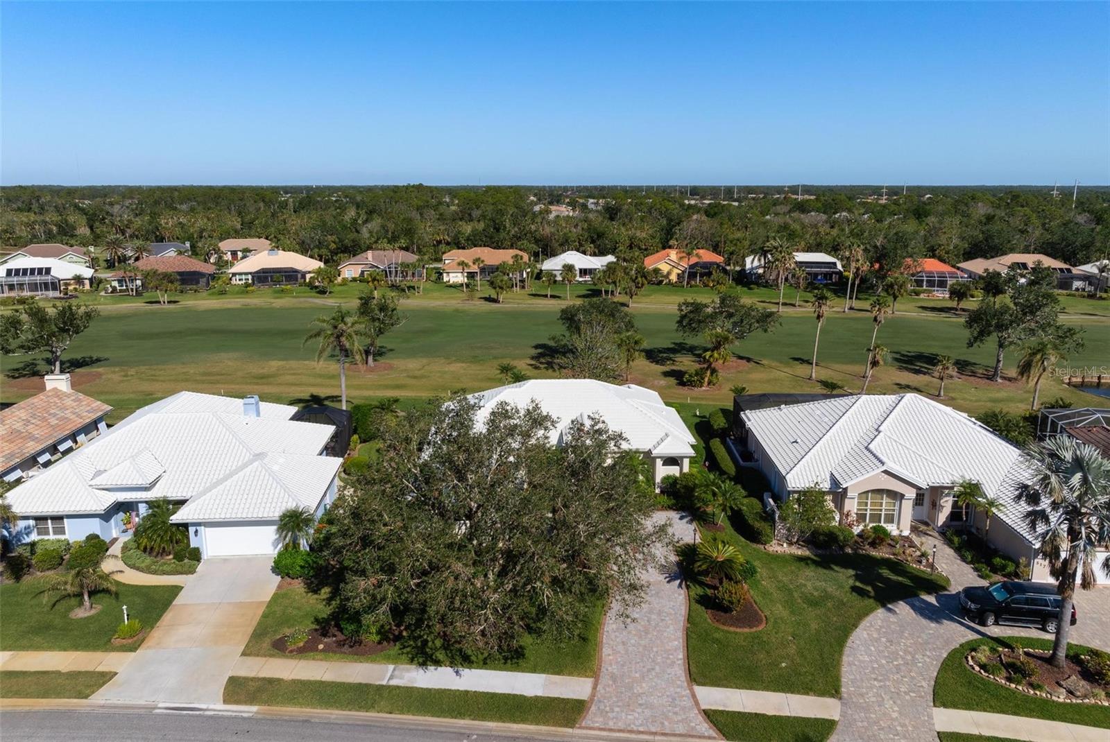 Premier Custom Country Club Home located in the highly desirable gated Governors Green neighborhood at The Plantation offers the lifestyle you desire. From the moment you arrive, you will be engaged by the meticulous care and attention this home has experienced, starting with the gorgeous paver driveway and mature tropical landscaping leading to the beautiful leaded glass entry door. Beyond the entry and spacious great room with its 12 foot ceilings, you'll love this home's sun-splashed split plan creating the perfect flow for entertaining family and guests. Walls of glass open to the tiled Florida sun-room and screened lanai, where you will enjoy expansive golf views of the 16th fairway of the Panther golf course. There's plenty of room for a pool if you decide to add one in the future. The great room plan offers volume 12 foot and 10 foot ceilings throughout the 3 large bedrooms, 2 ½ baths, formal dining room, spacious breakfast room, large and bright kitchen with lots of cabinet space, large pantry, and stainless steel appliances, plus the pleasant den/office for working at home or hiding away curled up with a good book. The large bay windows of the breakfast room and the master suite allow panoramic views of the golf course. Storage is never a problem with 11 closets and a super-sized 2+ car garage, perfect for storing your Florida beach toys. Rest easy knowing the home has full storm protection. Recent upgrades include new appliances and AC in 2023, new roof in 2018, HWH in 2020, and exterior paint, paver driveway, and ceiling lights and fans in 2024. Although membership in The Plantation Golf and Country Club is not mandatory, their two premier golf courses, tennis facilities, pool, and dining are a golfer’s paradise and the best of country club living. For the non-golfers, the beauty of the courses and the neighborhood certainly add to the charm of this delightful home. Located minutes from Historic Venice Island with its quaint shops, dining, beaches, biking/walking trails, fishing, performing arts center, and other cultural venues, and easy access to I-75 for quick trips to Sarasota and area airports.