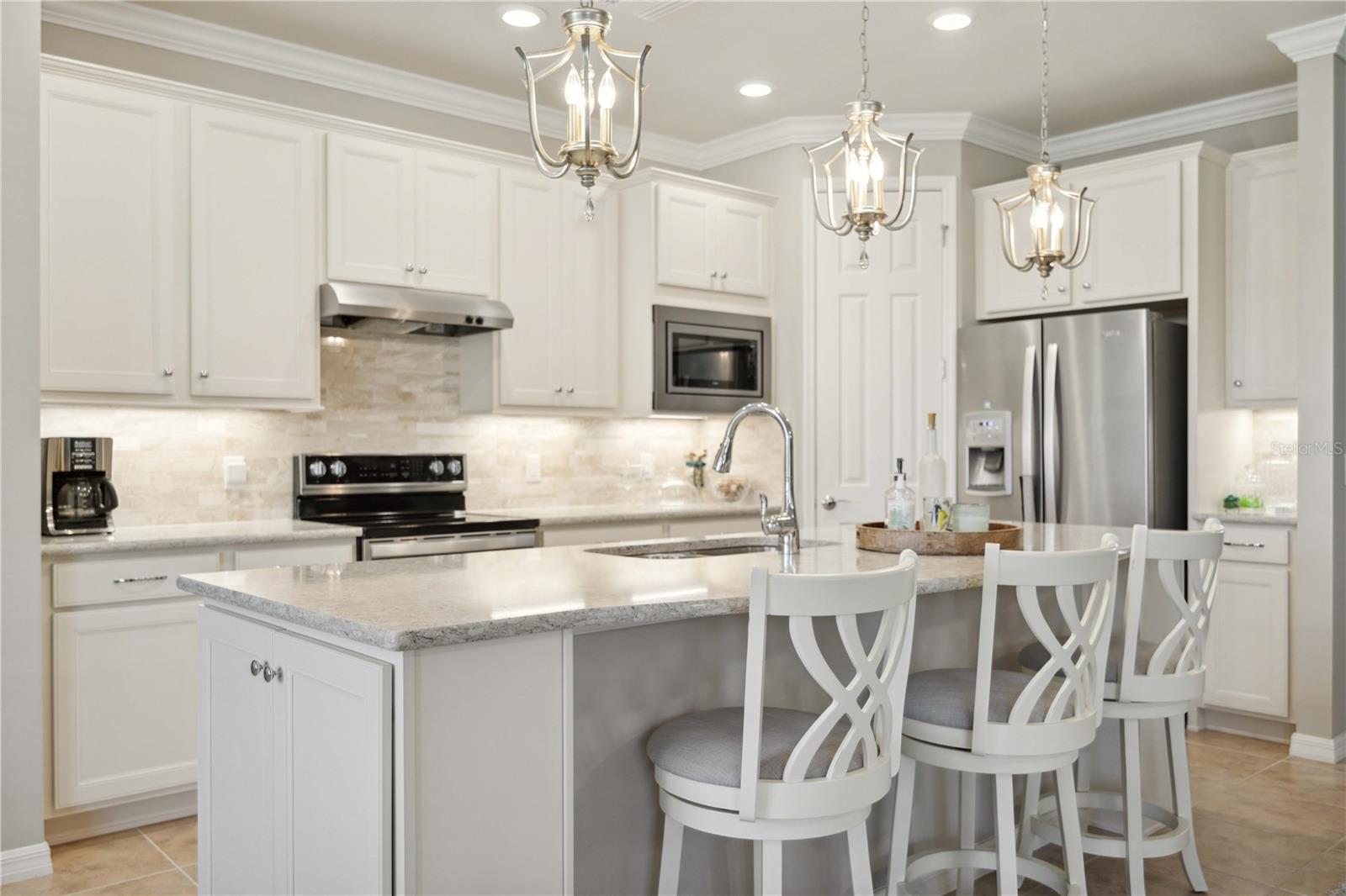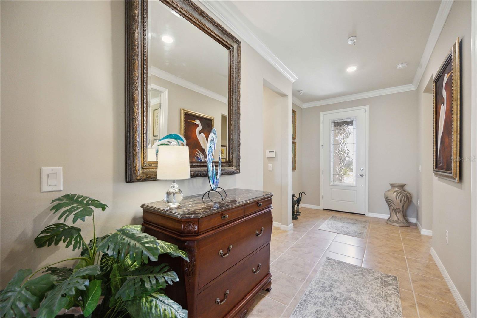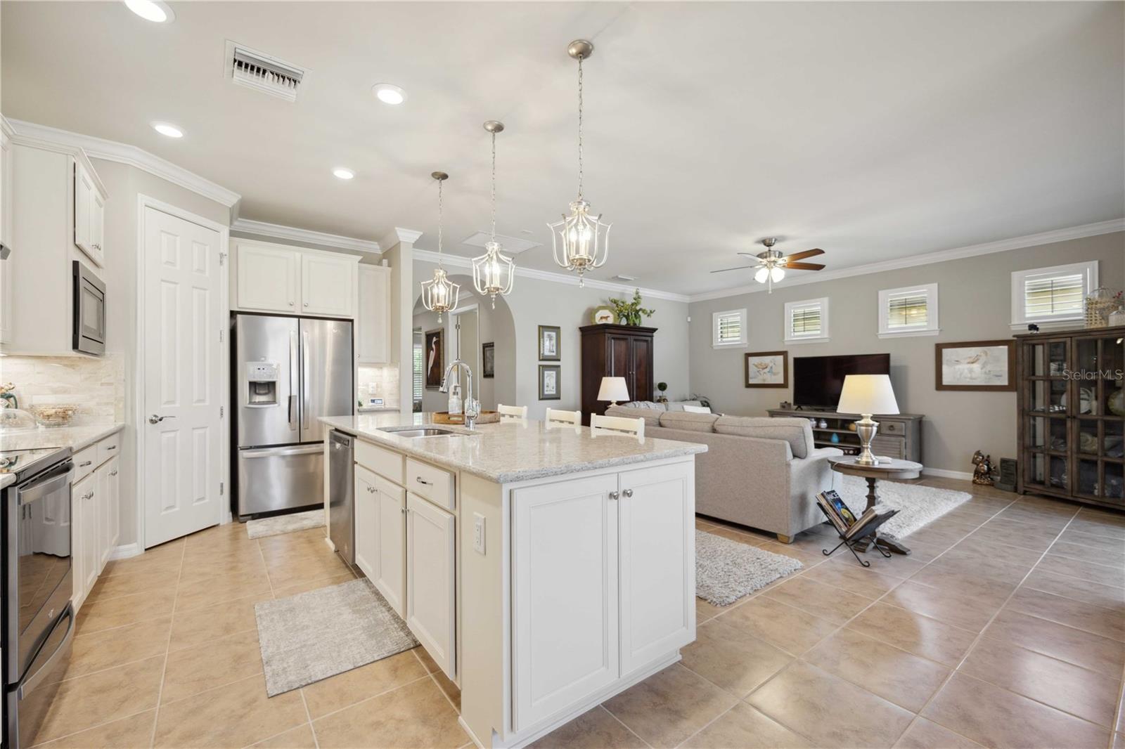 Stunning 3 Bed, 2 Bath Home with Lake Views in Islandwalk! Welcome to your dream home in the picturesque community of Islandwalk! This meticulously maintained 3-bedroom, 2-bathroom residence boasts an array of upgrades and features, offering a luxurious and comfortable living experience. As you step through the upgraded front door with glass, you'll be greeted by an inviting interior highlighted by tile floors, crown molding, and 9' interior doors throughout. The spacious open floor plan seamlessly connects the living, dining, and kitchen areas, perfect for both entertaining and everyday living. The gourmet kitchen is a chef's delight, featuring upgraded quartz countertops, stainless steel appliances, a stylish tile backsplash, and a convenient breakfast bar. The adjacent dining area overlooks the serene lake views, creating a tranquil ambiance for enjoying meals with family and friends. Relax and unwind in the elegant primary suite, complete with plantation shutters, a luxurious ensuite bathroom with granite countertops, dual sinks, and a separate walk-in shower. Two additional bedrooms provide ample space for guests or family members, each with ceiling fans and plantation shutters. Ideal for remote work or quiet retreats, the office/den features elegant French doors, offering privacy without sacrificing natural light or airflow. The upgraded laundry room is a practical oasis, complete with cabinets and a utility sink, making household chores a breeze. Step outside to the extended lanai and experience true outdoor living at its finest. Sip your morning coffee or dine alfresco while taking in the peaceful lake views. The lanai is equipped with storm smart hurricane screens, providing added convenience and protection. The spacious 4' extended garage provides ample storage space for tools, equipment, or recreational gear. You'll notice the sleek epoxy floors, providing both durability and aesthetic charm. Convenient pull-down attic stairs offer easy access to additional storage space, ensuring every inch of this home is utilized efficiently. Safety is paramount, and this home is equipped with an ADT alarm system complemented by surveillance cameras, providing peace of mind and an extra layer of security. The inclusion of a Ring doorbell further enhances security measures, allowing you to monitor and control access to your home remotely. Outside, the meticulously maintained landscape and carefully curated lighting enhance the home's curb appeal, welcoming you and your guests with warmth and sophistication. With its prime location, luxurious upgrades, and serene lake views, this home offers the perfect blend of comfort, convenience, and elegance. Don't miss out on the opportunity to make this your own island paradise!