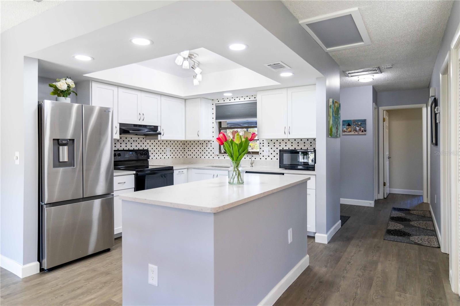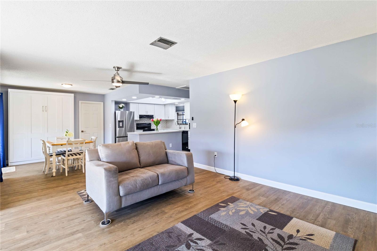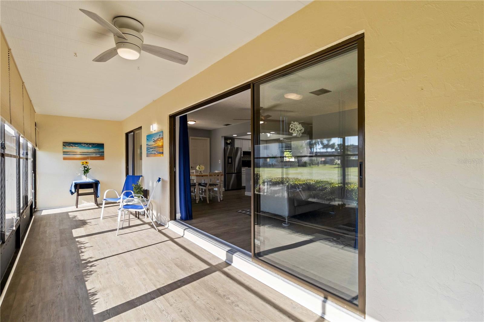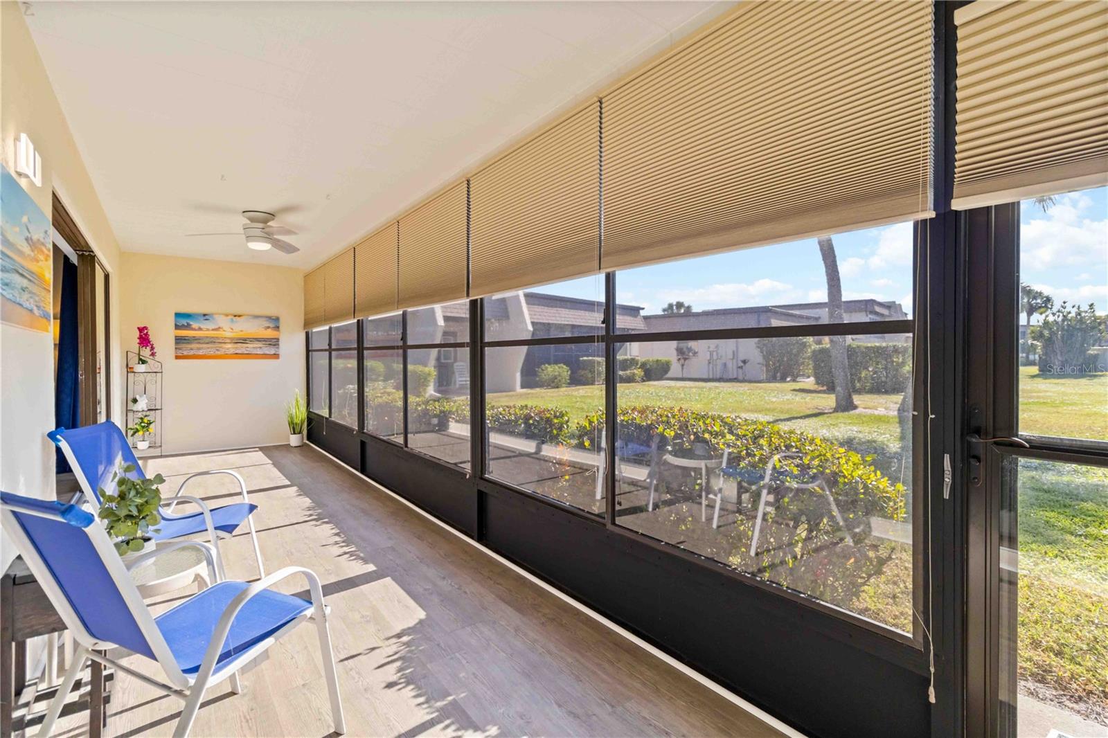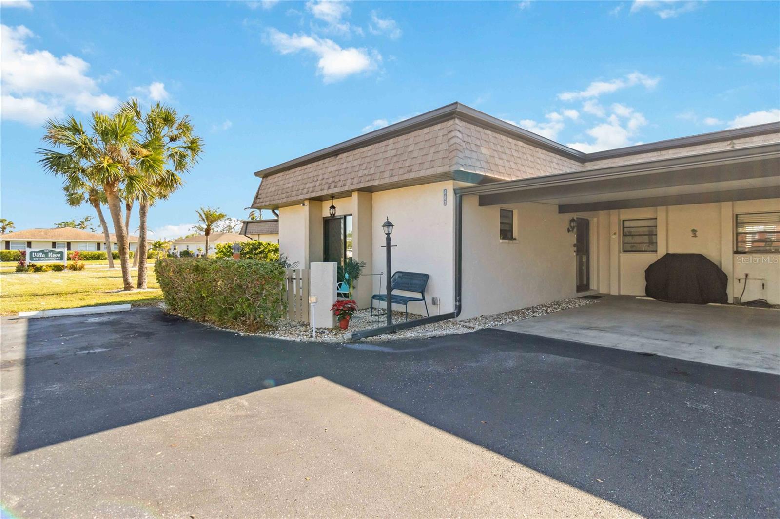 Offering a beautifully renovated turnkey two-bedroom, two-bath condominium in Villa Nova. Just step out the back door to go to the community pool and clubhouse. Pristine kitchen is sure to delight with a new appliance suite, new stove range hood, soft close cabinets, quartz counters, new modern light fixture and sink filter. New luxury vinyl floors throughout the main living space and bedrooms, new fans, new blinds. Primary bedroom is a comfortable size with a walk-in closet and sliding doors leading to outside seating area. The primary bath is updated and features a modern light, new latrine and tiled shower with glass doors. Second bedroom is pleasing for any guest or to be used as an office/den. Second bath is tastefully updated with tile walls and glass door on the tub, the luxurious feel is brought together with a modern light fixture. Queen size Murphy bed in dining area for that drop in guest! Oversized indoor laundry/utility room with a washer, dryer and laundry tub. A grand-sized enclosed lanai offers plenty of room to enjoy extra sitting and dining space and has black out blinds for privacy. New Square D Electric Box in 2022, A/C replaced in 2021, Third Nail done in 2024. The landscape rock and exterior entryway landing offer a neat and tidy welcome. Front sitting area expands your living space. Covered carport, extra parking space as well as plenty of guest parking. Small covered area outside the laundry room back door is perfect to store your bike. Villa Nova is conveniently only minutes from the the Island of Venice with miles of open coastline and treasured beaches. Shopping, restaurants, golf courses, airports, theater and cultural events are all in proximity. Schedule an appointment today and see all this charming property has to offer.