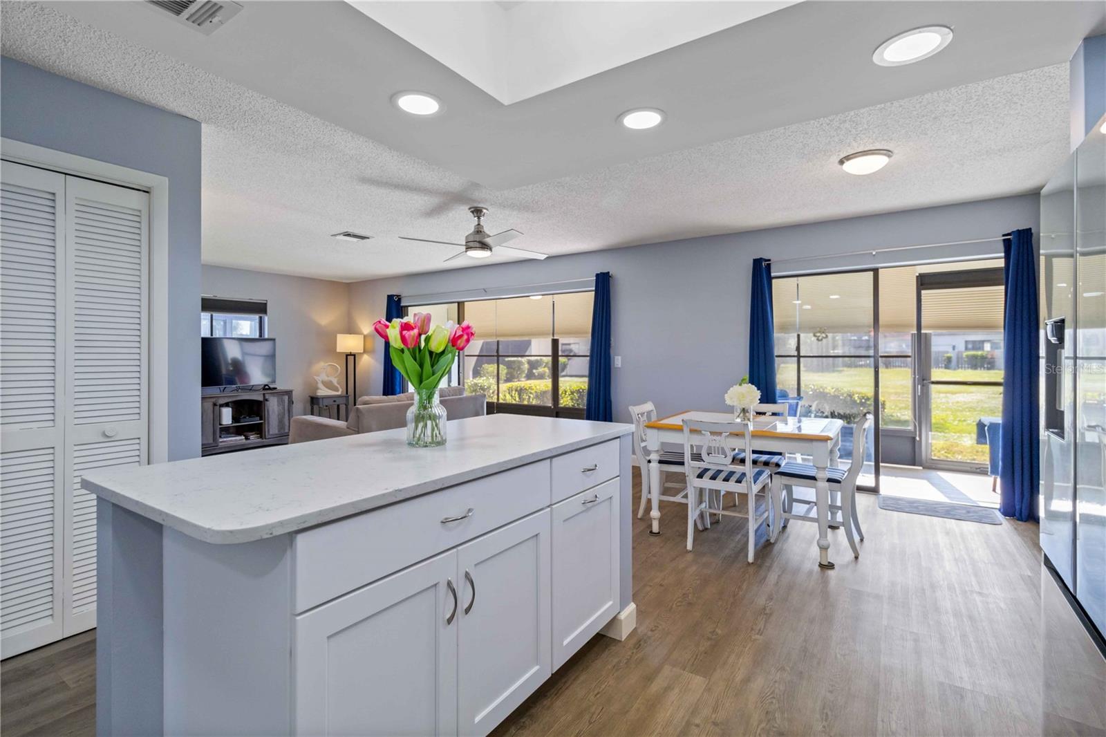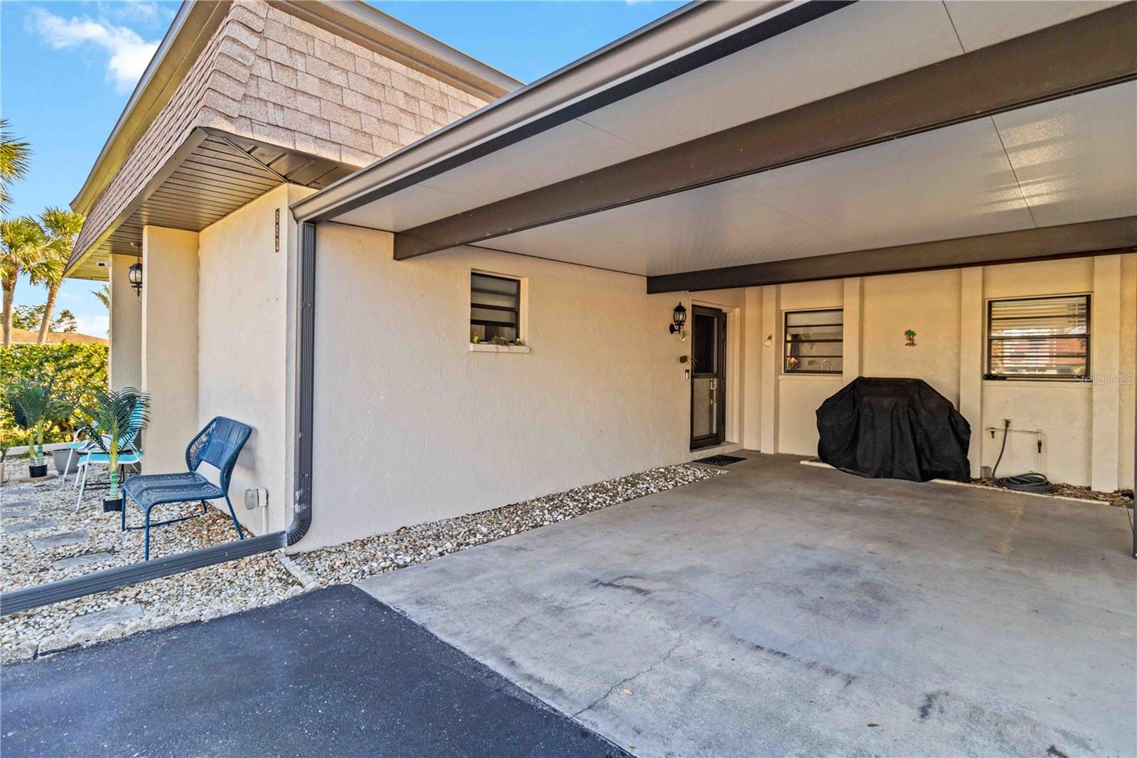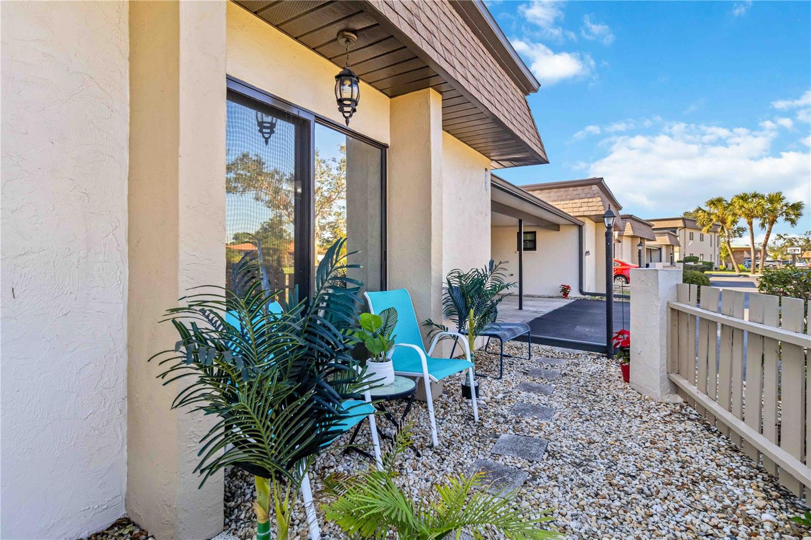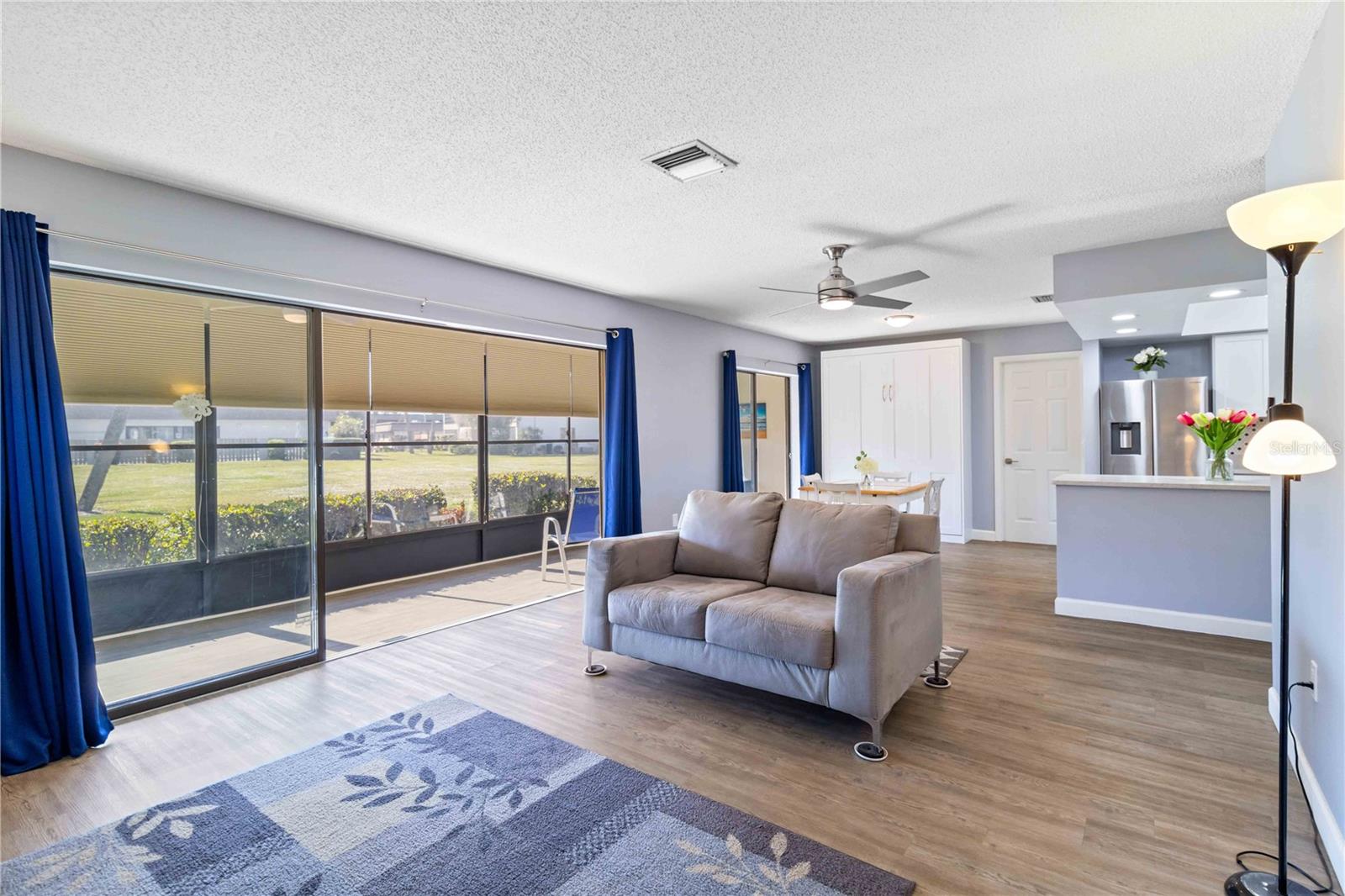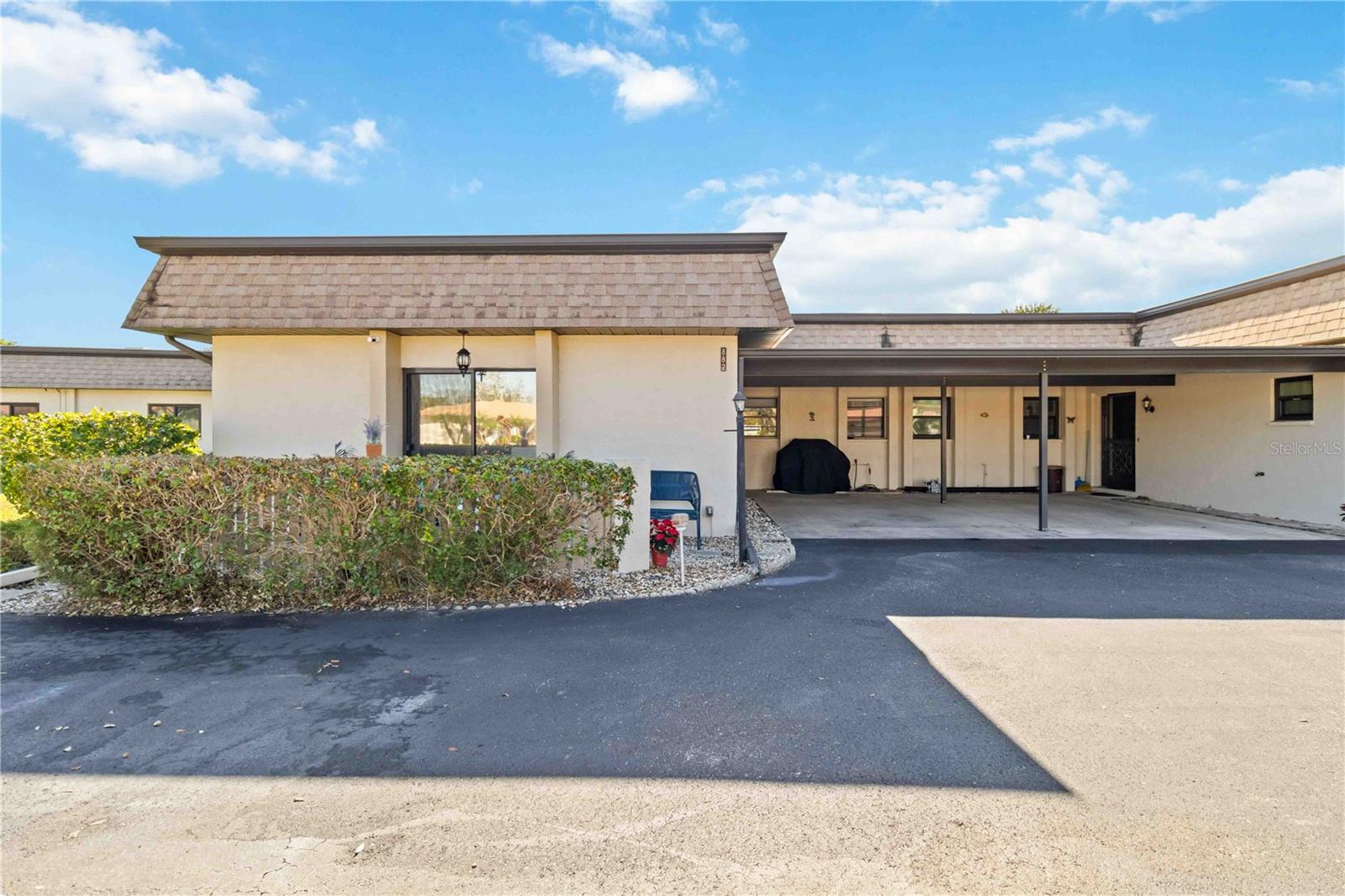 Offering a beautifully renovated turnkey two-bedroom, two-bath condominium in Villa Nova. Just step out the back door to go to the community pool and clubhouse. Pristine kitchen is sure to delight with a new appliance suite, new stove range hood, soft close cabinets, quartz counters, new modern light fixture and sink filter. New luxury vinyl floors throughout the main living space and bedrooms, new fans, new blinds. Primary bedroom is a comfortable size with a walk-in closet and sliding doors leading to outside seating area. The primary bath is updated and features a modern light, new latrine and tiled shower with glass doors. Second bedroom is pleasing for any guest or to be used as an office/den. Second bath is tastefully updated with tile walls and glass door on the tub, the luxurious feel is brought together with a modern light fixture. Queen size Murphy bed in dining area for that drop in guest! Oversized indoor laundry/utility room with a washer, dryer and laundry tub. A grand-sized enclosed lanai offers plenty of room to enjoy extra sitting and dining space and has black out blinds for privacy. New Square D Electric Box in 2022, A/C replaced in 2021, Third Nail done in 2024. The landscape rock and exterior entryway landing offer a neat and tidy welcome. Front sitting area expands your living space. Covered carport, extra parking space as well as plenty of guest parking. Small covered area outside the laundry room back door is perfect to store your bike. Villa Nova is conveniently only minutes from the the Island of Venice with miles of open coastline and treasured beaches. Shopping, restaurants, golf courses, airports, theater and cultural events are all in proximity. Schedule an appointment today and see all this charming property has to offer.