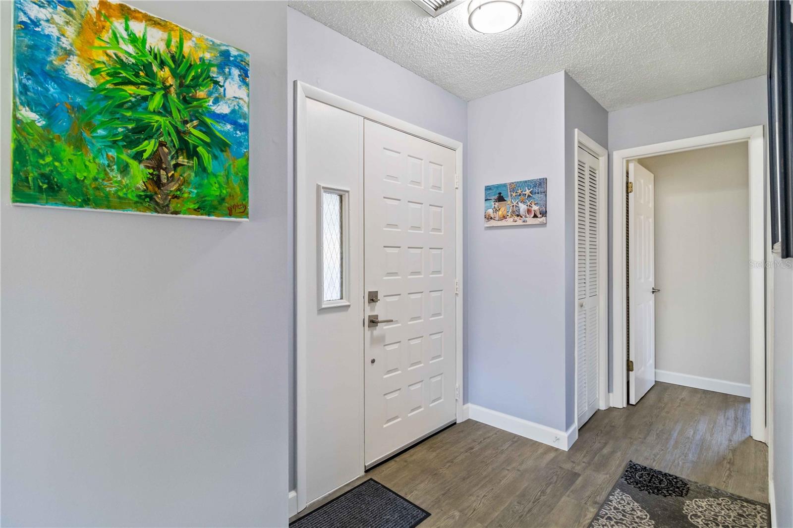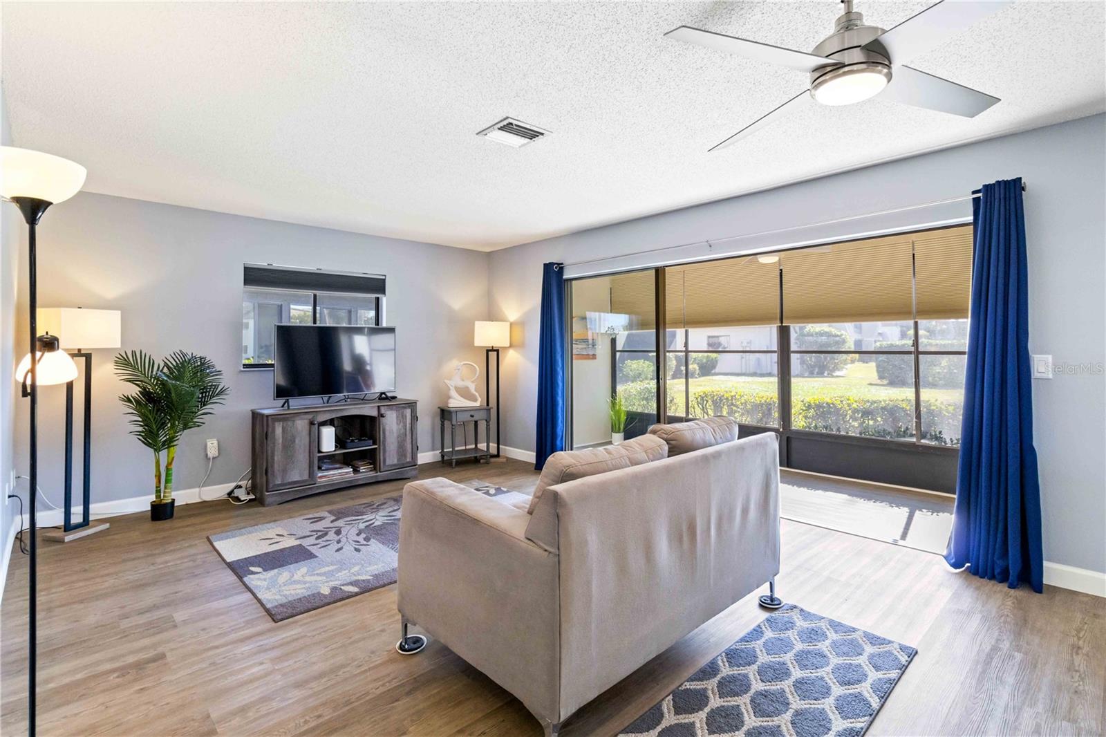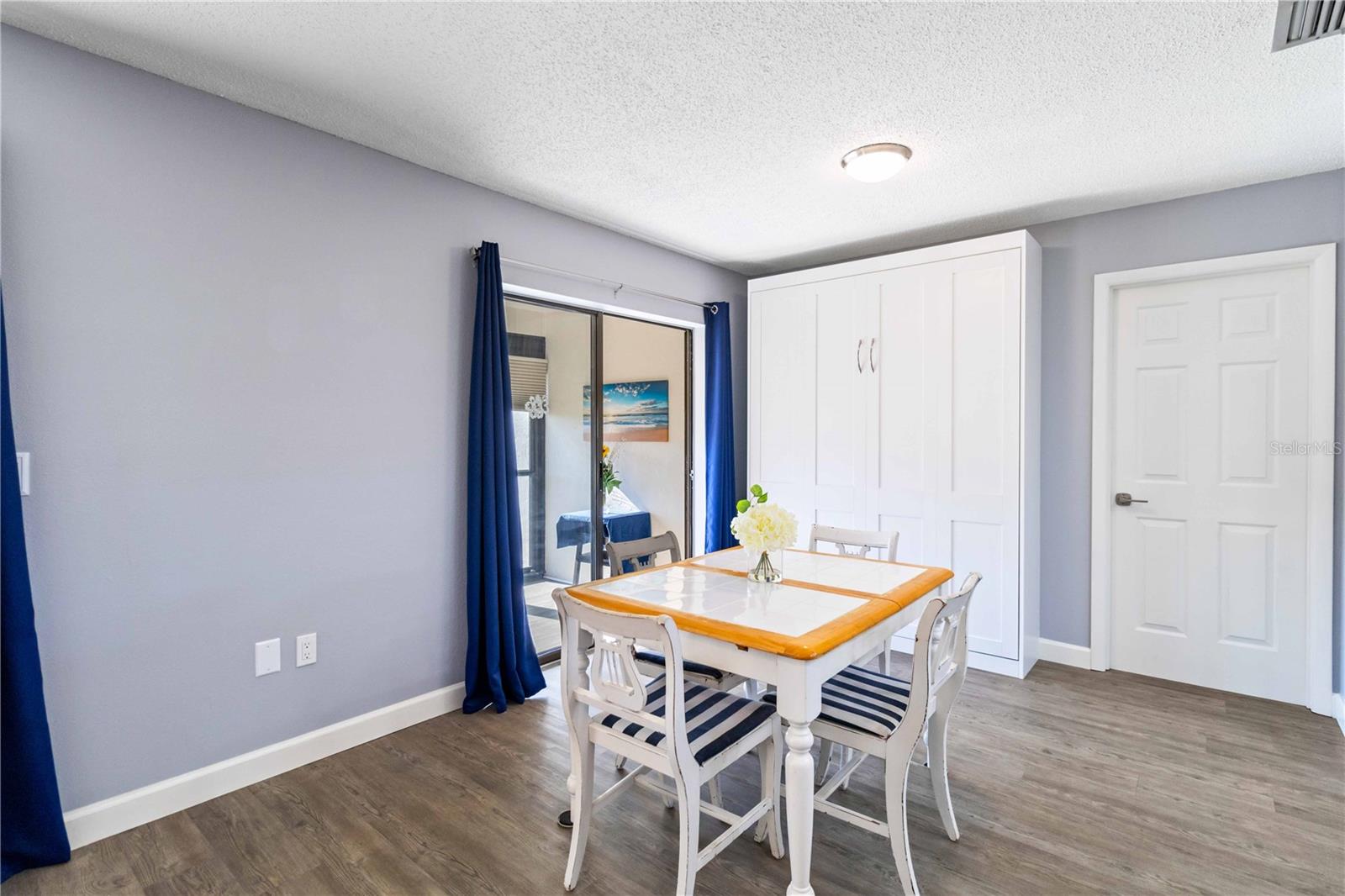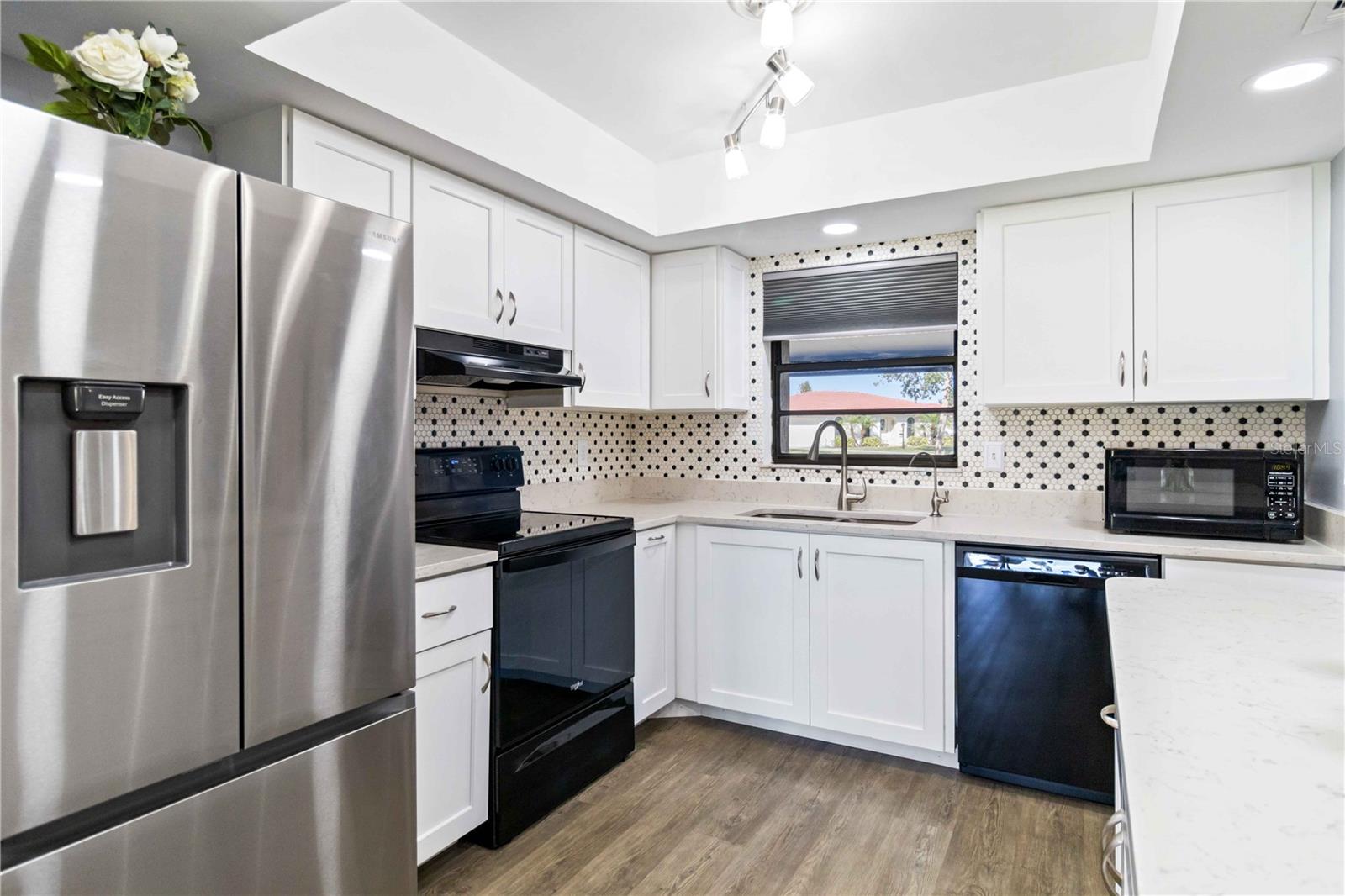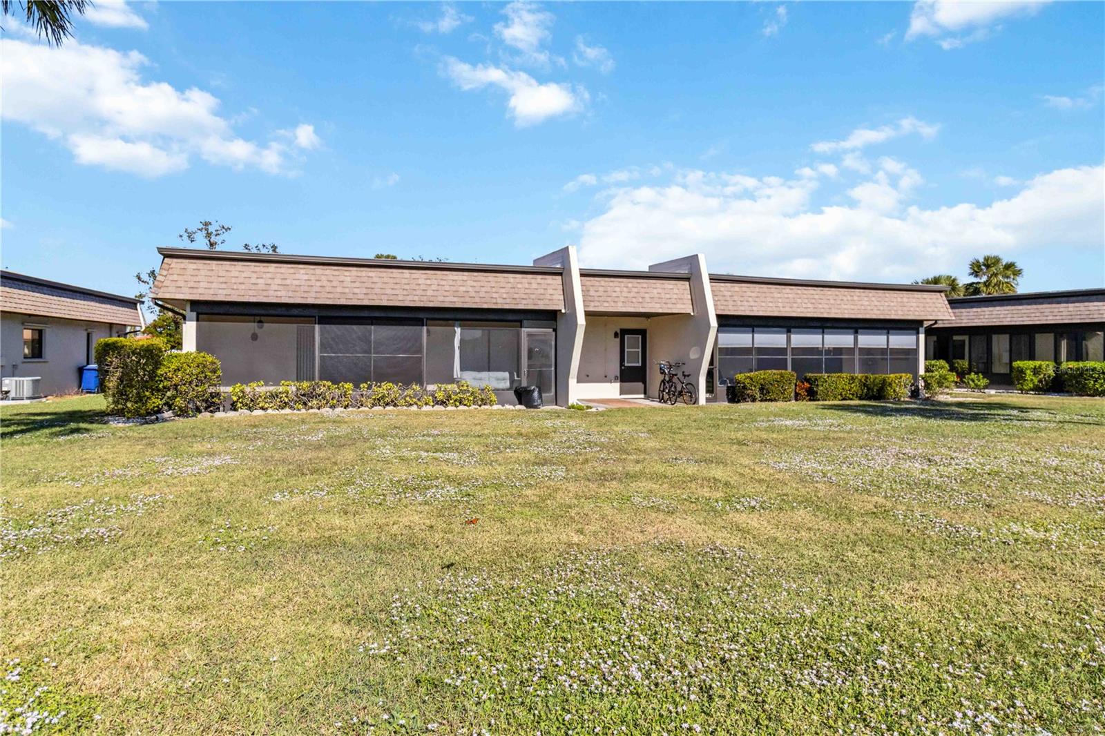 Offering a beautifully renovated turnkey two-bedroom, two-bath condominium in Villa Nova. Just step out the back door to go to the community pool and clubhouse. Pristine kitchen is sure to delight with a new appliance suite, new stove range hood, soft close cabinets, quartz counters, new modern light fixture and sink filter. New luxury vinyl floors throughout the main living space and bedrooms, new fans, new blinds. Primary bedroom is a comfortable size with a walk-in closet and sliding doors leading to outside seating area. The primary bath is updated and features a modern light, new latrine and tiled shower with glass doors. Second bedroom is pleasing for any guest or to be used as an office/den. Second bath is tastefully updated with tile walls and glass door on the tub, the luxurious feel is brought together with a modern light fixture. Queen size Murphy bed in dining area for that drop in guest! Oversized indoor laundry/utility room with a washer, dryer and laundry tub. A grand-sized enclosed lanai offers plenty of room to enjoy extra sitting and dining space and has black out blinds for privacy. New Square D Electric Box in 2022, A/C replaced in 2021, Third Nail done in 2024. The landscape rock and exterior entryway landing offer a neat and tidy welcome. Front sitting area expands your living space. Covered carport, extra parking space as well as plenty of guest parking. Small covered area outside the laundry room back door is perfect to store your bike. Villa Nova is conveniently only minutes from the the Island of Venice with miles of open coastline and treasured beaches. Shopping, restaurants, golf courses, airports, theater and cultural events are all in proximity. Schedule an appointment today and see all this charming property has to offer.