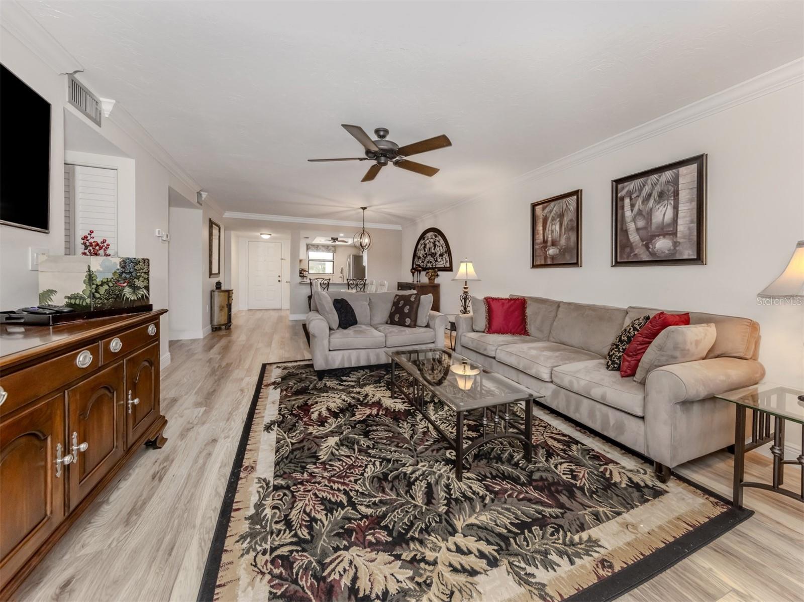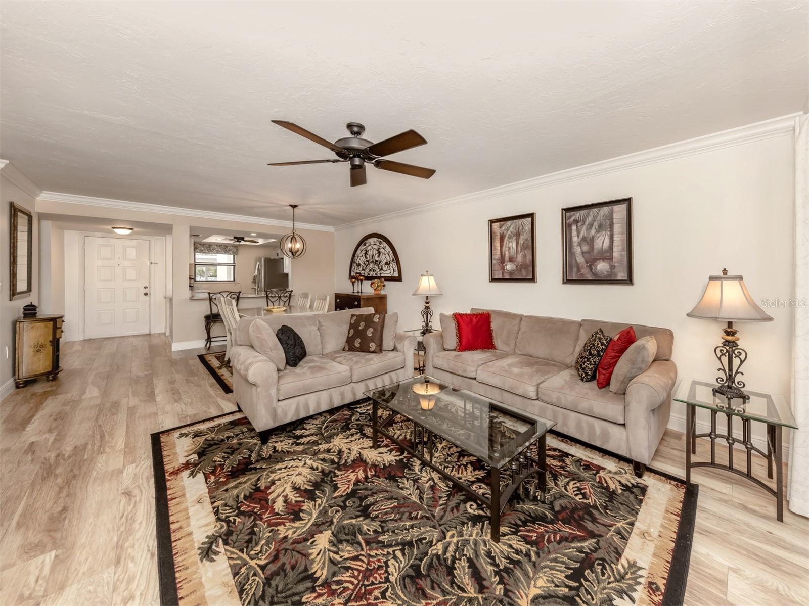 Welcome to Lakes of Capri, a charming community with a fabulous location near everything Venice has to offer. This warm and cozy, turnkey-furnished, ground-floor condominium has been wonderfully cared for and has had many upgrades that set it apart from much of what is available for purchase in the area and price range. The kitchen has been beautifully renovated and opened to create a welcoming culinary space. New quartz countertops, upgraded stainless steel appliances, cabinets with pull-out drawers and luxury vinyl tile flooring through the main living areas are other truly lovely features. Additional countertop/storage space has been added to the kitchen, maximizing the cook or baker's enjoyment and needs. From almost every room, there is a lovely view of the serene pond with its birds, foliage and flowers. Crown molding and upgraded baseboards add a level of sophistication to this already well-appointed unit. The location of this condominium is perfect for social enthusiasts and pool loungers as the clubhouse and pool are directly across the driveway from the building. Needing a ladder or water hose? Looking for that one special screwdriver? For those missing their garages with “honey do” and special project tools and needs — wait for this — Lakes of Capri has its OWN tool shed that is shared by the community. Capri Isles golf course and driving range are just a few moments away, with membership available to golf in Venice, which allows play at three different courses nearby. Charming downtown Venice is only a few miles away with its dining, shopping, entertainment, festivals and world-renowned public beaches with glorious sunsets. Welcome home.