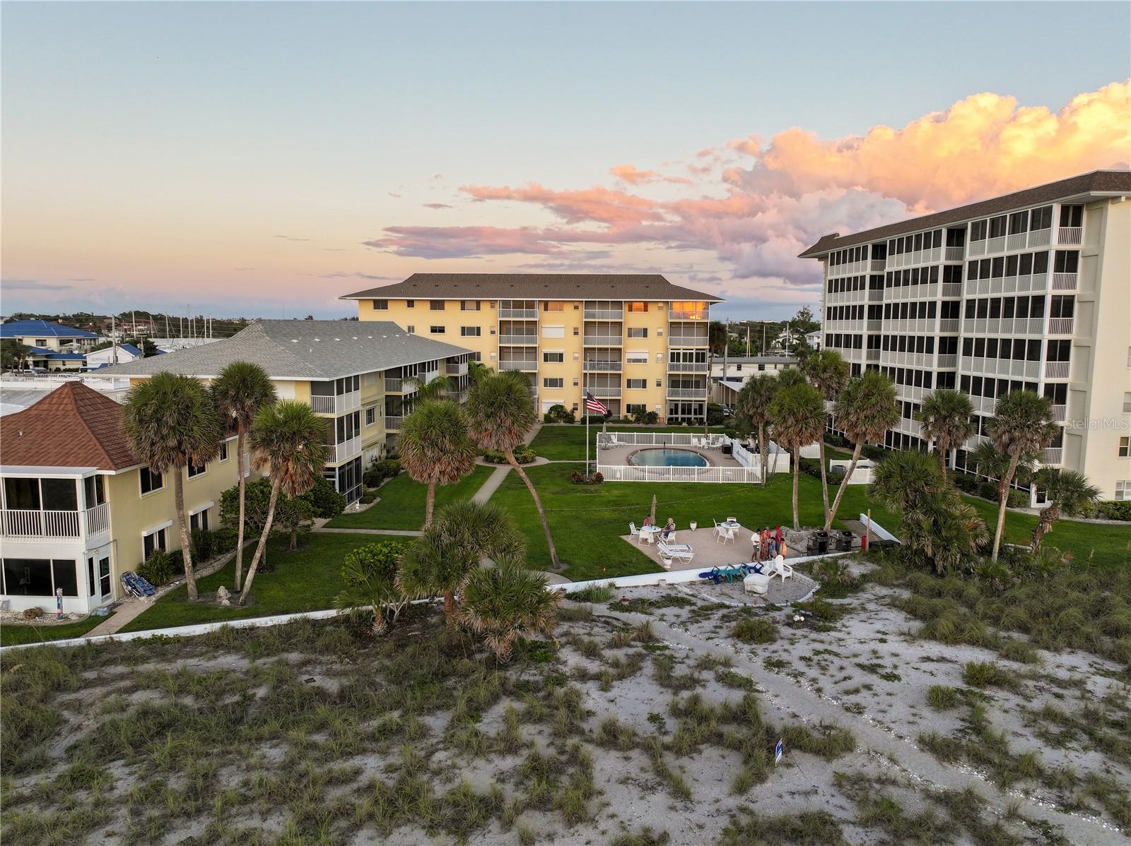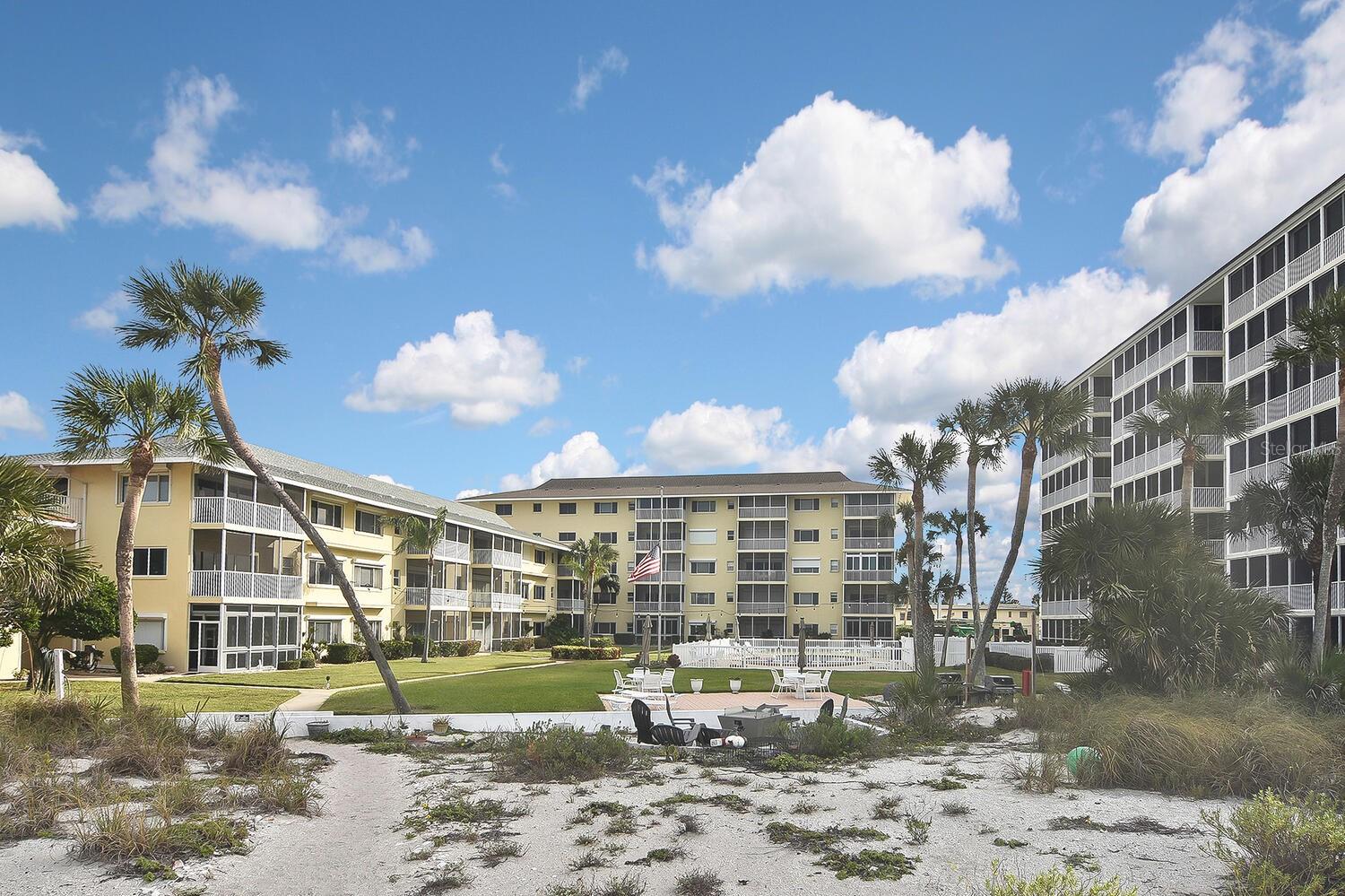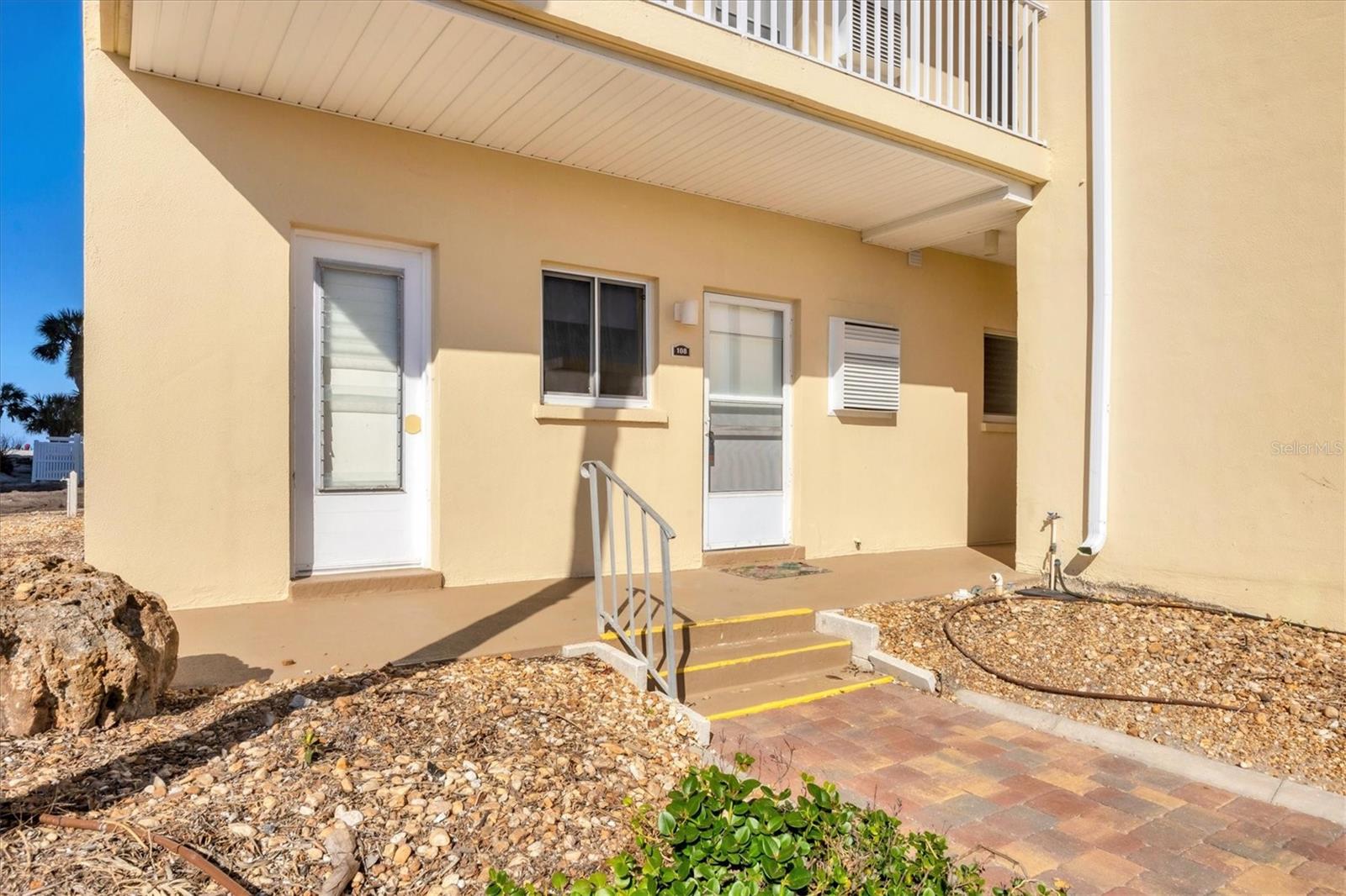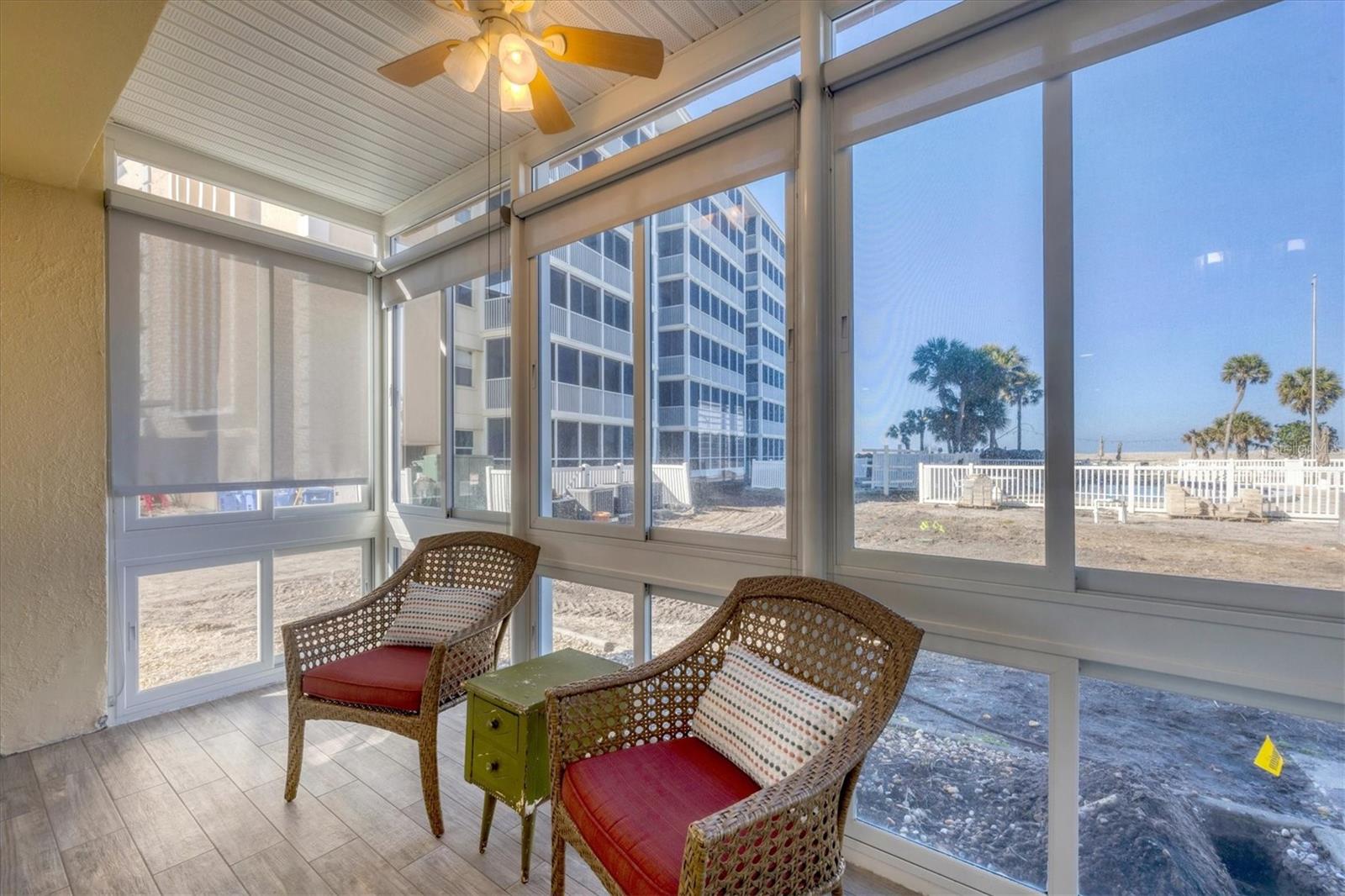 THE ONLY ground floor unit in Chateaugay that did not receive any damages from at least the last 3 major hurricanes! Looking for location and no maintenance? This is it! This beauty was renovated in 2021 and boosts of wood-like tile floors, Plantation shutters and blinds on all windows, new lighting, fans, new custom pantry, and a large pass-through opening to the breakfast bar. The kitchen is renovated with granite countertops and white cabinets. The new bathrooms feature tile showers in both as well as new vanities, faucets, and granite countertops. Ceilings were raised throughout the condo and all walls were textured and painted in the makeover. The hurricane windows and door on the lanai have new roll blinds for turtle season and new wood-like tile flooring. The walk-in closet in the primary bedroom features a barn door and built-ins. There is a storage closet inside the condo as well as a dedicated storage closet for this unit in the three-story building. The electrical has been updated, as well as all new plumbing supply lines and drains and the HVAC duct work has been replaced. Laundry is right down the walk, where you have 3 industrial sized washers and dryers at your disposal, at no charge. The pool and enlarged patio were completely redone in 2025, pool equipment is brand-new and pool is heated in the winter. On the patio are grills and tables for alfresco dining. There is even a firepit when the air is slightly chilly! Brand new front door in May 2025! The exterior of the complex will be painted white with a blue trim in 2025 and new landscaping is going in this fall. As you look out the condo, through the lanai, the yard, pool, patio and beach are your own “backyard”, like being in a house but with no maintenance to take care of. This is the place memories can be made, days with friends spent and evenings on the beach watching the sun set with friends. With only 34 units, it is easy to get to know other owners. During the winter months there are always activities: food trucks, games, parties, book clubs, pot-lucks, firepit nights and celebrations. And the beach is right out your “back door”, no elevator to deal with! Easy to get to downtown, Freedom Boat Club, Venice Yacht Club, Higel Marine Park, Crow’s Nest and the South Jetty! Bring your bicycles and walking shoes as it is close to everything!