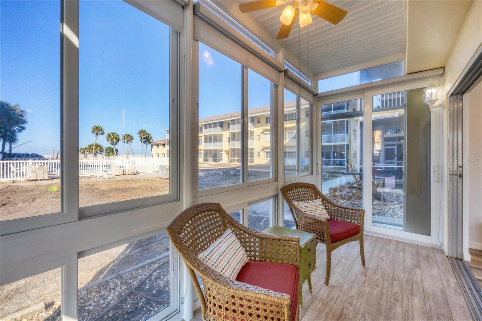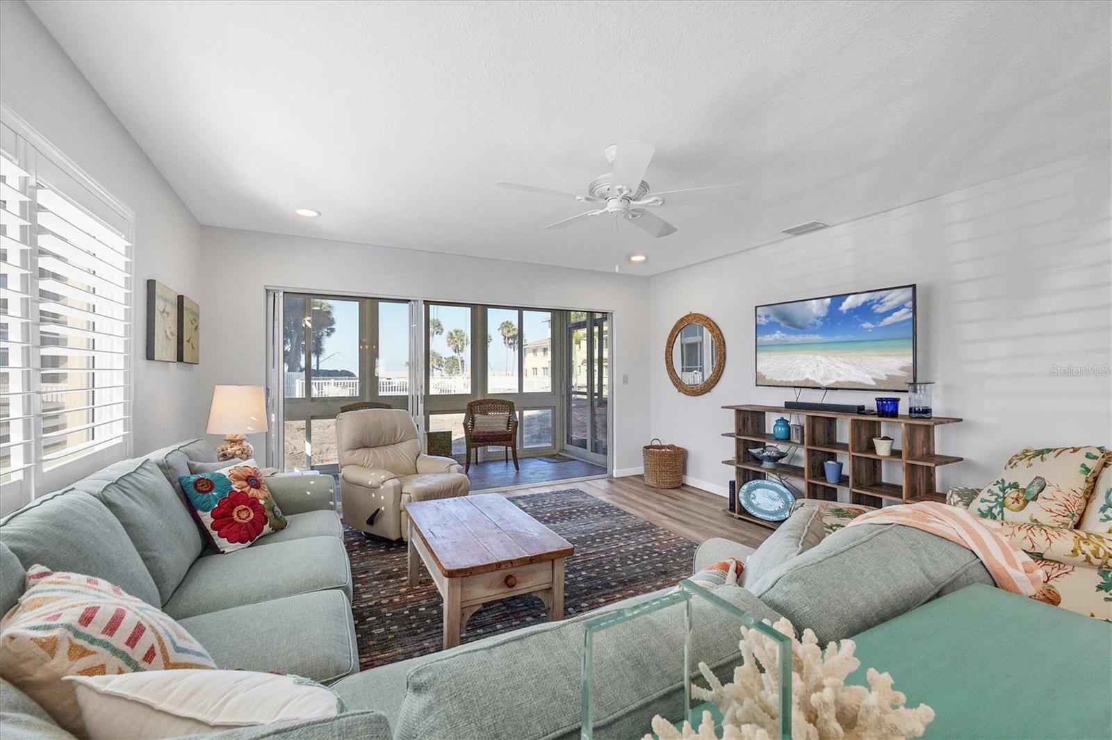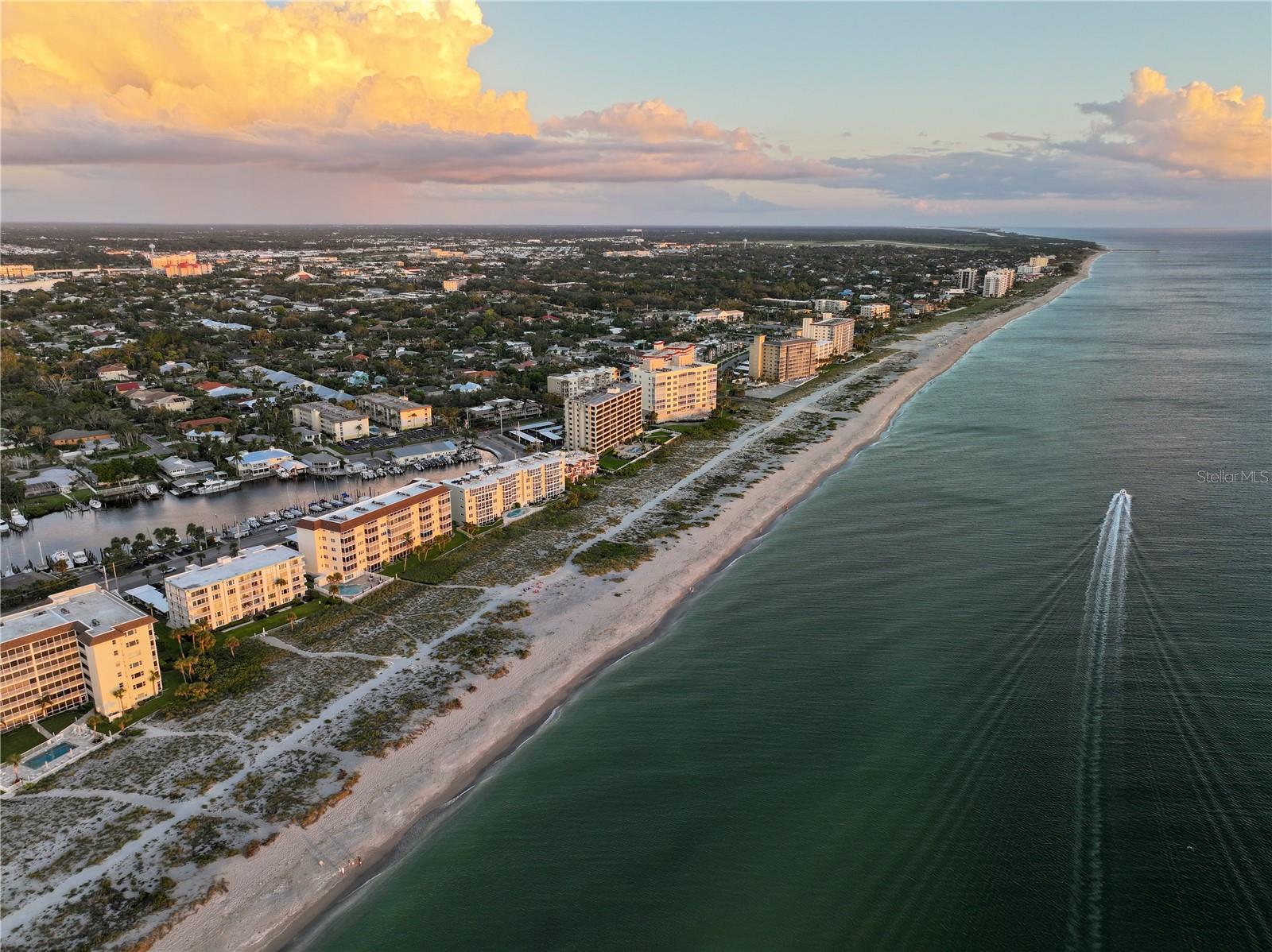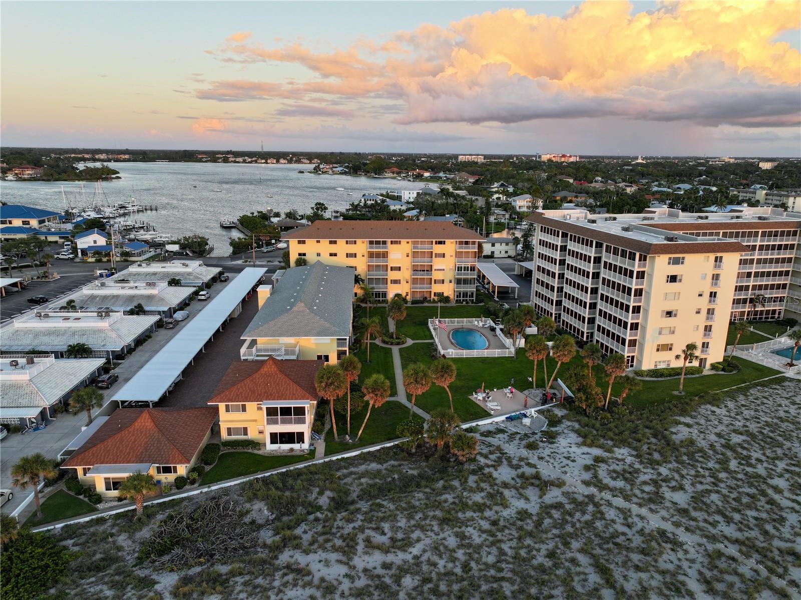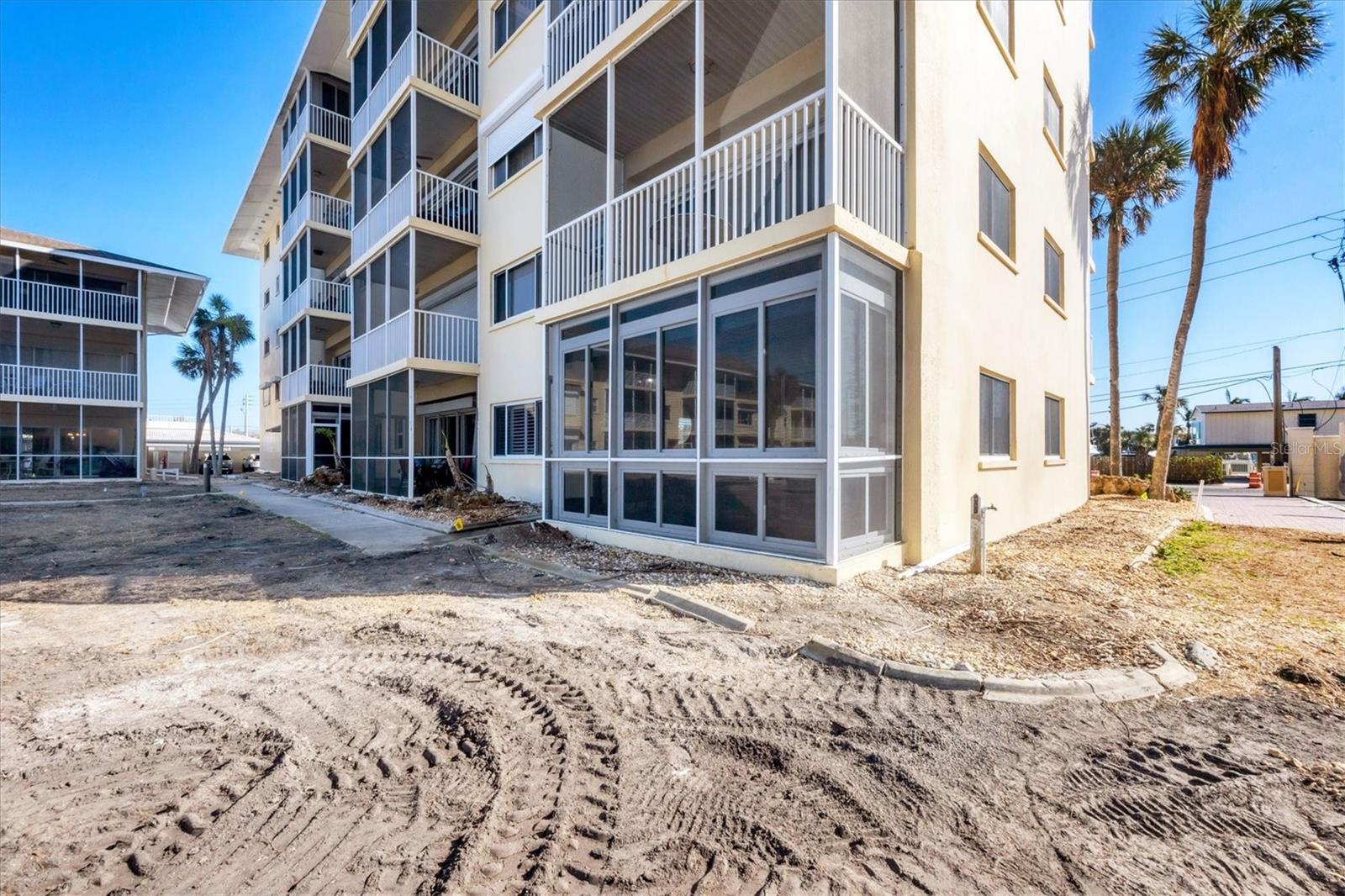 THE ONLY ground floor unit in Chateaugay that did not receive any damages from at least the last 3 major hurricanes! Looking for location and no maintenance? This is it! This beauty was renovated in 2021 and boosts of wood-like tile floors, Plantation shutters and blinds on all windows, new lighting, fans, new custom pantry, and a large pass-through opening to the breakfast bar. The kitchen is renovated with granite countertops and white cabinets. The new bathrooms feature tile showers in both as well as new vanities, faucets, and granite countertops. Ceilings were raised throughout the condo and all walls were textured and painted in the makeover. The hurricane windows and door on the lanai have new roll blinds for turtle season and new wood-like tile flooring. The walk-in closet in the primary bedroom features a barn door and built-ins. There is a storage closet inside the condo as well as a dedicated storage closet for this unit in the three-story building. The electrical has been updated, as well as all new plumbing supply lines and drains and the HVAC duct work has been replaced. Laundry is right down the walk, where you have 3 industrial sized washers and dryers at your disposal, at no charge. The pool and enlarged patio were completely redone in 2025, pool equipment is brand-new and pool is heated in the winter. On the patio are grills and tables for alfresco dining. There is even a firepit when the air is slightly chilly! Brand new front door in May 2025! The exterior of the complex will be painted white with a blue trim in 2025 and new landscaping is going in this fall. As you look out the condo, through the lanai, the yard, pool, patio and beach are your own “backyard”, like being in a house but with no maintenance to take care of. This is the place memories can be made, days with friends spent and evenings on the beach watching the sun set with friends. With only 34 units, it is easy to get to know other owners. During the winter months there are always activities: food trucks, games, parties, book clubs, pot-lucks, firepit nights and celebrations. And the beach is right out your “back door”, no elevator to deal with! Easy to get to downtown, Freedom Boat Club, Venice Yacht Club, Higel Marine Park, Crow’s Nest and the South Jetty! Bring your bicycles and walking shoes as it is close to everything!