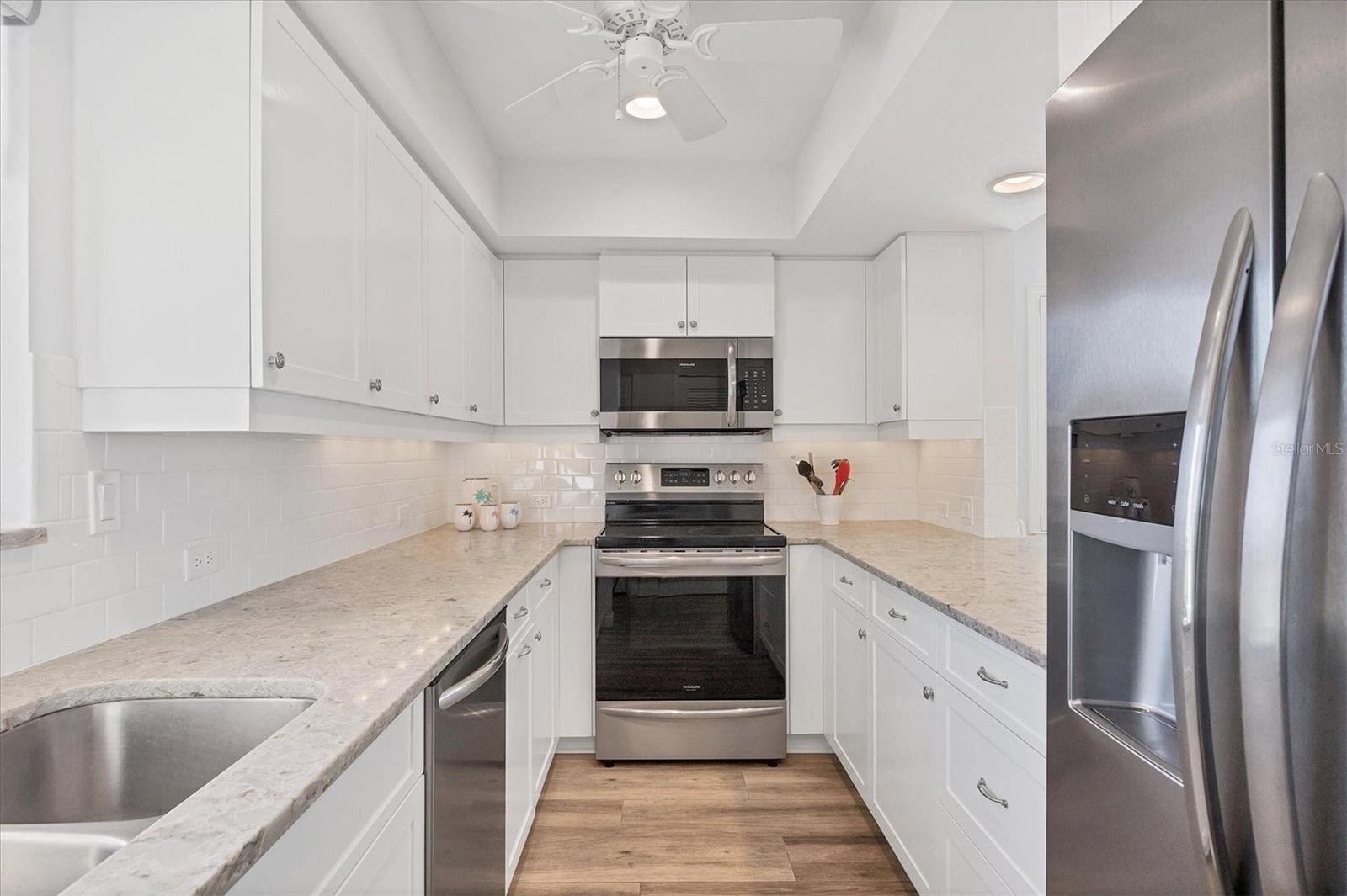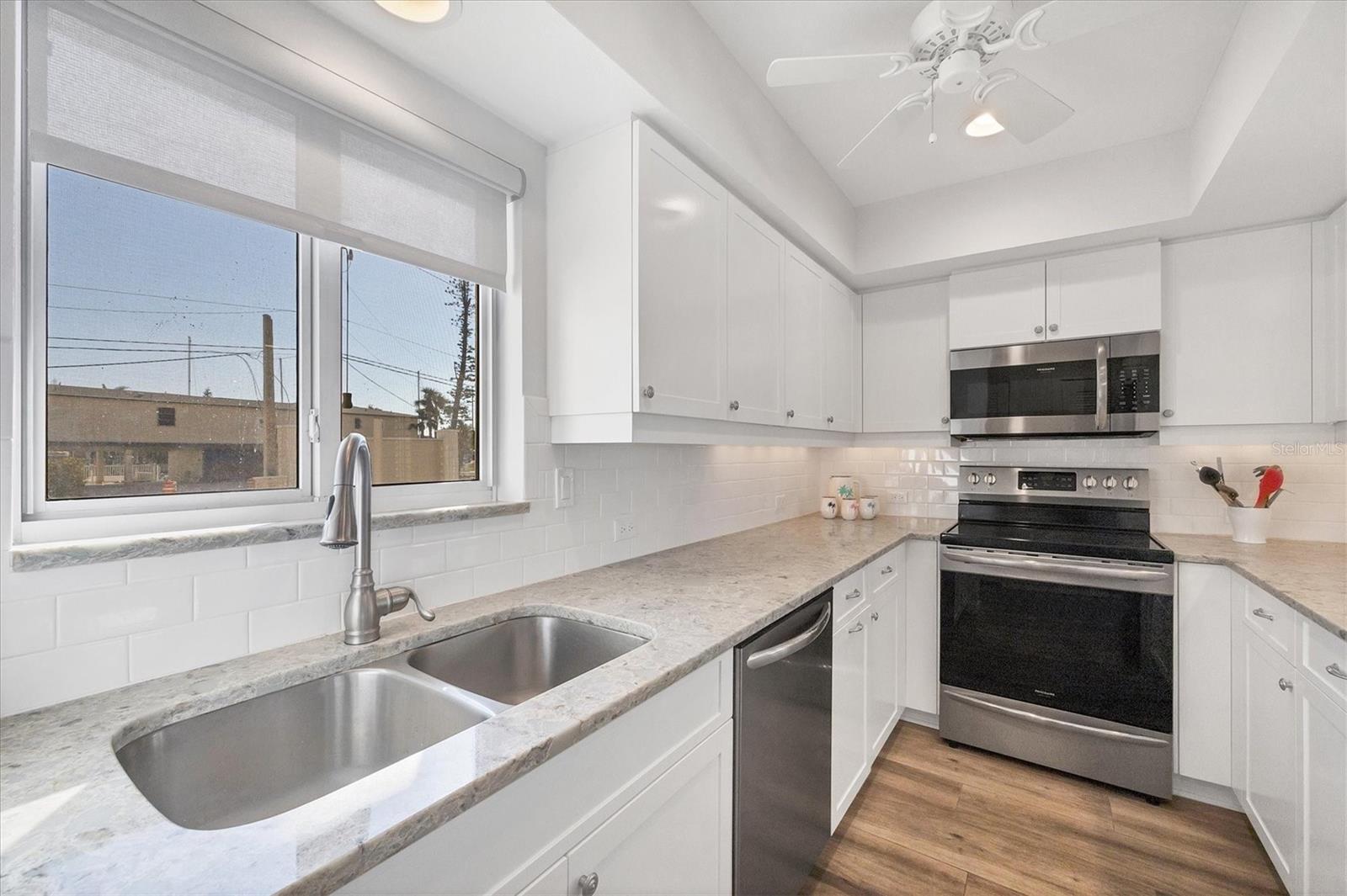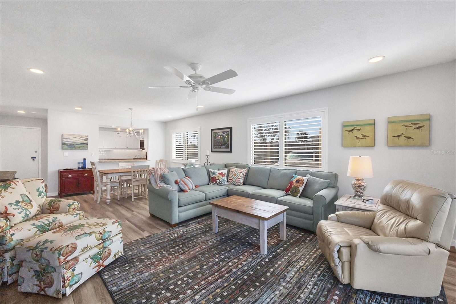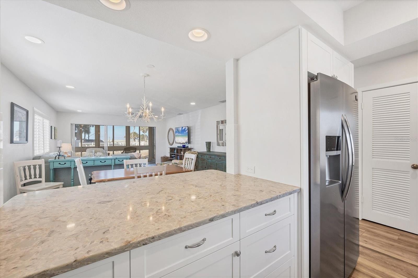 THE ONLY ground floor unit in Chateaugay that did not receive any damages from at least the last 3 major hurricanes! Looking for location and no maintenance? This is it! This beauty was renovated in 2021 and boosts of wood-like tile floors, Plantation shutters and blinds on all windows, new lighting, fans, new custom pantry, and a large pass-through opening to the breakfast bar. The kitchen is renovated with granite countertops and white cabinets. The new bathrooms feature tile showers in both as well as new vanities, faucets, and granite countertops. Ceilings were raised throughout the condo and all walls were textured and painted in the makeover. The hurricane windows and door on the lanai have new roll blinds for turtle season and new wood-like tile flooring. The walk-in closet in the primary bedroom features a barn door and built-ins. There is a storage closet inside the condo as well as a dedicated storage closet for this unit in the three-story building. The electrical has been updated, as well as all new plumbing supply lines and drains and the HVAC duct work has been replaced. Laundry is right down the walk, where you have 3 industrial sized washers and dryers at your disposal, at no charge. The pool and enlarged patio were completely redone in 2025, pool equipment is brand-new and pool is heated in the winter. On the patio are grills and tables for alfresco dining. There is even a firepit when the air is slightly chilly! Brand new front door in May 2025! The exterior of the complex will be painted white with a blue trim in 2025 and new landscaping is going in this fall. As you look out the condo, through the lanai, the yard, pool, patio and beach are your own “backyard”, like being in a house but with no maintenance to take care of. This is the place memories can be made, days with friends spent and evenings on the beach watching the sun set with friends. With only 34 units, it is easy to get to know other owners. During the winter months there are always activities: food trucks, games, parties, book clubs, pot-lucks, firepit nights and celebrations. And the beach is right out your “back door”, no elevator to deal with! Easy to get to downtown, Freedom Boat Club, Venice Yacht Club, Higel Marine Park, Crow’s Nest and the South Jetty! Bring your bicycles and walking shoes as it is close to everything!