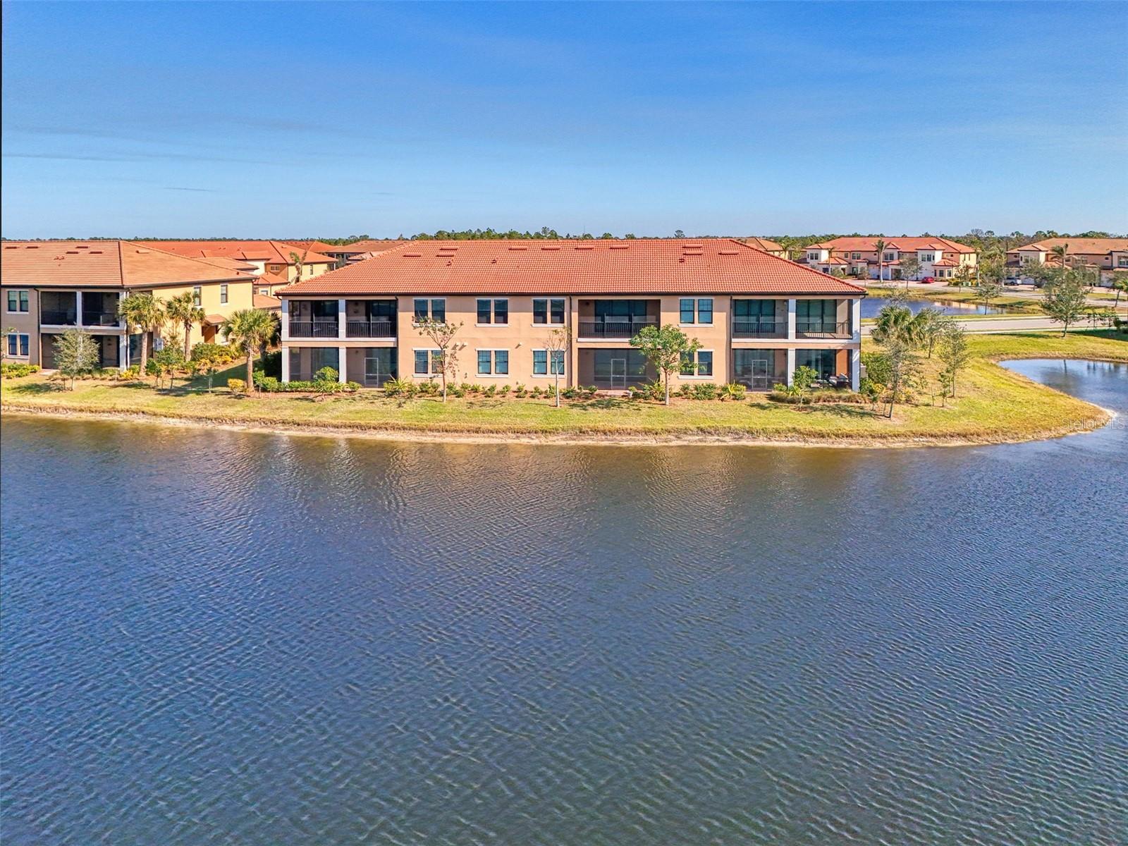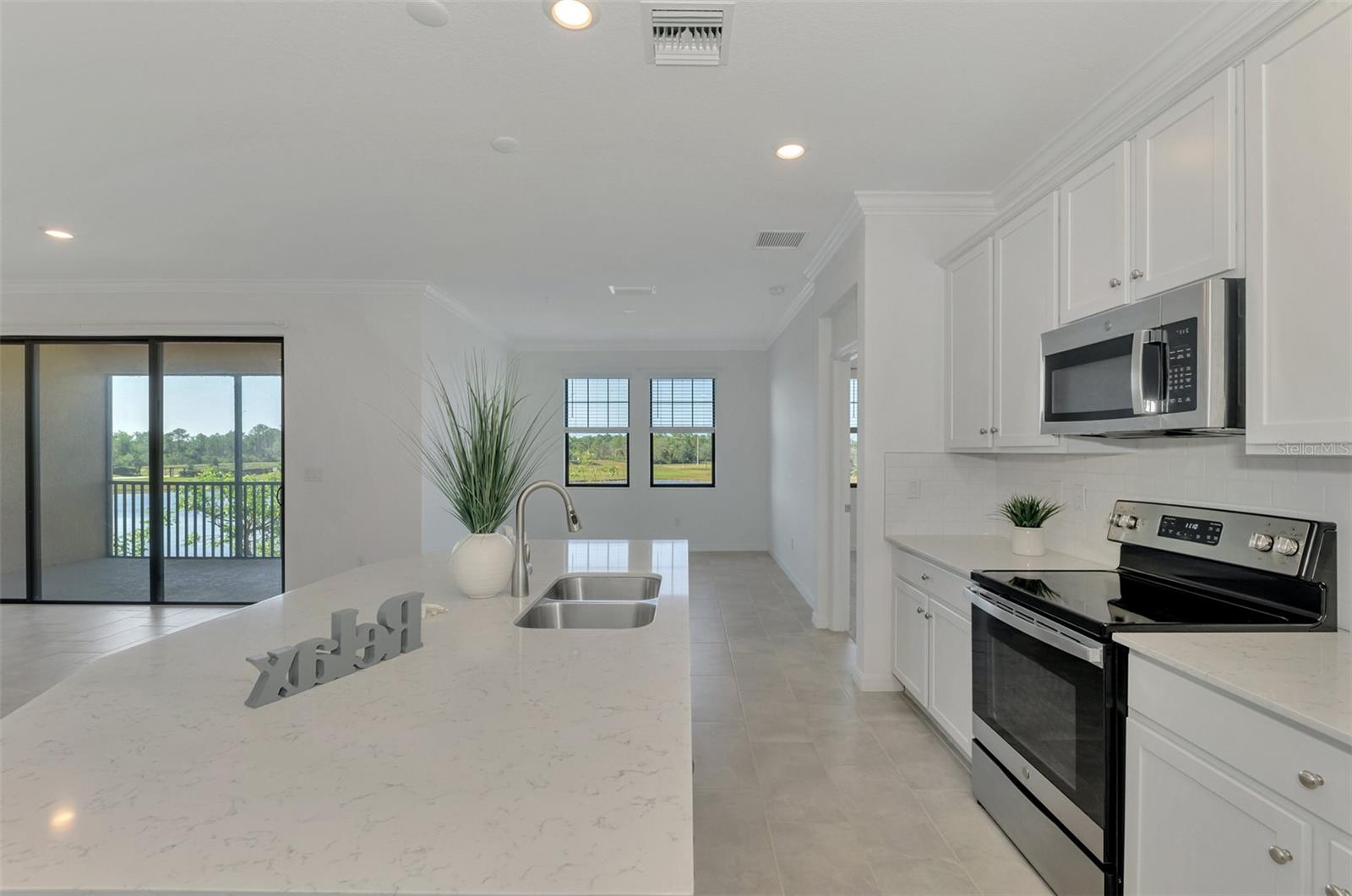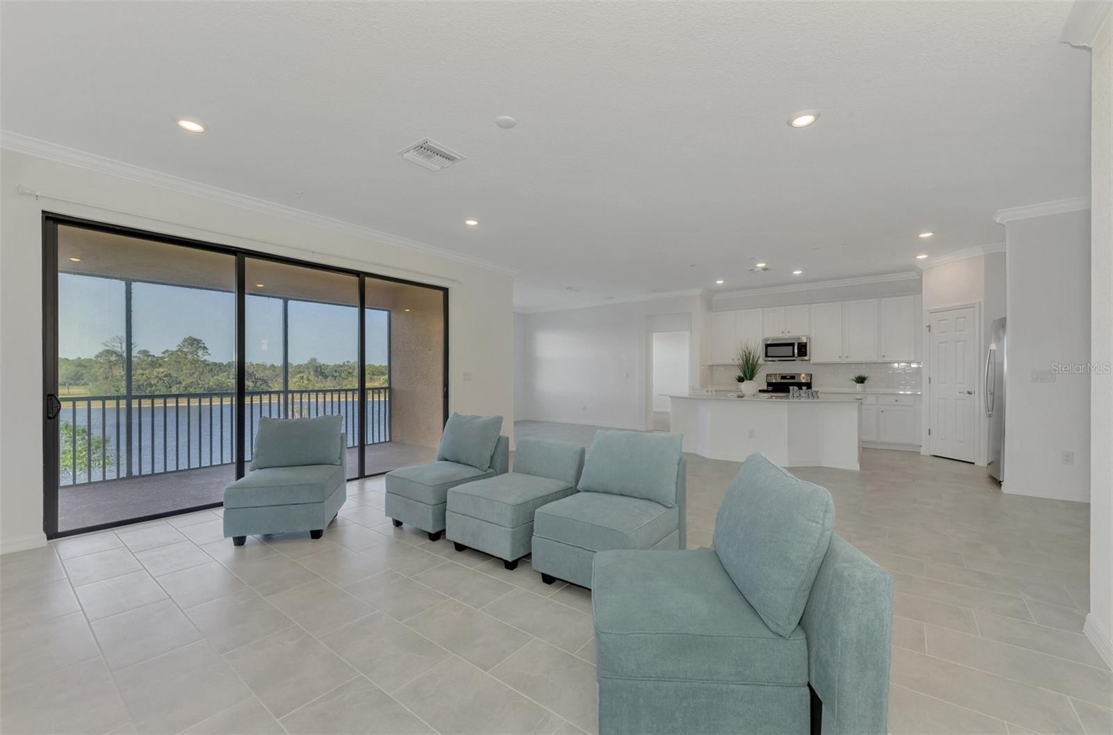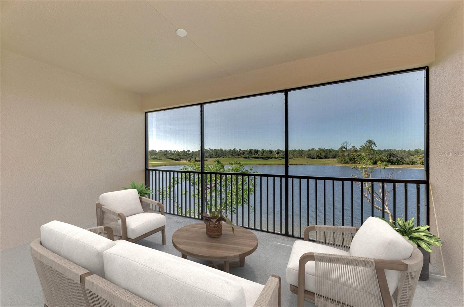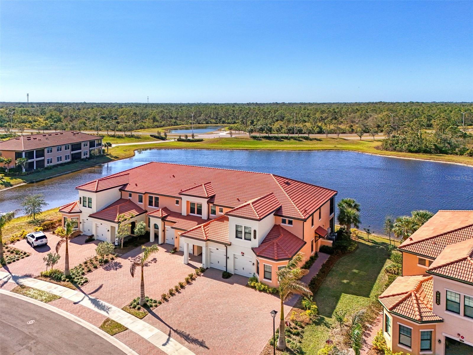 One or more photo(s) has been virtually staged. Incredible Waterfront and Tropical Views from almost every room in the Gated-Resort Community of Sarasota National Golf and Country Club. Sarasota National is an Audubon International Certified Signature Sanctuary surrounded by lakes and wetlands with beautiful wildlife. The Staggerbush Peninsula is known for hosting weekly social activities to meet your neighbors! This maintenance free home has an extraordinary great room with high ceilings and triple sliders leading to the screened lanai with tranquil views where you can enjoy watching gorgeous sunsets. Chefs’ kitchen with 42-inch wood cabinets, quartz counters, Large Breakfast Island, GE stainless steel appliances, subway tile backsplash, large pantry, Spacious dining room with peaceful views of the lake. The king-sized primary suite boasts a large walk-in closet, a beautiful glass walk-in shower, dual sink vanity with quartz counters and private water closet. Separate guest area accommodates 2 bedrooms and a bath that allows privacy. The home has high Wind Impact windows and doors, freshly painted with neutral colors, window treatments, large tile on the diagonal throughout with new carpet in the bedrooms, inside laundry has ample storage, 1 car garage with sealed brick paver driveway for additional parking. Fantastic open floor plan, perfect for entertaining! Amazing Amenity Campus has state-of-the-art clubhouse, 2 full-service restaurants, coffee lounge with TV’s-internet-library and pool side “Tiki Bar” to watch your favorite sports. “Dragonflies” on site Spa for facials and massage, well-appointed fitness center, 2 separate rooms for instructed classes, Resort style swimming pool, lap pool, water aerobics, tennis, pickle ball, bocce ball, playground, 2 dog parks and managed events for entertainment! Sarasota National is located close to the Atlanta Braves Spring training facility, Wellen Park for shopping and restaurants, historical downtown Venice and beautiful beaches. Call today for your private appointment to view this exceptional home!