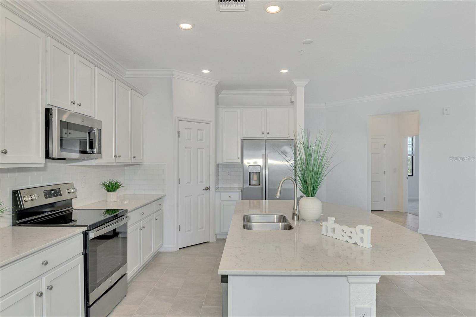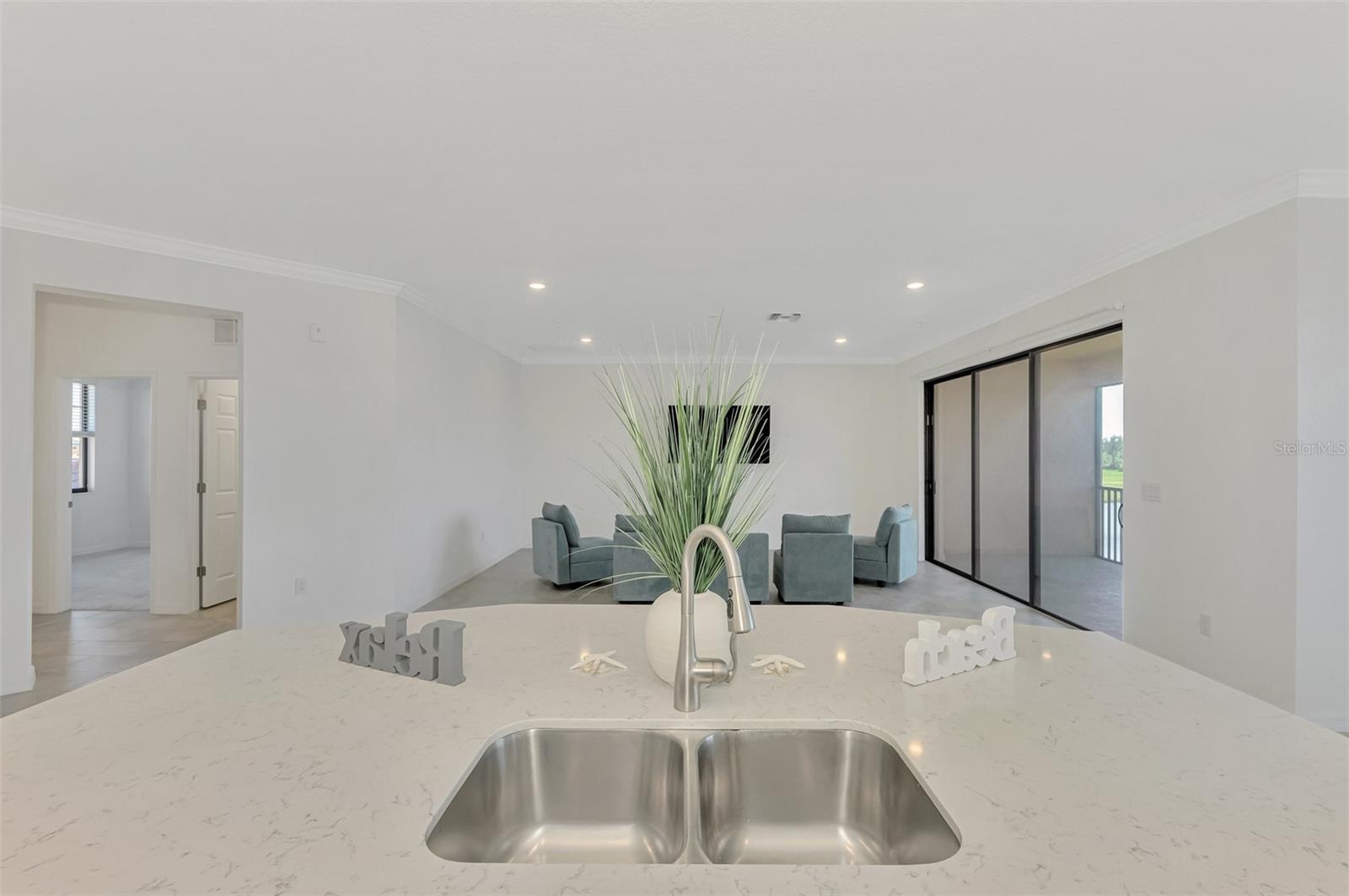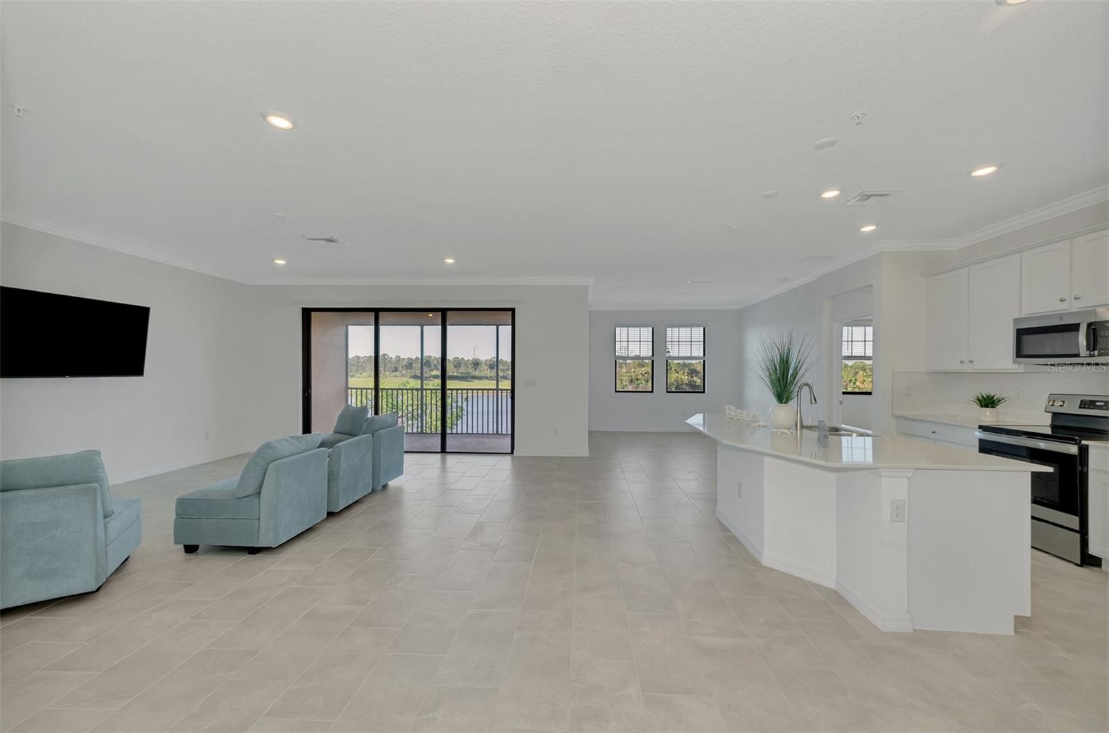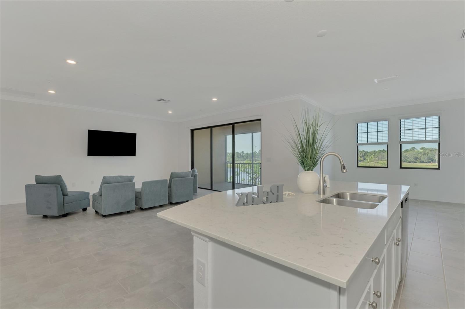 One or more photo(s) has been virtually staged. Incredible Waterfront and Tropical Views from almost every room in the Gated-Resort Community of Sarasota National Golf and Country Club. Sarasota National is an Audubon International Certified Signature Sanctuary surrounded by lakes and wetlands with beautiful wildlife. The Staggerbush Peninsula is known for hosting weekly social activities to meet your neighbors! This maintenance free home has an extraordinary great room with high ceilings and triple sliders leading to the screened lanai with tranquil views where you can enjoy watching gorgeous sunsets. Chefs’ kitchen with 42-inch wood cabinets, quartz counters, Large Breakfast Island, GE stainless steel appliances, subway tile backsplash, large pantry, Spacious dining room with peaceful views of the lake. The king-sized primary suite boasts a large walk-in closet, a beautiful glass walk-in shower, dual sink vanity with quartz counters and private water closet. Separate guest area accommodates 2 bedrooms and a bath that allows privacy. The home has high Wind Impact windows and doors, freshly painted with neutral colors, window treatments, large tile on the diagonal throughout with new carpet in the bedrooms, inside laundry has ample storage, 1 car garage with sealed brick paver driveway for additional parking. Fantastic open floor plan, perfect for entertaining! Amazing Amenity Campus has state-of-the-art clubhouse, 2 full-service restaurants, coffee lounge with TV’s-internet-library and pool side “Tiki Bar” to watch your favorite sports. “Dragonflies” on site Spa for facials and massage, well-appointed fitness center, 2 separate rooms for instructed classes, Resort style swimming pool, lap pool, water aerobics, tennis, pickle ball, bocce ball, playground, 2 dog parks and managed events for entertainment! Sarasota National is located close to the Atlanta Braves Spring training facility, Wellen Park for shopping and restaurants, historical downtown Venice and beautiful beaches. Call today for your private appointment to view this exceptional home!