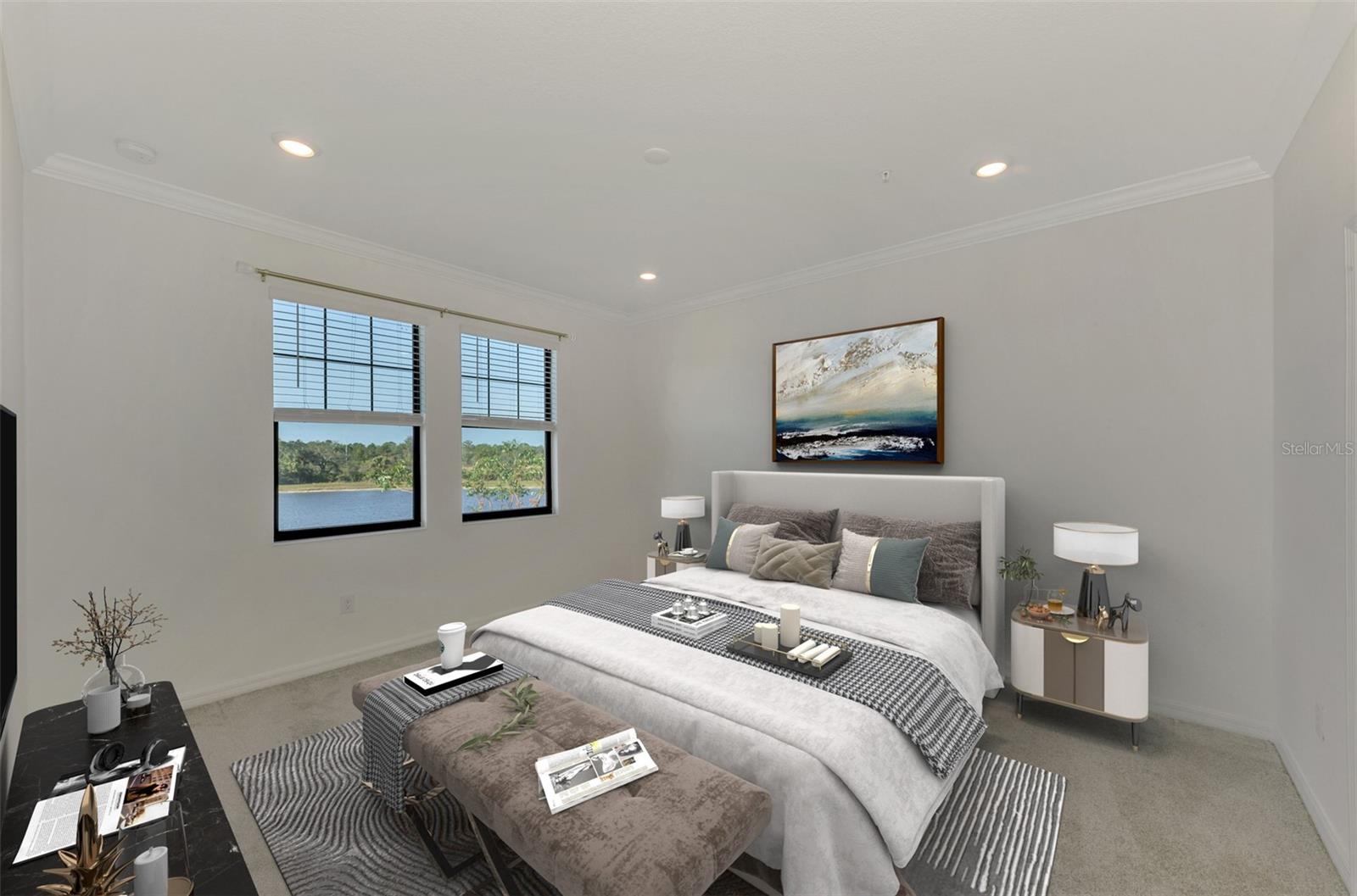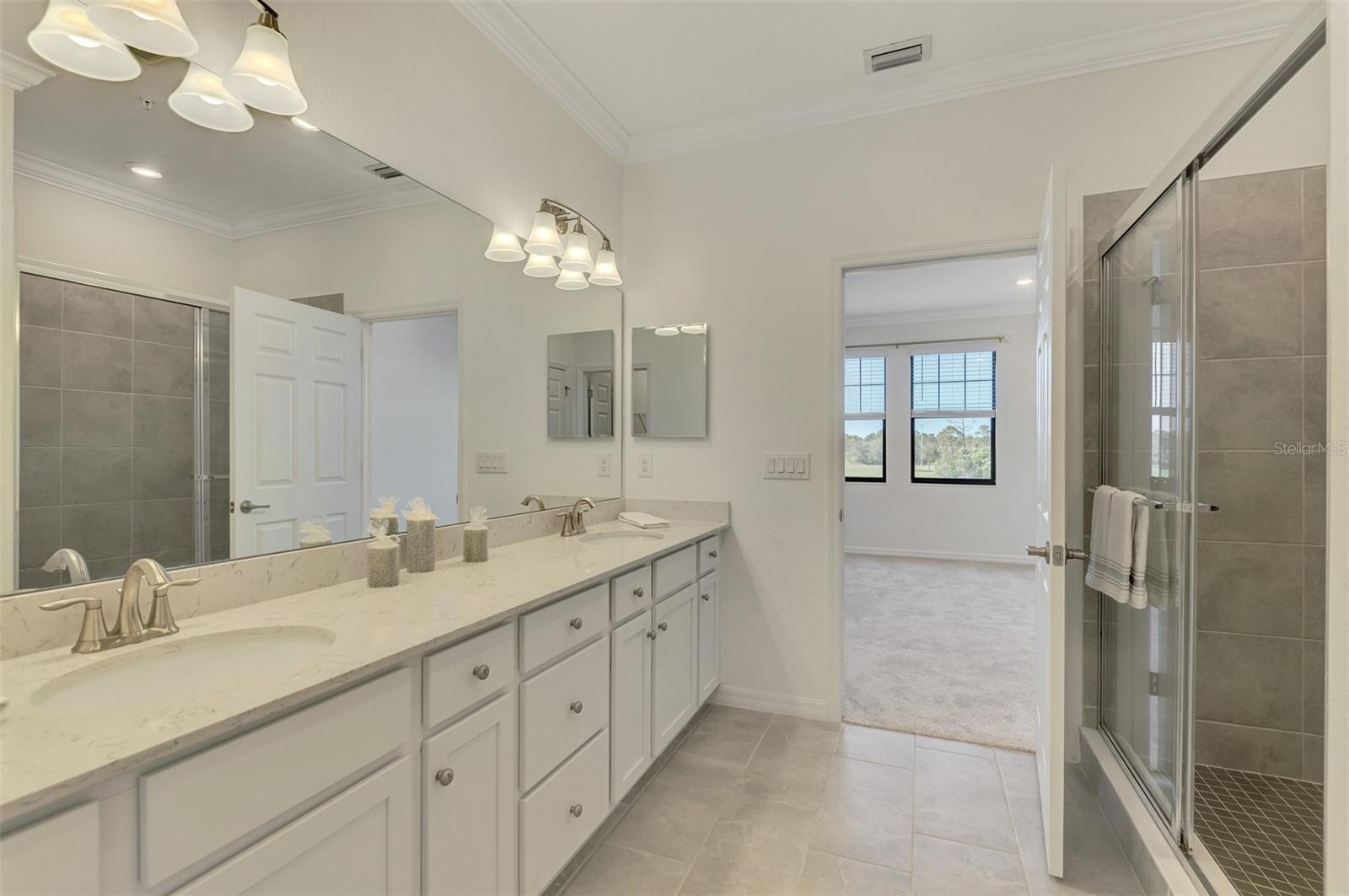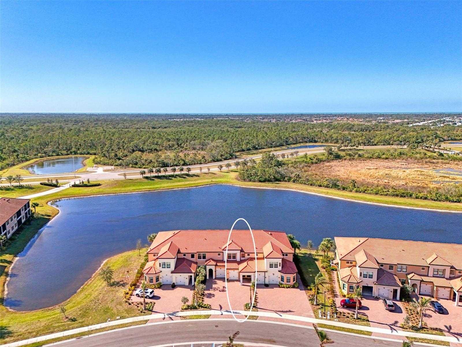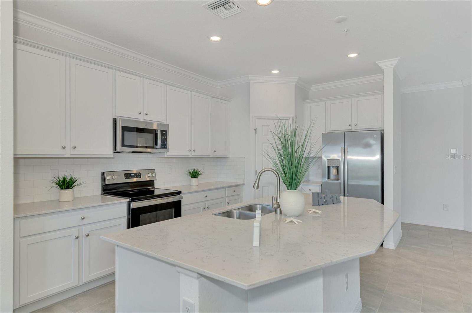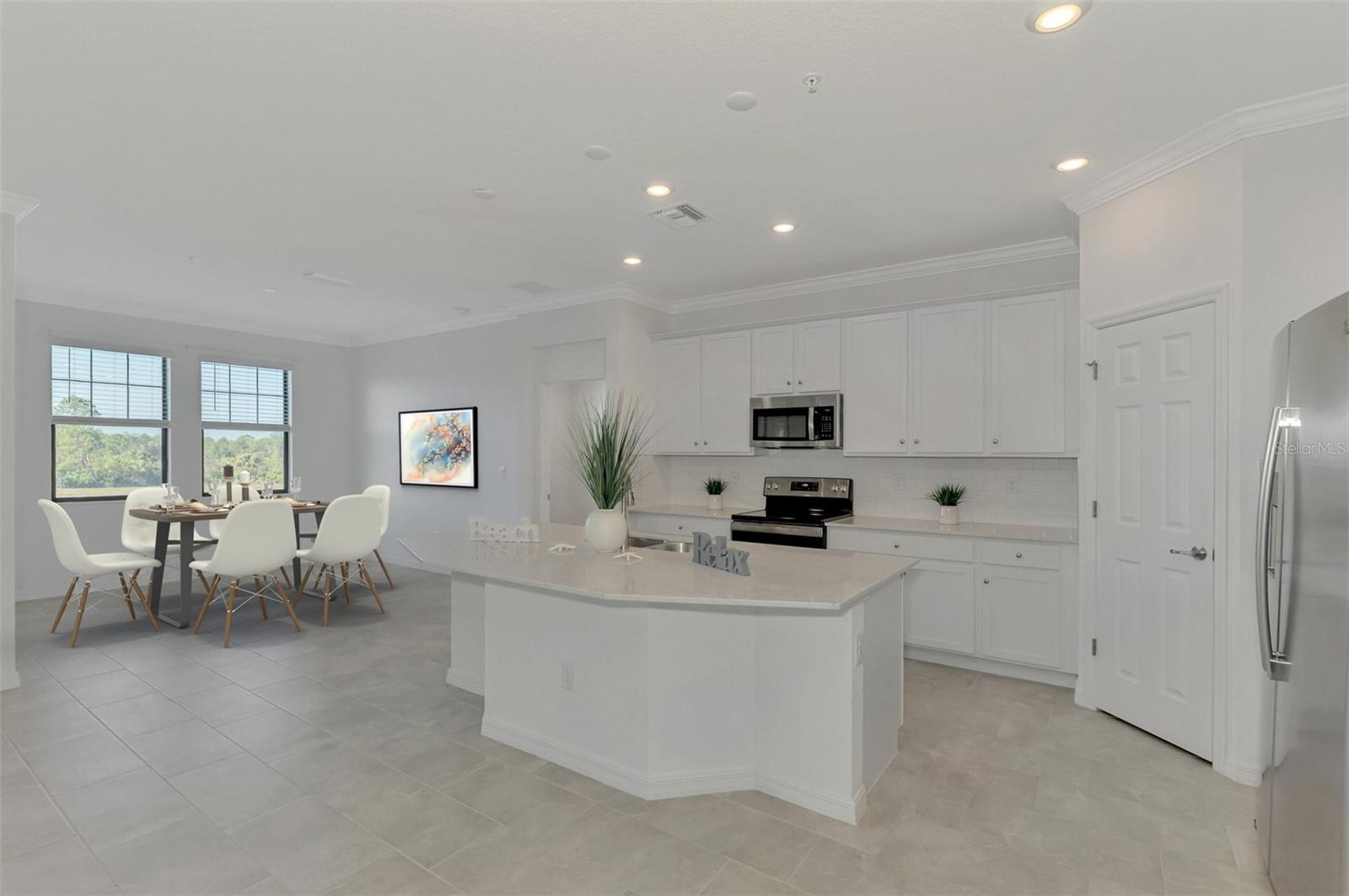 One or more photo(s) has been virtually staged. Incredible Waterfront and Tropical Views from almost every room in the Gated-Resort Community of Sarasota National Golf and Country Club. Sarasota National is an Audubon International Certified Signature Sanctuary surrounded by lakes and wetlands with beautiful wildlife. The Staggerbush Peninsula is known for hosting weekly social activities to meet your neighbors! This maintenance free home has an extraordinary great room with high ceilings and triple sliders leading to the screened lanai with tranquil views where you can enjoy watching gorgeous sunsets. Chefs’ kitchen with 42-inch wood cabinets, quartz counters, Large Breakfast Island, GE stainless steel appliances, subway tile backsplash, large pantry, Spacious dining room with peaceful views of the lake. The king-sized primary suite boasts a large walk-in closet, a beautiful glass walk-in shower, dual sink vanity with quartz counters and private water closet. Separate guest area accommodates 2 bedrooms and a bath that allows privacy. The home has high Wind Impact windows and doors, freshly painted with neutral colors, window treatments, large tile on the diagonal throughout with new carpet in the bedrooms, inside laundry has ample storage, 1 car garage with sealed brick paver driveway for additional parking. Fantastic open floor plan, perfect for entertaining! Amazing Amenity Campus has state-of-the-art clubhouse, 2 full-service restaurants, coffee lounge with TV’s-internet-library and pool side “Tiki Bar” to watch your favorite sports. “Dragonflies” on site Spa for facials and massage, well-appointed fitness center, 2 separate rooms for instructed classes, Resort style swimming pool, lap pool, water aerobics, tennis, pickle ball, bocce ball, playground, 2 dog parks and managed events for entertainment! Sarasota National is located close to the Atlanta Braves Spring training facility, Wellen Park for shopping and restaurants, historical downtown Venice and beautiful beaches. Call today for your private appointment to view this exceptional home!