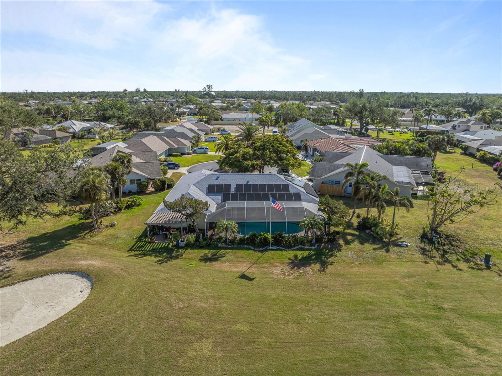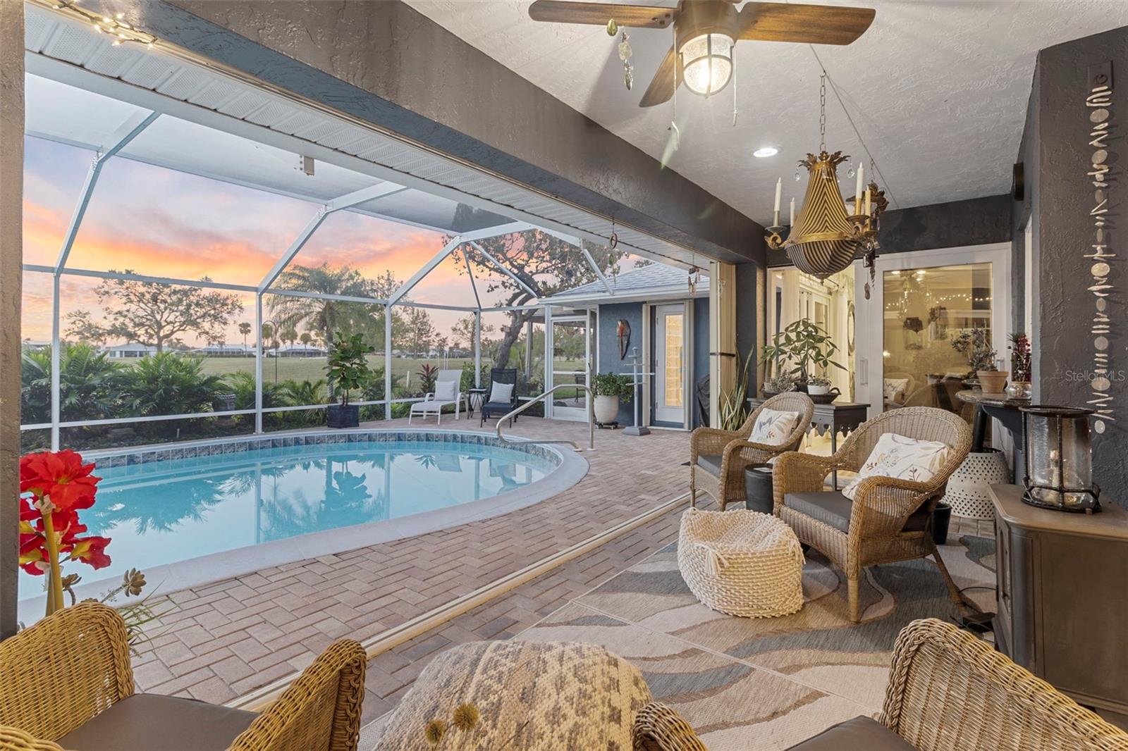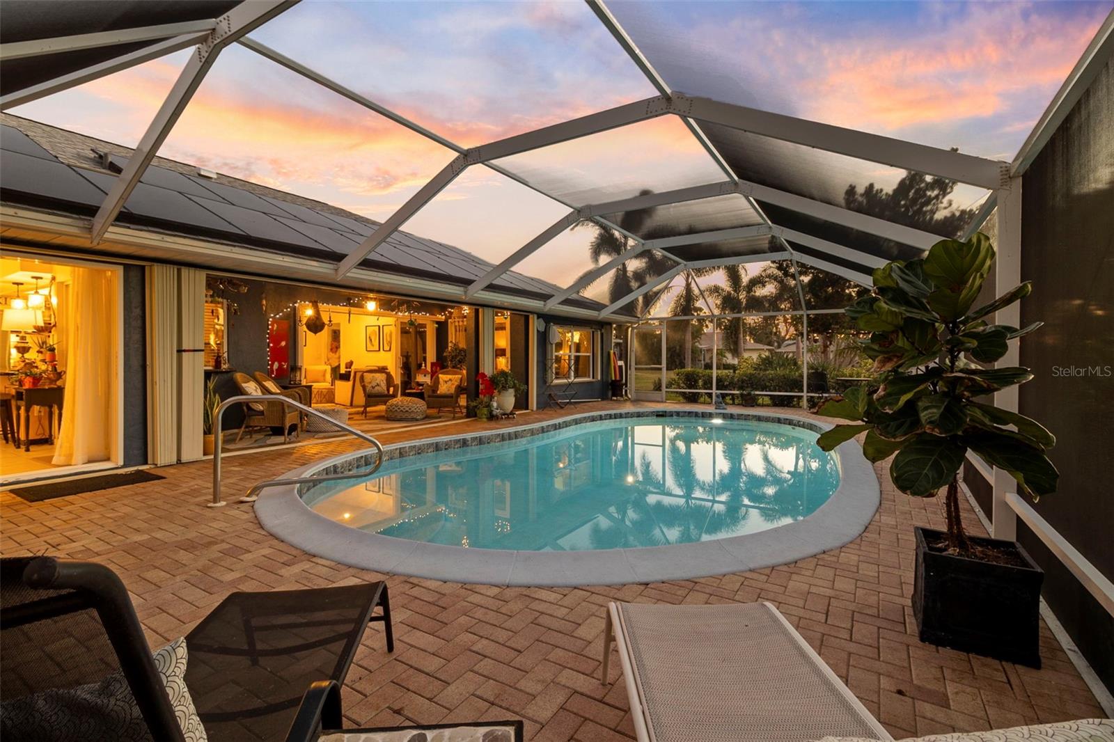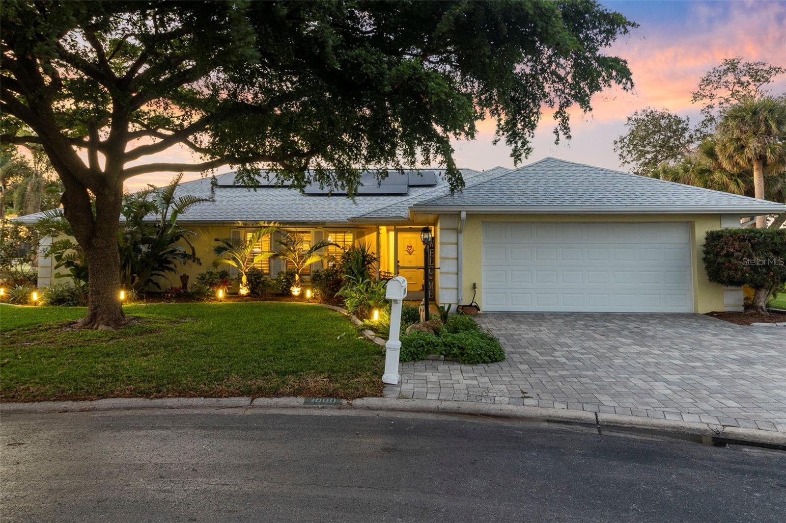 Nestled in the heart of Venice, Florida, this exquisite residence beckons those with a penchant for refined living. A harmonious blend of sophistication and comfort awaits within this three-bedroom, three-bathroom haven, where every detail has been meticulously crafted to elevate your lifestyle. This home exudes charm and character that is often missed in new construction today. Welcome to 1000 Joyce Ct, a stunning pool home situated on a serene, quiet street with only nine homes and a pristine golf course. With a west-facing rear, this property offers breathtaking sunset views, a charming pergola, and multiple updated glass sliders that frame captivating vistas of the oversized 8 foot deep heated saltwater pool and golf course. Furnishings are optional, offering flexibility to suit your needs. Modern updates include a 2022 roof, A/C system, and a 41-panel solar system for exceptional energy efficiency. The oversized pool, featuring a newer Built Right heater and pump, invites year-round relaxation. Inside, 24" tile floors flow seamlessly throughout, complemented by updated Samsung kitchen appliances and a 2022 hot water heater. Hurricane shutters and an impact-rated garage door provide peace of mind. Designed for both elegance and functionality, the spacious layout features a large living area, a formal dining room, and a cozy nook in the master bedroom. The pool bath offers added convenience for outdoor gatherings. This home sits on an expansive cul-de-sac lot, providing privacy, low HOA fees, and the benefit of being outside any flood zone. Ideally located just 10 minutes from Wellen Park, 15 minutes from the beach, and 15 minutes from historical downtown Venice, this home offers a lifestyle of luxury, comfort, and unparalleled convenience. Don’t miss the chance to make it yours!