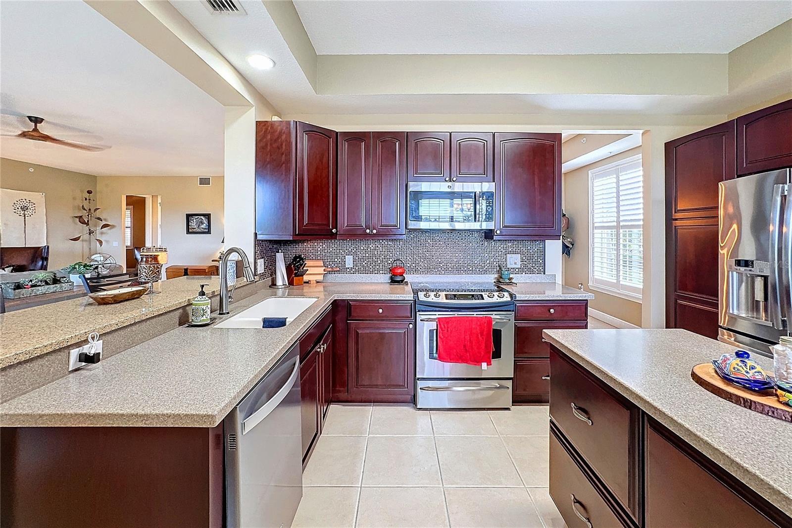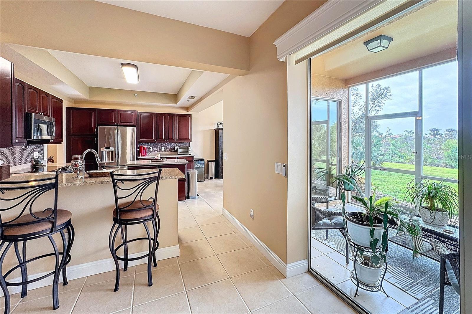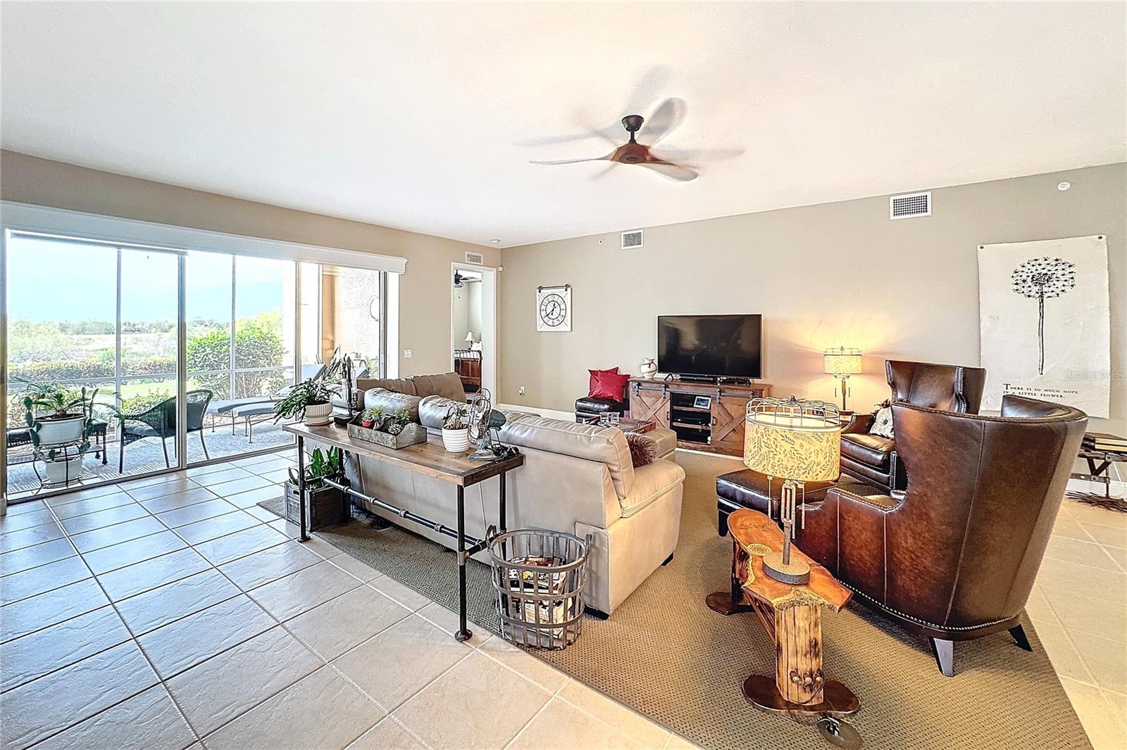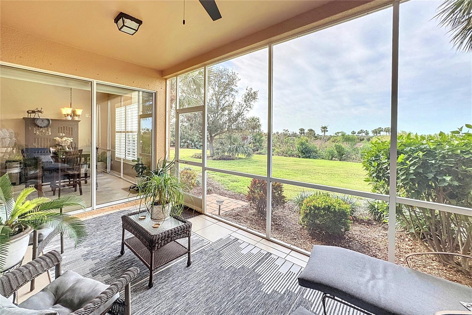GOLFER'S PARADISE, with 2 Troon Golf Memberships Included! Calling all golf enthusiasts! This exceptional ground-floor end unit comes with two coveted golf memberships to the prestigious Troon-managed course, designed by renowned architect Gordon Lewis. Enjoy access to a complete golf facility featuring a grand clubhouse, putting and chipping greens, and more. Relax and take in breathtaking sunsets from your west-facing lanai, offering stunning views of the lush nature preserve and the 12th hole. Inside, you’ll find expansive living spaces, soaring ceilings, and a 21' x 28' living room perfect for entertaining. The modern kitchen impresses with an island, breakfast bar, and a sun-filled 10' x 12' breakfast area overlooking the preserve. The primary suite is a true retreat, featuring a spacious 12' x 16' bedroom, luxurious ensuite bath with separate soaking tub and shower, and an enormous 11' x 12' walk-in closet. Recent updates include elegant plantation shutters and luxury vinyl flooring in both bedrooms. Additional highlights include a versatile den with French doors, a formal dining room, a guest bedroom with its own full bath, an indoor laundry room, and an attached two-car garage, all within a generous 2,367 sq. ft. layout. Live like you're on vacation every day with resort-style amenities: a zero-entry heated pool with lap lanes and spa, a full-service restaurant and tiki bar, a state-of-the-art fitness center with instructors and classes, spa treatment rooms, a library, coffee lounge, tennis courts, bocce, pickleball, and even a dog park. This condo is in a gated community that truly has it all. Don’t miss this opportunity to live the dream!