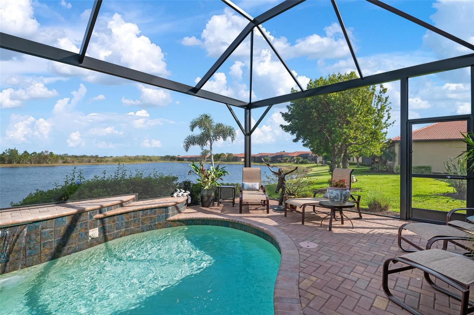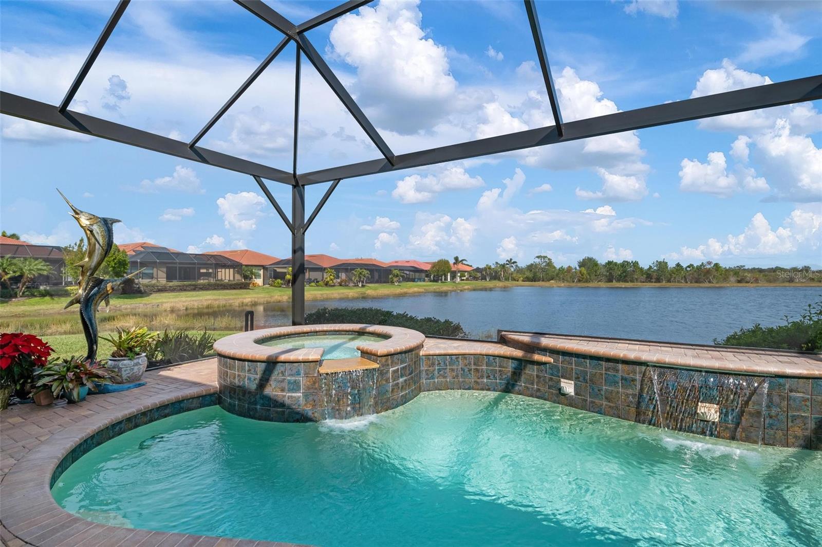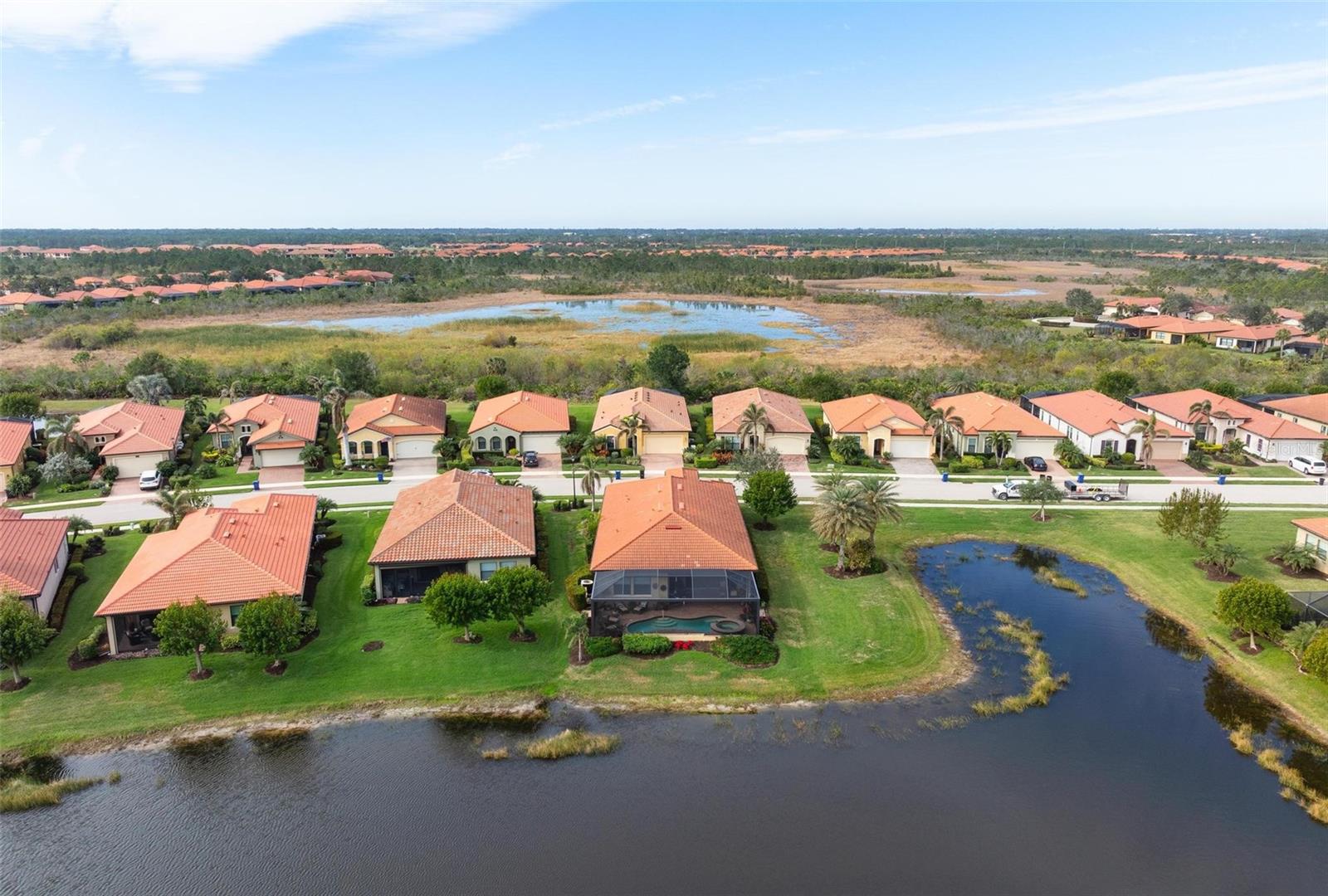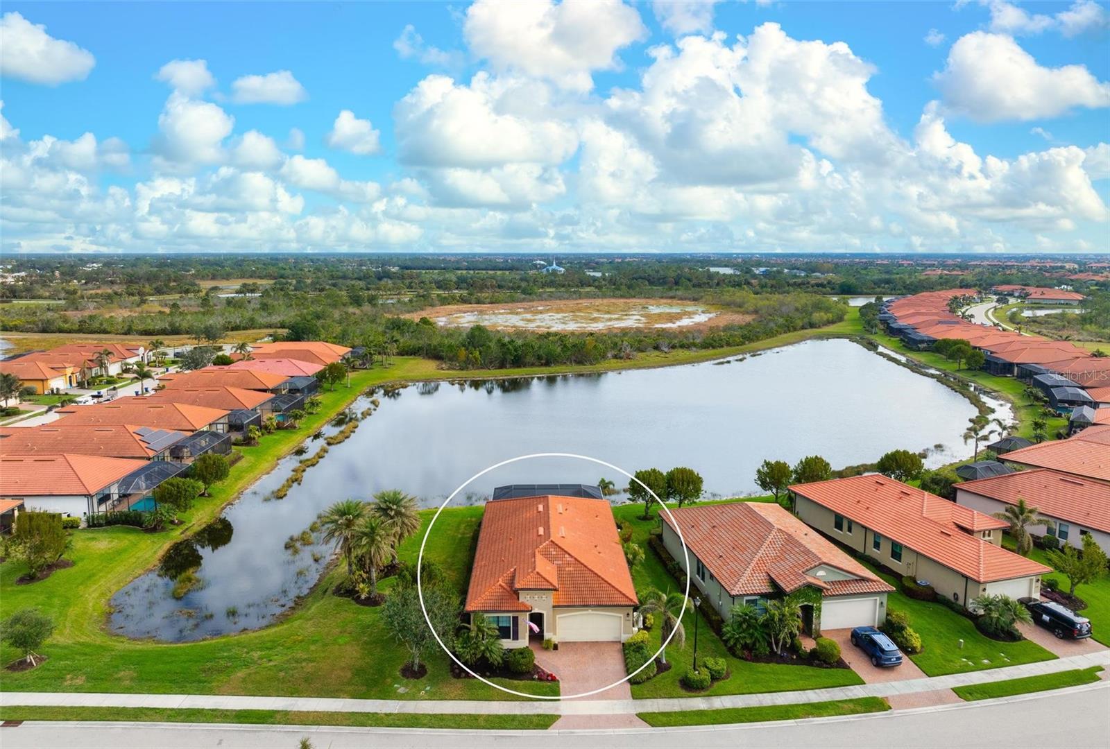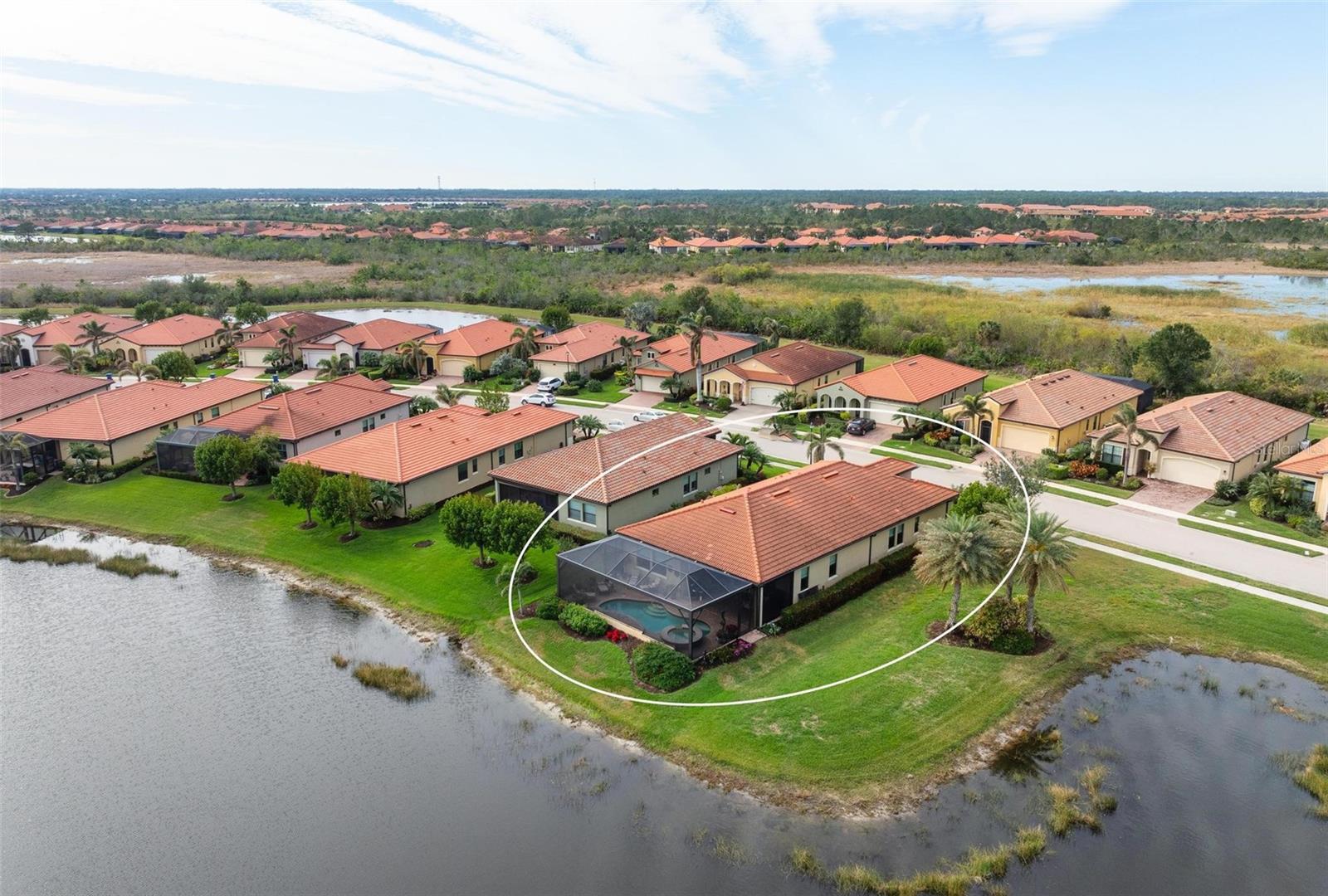 Wrap around water views of the natural Florida landscape are yours to enjoy from sunrise to sunset. Welcome to the Key Largo by WCI Homes, a true symbol of quality and craftsmanship, located in the exclusive Lake Village of Sarasota National. This stunning private tip lot offers breathtaking water and preserve views, providing the perfect backdrop for your everyday living. Step outside to your heated saltwater pool and spa, with a clearview screen enclosure for unobstructed views. Inside, you'll find luxurious 8-foot interior doors, tall baseboards, and beautiful travertine-look porcelain tile throughout the living areas and baths. The gourmet island kitchen features staggered solid wood linen cabinets with crown molding, under-cabinet lighting, granite countertops, and sleek stainless-steel appliances. Each of the three spacious bedrooms boasts its own private full bath, providing ultimate comfort and privacy. Additional upgrades include extensive landscape lighting, a whole-home water conditioning system, impact-resistant windows and doors, and a whole-home generator for peace of mind. This certified Audubon community offers miles of picturesque sidewalks winding through the natural Florida surroundings. Enjoy superb amenities such as a resort-style pool with a tiki bar overlooking the golf course, a fitness center, pickleball and tennis courts, a coffee lounge, and an on-site restaurant. For dog lovers, there's even a park just for your furry friends! As a Lake Village homeowner, you'll also have access to the golf course during the off-season. Excellent location right between Downtown Wellen Park with its shops, restaurants and Braves Stadium and Historic Downtown Venice with its quaint shops, tree-lined streets and beautiful beaches. Experience the very best in luxury living with this exceptional home—schedule your private showing today!