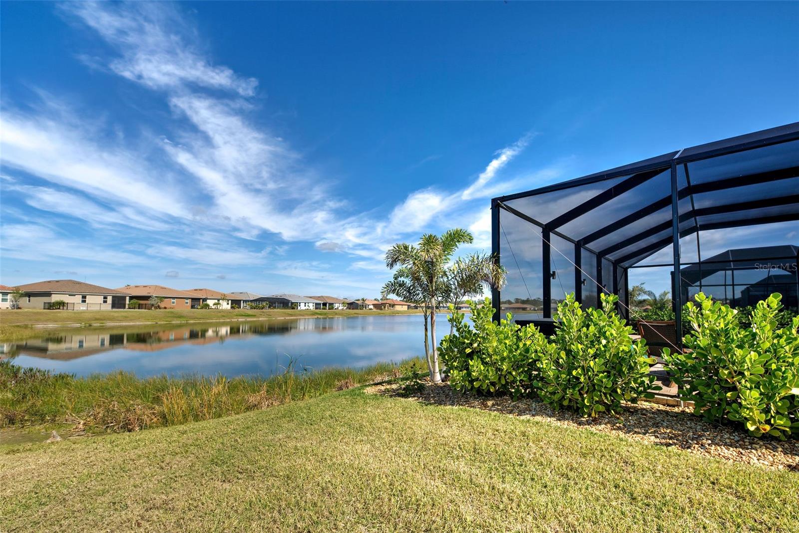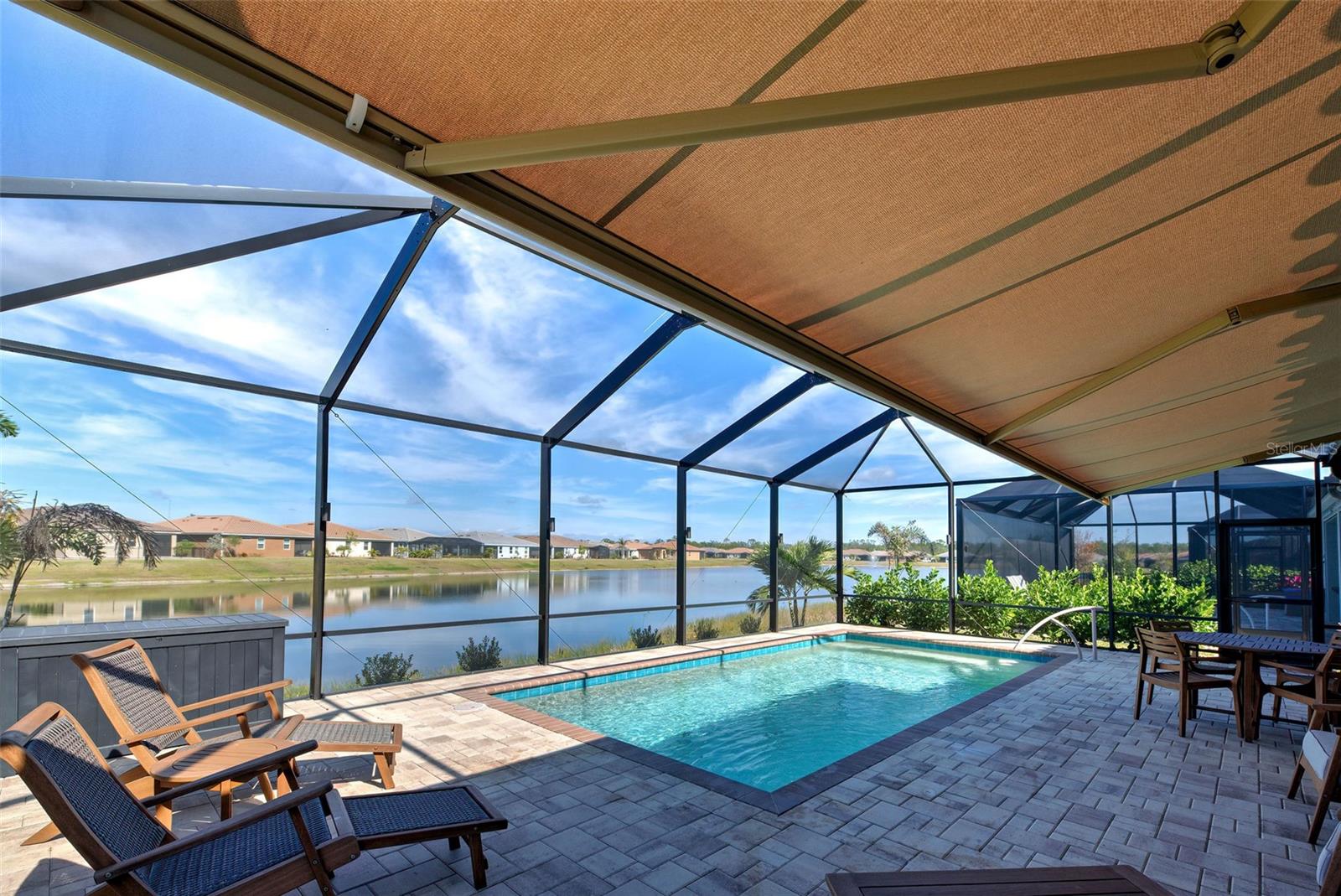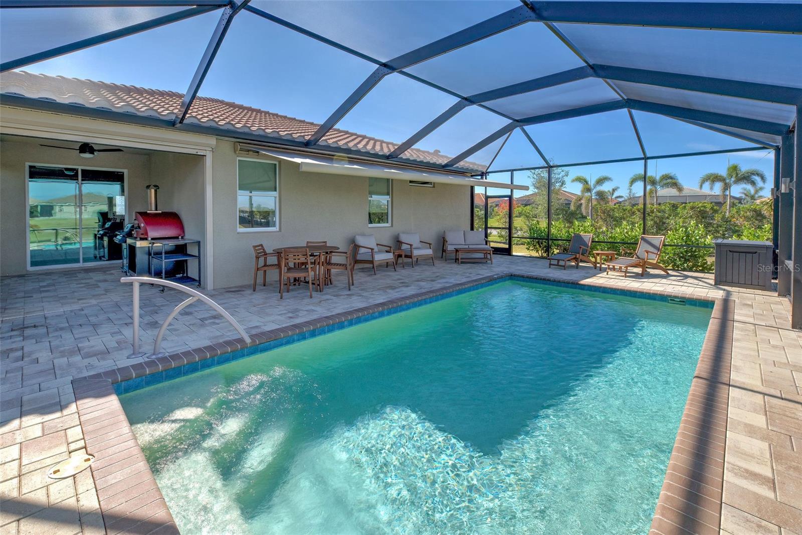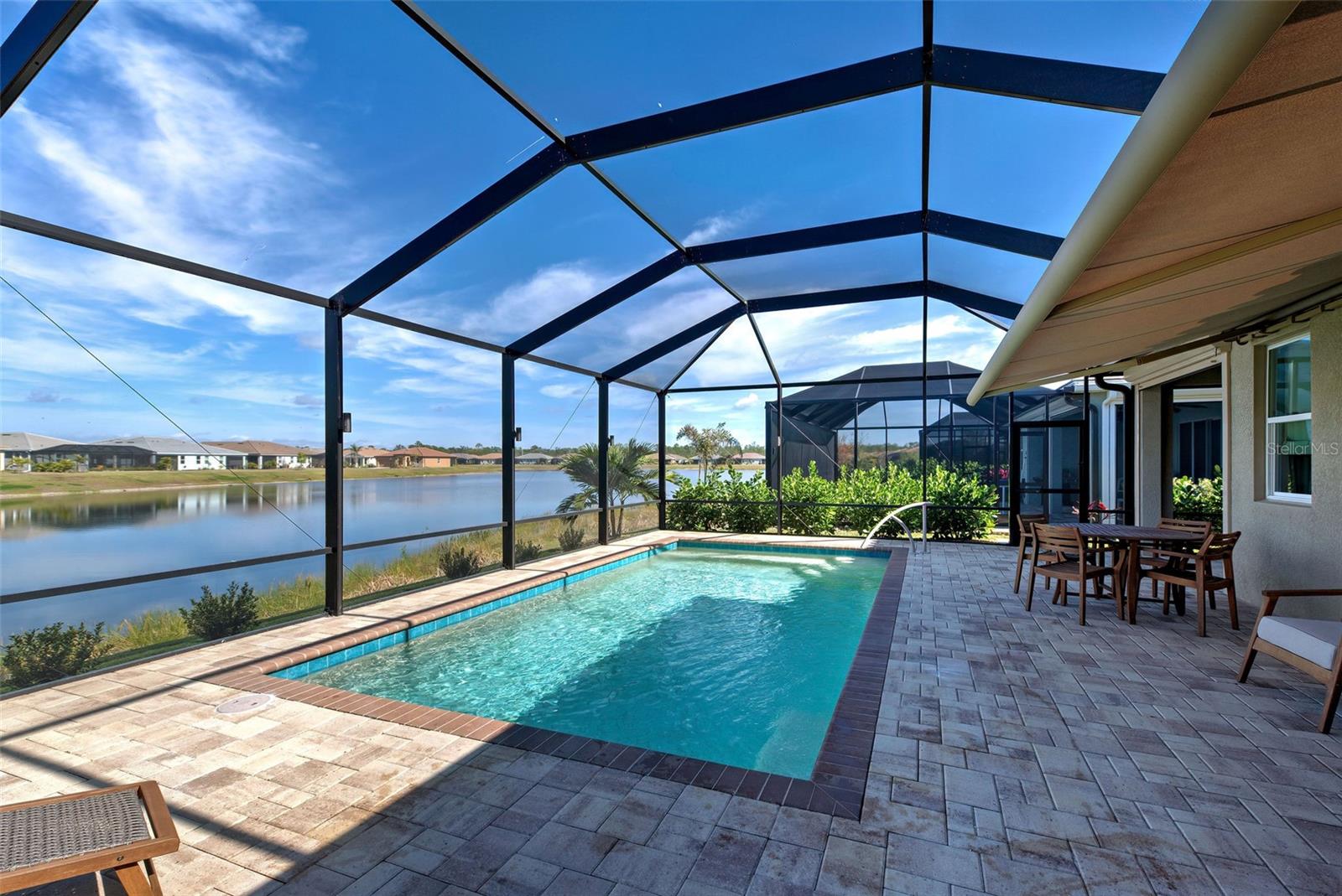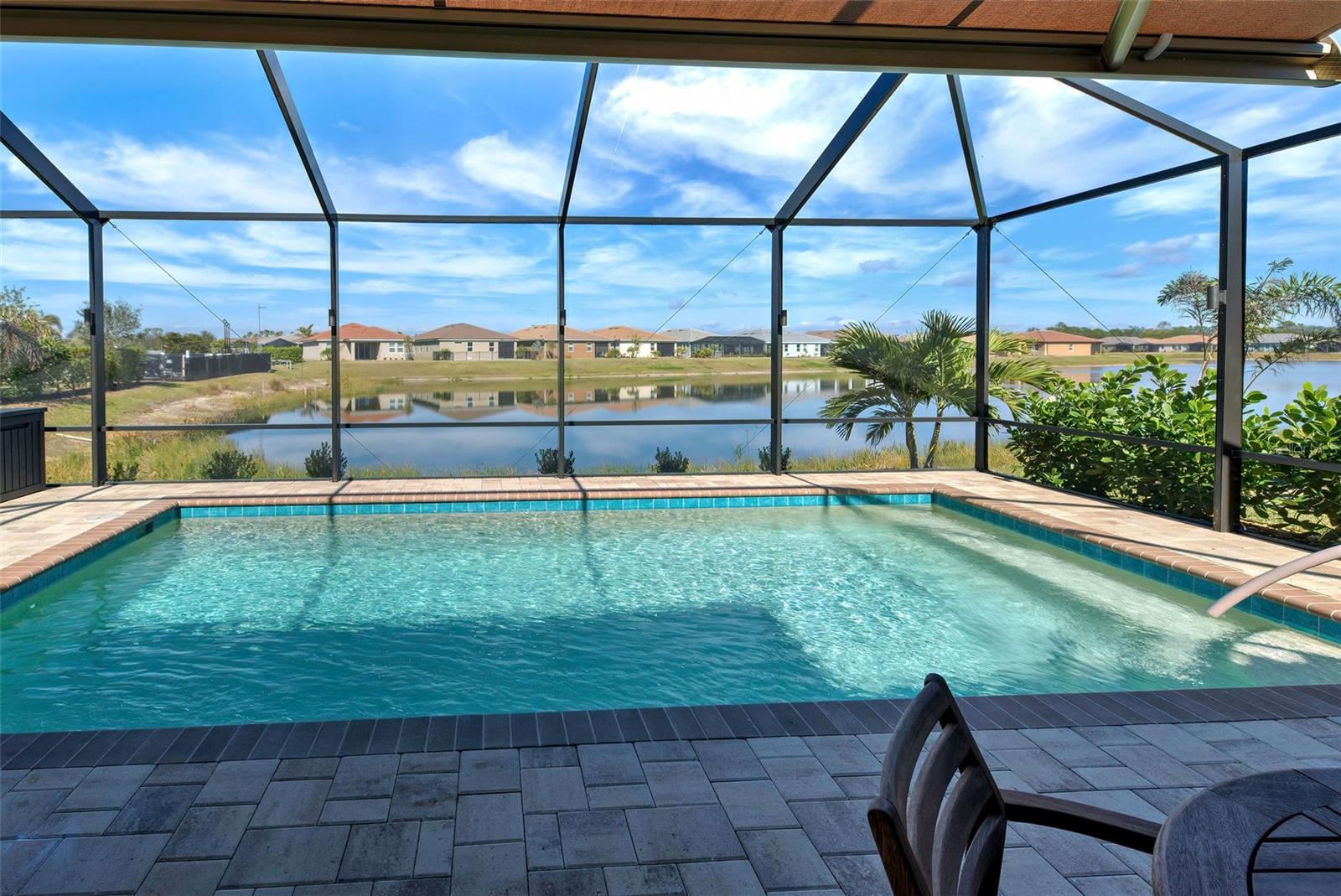 Must see: Turnkey Furnished: The owners have spared no expense in furnishing and decorating this home and you will fall in love with it! Located on a corner lot, you will be impressed with this pristine-3-bedroom home plus a flex room, 2.5 Bathrooms, elegant lighting and custom blinds. It is turn-key ready...a rare opportunity to have a newer home (less that 4 years old), fully furnished (including an outdoor grill), with a good size heated pool, awesome furniture...enough for a party! and lake view. It has an open floor plan including a study or retreat room and 8 ft. doors add to the open feeling. The chef's kitchen has stainless steel appliances, custom cabinets, bar stools, walk-in pantry, granite counter and overhead lighting. There is a formal dining area with sitting for 6. The living room provides a great view of the pool and lake and provides comfortable seating for your guests. The owner's suite is very private with tray ceiling, crown molding, king size bed, and has an 8x9 owner's closet that you will love. There are 2 guest bedrooms with a "retreat" room in between. The main living area has tile flooring, and the bedrooms have carpet. The laundry room has a large stainless steel utility sink with sprayer. Enjoy your time in the pool (heated and chilled), with a privacy screen, outdoor lighting and retractable awning over the pool-patio area. In add, you will enjoy cooking outdoors with your gas grill and entertaining friends and family. The 2-car garage is the cleanest garage I've seen, and the epoxy flooring is like new. In addition, you have: R30 ceiling insulation, in wall pest control, hurricane shutters and smoke detectors. The fun part of living here, is all of opportunities for having FUN: Meet with your friends or enjoy your free time at the resort-style amenity center with: Pool and Fitness Center, Walking and Biking trails, Tennis courts, Pickle Ball Court. In addition, Blue Heron Park is nearby. Or visit Wellen Park nearby: Park's shops, restaurants and Ball Park. Take advantage of your closeness to Venice Beach, which is approximately 20-25 min. drive.