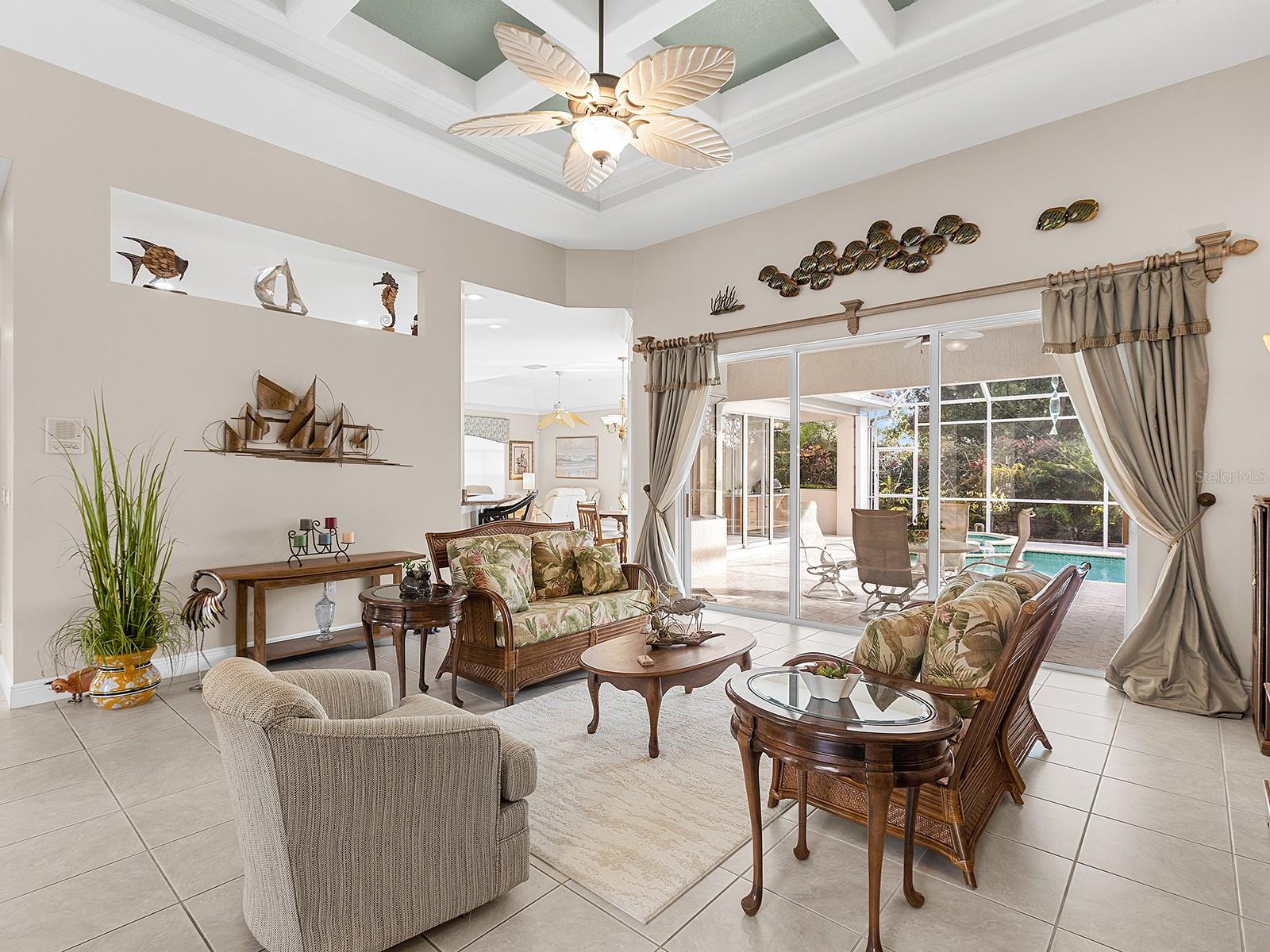 This stunning four-bedroom, three-bathroom, pool home features a bonus den/office and a rare three-car garage, offering both space and versatility. Spanning over 3,000 square feet, it boasts the largest floorplan in Venetia, making it perfect for entertaining or enjoying an executive-style retreat. Buyers can move in with confidence, as this home has been meticulously maintained and upgraded, including a new roof (2024), new A/C (2021), complete replumbing (2016), a resurfaced pool, and whole-home accordion hurricane shutters. Inside, you’ll find a thoughtfully designed layout with both a living room and family room with wet bar, a formal dining room, and a cozy dinette with picturesque aquarium windows overlooking the lanai. The gourmet kitchen is a chef’s dream, featuring rich wood cabinetry, granite countertops, stainless steel appliances, and a spacious island with cooktop. The highlight of the home is the zero-corner sliding glass doors in the family room, seamlessly blending indoor and outdoor living. Step outside to your private oasis—a custom pool and spa, covered lanai, and a fully equipped outdoor kitchen, perfect for year-round relaxation and entertaining. Ideally situated on a tranquil street with park views and no through traffic, this home is just minutes from the beach. Plus, enjoy the perks of an active, amenity-rich community with low HOA fees and no CDD fee.