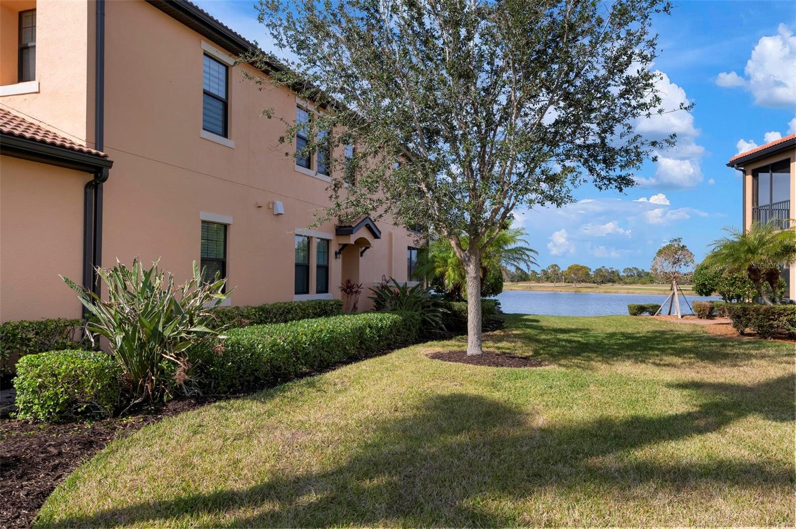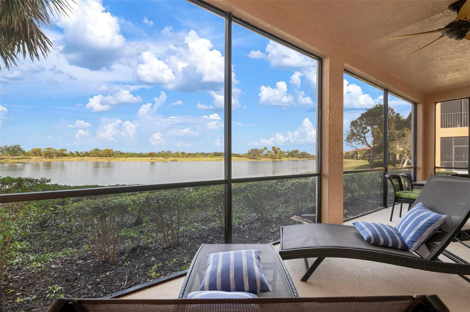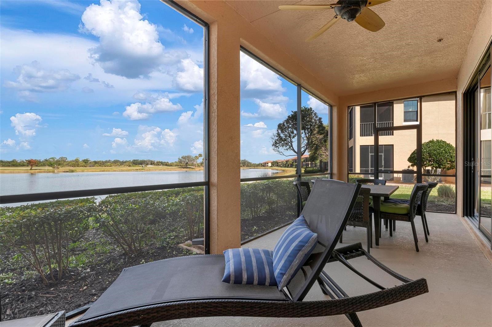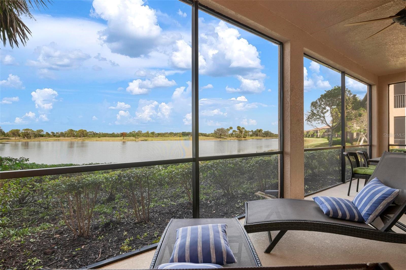 Welcome to maintenance free living! This stunning 2 bedroom plus den, 2 bathroom, first floor condo offers breathtaking water and golf course views, creating a serene and picturesque backdrop for everyday living. With 2 deeded golf memberships you'll enjoy unlimited access to premier fairways! This condo is designed with a bright and open floor plan and is flooded with natural light enhancing its spacious feel. This open floor plan features elegant finishes, and tasteful accents making it a perfect blend of comfort and sophistication. The split floor plan provides privacy for both owners and guests. The den can be utilized as a third bedroom. Enjoy your meals in the dinette area, at the breakfast bar or out on the screened lanai. It is here you will take in the colors of nightly sunsets! Along with the two car garage, there is a spacious laundry room as well as a large storage closet in addition to the kitchen pantry. Sarasota National offers an abundance of amenities including an onsite spa, fitness center with trainers, resort style pool, restaurant, coffee shop, tennis courts, pickleball and a dog park to name a few. Whether you end a busy day overlooking the water and sunset or are entertaining in the airy living space, this condo provides a luxurious retreat for golf enthusiasts and those who appreciate upscale living.