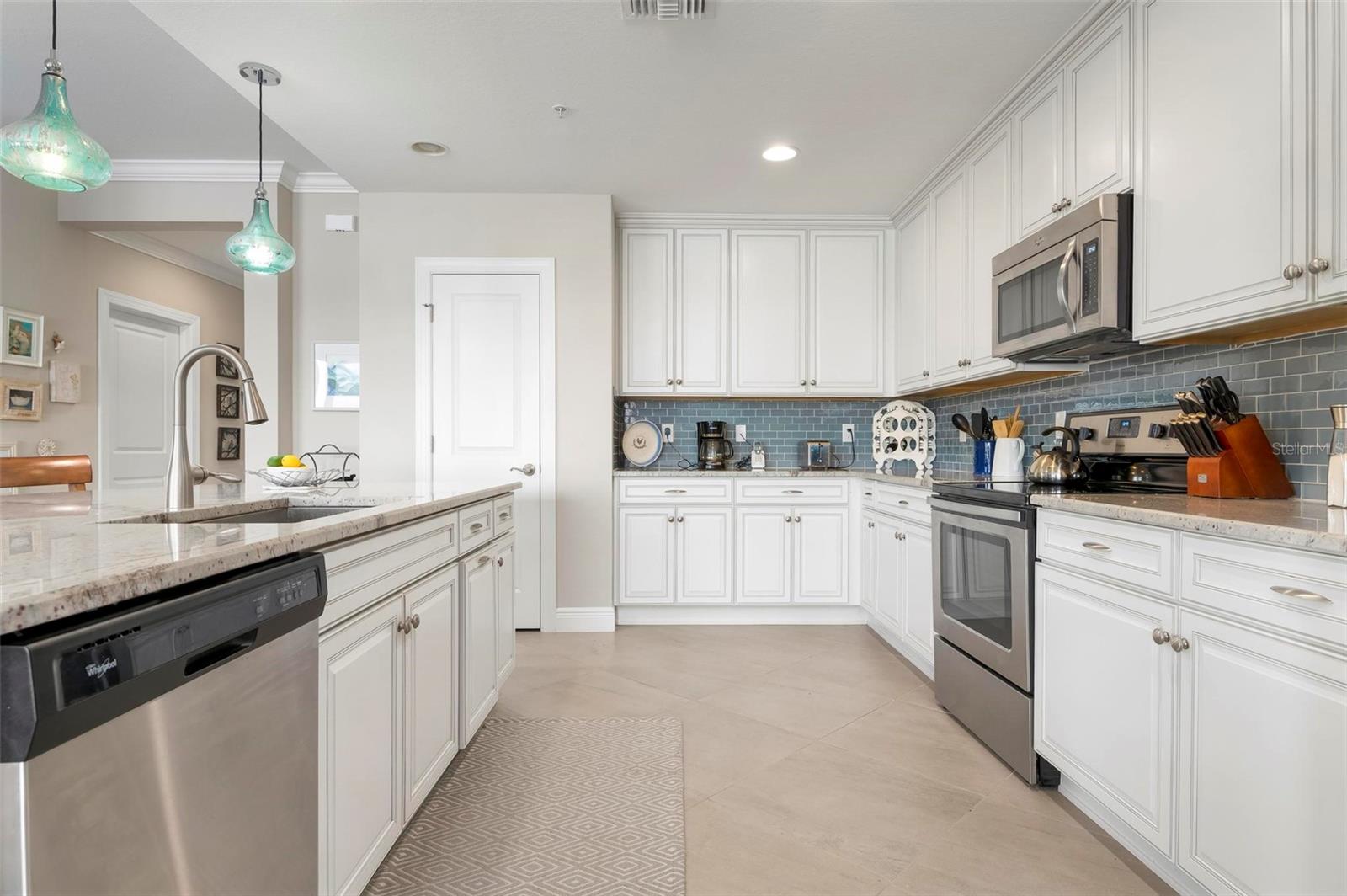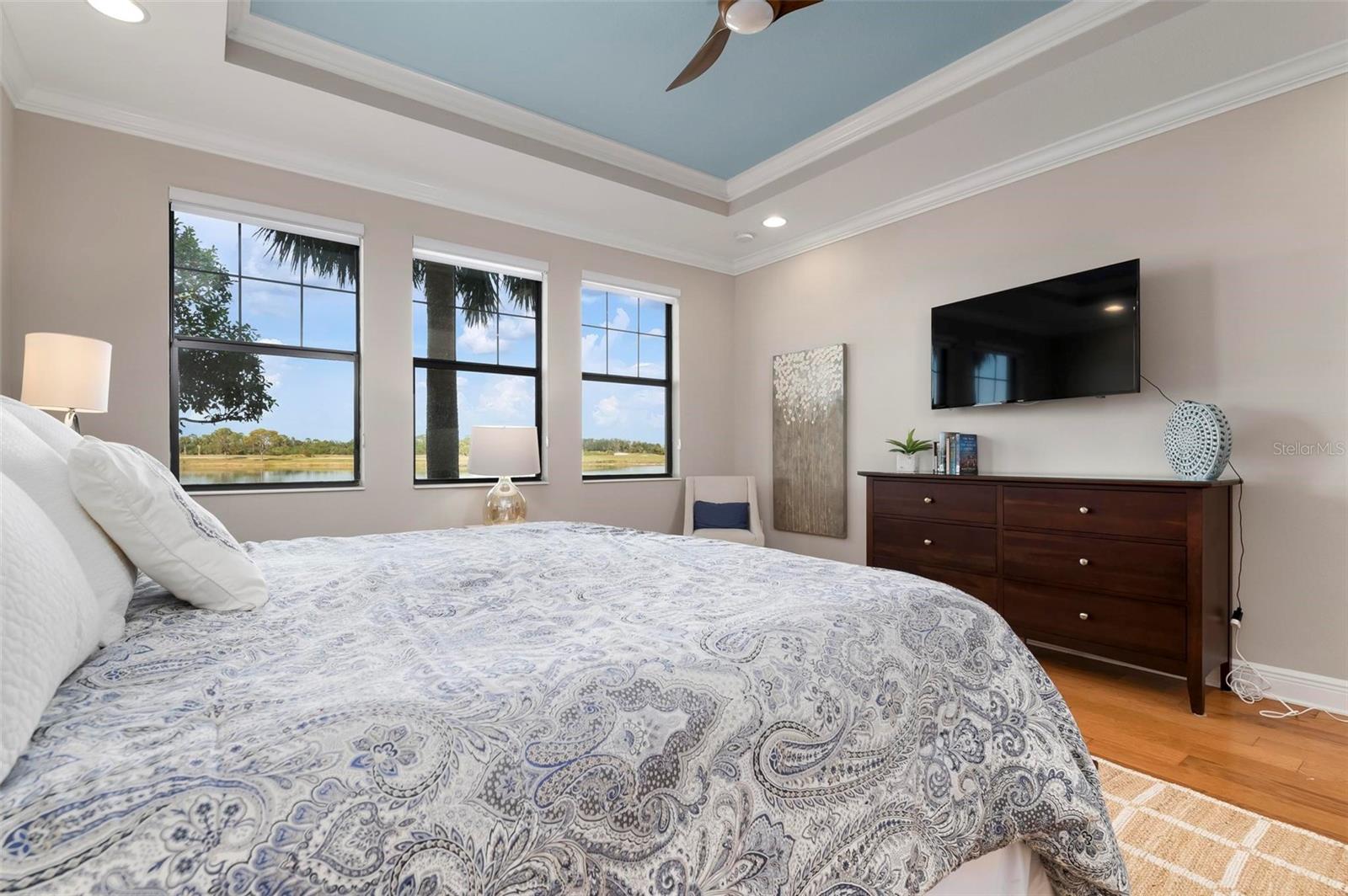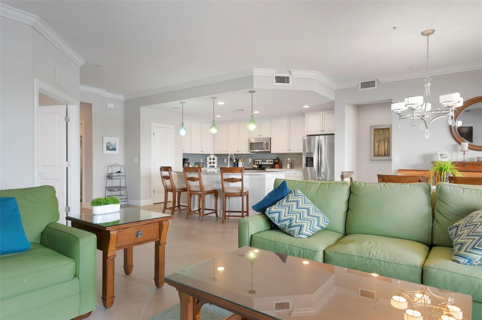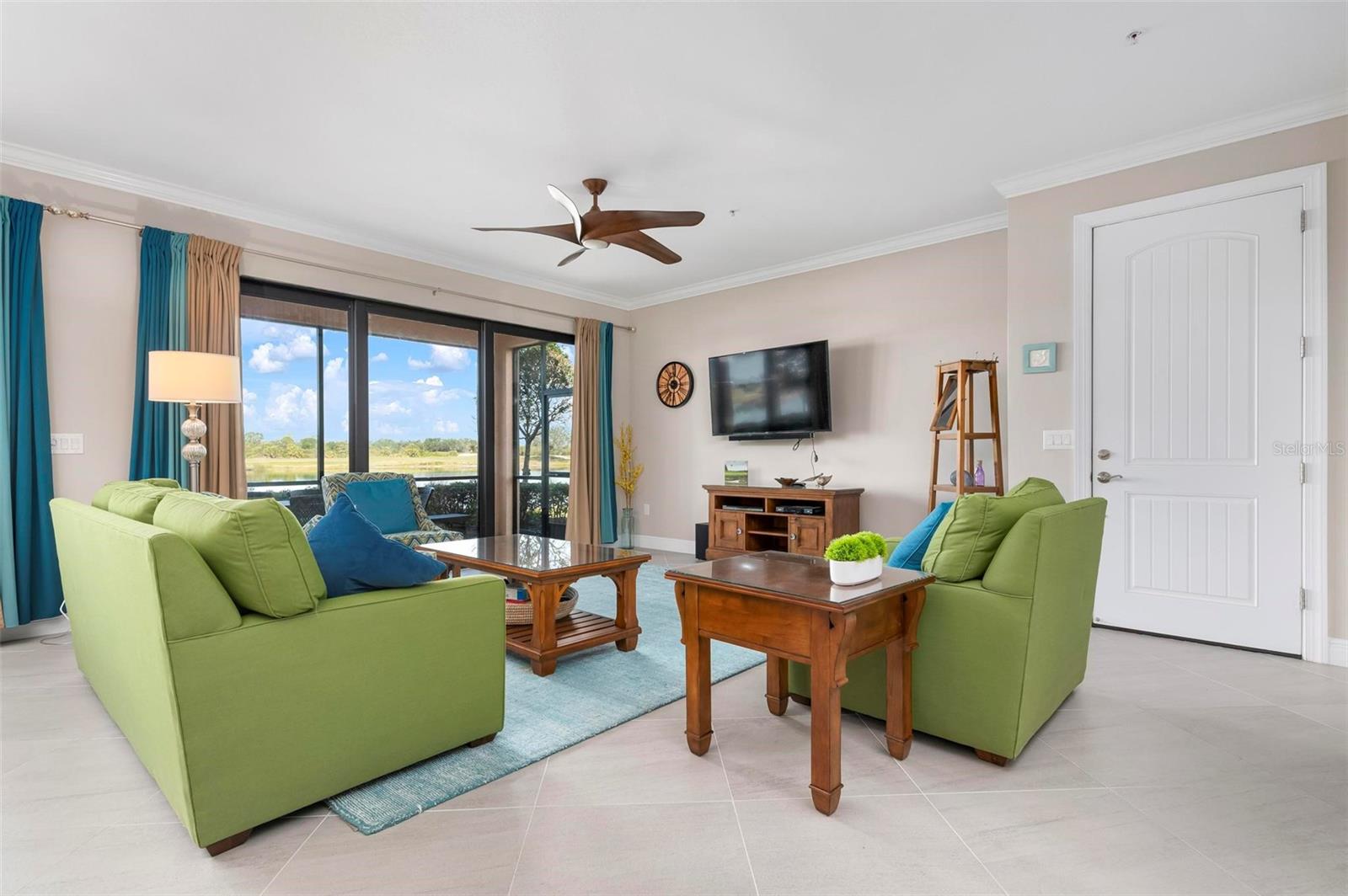 Welcome to maintenance free living! This stunning 2 bedroom plus den, 2 bathroom, first floor condo offers breathtaking water and golf course views, creating a serene and picturesque backdrop for everyday living. With 2 deeded golf memberships you'll enjoy unlimited access to premier fairways! This condo is designed with a bright and open floor plan and is flooded with natural light enhancing its spacious feel. This open floor plan features elegant finishes, and tasteful accents making it a perfect blend of comfort and sophistication. The split floor plan provides privacy for both owners and guests. The den can be utilized as a third bedroom. Enjoy your meals in the dinette area, at the breakfast bar or out on the screened lanai. It is here you will take in the colors of nightly sunsets! Along with the two car garage, there is a spacious laundry room as well as a large storage closet in addition to the kitchen pantry. Sarasota National offers an abundance of amenities including an onsite spa, fitness center with trainers, resort style pool, restaurant, coffee shop, tennis courts, pickleball and a dog park to name a few. Whether you end a busy day overlooking the water and sunset or are entertaining in the airy living space, this condo provides a luxurious retreat for golf enthusiasts and those who appreciate upscale living.