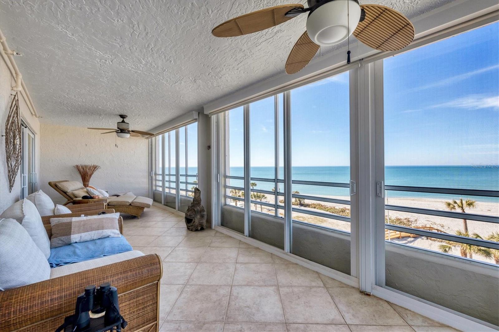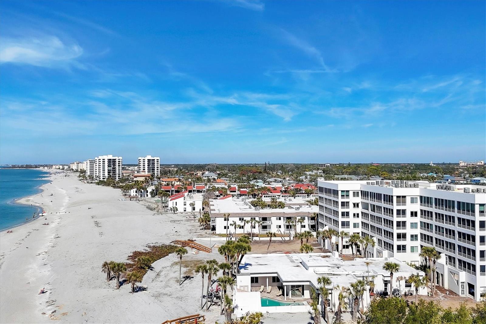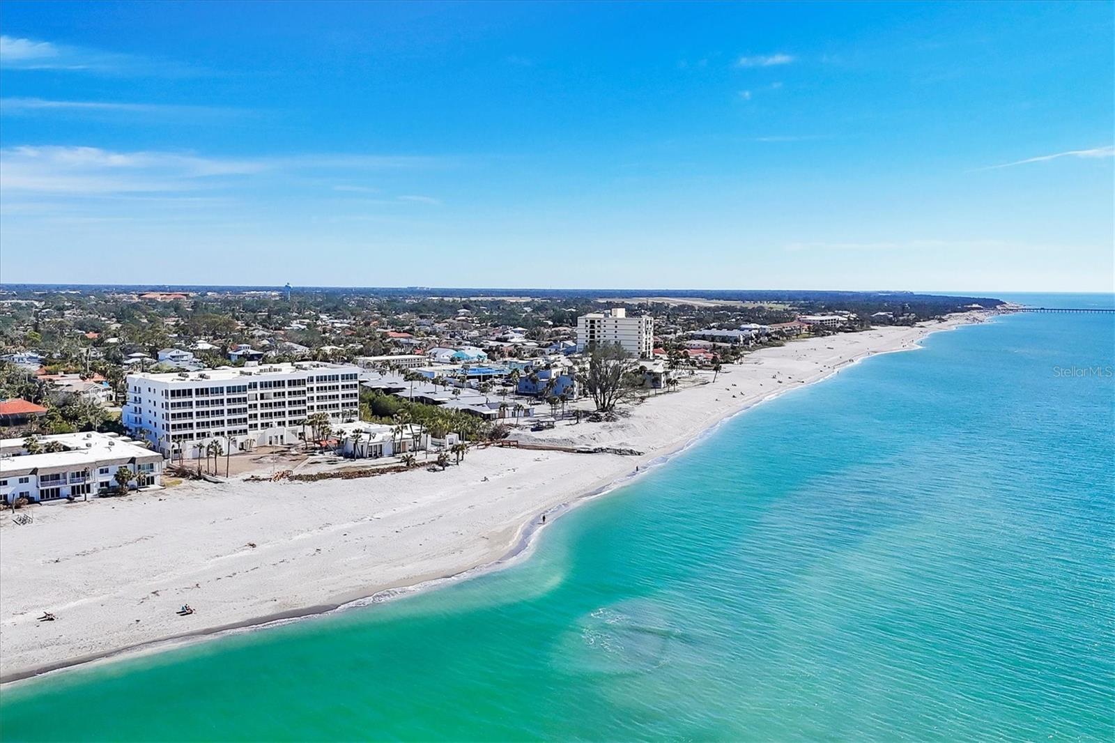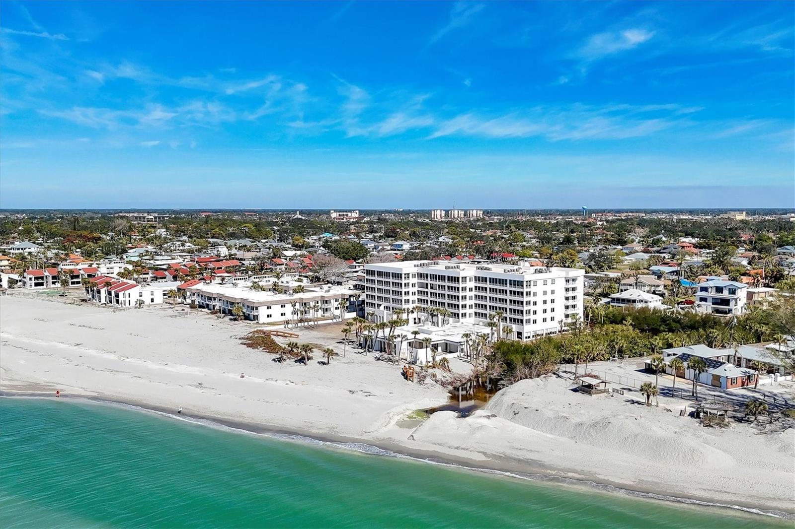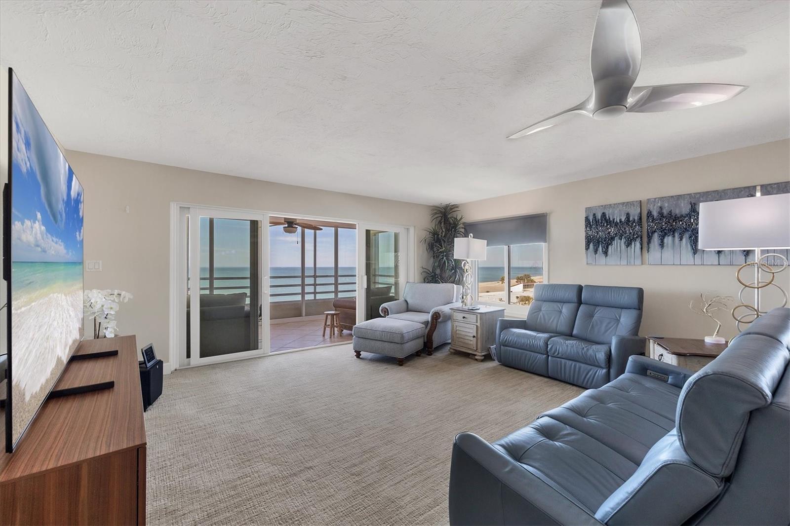 RARELY AVAILABLE. Welcome to Island Shores, a private and secluded beachfront mid-rise with breathtaking panoramic views and a quiet location. This updated CORNER UNIT includes 3 bedrooms, 2 and a half bathrooms, an additional office/den space which could serve as a 4th bedroom, and is coming FURNISHED. The property has been meticulously maintained and is one of largest condos on Venice Beach, and it’s a very short list. Boasting with a ton of features such as a 30-foot enclosed Florida room which stretches along the front giving you perfect views of the private beach and gulf, two open air side balconies that offers views of the city, upgraded hurricane impact glass windows and doors throughout, Trane air conditioning system, Bosch tankless water heater, front loading washer and dryer, completely remodeled bathrooms, large walk-in closets, updated tile flooring, massive hidden walk-in pantry, built in bar cabinets with additional sink, island pendant lighting in kitchen, double front entry doors, newer appliances, very tasteful done high-end furnishings, and the list goes on. The well-manicured community is unique and offers both a secured garage space for residents and an abundance of parking for guests. The large clubhouse includes a kitchen, gathering room, dining room, guest suites available for nightly rentals, a fitness room, a heated pool, and your own private beach access. Conveniently located just a walk away from shopping, entertainment, restaurants, golfing, marinas, and Historic Downtown Venice. This perfect location just cannot be beat. Only private showings available, call and schedule your appointment today, this will not last long!