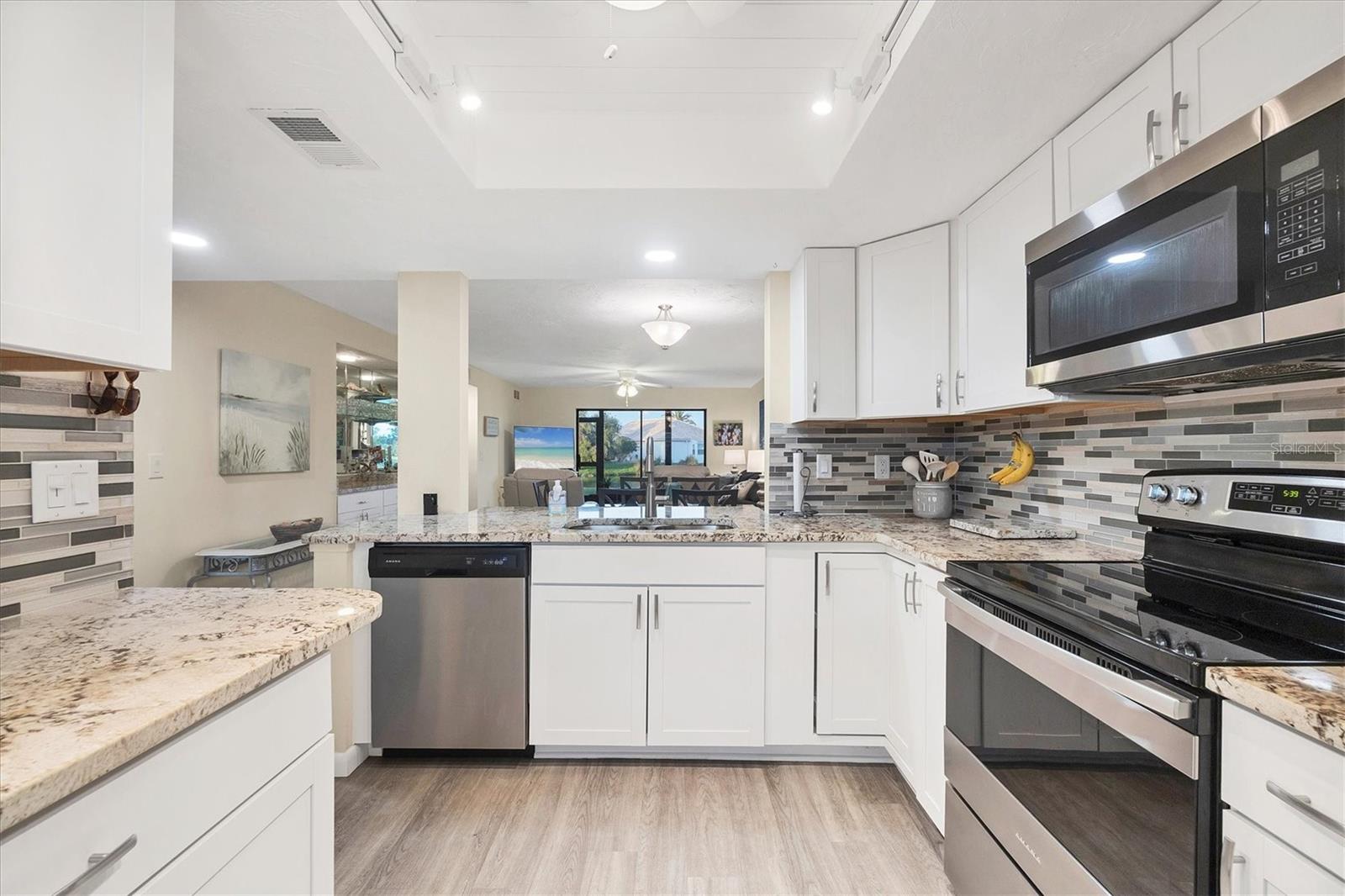 #317 at Lakes of Capri is a picture-perfect opportunity for fun and carefree living. This first-floor unit has been updated from top to bottom. You’ll appreciate the luxury plank flooring, fresh paint and crisp trim features. The cook’s kitchen features a coordinating built in buffet, ample storage and a great work flow with granite counters, glass tile, white cabinets and a full suite of Amana stainless appliances. You’ll never miss a thing with the pass though breakfast counter into the main living space with water & wildlife views. The finished lanai has water and golf course views and lush flowering landscape. The Owners suite has direct access to the finished lanai, a large walk in and bonus linen closet, updates here include a step-in shower, dual sinks and gorgeous drawered vanity with sparkling granite. Your guests, work or hobbies will appreciate the spacious second bedroom/bath! There is in-unit washer/dryer, 2 utility closets, new HVAC in 2023, assigned covered parking, approx.4x8 secured inside storage for your sporting and other goods. The Lakes of Capri is pet friendly, in the perfect location for long walks, bike rides, golf and easy to get to great restaurants, beaches, & shopping. Living here you’ll find a friendly community with fun group events. Gathering by the sparkling pool with the paver sundeck is a daily occurrence. You can hear the laughter from here! HOA fees include Venice water, trash, WiFi. Roofs were replaced in 2024 due to Ian and no assessments.