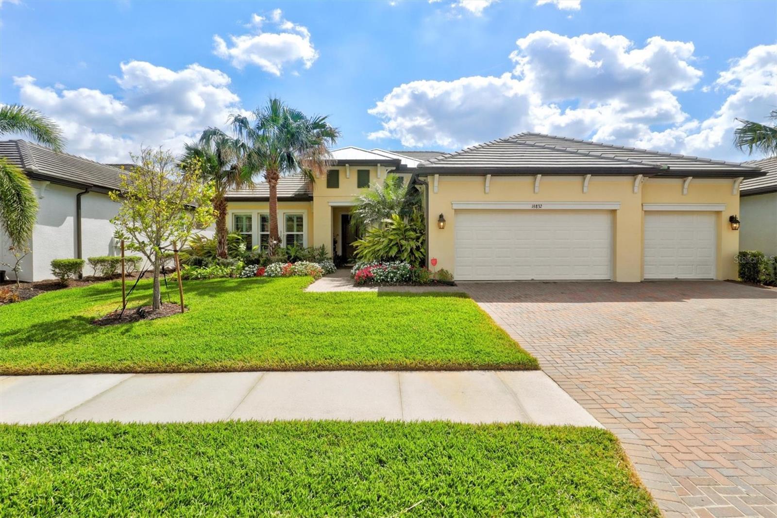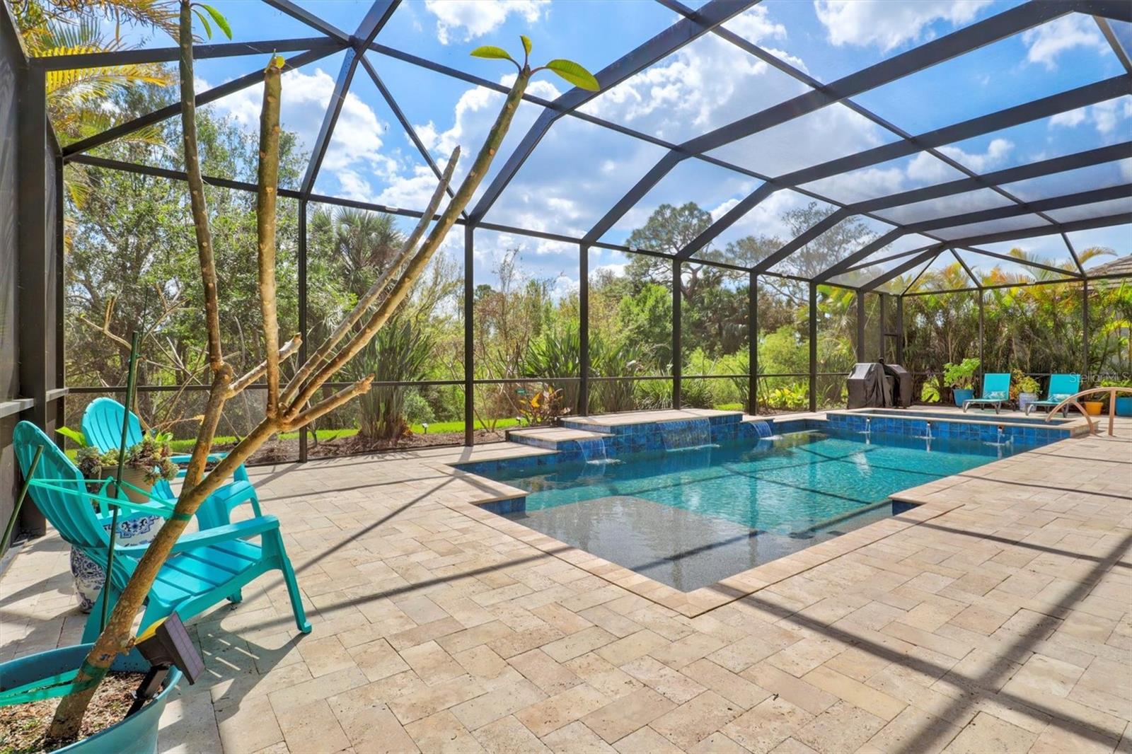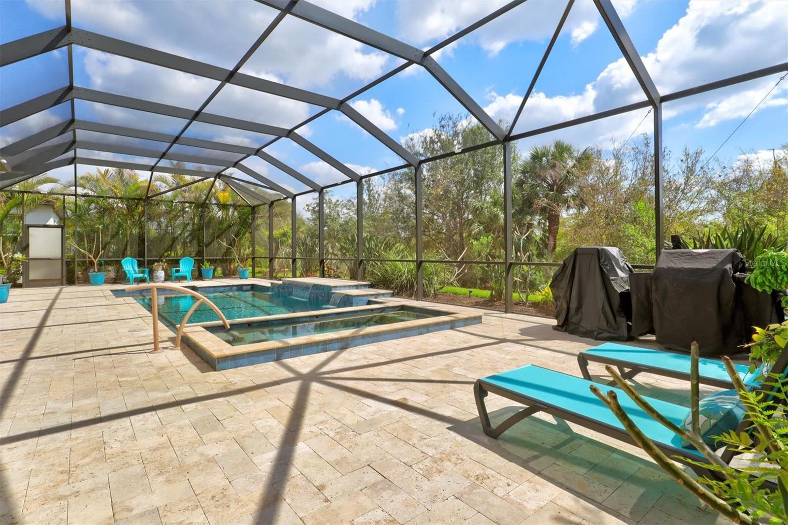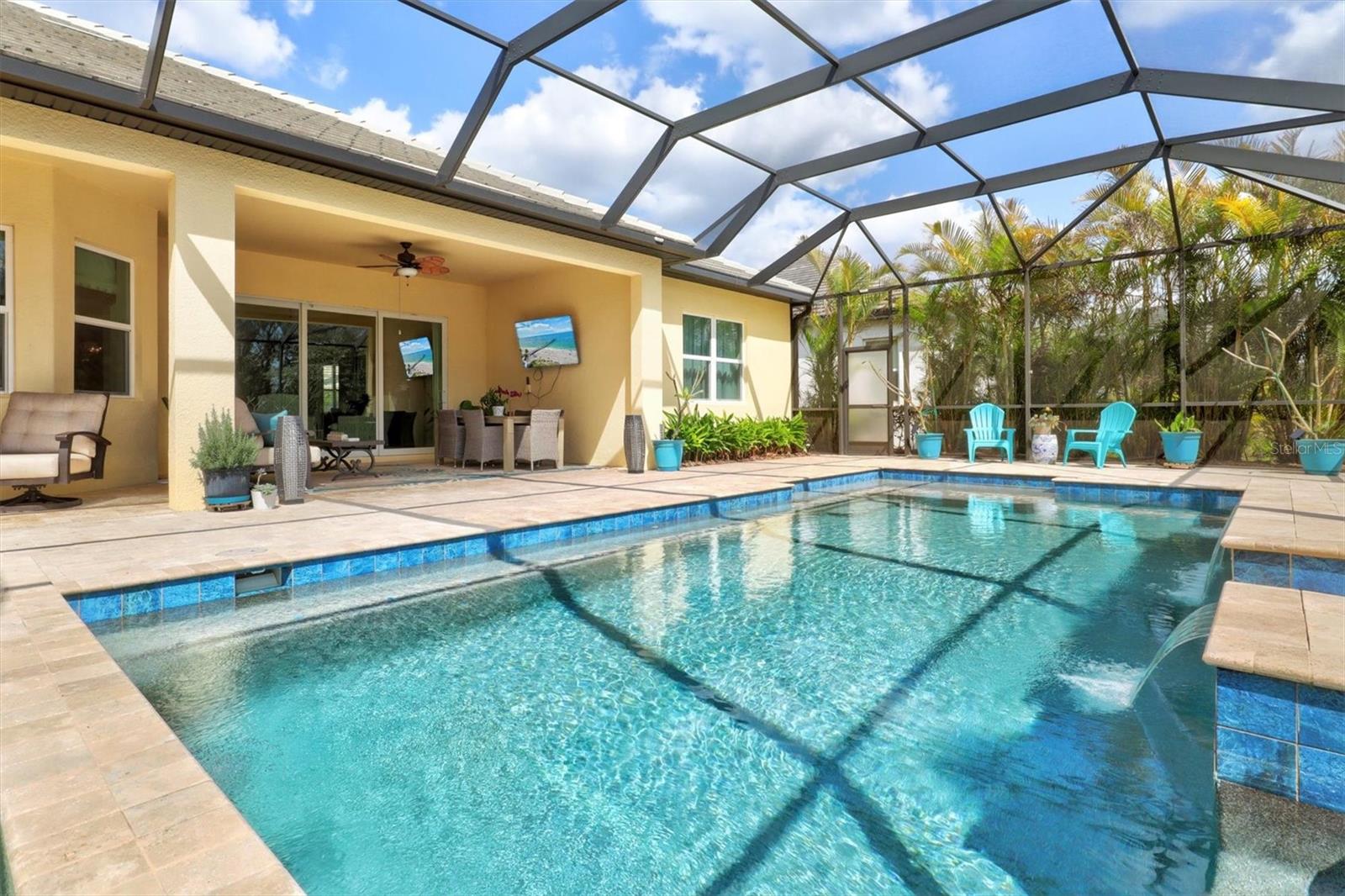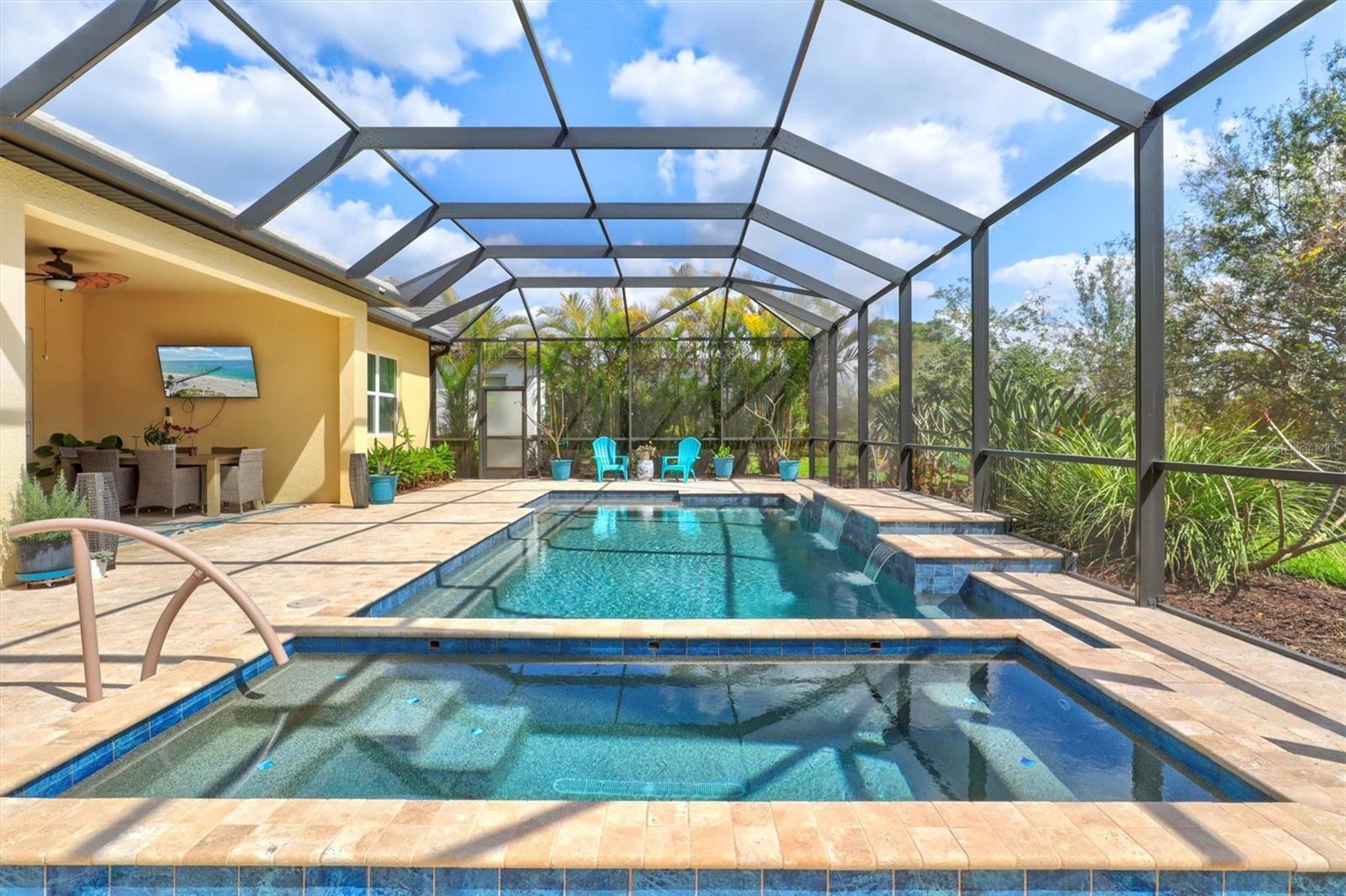 Nestled in the sought-after Oasis community within Wellen Park, this stunning executive home effortlessly combines elegance, luxury, and tranquility. As you approach 19832 Bridgetown Loop, the home's striking curb appeal immediately catches the eye, with a paver driveway and lead walk framed by lush tropical landscaping. Upon entering, the expansive great room greets you with soaring ceilings, oversized tile flooring, custom window treatments, and elegant baseboards and crown molding add the perfect finishing touches. Both the living room and dining room feature tray ceilings and large sliding glass doors open to an exceptional outdoor living space. The custom 37’x15’ saltwater pool and spa is large and luxurious, boasting three waterfalls, a sun shelf, two seating ledges, LED lighting, and an oversized spa with cascading aqua spouts. The covered lanai with outdoor kitchen prep and the full-length pool cage, all adorned with travertine stone pavers, offers ample space for relaxation. The gourmet kitchen, thoughtfully expanded by the current owners, is every chef's dream. Featuring high-end GE Profile appliances, including an induction cooktop, convection oven, convection microwave, and a quiet 45db dishwasher, the kitchen is designed to impress. A spacious LG French door refrigerator complements the extensive upgrades, which include expanded cabinetry with wine cooler, quartz countertops, custom lighting, pull-out shelves, a large corner pantry, and a beautiful new backsplash making it perfect for both everyday meals and entertaining guests. Every corner of this home showcases thoughtful custom details. The three private bedrooms offer a resort-like experience with elegant chandeliers, plush carpeting, and custom window treatments. The owner's suite is a true retreat, featuring a tray ceiling, dual walk-in closets with California Closet systems, and a spa-like bath with a frameless glass walk-in shower, dual vanities with pull-out shelves, new quartz countertops, and a linen closet. Two guest bedrooms each feature adjacent bathrooms, and the current owners thoughtfully added a door to one bedroom providing a convenient connection to the pool bath, creating an available en-suite for guests. This home offers a private den with engineered hardwood floors, French doors, a tray ceiling, and six windows that flood this space with natural light. An additional task room with custom built-ins can serve as a home office, homework station, craft room, or even a pet area. The laundry room is nicely upgraded with cabinets, a sink, and a washer and dryer surround. The spacious 3-car garage with epoxy floors and built-in shelving provides ample space for vehicles and storage. Rest easy knowing this home is equipped with impact glass windows and doors and sits above the high-risk floodplain. Oasis is an intimate, established community in the heart of Wellen Park, an active and thriving area. The neighborhood features 136 luxurious homes with wider lots and tile roofs, with exceptional amenities including a community pool, clubhouse, pickleball court, and private gated access to Blue Heron Park, offering two miles of walking trails and two dog parks. Located just minutes from Downtown Wellen Park, the Atlanta Braves Spring Training stadium, and a wide range of dining and shopping options, this location provides the perfect balance of convenience and luxury. Take a closer look at 19832 Bridgetown Loop – your personal “Oasis” in Wellen Park awaits!