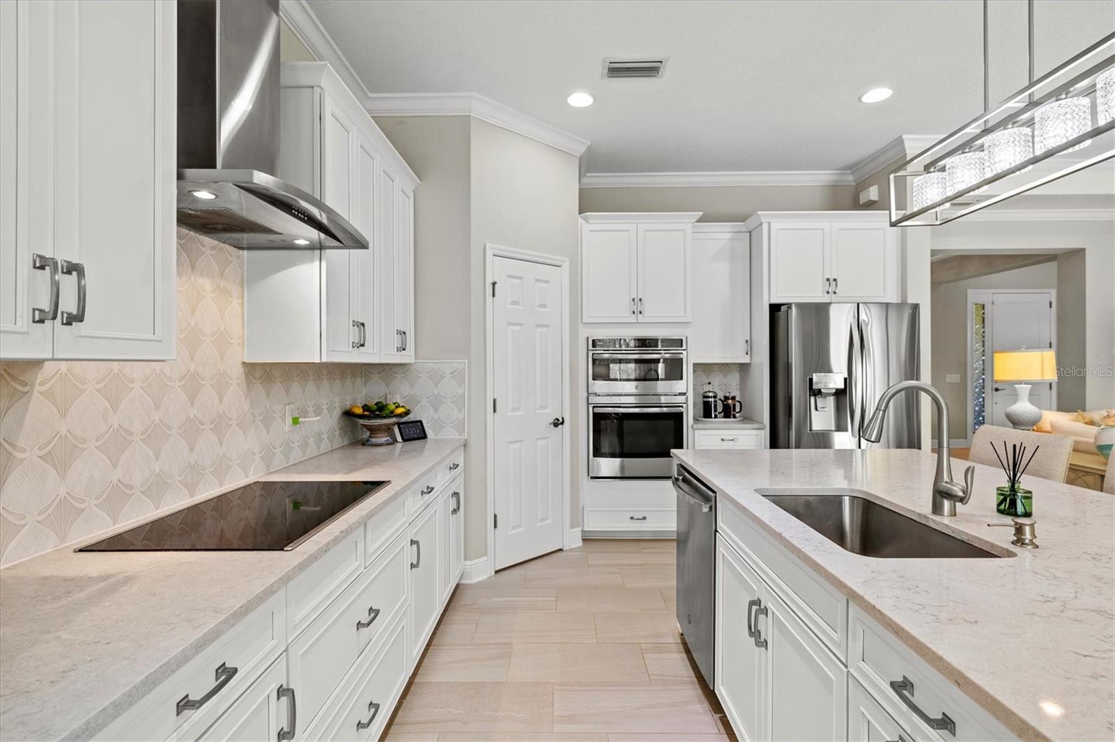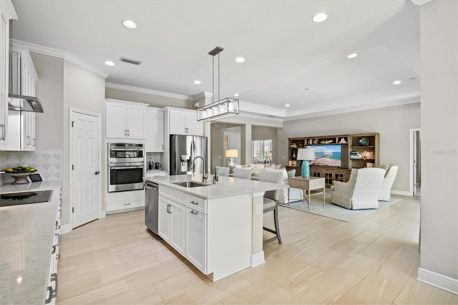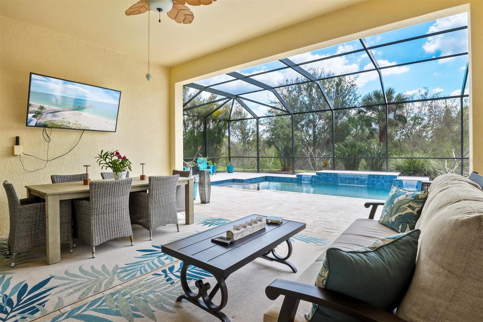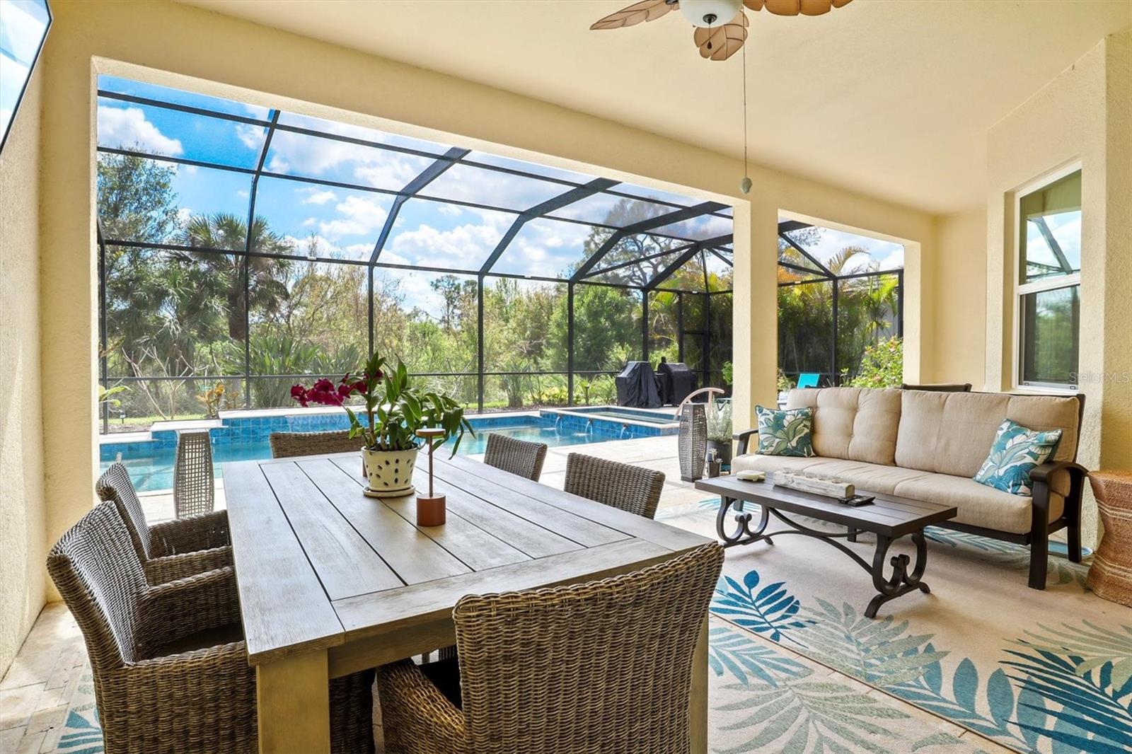 Nestled in the sought-after Oasis community within Wellen Park, this stunning executive home effortlessly combines elegance, luxury, and tranquility. As you approach 19832 Bridgetown Loop, the home's striking curb appeal immediately catches the eye, with a paver driveway and lead walk framed by lush tropical landscaping. Upon entering, the expansive great room greets you with soaring ceilings, oversized tile flooring, custom window treatments, and elegant baseboards and crown molding add the perfect finishing touches. Both the living room and dining room feature tray ceilings and large sliding glass doors open to an exceptional outdoor living space. The custom 37’x15’ saltwater pool and spa is large and luxurious, boasting three waterfalls, a sun shelf, two seating ledges, LED lighting, and an oversized spa with cascading aqua spouts. The covered lanai with outdoor kitchen prep and the full-length pool cage, all adorned with travertine stone pavers, offers ample space for relaxation. The gourmet kitchen, thoughtfully expanded by the current owners, is every chef's dream. Featuring high-end GE Profile appliances, including an induction cooktop, convection oven, convection microwave, and a quiet 45db dishwasher, the kitchen is designed to impress. A spacious LG French door refrigerator complements the extensive upgrades, which include expanded cabinetry with wine cooler, quartz countertops, custom lighting, pull-out shelves, a large corner pantry, and a beautiful new backsplash making it perfect for both everyday meals and entertaining guests. Every corner of this home showcases thoughtful custom details. The three private bedrooms offer a resort-like experience with elegant chandeliers, plush carpeting, and custom window treatments. The owner's suite is a true retreat, featuring a tray ceiling, dual walk-in closets with California Closet systems, and a spa-like bath with a frameless glass walk-in shower, dual vanities with pull-out shelves, new quartz countertops, and a linen closet. Two guest bedrooms each feature adjacent bathrooms, and the current owners thoughtfully added a door to one bedroom providing a convenient connection to the pool bath, creating an available en-suite for guests. This home offers a private den with engineered hardwood floors, French doors, a tray ceiling, and six windows that flood this space with natural light. An additional task room with custom built-ins can serve as a home office, homework station, craft room, or even a pet area. The laundry room is nicely upgraded with cabinets, a sink, and a washer and dryer surround. The spacious 3-car garage with epoxy floors and built-in shelving provides ample space for vehicles and storage. Rest easy knowing this home is equipped with impact glass windows and doors and sits above the high-risk floodplain. Oasis is an intimate, established community in the heart of Wellen Park, an active and thriving area. The neighborhood features 136 luxurious homes with wider lots and tile roofs, with exceptional amenities including a community pool, clubhouse, pickleball court, and private gated access to Blue Heron Park, offering two miles of walking trails and two dog parks. Located just minutes from Downtown Wellen Park, the Atlanta Braves Spring Training stadium, and a wide range of dining and shopping options, this location provides the perfect balance of convenience and luxury. Take a closer look at 19832 Bridgetown Loop – your personal “Oasis” in Wellen Park awaits!