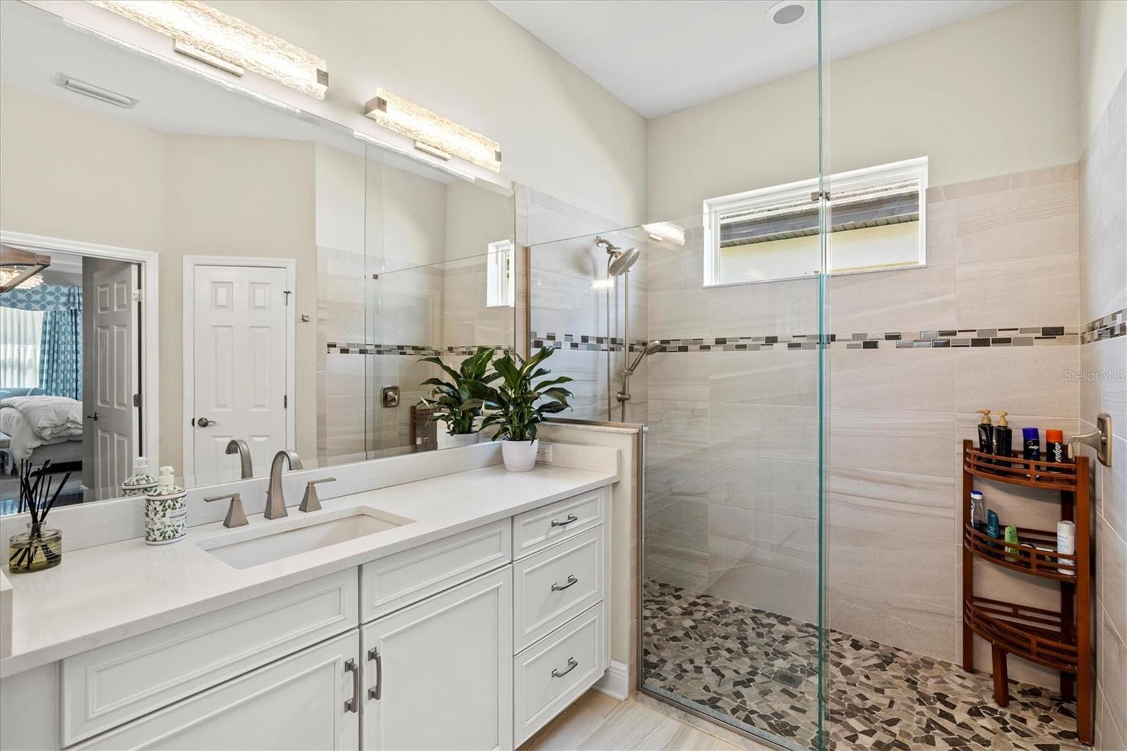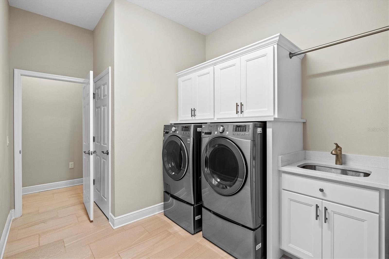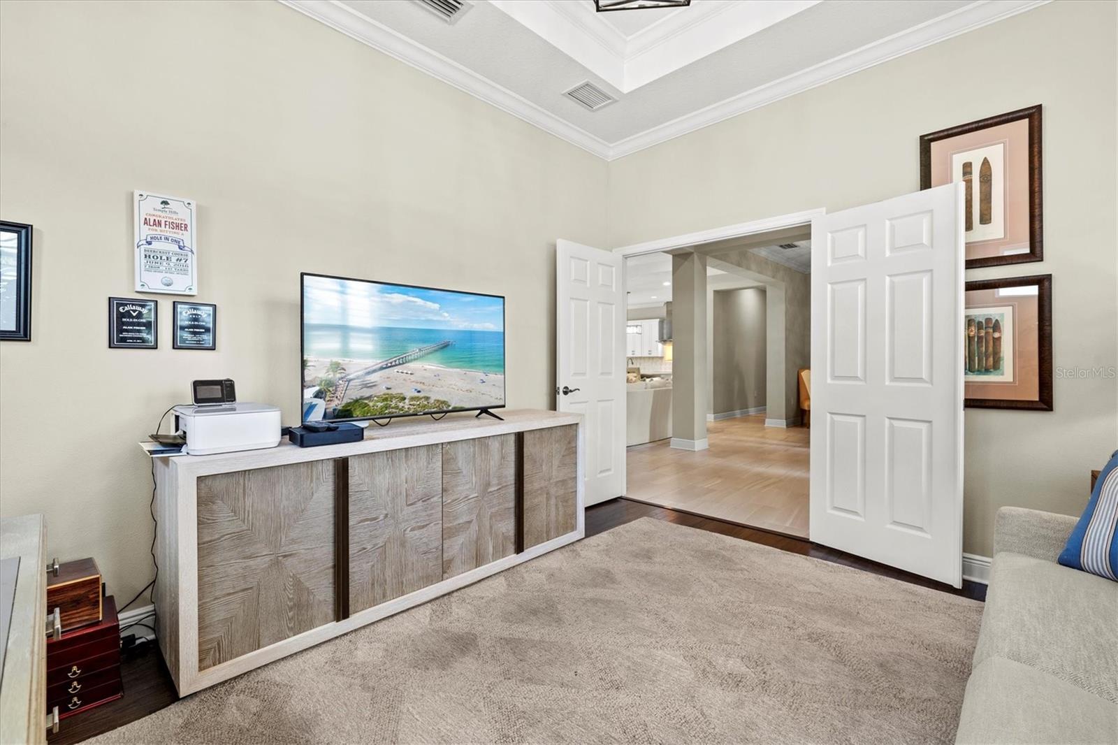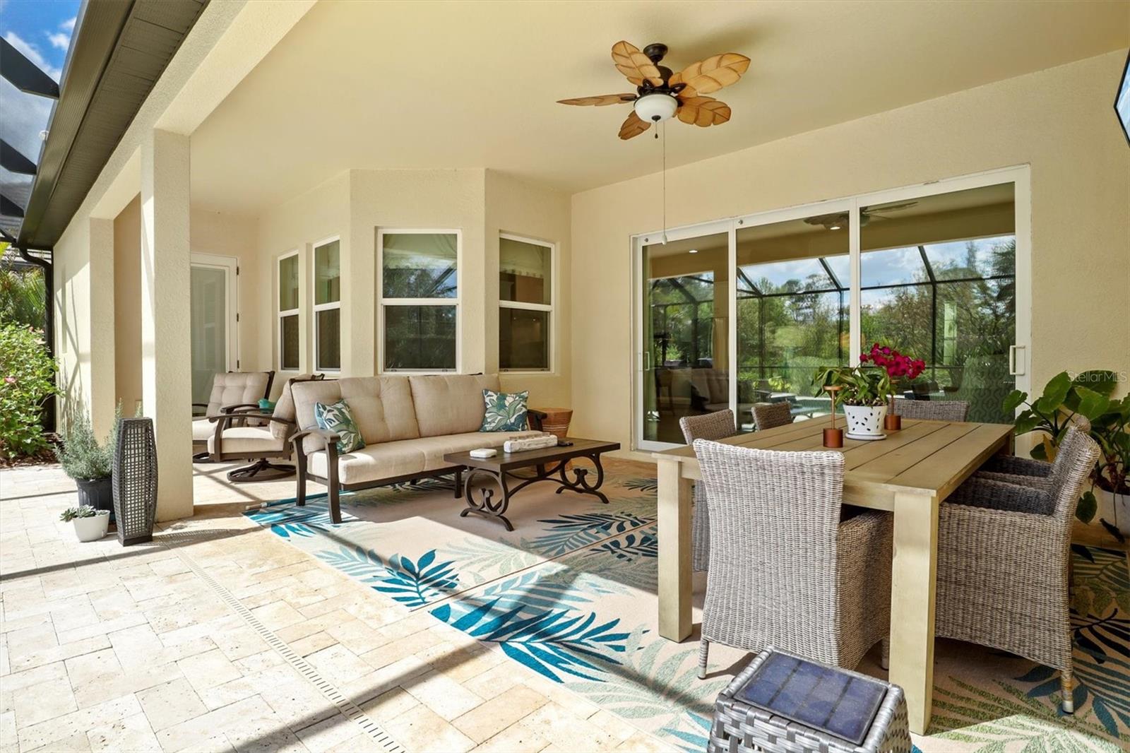 Nestled in the sought-after Oasis community within Wellen Park, this stunning executive home effortlessly combines elegance, luxury, and tranquility. As you approach 19832 Bridgetown Loop, the home's striking curb appeal immediately catches the eye, with a paver driveway and lead walk framed by lush tropical landscaping. Upon entering, the expansive great room greets you with soaring ceilings, oversized tile flooring, custom window treatments, and elegant baseboards and crown molding add the perfect finishing touches. Both the living room and dining room feature tray ceilings and large sliding glass doors open to an exceptional outdoor living space. The custom 37’x15’ saltwater pool and spa is large and luxurious, boasting three waterfalls, a sun shelf, two seating ledges, LED lighting, and an oversized spa with cascading aqua spouts. The covered lanai with outdoor kitchen prep and the full-length pool cage, all adorned with travertine stone pavers, offers ample space for relaxation. The gourmet kitchen, thoughtfully expanded by the current owners, is every chef's dream. Featuring high-end GE Profile appliances, including an induction cooktop, convection oven, convection microwave, and a quiet 45db dishwasher, the kitchen is designed to impress. A spacious LG French door refrigerator complements the extensive upgrades, which include expanded cabinetry with wine cooler, quartz countertops, custom lighting, pull-out shelves, a large corner pantry, and a beautiful new backsplash making it perfect for both everyday meals and entertaining guests. Every corner of this home showcases thoughtful custom details. The three private bedrooms offer a resort-like experience with elegant chandeliers, plush carpeting, and custom window treatments. The owner's suite is a true retreat, featuring a tray ceiling, dual walk-in closets with California Closet systems, and a spa-like bath with a frameless glass walk-in shower, dual vanities with pull-out shelves, new quartz countertops, and a linen closet. Two guest bedrooms each feature adjacent bathrooms, and the current owners thoughtfully added a door to one bedroom providing a convenient connection to the pool bath, creating an available en-suite for guests. This home offers a private den with engineered hardwood floors, French doors, a tray ceiling, and six windows that flood this space with natural light. An additional task room with custom built-ins can serve as a home office, homework station, craft room, or even a pet area. The laundry room is nicely upgraded with cabinets, a sink, and a washer and dryer surround. The spacious 3-car garage with epoxy floors and built-in shelving provides ample space for vehicles and storage. Rest easy knowing this home is equipped with impact glass windows and doors and sits above the high-risk floodplain. Oasis is an intimate, established community in the heart of Wellen Park, an active and thriving area. The neighborhood features 136 luxurious homes with wider lots and tile roofs, with exceptional amenities including a community pool, clubhouse, pickleball court, and private gated access to Blue Heron Park, offering two miles of walking trails and two dog parks. Located just minutes from Downtown Wellen Park, the Atlanta Braves Spring Training stadium, and a wide range of dining and shopping options, this location provides the perfect balance of convenience and luxury. Take a closer look at 19832 Bridgetown Loop – your personal “Oasis” in Wellen Park awaits!