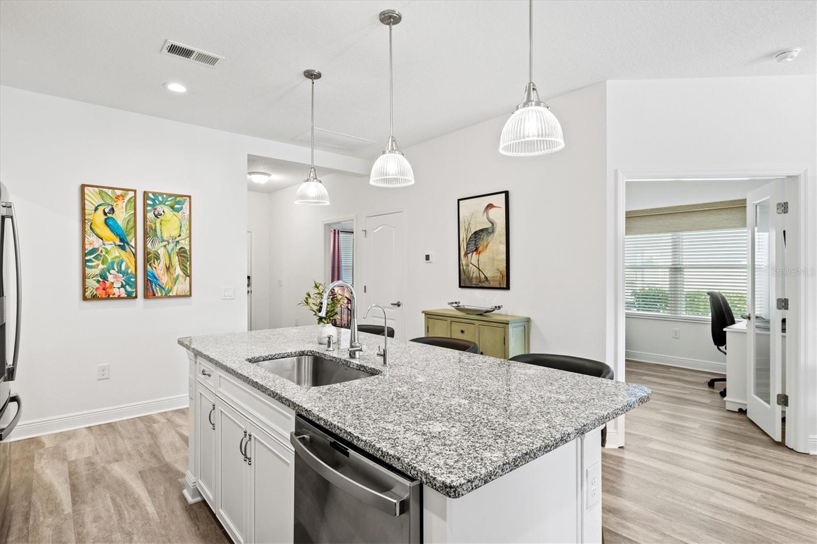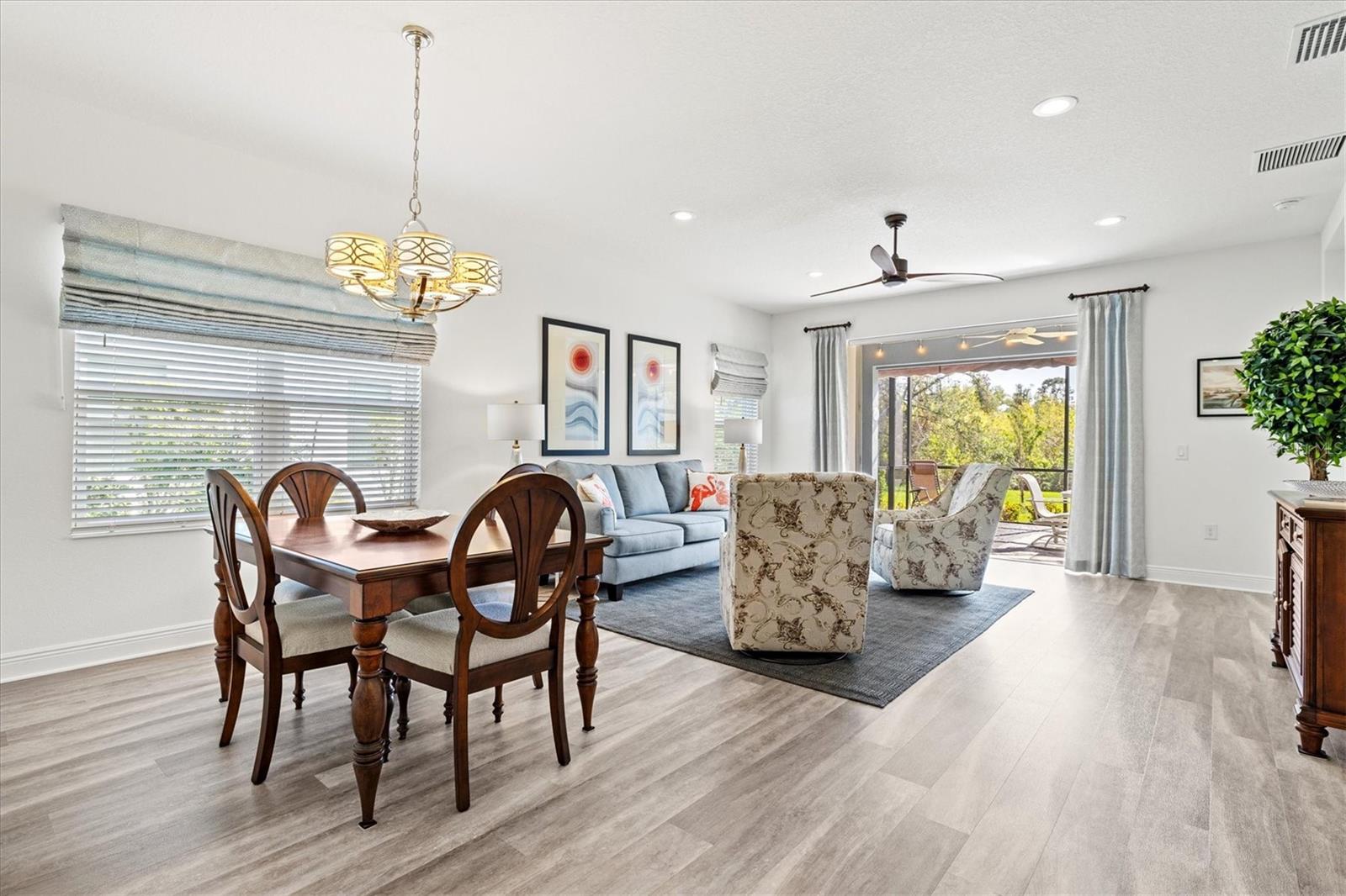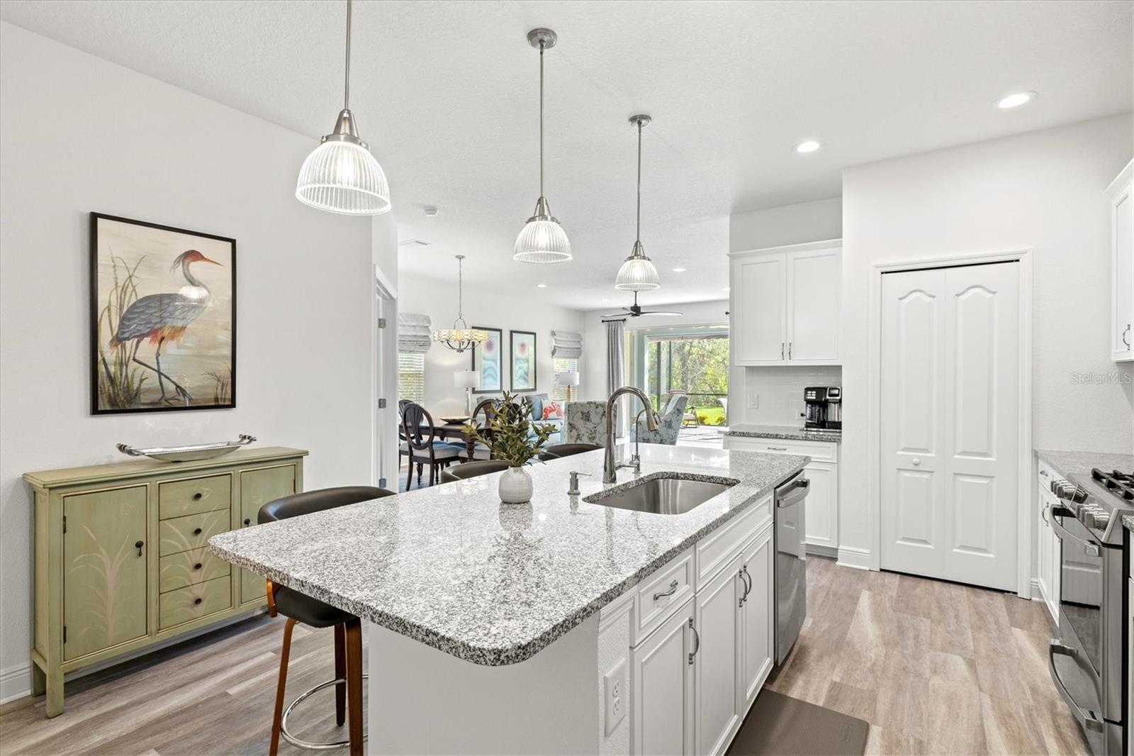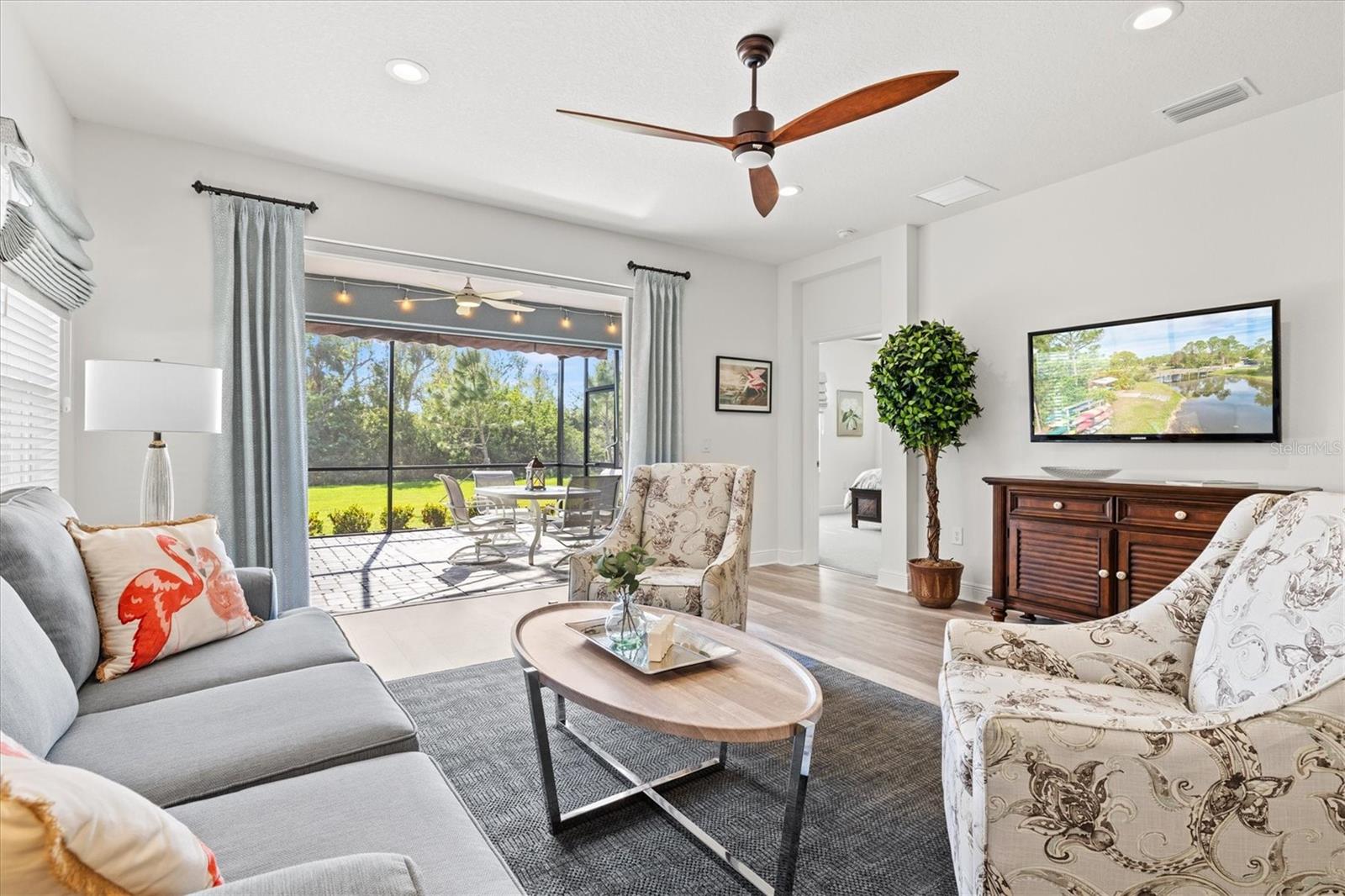 Welcome to this stunning 3-bedroom, 2-bathroom home with den / study located in the desirable community of Grand Palm in Venice! Built in 2022, this modern gem is immaculately presented, offering an open-concept floor plan with spacious living areas perfect for entertaining. The chef-inspired kitchen features beautiful granite countertops, sleek cabinetry, water filtration system, and stainless steel appliances. The master suite is a true retreat with two walk-in closets and an en-suite bath with dual vanities and a large shower. The home features multiple upgrades throughout including high end ceiling fans, upgraded pendant lighting, retractable screen door, epoxy flooring in the garage as well as a work bench and garage storage shelving. The home is being offered fully furnished making it completely move-in ready. Enjoy a beautiful, preserve view on the private extended lanai with the added benefits of a large retractable awning, privacy shades, and stylish string lights allowing you to enjoy the serene, peaceful setting throughout the day. Conveniently located close to the clubhouse and community pool, as well as shopping, dining and events in Wellen Park and downtown Venice, plus the pristine beaches, this home offers the perfect blend of comfort, style and convenience. Don’t miss the opportunity to make this property your own!