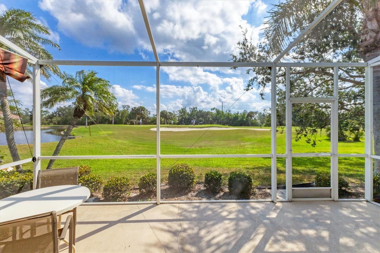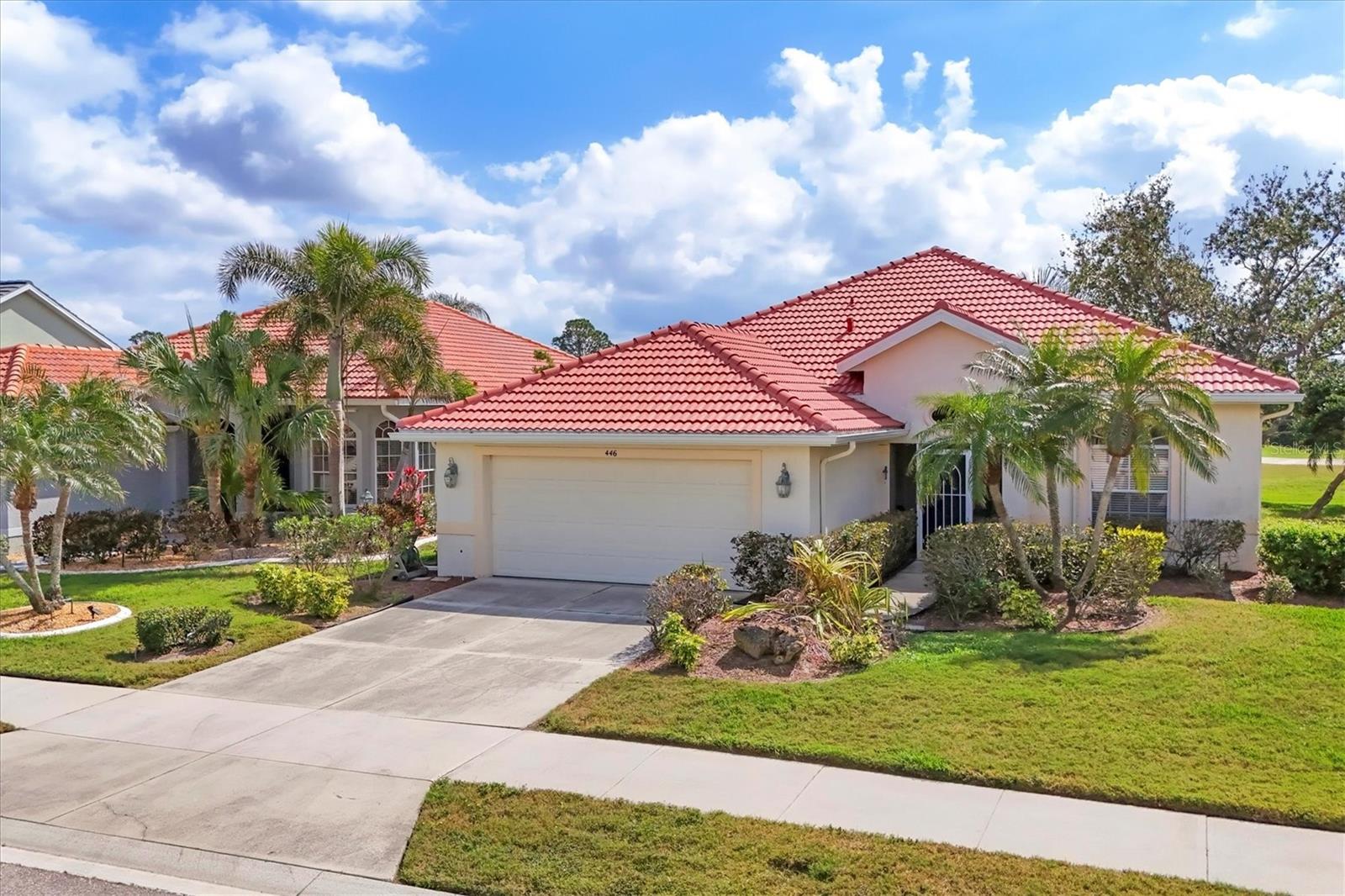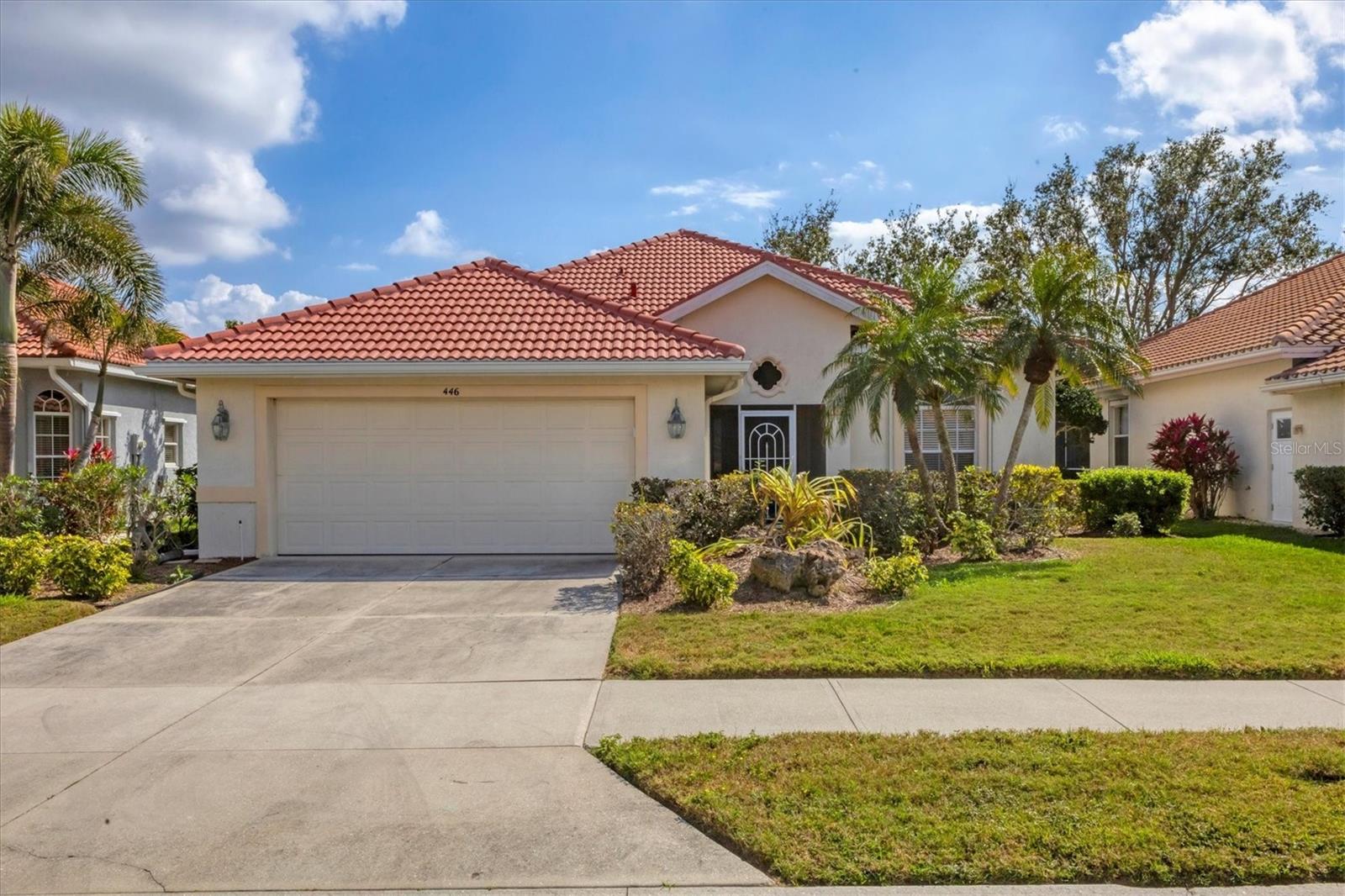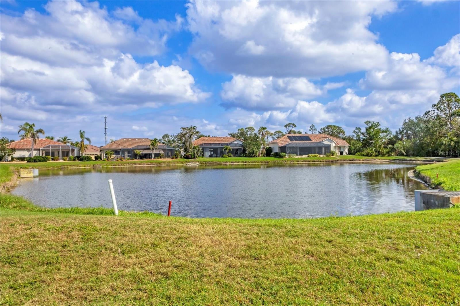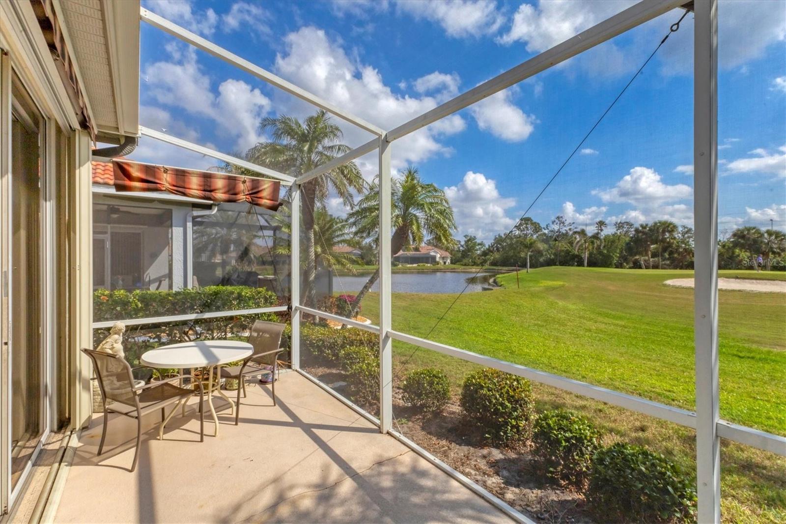 Don't miss out!! Bright and cheery home with Southern exposure overlooking golf course and lake. Open floor plan has tile flooring in main areas with carpets in bedrooms. Spacious kitchen with tons of counter space and movable island with stainless steel surface for food prep. Plenty of cabinets for all your kitchen wares. Tile backsplash. Overlooks dining area and great room. Huge Florida room with lots of windows and sliders to lanai make for a nice warm sunny place for an afternoon nap. Sit out on your screened lanai and watch the golfers on the 8th Fairway. Want to sit outside but not in the sun? Screened in front lanai should do the trick. Master bedroom with en suite bath offering dual sinks and walk in shower. Large walk in closet. Two guest bedrooms with guest bath in between. Guest bath has walk in shower with seat. Laundry room has storage cabinets and a wash sink. NEW ROOF. AC 2024. HURRICANE SHUTTERS. Pelican Pointe is Venice's Premier community offering resort style amenities including Clubhouse with bar/grill, card room/library, and banquet facilities. Heated pool with lap lanes for swimming, fitness center, tennis courts and pickle ball, tons of sidewalks for enjoying the weather throughout the community, and 27 holes of golf with Pro Shop. Tons of social opportunities for non golfers, including trivia night, special occasion activities, and huge Women's association. Golf is NOT mandatory. All of this Centrally located minutes to Venice Beach, Venice Downtown, shopping, theatres, restaurants, highways, airports, and so much more. Venice is the quaint gem you have been looking for on the West Coast. SEE IT TODAY!! TURNKEY FURNISHINGS NEGOTIABLE.