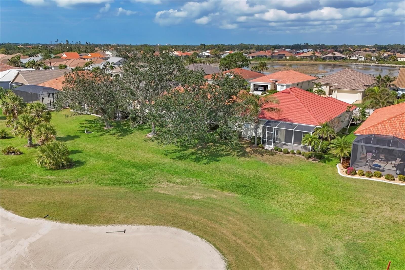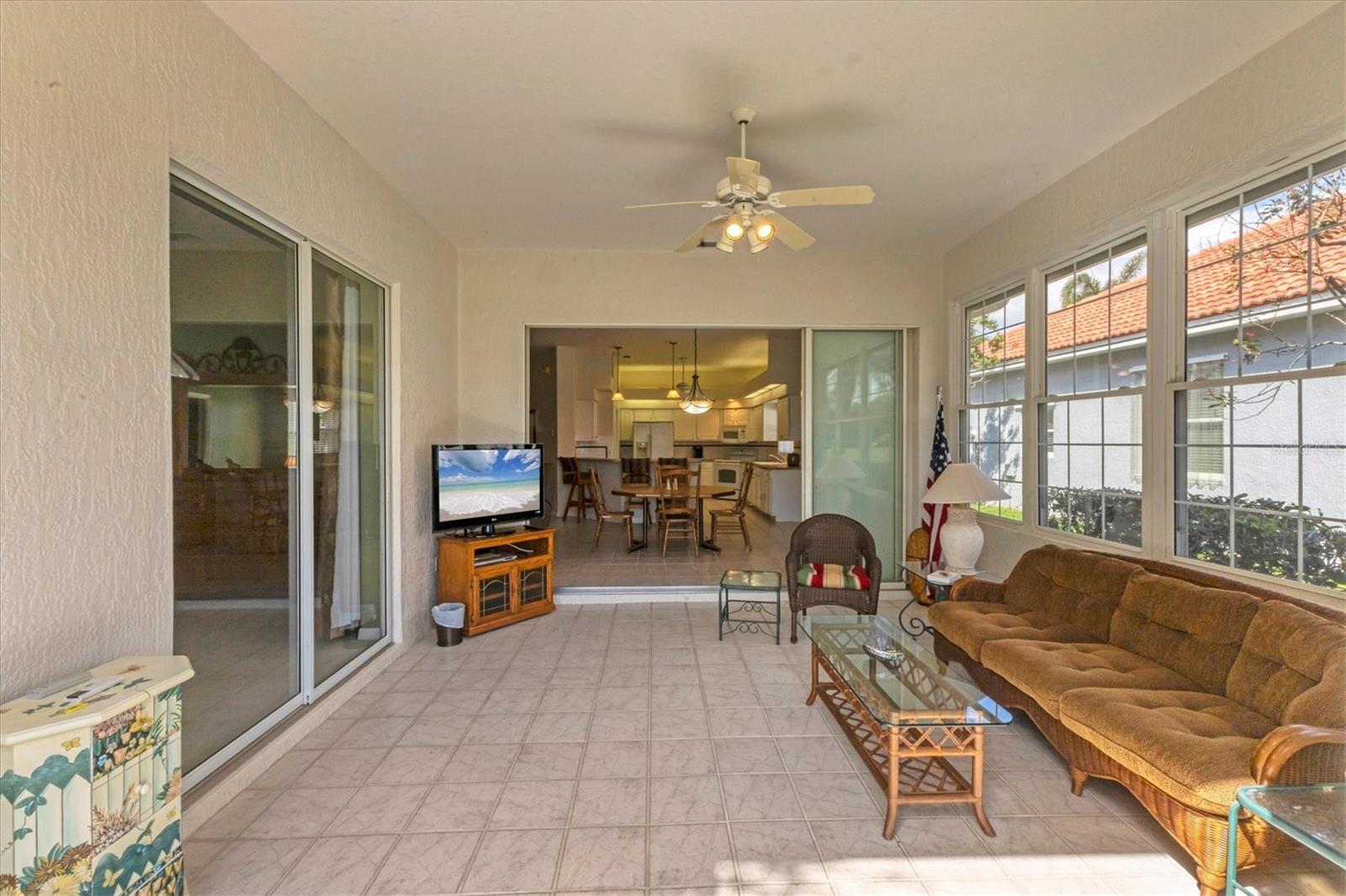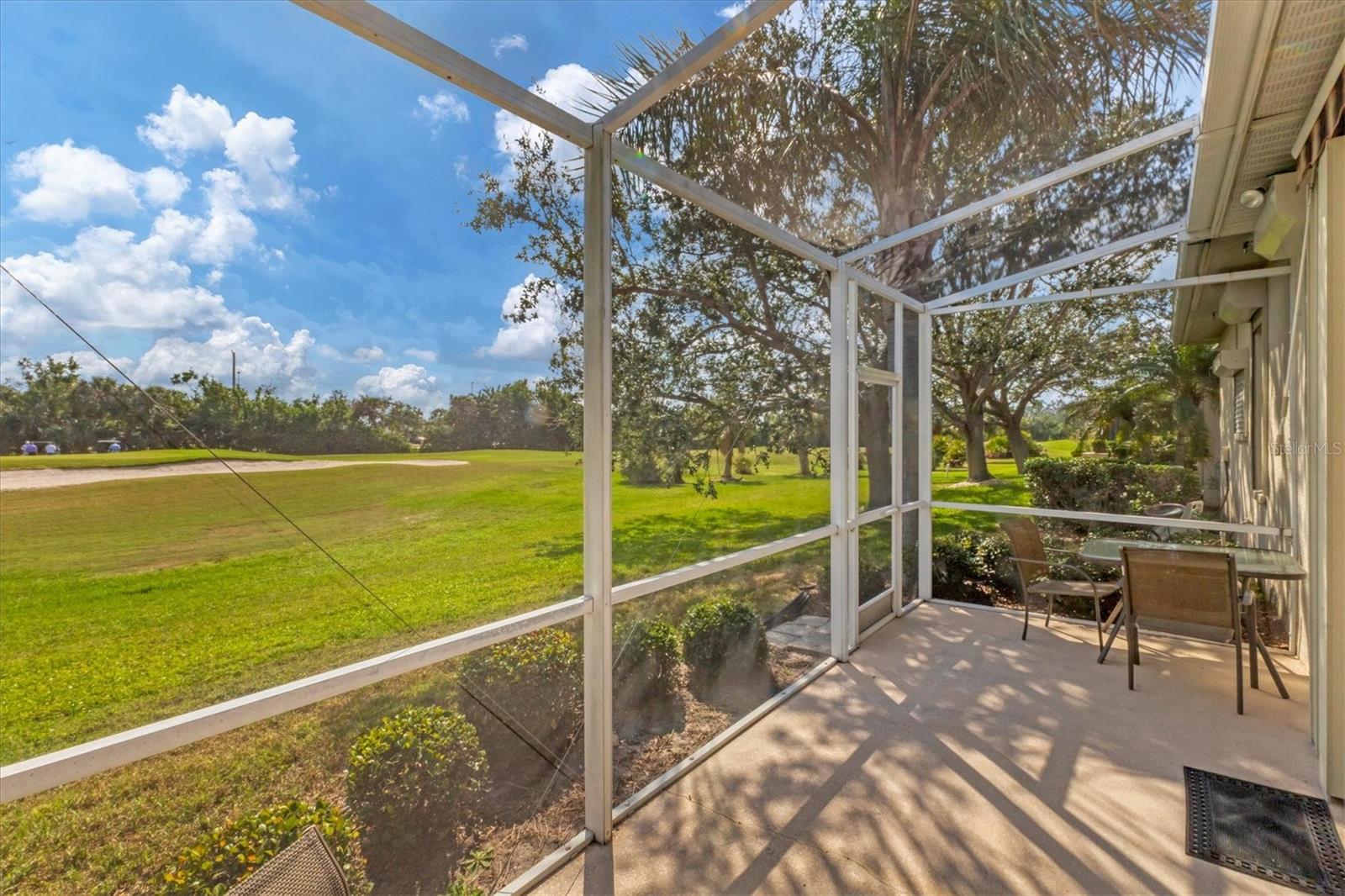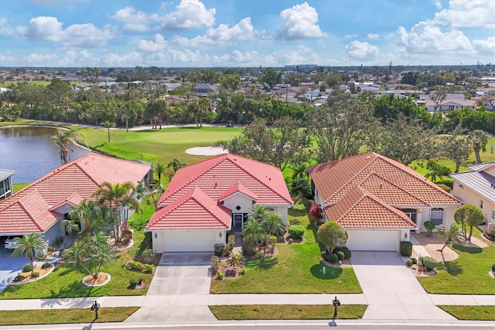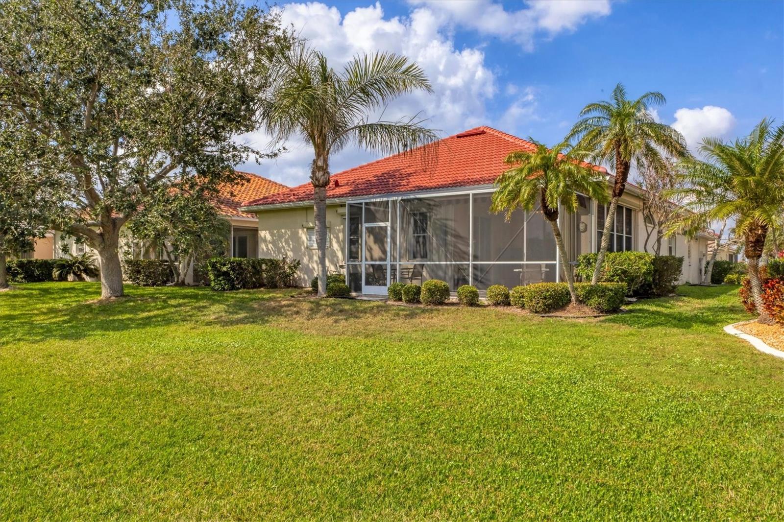 Don't miss out!! Bright and cheery home with Southern exposure overlooking golf course and lake. Open floor plan has tile flooring in main areas with carpets in bedrooms. Spacious kitchen with tons of counter space and movable island with stainless steel surface for food prep. Plenty of cabinets for all your kitchen wares. Tile backsplash. Overlooks dining area and great room. Huge Florida room with lots of windows and sliders to lanai make for a nice warm sunny place for an afternoon nap. Sit out on your screened lanai and watch the golfers on the 8th Fairway. Want to sit outside but not in the sun? Screened in front lanai should do the trick. Master bedroom with en suite bath offering dual sinks and walk in shower. Large walk in closet. Two guest bedrooms with guest bath in between. Guest bath has walk in shower with seat. Laundry room has storage cabinets and a wash sink. NEW ROOF. AC 2024. HURRICANE SHUTTERS. Pelican Pointe is Venice's Premier community offering resort style amenities including Clubhouse with bar/grill, card room/library, and banquet facilities. Heated pool with lap lanes for swimming, fitness center, tennis courts and pickle ball, tons of sidewalks for enjoying the weather throughout the community, and 27 holes of golf with Pro Shop. Tons of social opportunities for non golfers, including trivia night, special occasion activities, and huge Women's association. Golf is NOT mandatory. All of this Centrally located minutes to Venice Beach, Venice Downtown, shopping, theatres, restaurants, highways, airports, and so much more. Venice is the quaint gem you have been looking for on the West Coast. SEE IT TODAY!! TURNKEY FURNISHINGS NEGOTIABLE.