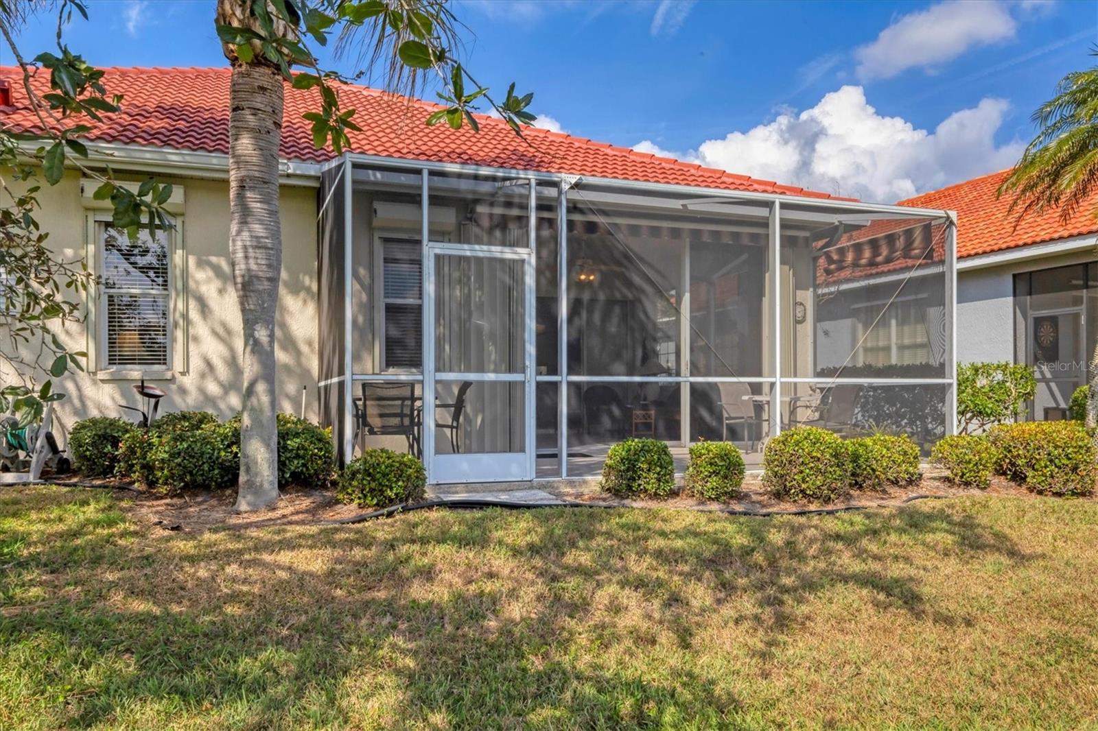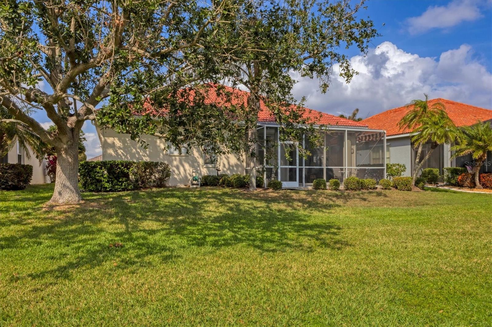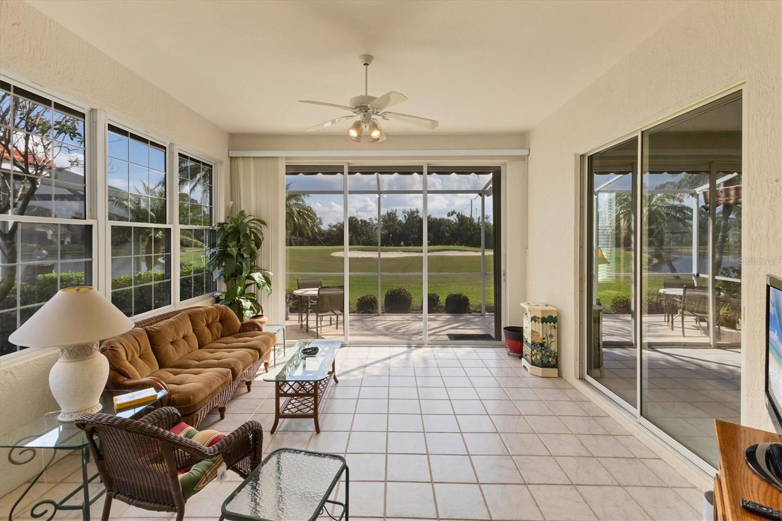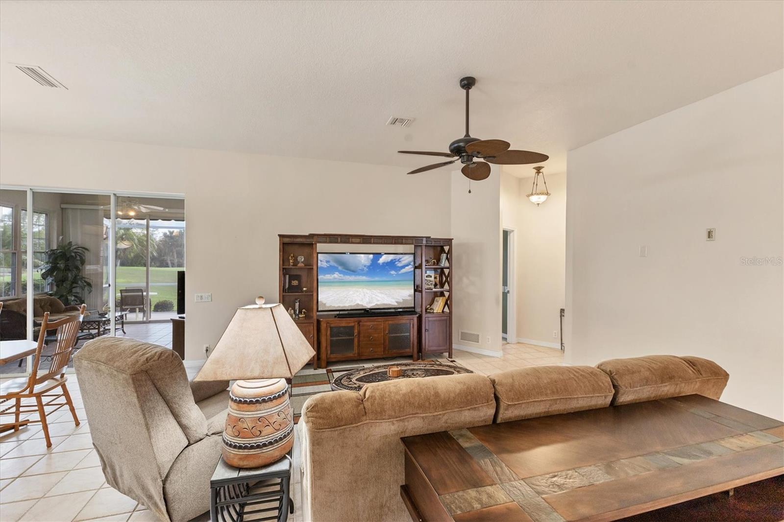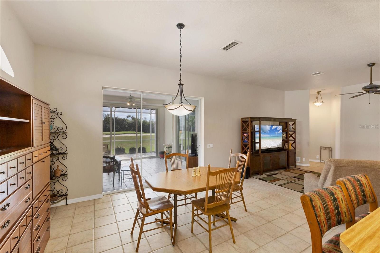 Don't miss out!! Bright and cheery home with Southern exposure overlooking golf course and lake. Open floor plan has tile flooring in main areas with carpets in bedrooms. Spacious kitchen with tons of counter space and movable island with stainless steel surface for food prep. Plenty of cabinets for all your kitchen wares. Tile backsplash. Overlooks dining area and great room. Huge Florida room with lots of windows and sliders to lanai make for a nice warm sunny place for an afternoon nap. Sit out on your screened lanai and watch the golfers on the 8th Fairway. Want to sit outside but not in the sun? Screened in front lanai should do the trick. Master bedroom with en suite bath offering dual sinks and walk in shower. Large walk in closet. Two guest bedrooms with guest bath in between. Guest bath has walk in shower with seat. Laundry room has storage cabinets and a wash sink. NEW ROOF. AC 2024. HURRICANE SHUTTERS. Pelican Pointe is Venice's Premier community offering resort style amenities including Clubhouse with bar/grill, card room/library, and banquet facilities. Heated pool with lap lanes for swimming, fitness center, tennis courts and pickle ball, tons of sidewalks for enjoying the weather throughout the community, and 27 holes of golf with Pro Shop. Tons of social opportunities for non golfers, including trivia night, special occasion activities, and huge Women's association. Golf is NOT mandatory. All of this Centrally located minutes to Venice Beach, Venice Downtown, shopping, theatres, restaurants, highways, airports, and so much more. Venice is the quaint gem you have been looking for on the West Coast. SEE IT TODAY!! TURNKEY FURNISHINGS NEGOTIABLE.