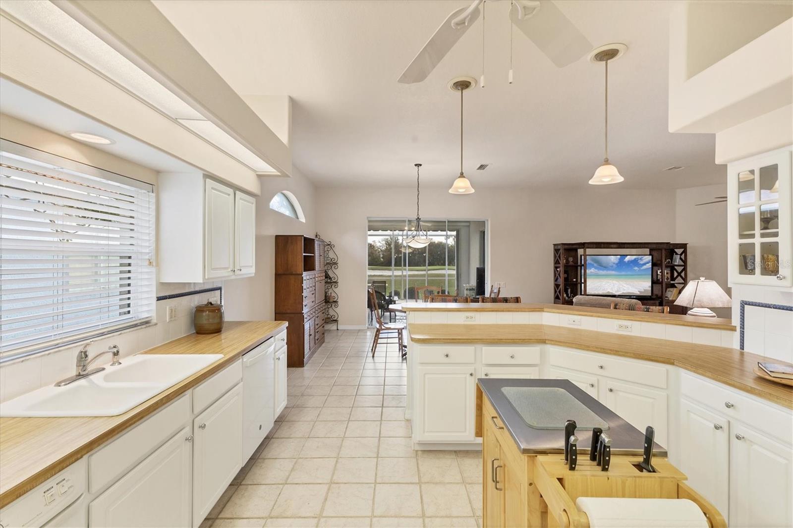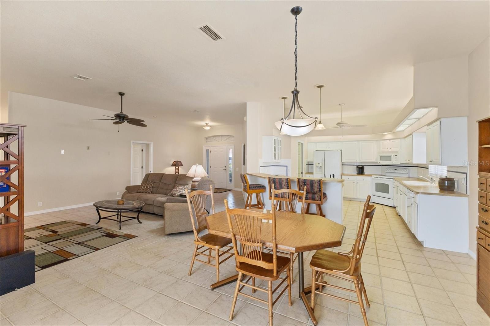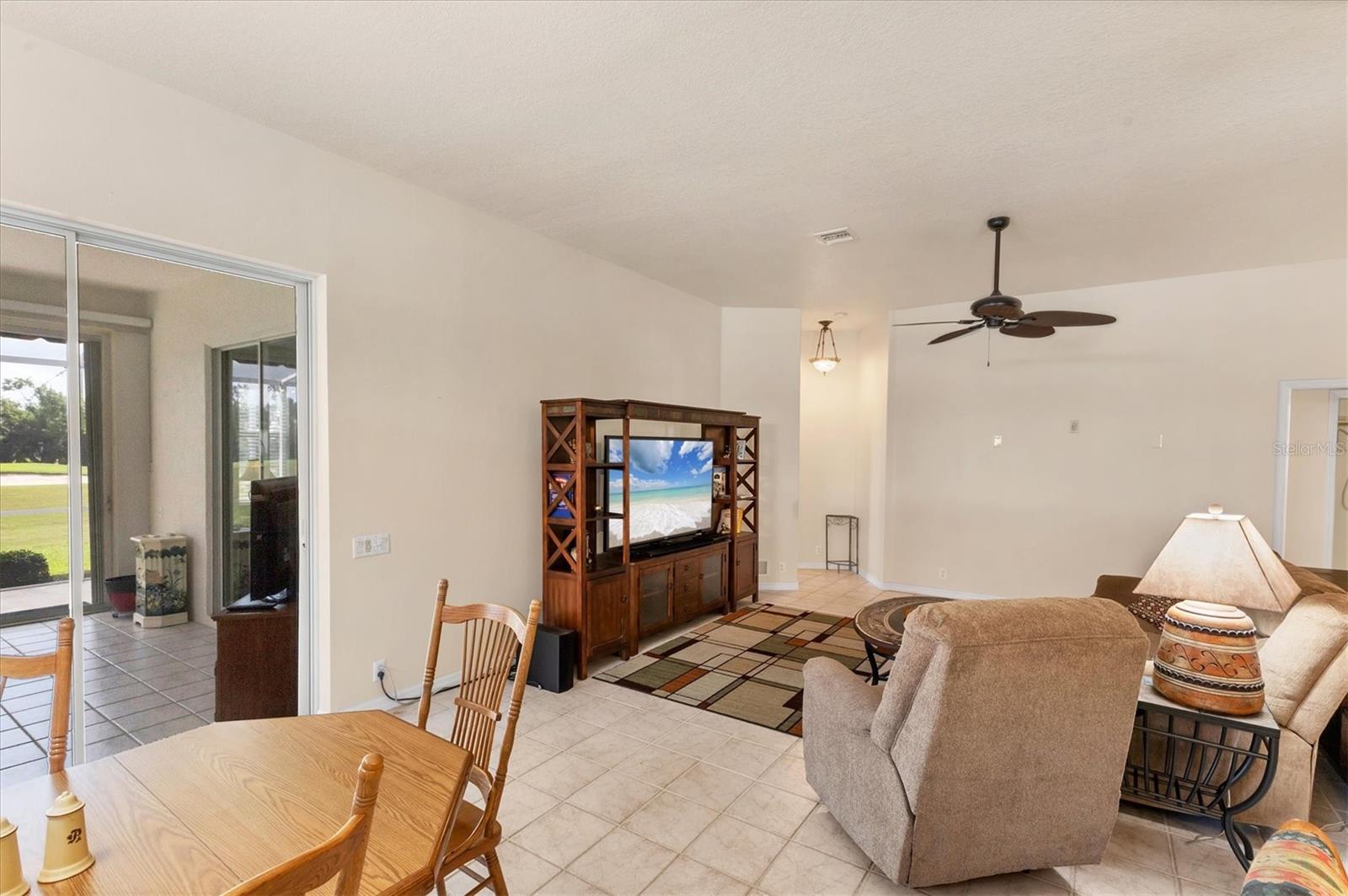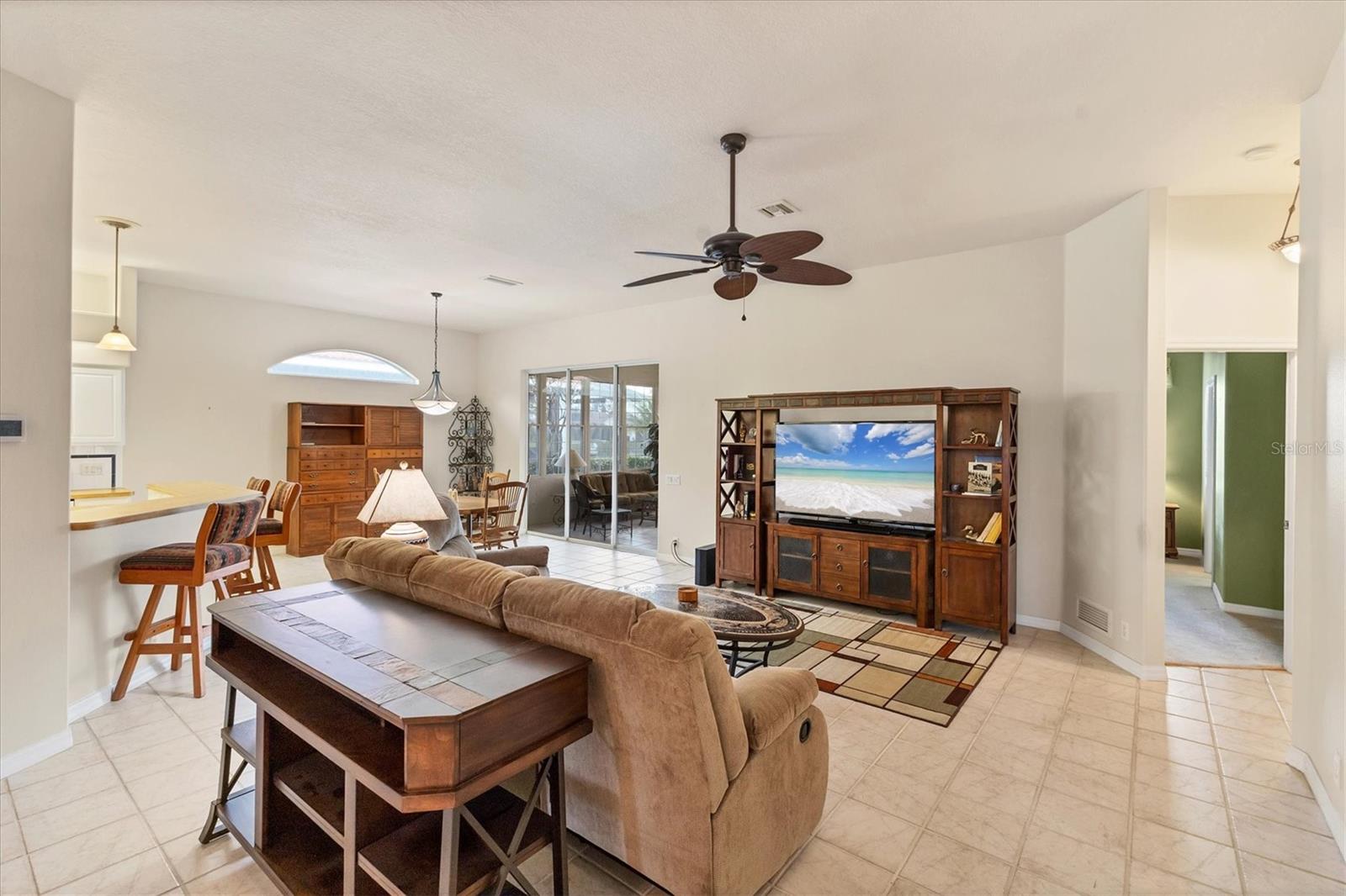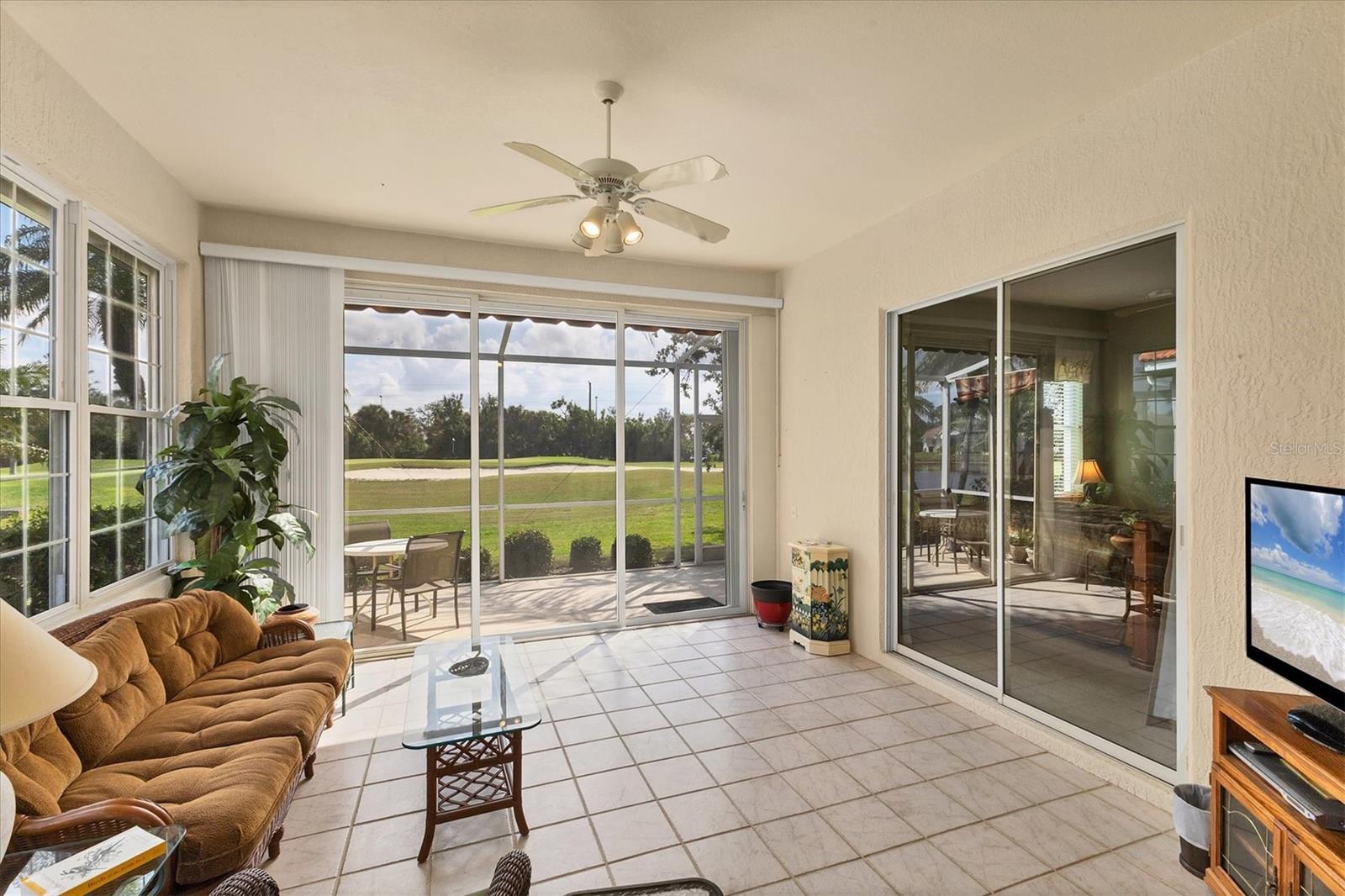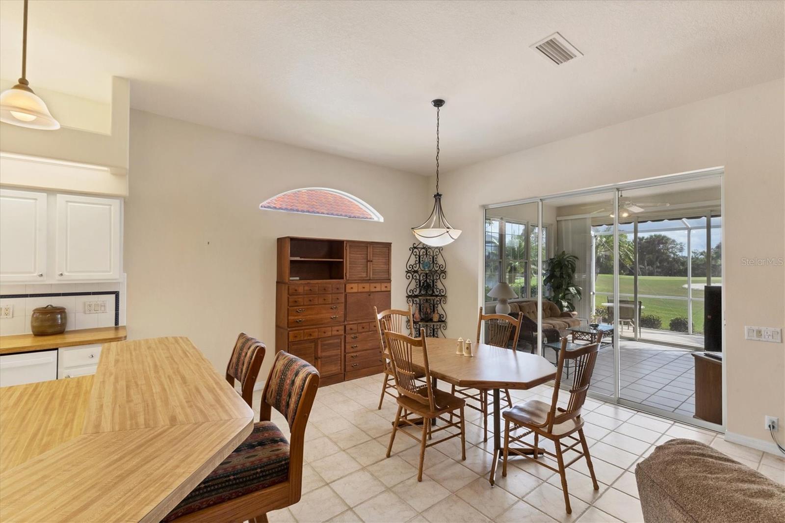 Don't miss out!! Bright and cheery home with Southern exposure overlooking golf course and lake. Open floor plan has tile flooring in main areas with carpets in bedrooms. Spacious kitchen with tons of counter space and movable island with stainless steel surface for food prep. Plenty of cabinets for all your kitchen wares. Tile backsplash. Overlooks dining area and great room. Huge Florida room with lots of windows and sliders to lanai make for a nice warm sunny place for an afternoon nap. Sit out on your screened lanai and watch the golfers on the 8th Fairway. Want to sit outside but not in the sun? Screened in front lanai should do the trick. Master bedroom with en suite bath offering dual sinks and walk in shower. Large walk in closet. Two guest bedrooms with guest bath in between. Guest bath has walk in shower with seat. Laundry room has storage cabinets and a wash sink. NEW ROOF. AC 2024. HURRICANE SHUTTERS. Pelican Pointe is Venice's Premier community offering resort style amenities including Clubhouse with bar/grill, card room/library, and banquet facilities. Heated pool with lap lanes for swimming, fitness center, tennis courts and pickle ball, tons of sidewalks for enjoying the weather throughout the community, and 27 holes of golf with Pro Shop. Tons of social opportunities for non golfers, including trivia night, special occasion activities, and huge Women's association. Golf is NOT mandatory. All of this Centrally located minutes to Venice Beach, Venice Downtown, shopping, theatres, restaurants, highways, airports, and so much more. Venice is the quaint gem you have been looking for on the West Coast. SEE IT TODAY!! TURNKEY FURNISHINGS NEGOTIABLE.