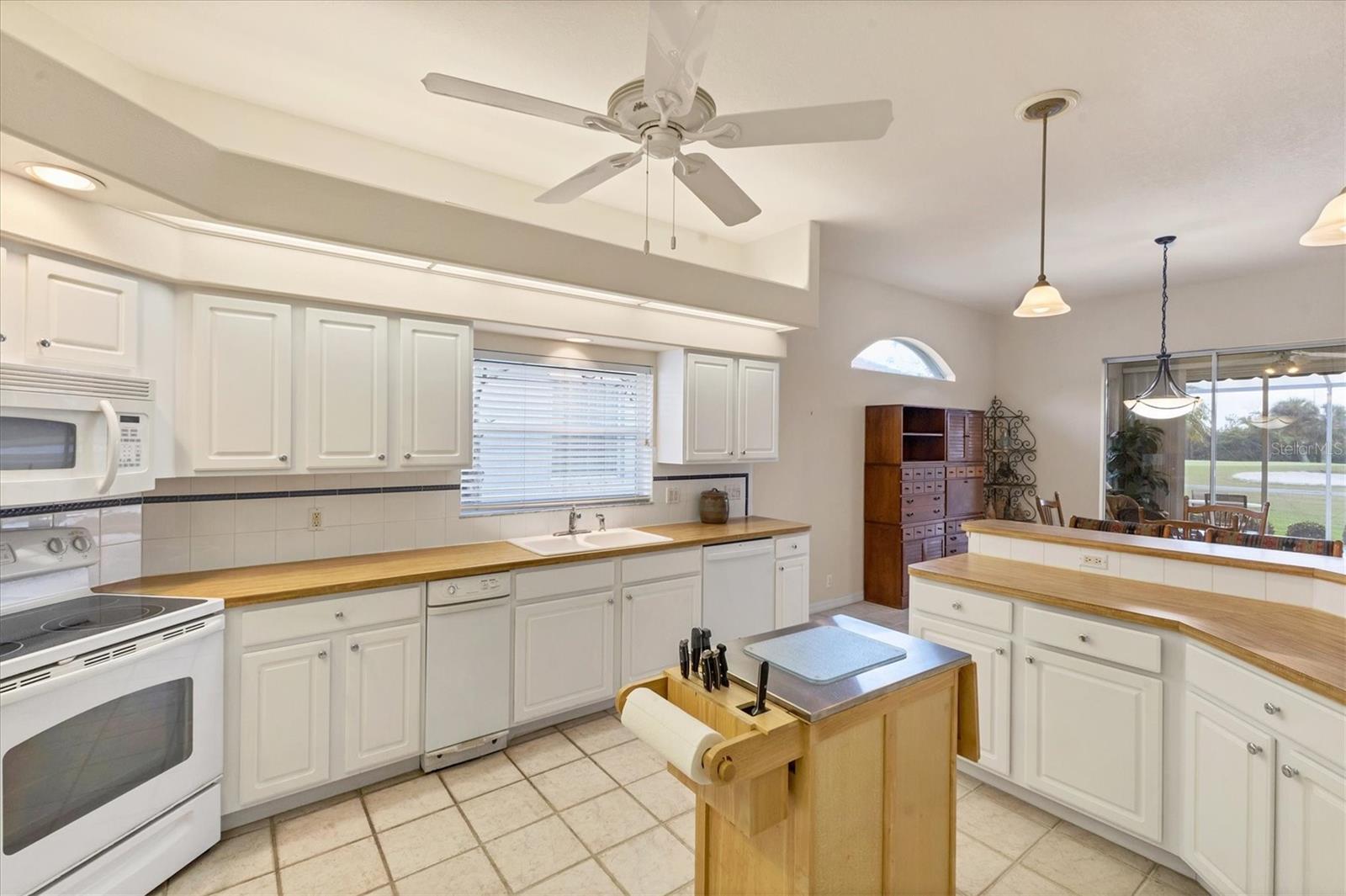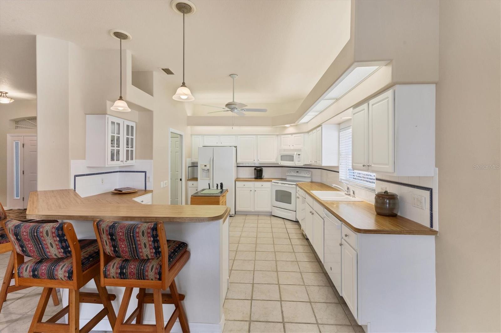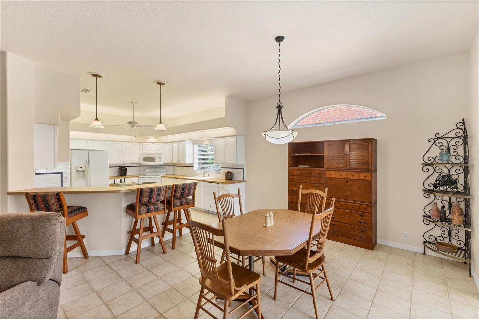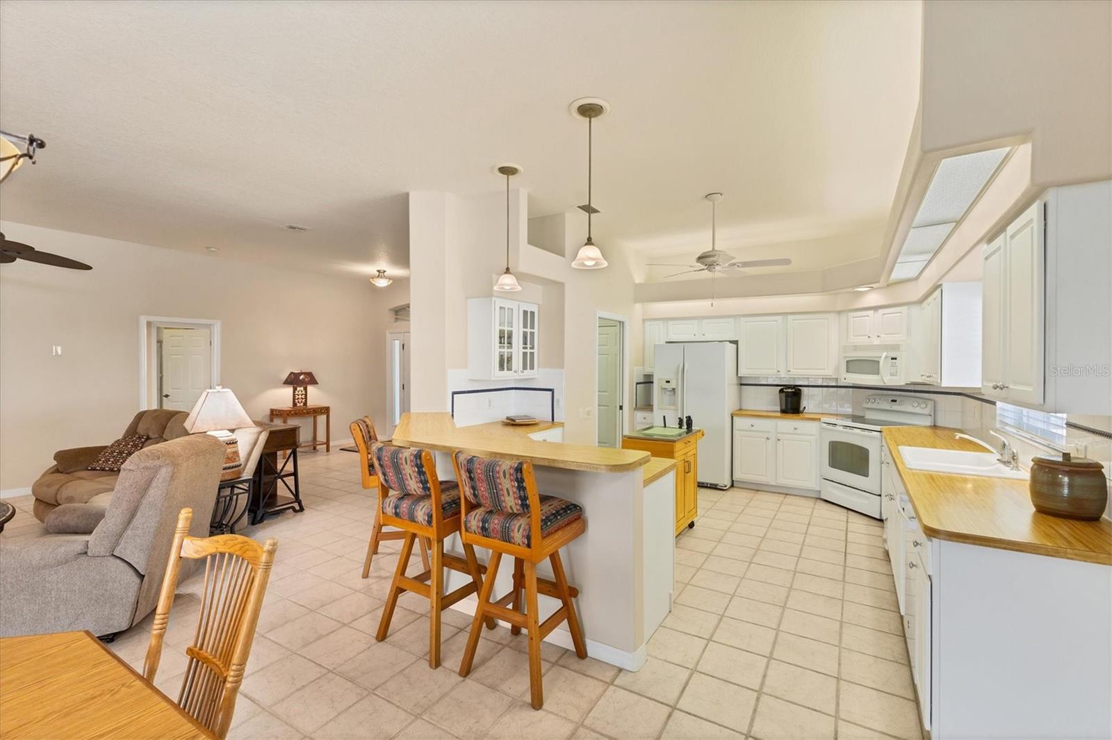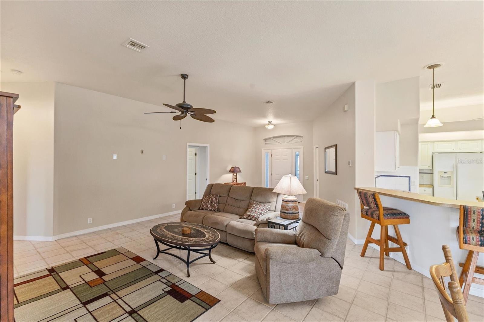 Don't miss out!! Bright and cheery home with Southern exposure overlooking golf course and lake. Open floor plan has tile flooring in main areas with carpets in bedrooms. Spacious kitchen with tons of counter space and movable island with stainless steel surface for food prep. Plenty of cabinets for all your kitchen wares. Tile backsplash. Overlooks dining area and great room. Huge Florida room with lots of windows and sliders to lanai make for a nice warm sunny place for an afternoon nap. Sit out on your screened lanai and watch the golfers on the 8th Fairway. Want to sit outside but not in the sun? Screened in front lanai should do the trick. Master bedroom with en suite bath offering dual sinks and walk in shower. Large walk in closet. Two guest bedrooms with guest bath in between. Guest bath has walk in shower with seat. Laundry room has storage cabinets and a wash sink. NEW ROOF. AC 2024. HURRICANE SHUTTERS. Pelican Pointe is Venice's Premier community offering resort style amenities including Clubhouse with bar/grill, card room/library, and banquet facilities. Heated pool with lap lanes for swimming, fitness center, tennis courts and pickle ball, tons of sidewalks for enjoying the weather throughout the community, and 27 holes of golf with Pro Shop. Tons of social opportunities for non golfers, including trivia night, special occasion activities, and huge Women's association. Golf is NOT mandatory. All of this Centrally located minutes to Venice Beach, Venice Downtown, shopping, theatres, restaurants, highways, airports, and so much more. Venice is the quaint gem you have been looking for on the West Coast. SEE IT TODAY!! TURNKEY FURNISHINGS NEGOTIABLE.