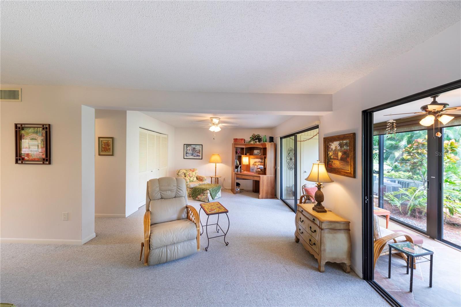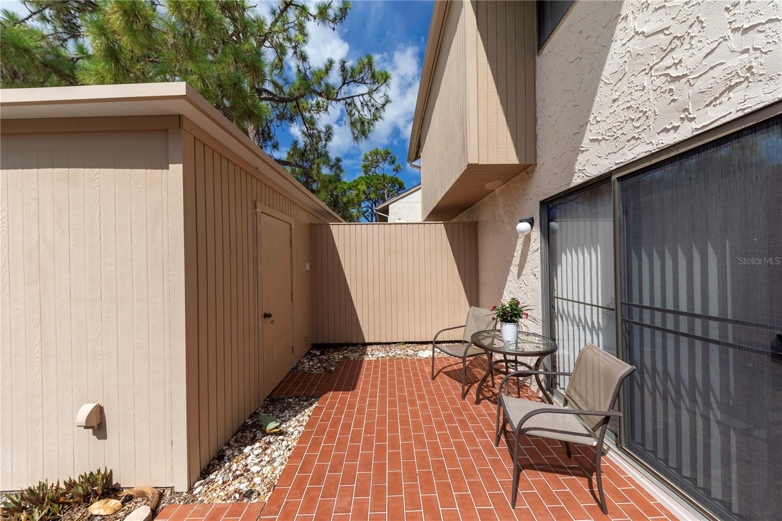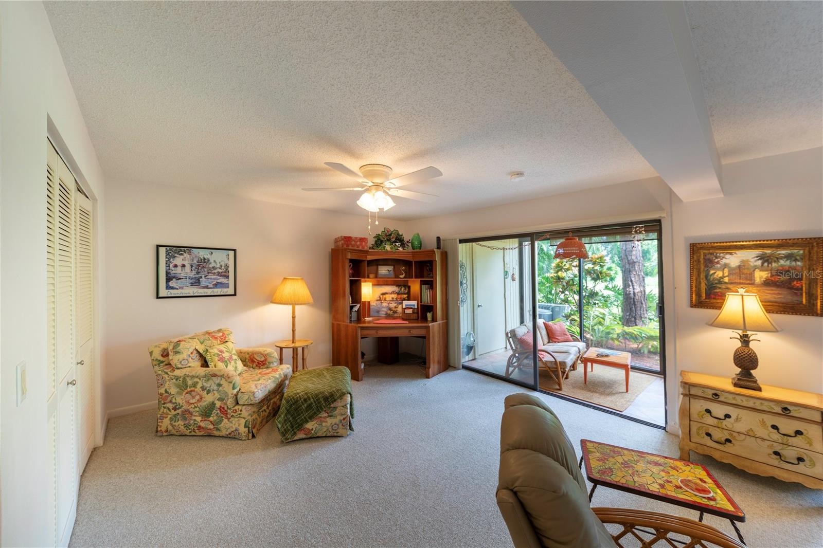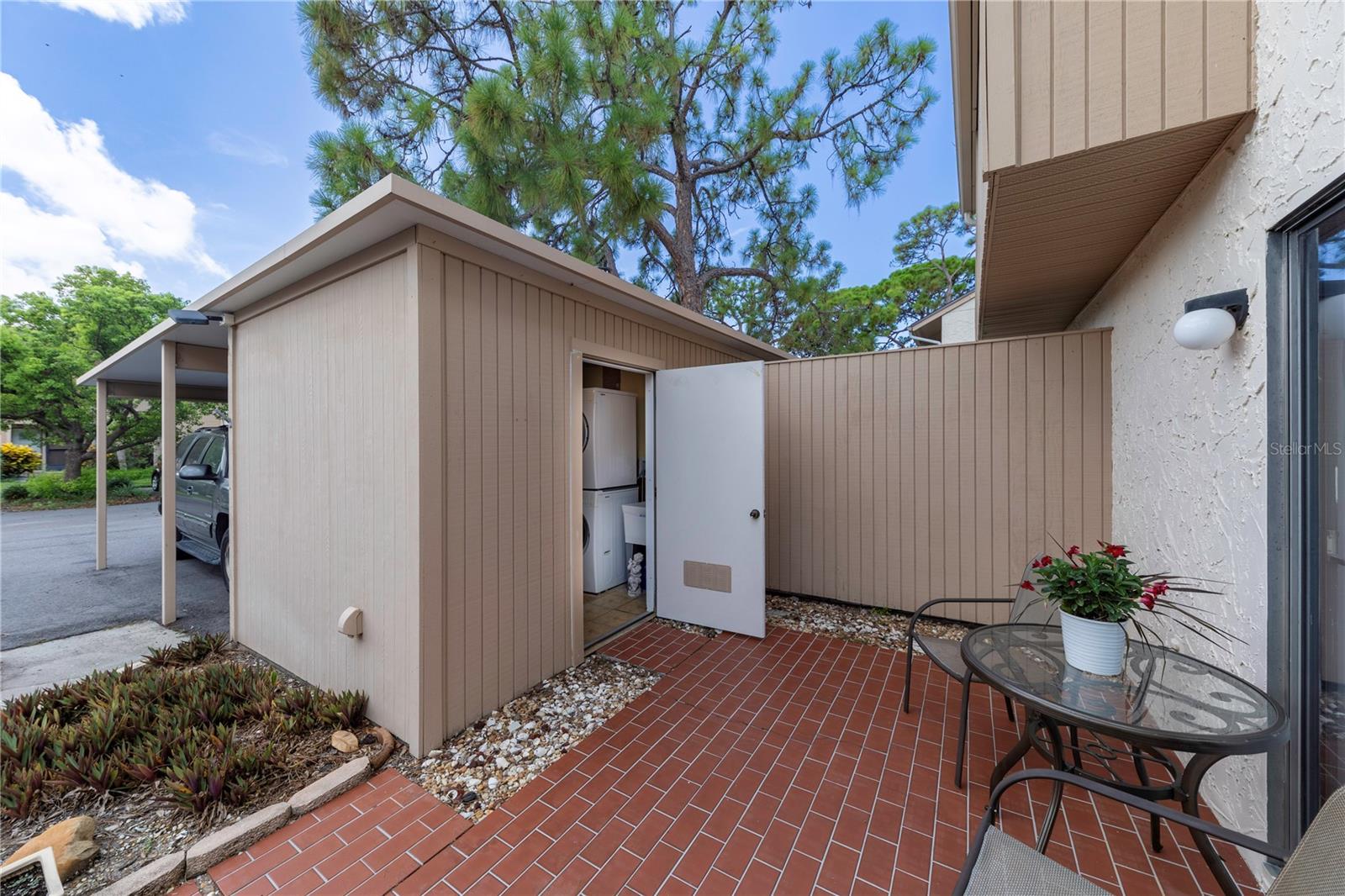 LOCATION, LOCATION, LOCATION! Beautiful Phase I Bird Bay Village GROUND FLOOR/TURNKEY well maintained 2-bedroom convertible 2 bath condo is looking for a new owner! This unit has a bright open floor plan with beautiful green space views. Brand new AC unit in May 2024! The primary bedroom has a walk in closest with an en-suite updated bathroom with a walk-in shower. The 2nd bedroom has a convertible accordion wall, allowing for this space to be used as a bedroom, office, or den. The updated 2nd bath has a tub / shower combo. The glass enclosed lanai lets in lots of natural light with an expansive beautiful tile flooring, and storage area. You can further enjoy the outdoor semi-private front patio with a shed that has new epoxy nonslip flooring with a brand-new washer/dryer and plenty of storage space for your bikes and beach chairs. There is also a covered carport, and plenty of guest parking. This unit is just steps from the gorgeous phase 1 pool. In addition, you have all of the fabulous amenities of Bird Bay with a community swimming pool, tennis courts, Bocce Ball, Pickle Ball, a fitness center, library, clubhouse with kitchen, and numerous clubs and social engagements. The HOA fee includes- basic cable, Exterior insurance, Exterior maintenance, On-site management, Pest control, Pool maintenance, Ground maintenance, Recreational facilities, Water, Trash, and Sewer. Conveniently located with easy access to the Legacy Trail and Historic downtown Venice, the shops, live entertainment, restaurants, and area beaches! Whether you're looking for an investment property, your seasonal retreat, or new full-time home, look no further Paradise has been found!