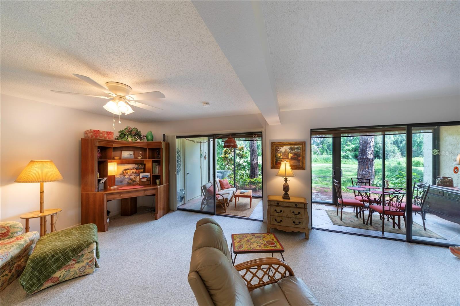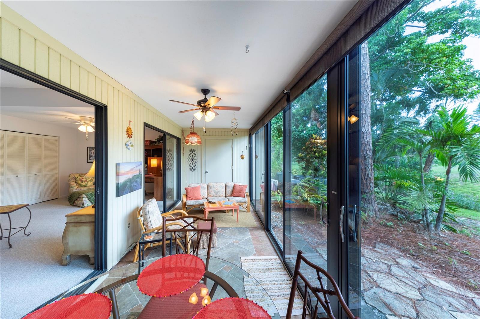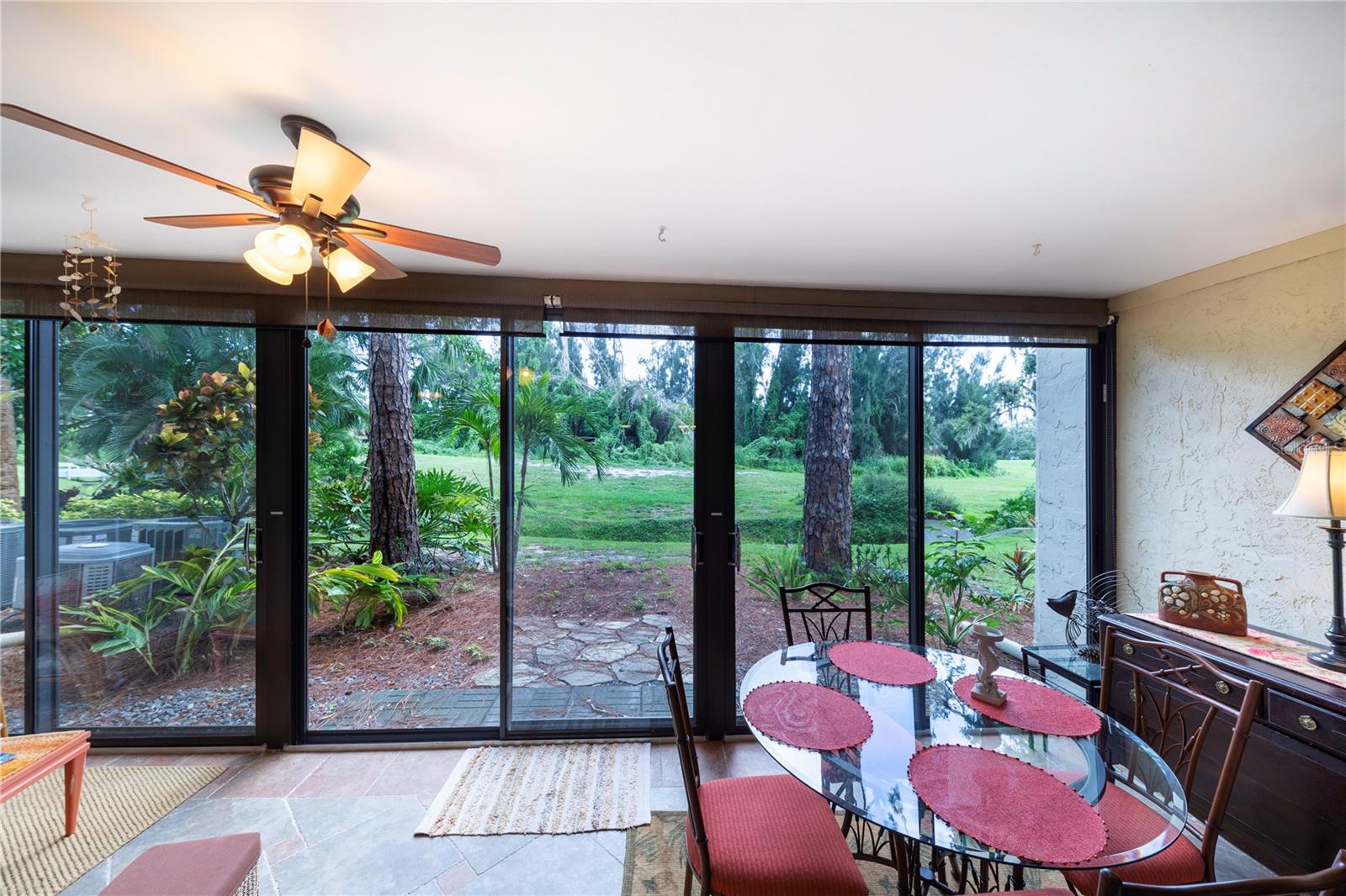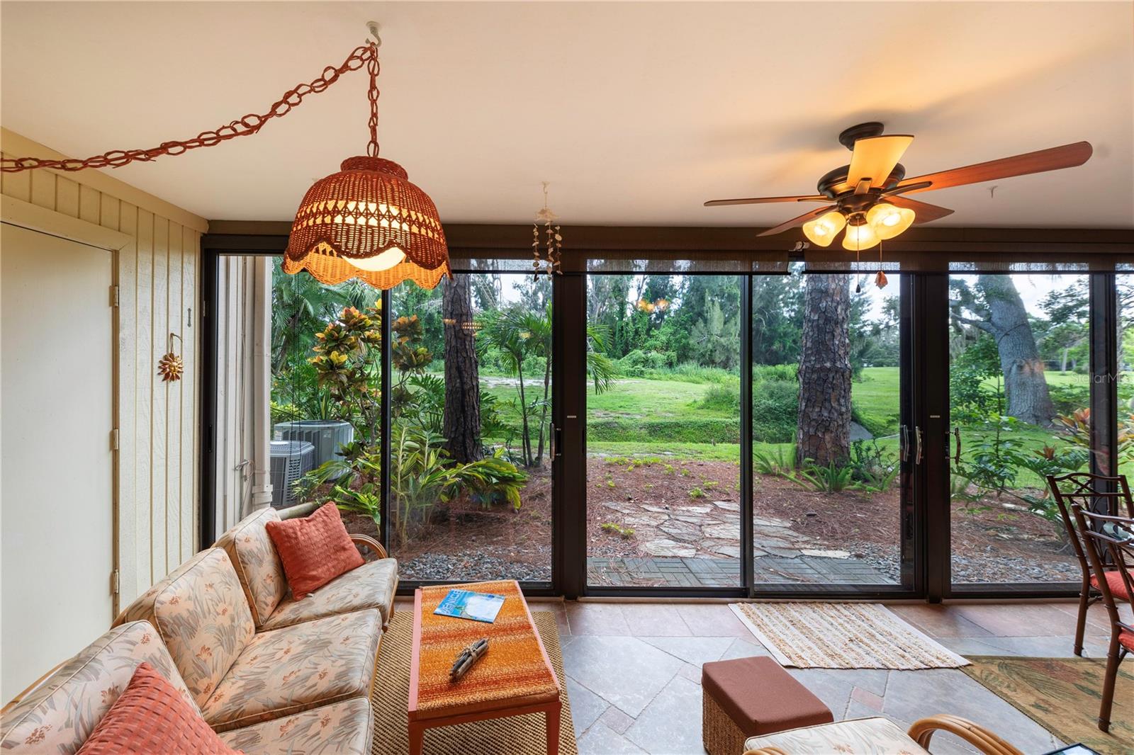 LOCATION, LOCATION, LOCATION! Beautiful Phase I Bird Bay Village GROUND FLOOR/TURNKEY well maintained 2-bedroom convertible 2 bath condo is looking for a new owner! This unit has a bright open floor plan with beautiful green space views. Brand new AC unit in May 2024! The primary bedroom has a walk in closest with an en-suite updated bathroom with a walk-in shower. The 2nd bedroom has a convertible accordion wall, allowing for this space to be used as a bedroom, office, or den. The updated 2nd bath has a tub / shower combo. The glass enclosed lanai lets in lots of natural light with an expansive beautiful tile flooring, and storage area. You can further enjoy the outdoor semi-private front patio with a shed that has new epoxy nonslip flooring with a brand-new washer/dryer and plenty of storage space for your bikes and beach chairs. There is also a covered carport, and plenty of guest parking. This unit is just steps from the gorgeous phase 1 pool. In addition, you have all of the fabulous amenities of Bird Bay with a community swimming pool, tennis courts, Bocce Ball, Pickle Ball, a fitness center, library, clubhouse with kitchen, and numerous clubs and social engagements. The HOA fee includes- basic cable, Exterior insurance, Exterior maintenance, On-site management, Pest control, Pool maintenance, Ground maintenance, Recreational facilities, Water, Trash, and Sewer. Conveniently located with easy access to the Legacy Trail and Historic downtown Venice, the shops, live entertainment, restaurants, and area beaches! Whether you're looking for an investment property, your seasonal retreat, or new full-time home, look no further Paradise has been found!