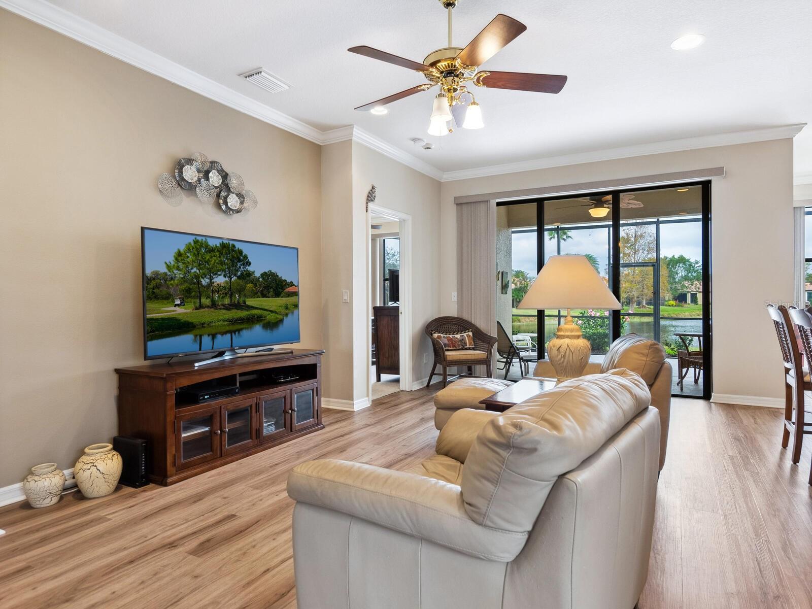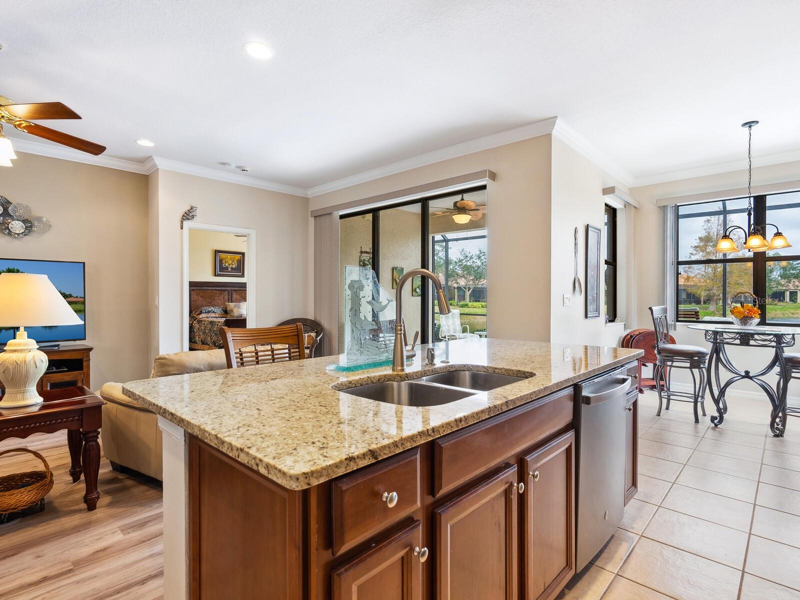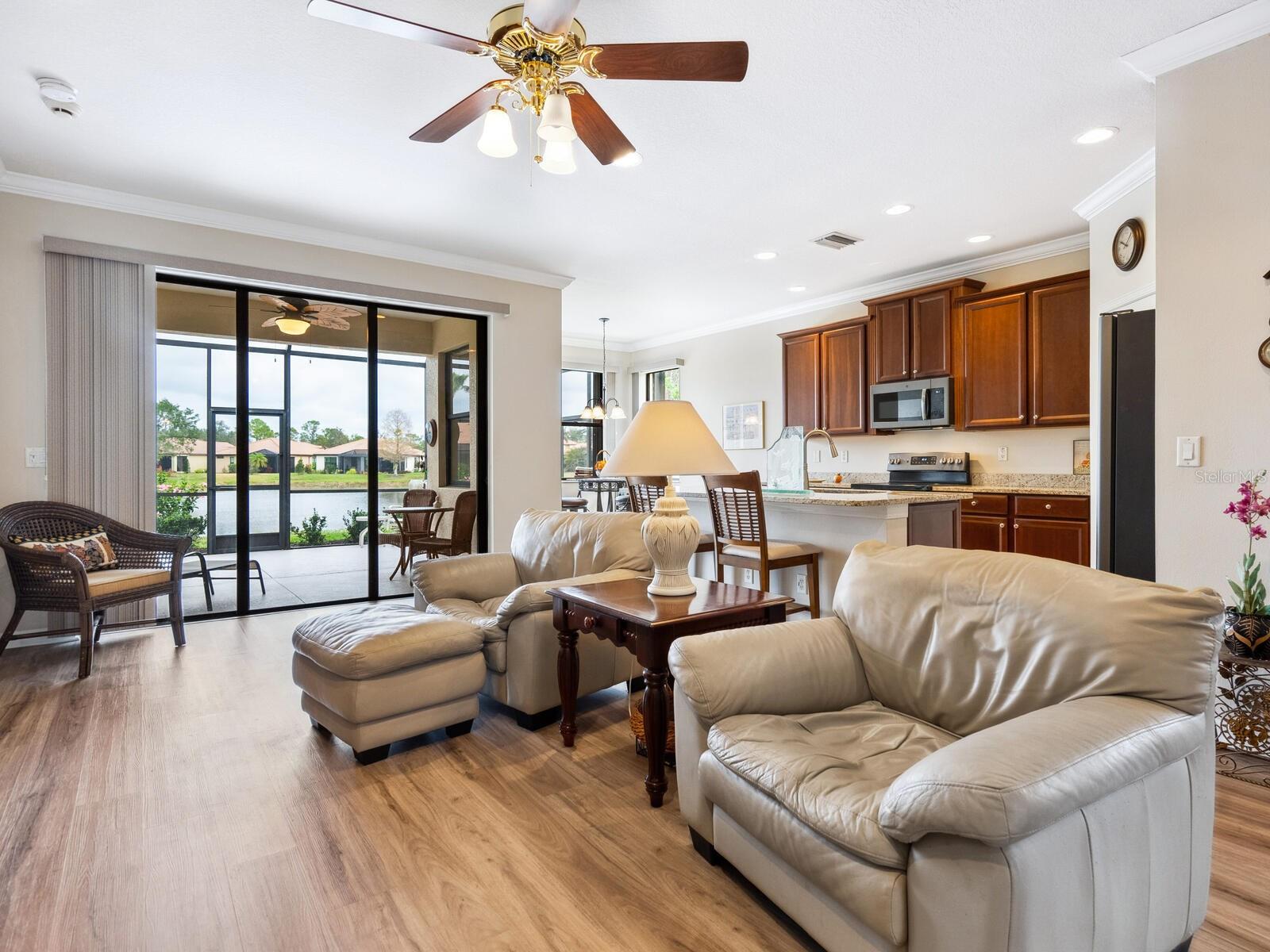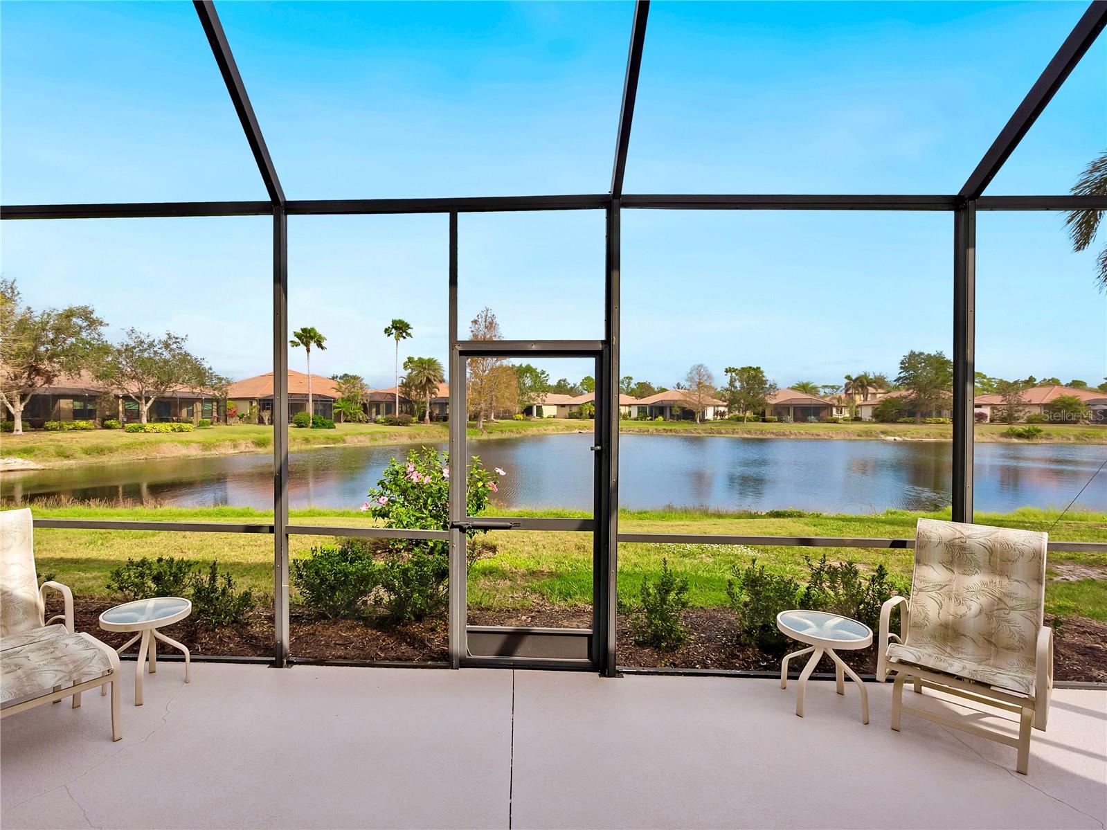Experience lake views and hassle-free living in this beautifully updated paired-villa in the premier 55+ community of Venetian Falls. Conveniently located just minutes from sunny beaches, shopping, dining, and Venice's historic district, this home offers an unmatched lifestyle. This highly sought-after Giovanni floor plan boasts numerous upgrades, including convenient accordion storm shutters all around, whole-house surge protection, tray ceilings, and high-quality crown molding. Step through the screened front entry into a wide foyer illuminated by sidelights and an overhead transom window. The kitchen features granite countertops, solid wood cabinets with trim, stainless steel appliances, and a walk-in pantry offering ample storage space for staples, appliances, and platters. A bright dinette surrounded by three windows makes the most of the wonderful views. The primary suite, located at the rear of the home for added privacy, includes two customized closets (one a large walk-in) and a spacious bathroom with dual vanities, a private water closet, a linen closet, and a walk-in shower. At the front of the home, two guest bedrooms and bathroom offer a private retreat for visitors. Enjoy the outdoors on the lanai, just perfect for grilling, dining, and lounging while soaking in lake views and observing local birdlife. Additional conveniences include a well-appointed laundry room with storage cabinets and a utility sink, and a 2-car garage finished off with a durable and easy-to-clean, polyaspartic floor coating. Venetian Falls offers exceptional community amenities, including a resort-style clubhouse with a heated lap pool and spa, resistance-walking pool, state-of-the-art fitness center, billiards room, bocce courts, full-time activity director, and on-site management. The reasonable HOA fee includes lawn maintenance, irrigation, roof pressure washing, exterior paint, basic cable, and internet, with no CDD fee. Don’t miss the chance to make this remarkable home your own! Some furniture for sale under separate contract.