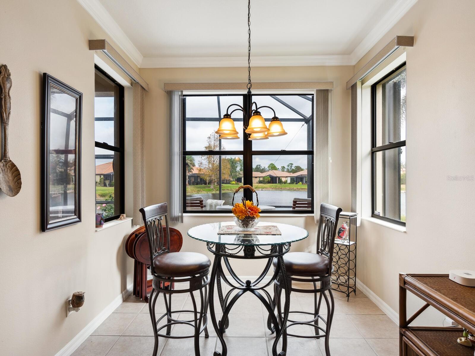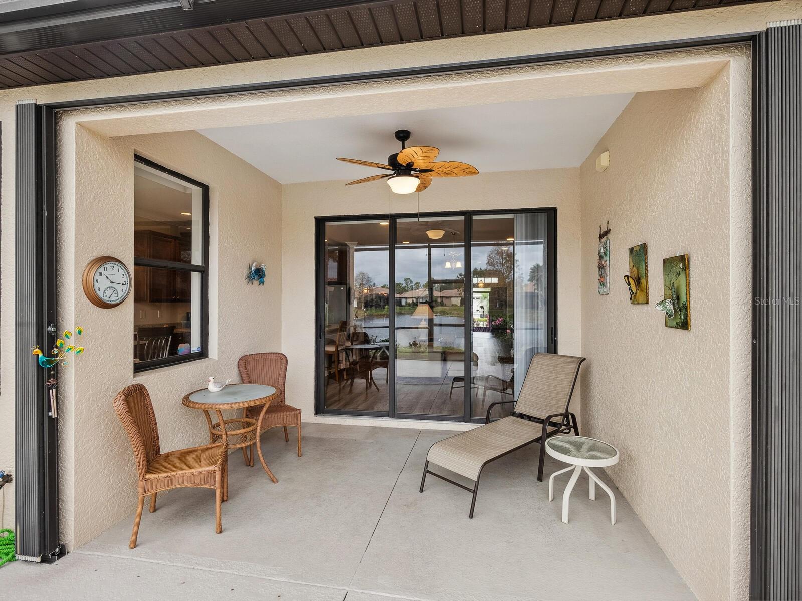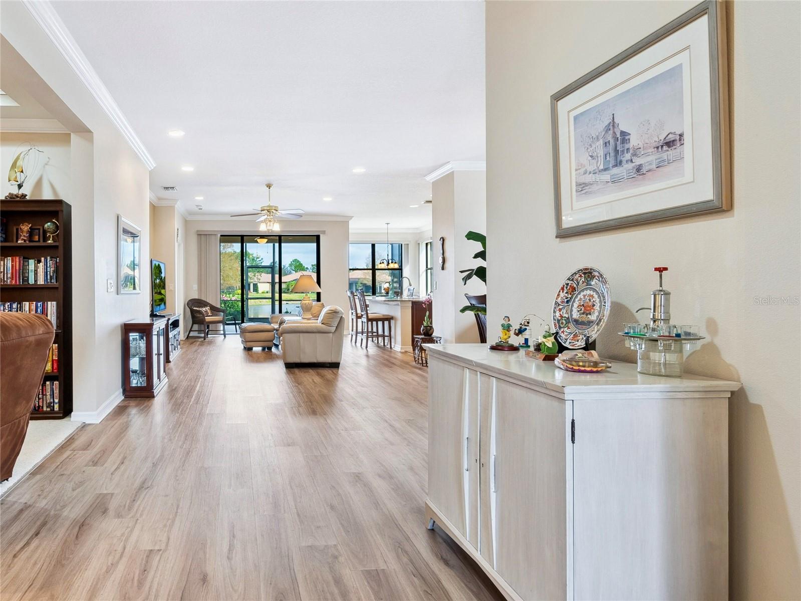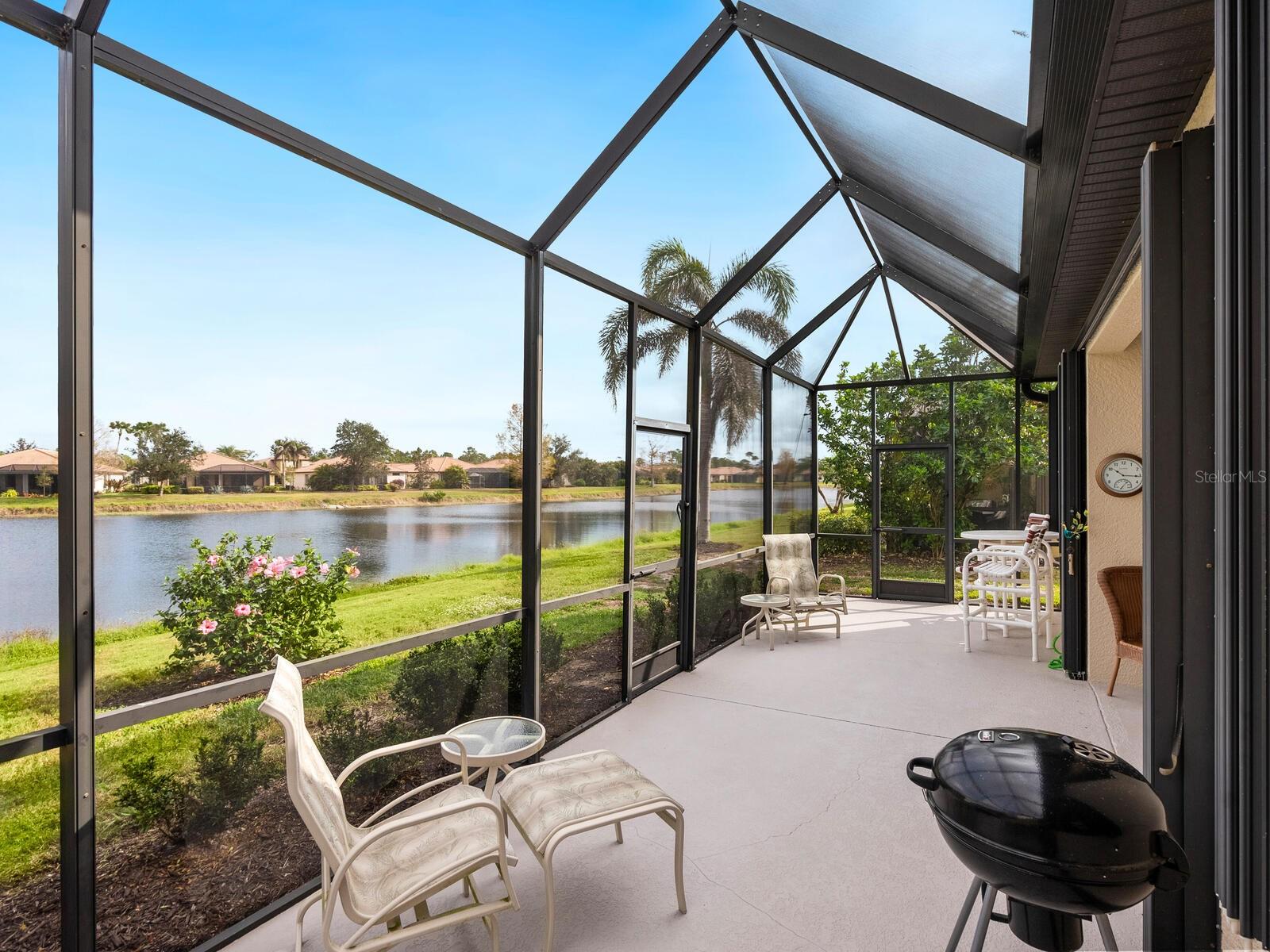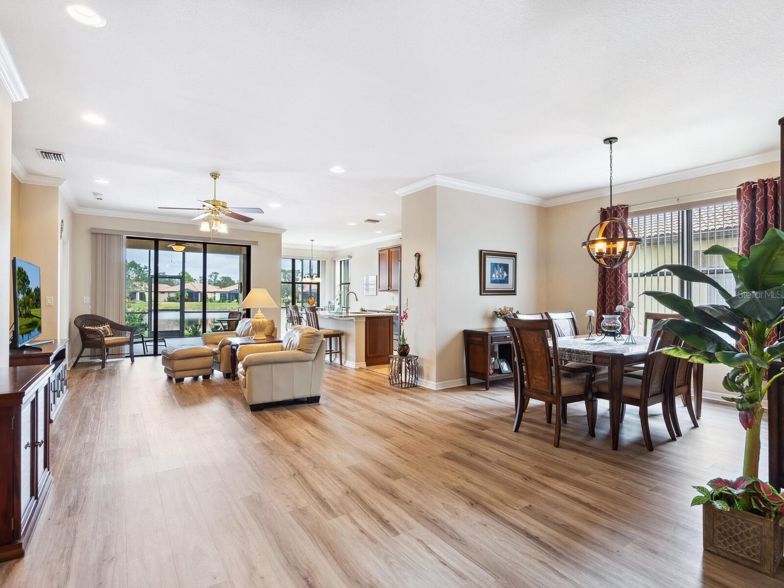 Experience lake views and hassle-free living in this beautifully updated paired-villa in the premier 55+ community of Venetian Falls. Conveniently located just minutes from sunny beaches, shopping, dining, and Venice's historic district, this home offers an unmatched lifestyle. This highly sought-after Giovanni floor plan boasts numerous upgrades, including convenient accordion storm shutters all around, whole-house surge protection, tray ceilings, and high-quality crown molding. Step through the screened front entry into a wide foyer illuminated by sidelights and an overhead transom window. The kitchen features granite countertops, solid wood cabinets with trim, stainless steel appliances, and a walk-in pantry offering ample storage space for staples, appliances, and platters. A bright dinette surrounded by three windows makes the most of the wonderful views. The primary suite, located at the rear of the home for added privacy, includes two customized closets (one a large walk-in) and a spacious bathroom with dual vanities, a private water closet, a linen closet, and a walk-in shower. At the front of the home, two guest bedrooms and bathroom offer a private retreat for visitors. Enjoy the outdoors on the lanai, just perfect for grilling, dining, and lounging while soaking in lake views and observing local birdlife. Additional conveniences include a well-appointed laundry room with storage cabinets and a utility sink, and a 2-car garage finished off with a durable and easy-to-clean, polyaspartic floor coating. Venetian Falls offers exceptional community amenities, including a resort-style clubhouse with a heated lap pool and spa, resistance-walking pool, state-of-the-art fitness center, billiards room, bocce courts, full-time activity director, and on-site management. The reasonable HOA fee includes lawn maintenance, irrigation, roof pressure washing, exterior paint, basic cable, and internet, with no CDD fee. Don’t miss the chance to make this remarkable home your own! Some furniture for sale under separate contract.