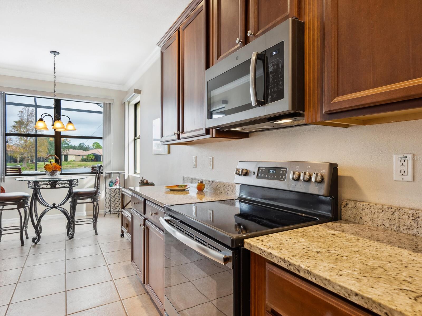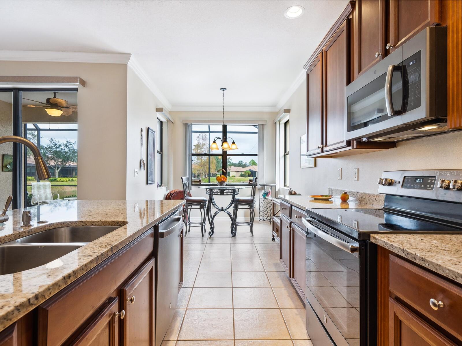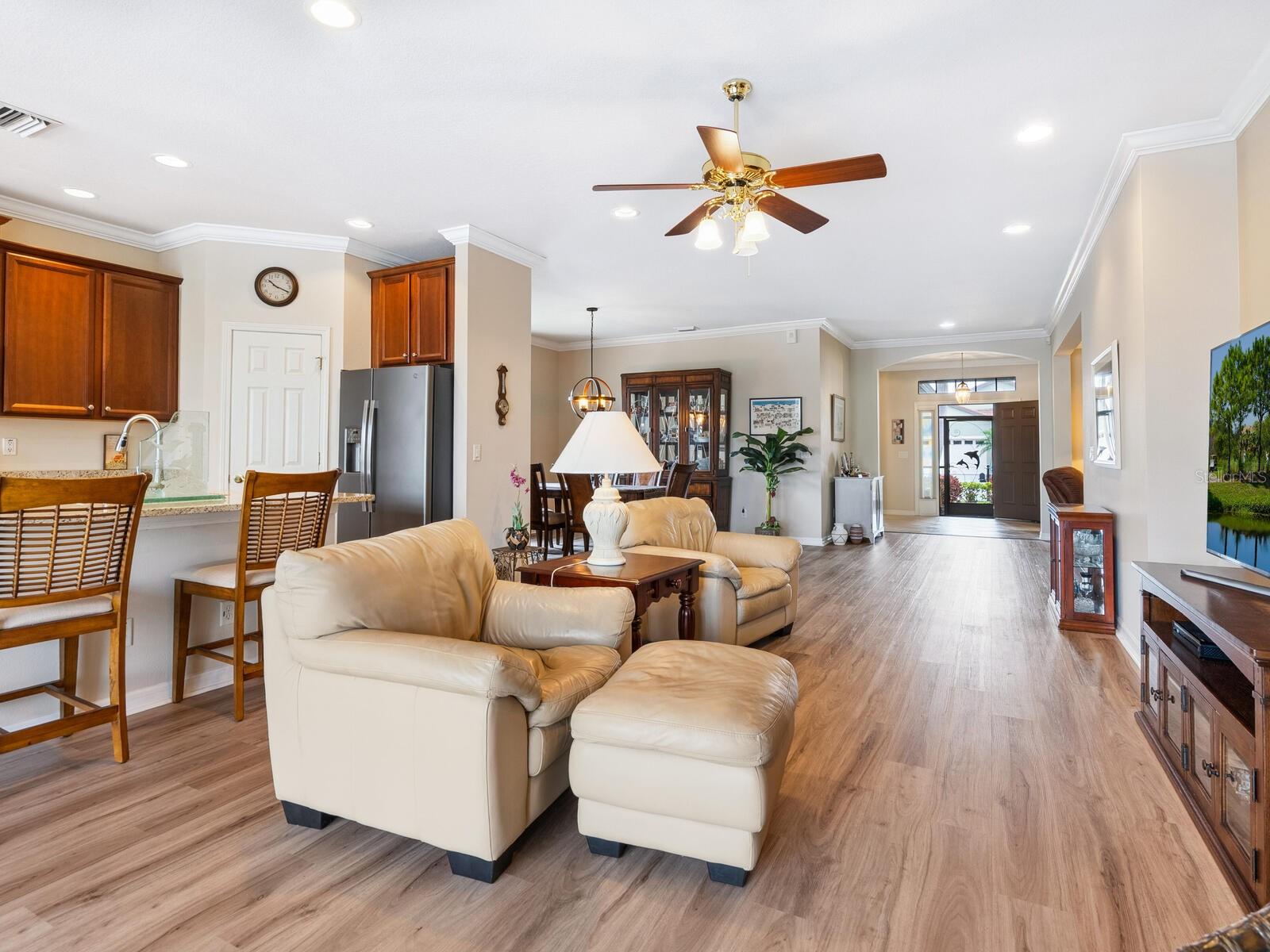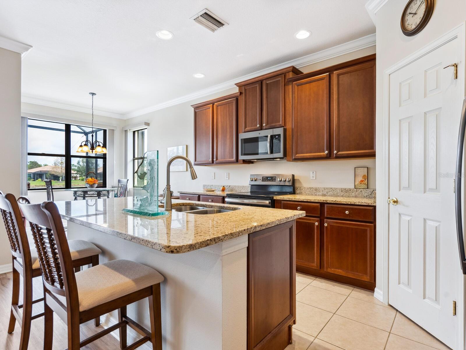 Experience lake views and hassle-free living in this beautifully updated paired-villa in the premier 55+ community of Venetian Falls. Conveniently located just minutes from sunny beaches, shopping, dining, and Venice's historic district, this home offers an unmatched lifestyle. This highly sought-after Giovanni floor plan boasts numerous upgrades, including convenient accordion storm shutters all around, whole-house surge protection, tray ceilings, and high-quality crown molding. Step through the screened front entry into a wide foyer illuminated by sidelights and an overhead transom window. The kitchen features granite countertops, solid wood cabinets with trim, stainless steel appliances, and a walk-in pantry offering ample storage space for staples, appliances, and platters. A bright dinette surrounded by three windows makes the most of the wonderful views. The primary suite, located at the rear of the home for added privacy, includes two customized closets (one a large walk-in) and a spacious bathroom with dual vanities, a private water closet, a linen closet, and a walk-in shower. At the front of the home, two guest bedrooms and bathroom offer a private retreat for visitors. Enjoy the outdoors on the lanai, just perfect for grilling, dining, and lounging while soaking in lake views and observing local birdlife. Additional conveniences include a well-appointed laundry room with storage cabinets and a utility sink, and a 2-car garage finished off with a durable and easy-to-clean, polyaspartic floor coating. Venetian Falls offers exceptional community amenities, including a resort-style clubhouse with a heated lap pool and spa, resistance-walking pool, state-of-the-art fitness center, billiards room, bocce courts, full-time activity director, and on-site management. The reasonable HOA fee includes lawn maintenance, irrigation, roof pressure washing, exterior paint, basic cable, and internet, with no CDD fee. Don’t miss the chance to make this remarkable home your own! Some furniture for sale under separate contract.