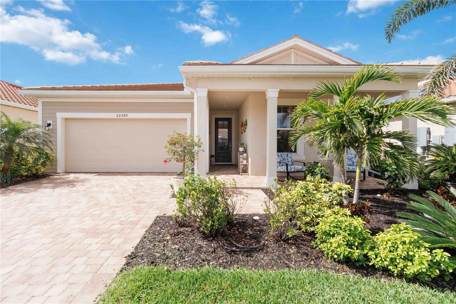 This stunning Aurora II floor plan home, built by Mattamy Homes in 2021, is located in the highly sought-after Renaissance community. Set on a tranquil lakefront homesite (not in a flood zone), this 3-bedroom, 2-bath home boasts breathtaking sunset views from the west-facing screened-in lanai. The additional flex room/office, with French doors, offers privacy for those who work from home or need extra guest space. Designed with a split floor plan, the guest bedrooms are positioned at the front, while the spacious primary suite enjoys privacy in the back of the home with gorgeous lake and fountain views. The primary retreat features a trayed ceiling and a spa-like ensuite with dual sinks, a large walk-in shower with an upgraded frameless glass surround, and a generous walk-in closet. The heart of the home is a modern designed kitchen featuring quartz countertops, subway tile backsplash, a spacious closet pantry, and a large breakfast island with additional seating. Big windows throughout the home bathe the space in natural sunlight, complemented by 8-foot doors and plank-tiled flooring that enhance the elegant coastal feel. Additional Upgrades: Custom Levolor 2" blinds throughout Whole-home water softener and filtration system Two heavy-duty overhead storage racks in the garage Newly installed rain gutter for enhanced drainage and home protection The backyard offers ample space for a private pool, allowing you to create your own personal oasis.