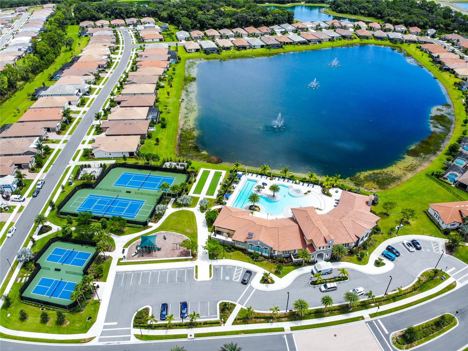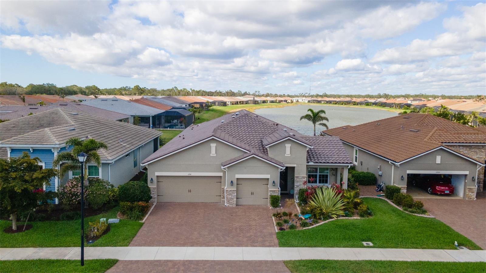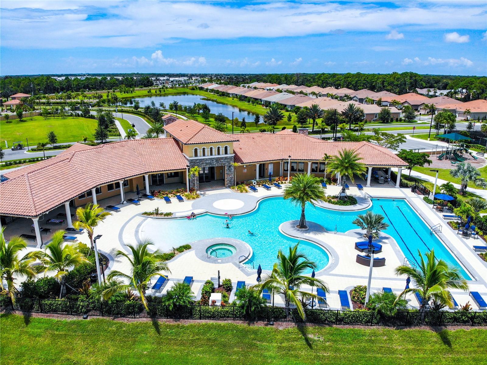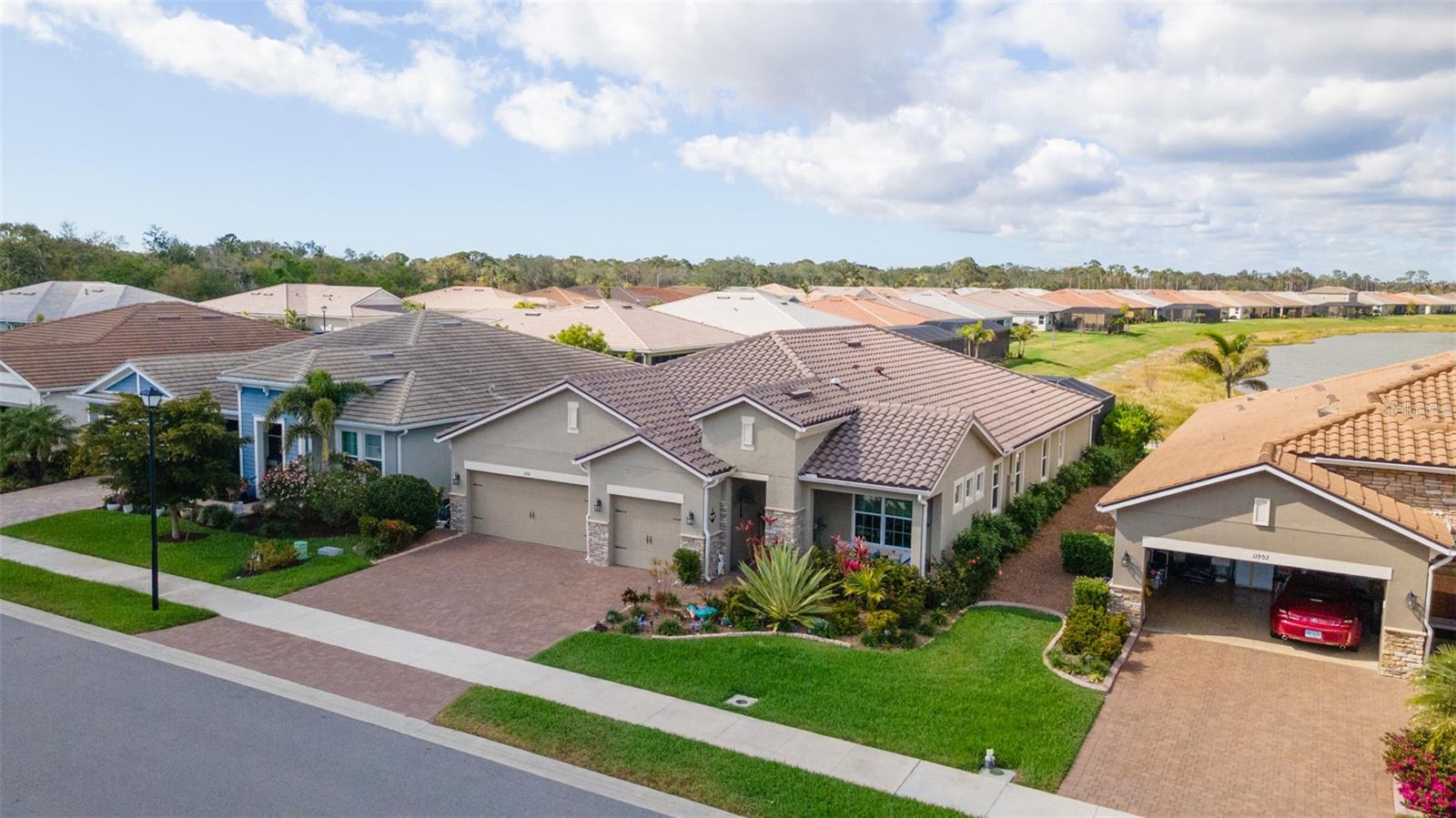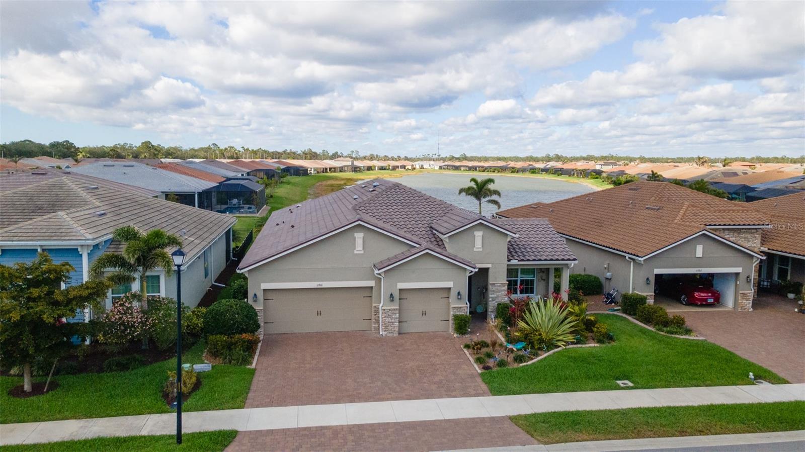 Welcome to your dream home in the Renaissance subdivision of Wellen Park! This stunning 4-bedroom, 3.5-bath masterpiece is the largest model offered in the community, boasting high-end updates and a spacious layout perfect for a large family. Nestled along a serene lake view, this residence combines luxury and comfort with breathtaking scenery. Step inside and be greeted by an abundance of natural light pouring through skylights in the main living area, creating a bright and inviting atmosphere. The gourmet kitchen flows seamlessly into the dining room, where you'll find a stylish built-in bar and storage area—ideal for entertaining guests or enjoying family dinners. The office, featuring elegant glass French doors, offers a perfect space for work or study. Outside, the expansive lanai is an entertainer’s paradise, complete with a sink and refrigerator for effortless outdoor living. Overlooking the tranquil lake, this space is perfect for relaxing or hosting gatherings. Car enthusiasts and storage seekers will appreciate the generous 3-car garage, providing ample room for vehicles, toys, or a workshop. Located in vibrant Wellen Park, you’ll enjoy access to new restaurants, shopping, lively bars, and the Atlanta Braves spring training facility—all just moments away. With generous living spaces, premium finishes, and thoughtful design throughout, this home is a rare find. Whether you're unwinding in one of the expansive bedrooms, sipping a drink on the lanai with lakefront views, or exploring the exciting amenities of Wellen Park, every detail has been crafted for modern family living at its finest. Don’t miss your chance to own this exceptional property in the Renaissance community!