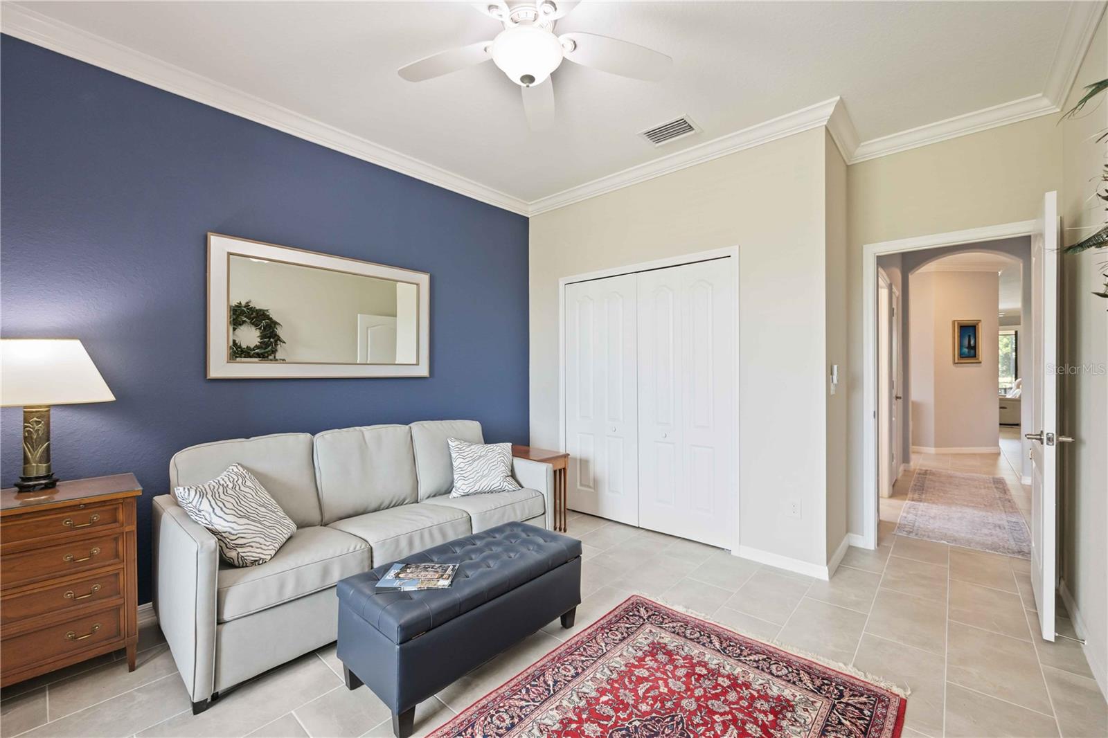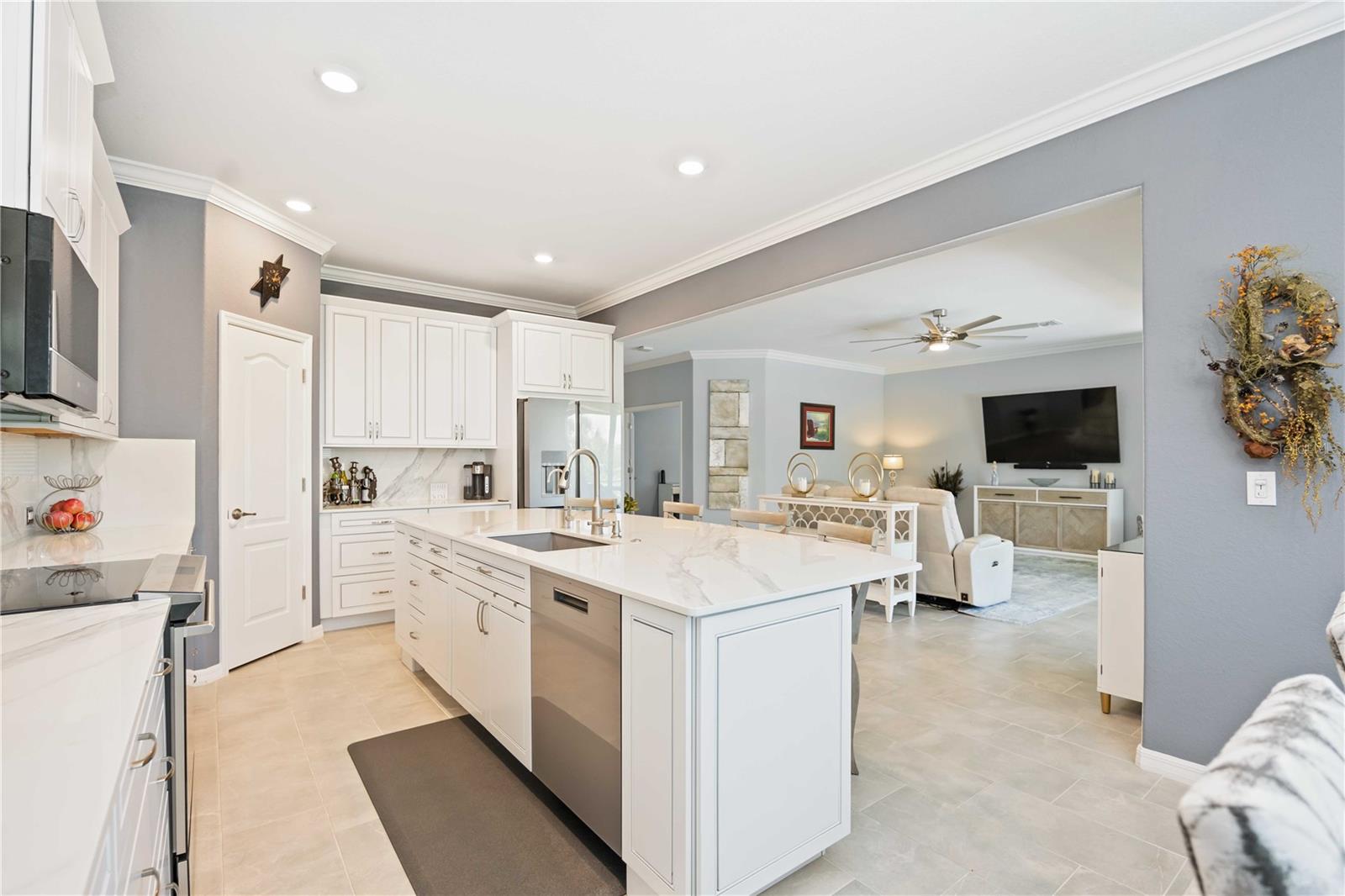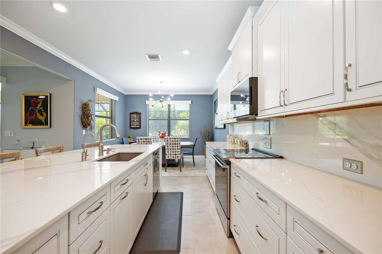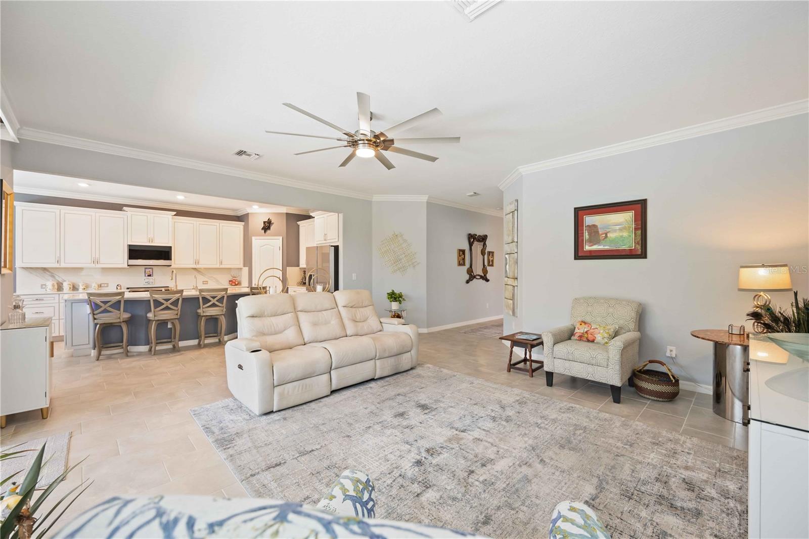 Location, Location, Location. This is a must see, especially if you love golf. You will not be disappointed with this 2000+ square foot home. With over $200K of upgrades, this is a one-of-a-kind Roma model. 2 bedrooms, 2 bathrooms, den that can be converted into a 3rd bedroom and a flex room adjacent to second bedroom, heated pool and spa. The home also features an Entire Home Solar System that is insured and transferable. Premium lot – common area in front and side with preserve in the back the monthly HOA fee includes 2 golf memberships, as well as ground maintenance, irrigation, cable TV and more great amenities. Some of the many upgrades include remodeled chef’s dream kitchen and pantry, upgraded cabinets, enlarged quartz island and backsplash, top of the line appliances (induction range), and under cabinet lighting. Upgraded bathrooms; primary bath has a glass walk-in shower, dual sink vanity, separate water closets, and a large custom walk-in closet (relocated HVAC from laundry room to garage). Large laundry room with lots of storage space and utility sink. Extra storage closets in the garage and drop zone (floor to ceiling). Crown molding and tile throughout the house. Central vacuum system, Electric storm smart hurricane screens on the lanai. Hurricane windows in front of the house. 220 outlets in garage for EV charging. Floored attic, pull down ladder, solar attic fan, insulated garage door, garage ceiling has spray foam insulation. 5 baffles added to roof vents. Sarasota National is a 2400-acre International Audubon Bird Sanctuary with some of the most beautiful lakes and preserves in Venice. A 30,000 Sq Ft clubhouse with resort style pool, hot tub, outdoor tiki bar serving food and drinks, coffee house, fine dining restaurant, golf club restaurant, fitness center, card room, day spa, bocce ball, pickle ball, tennis, dog park, event lawn and an 18-hole championship golf course. Short drive to downtown Venice Island and the new area of Wellen Park and the Atlanta Braves Stadium. Close to Venice Beach where you can relax and watch the sunset over the Gulf of Mexico.