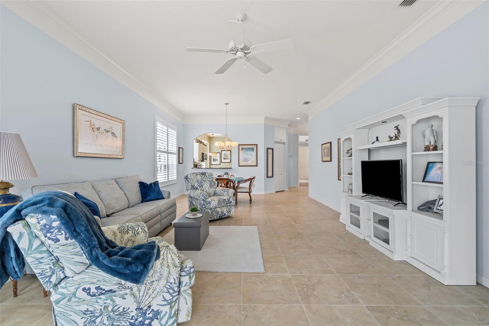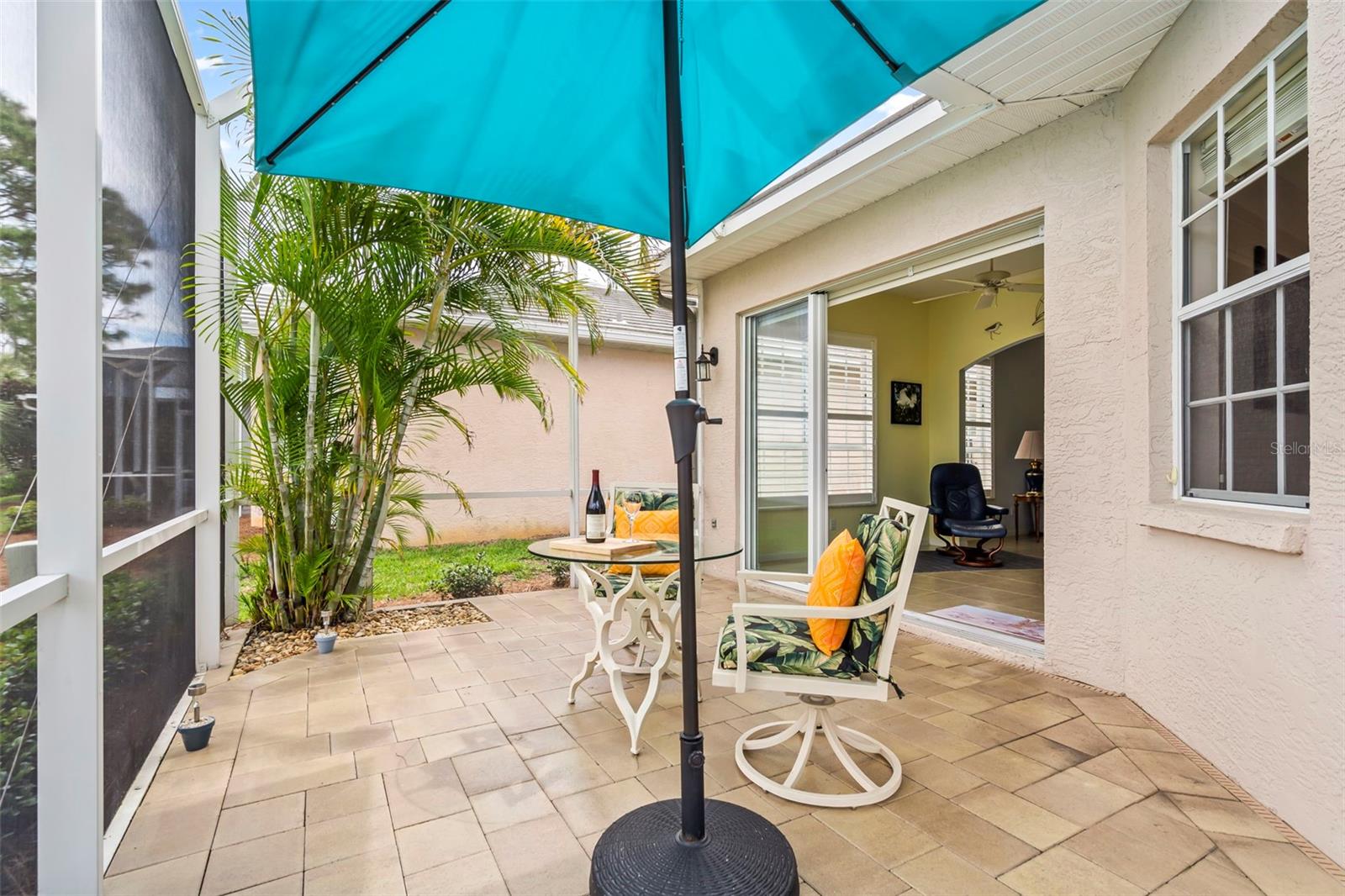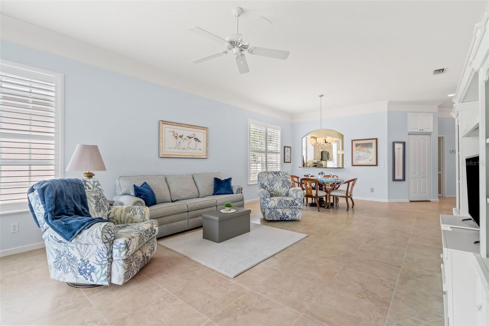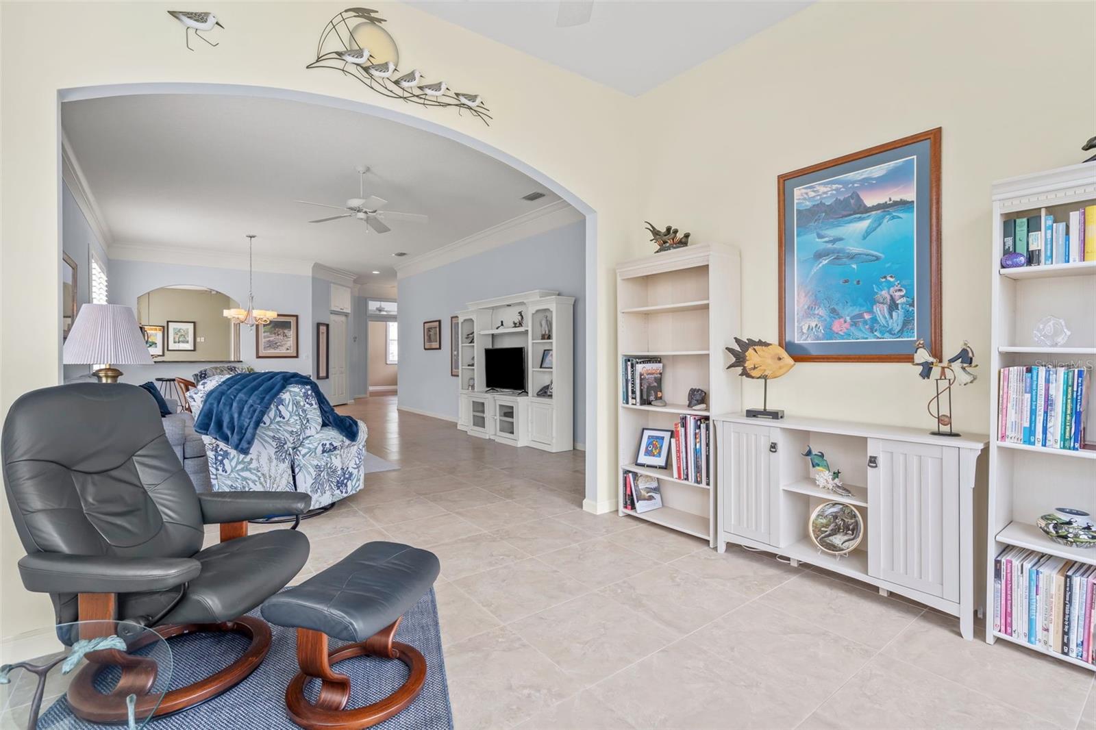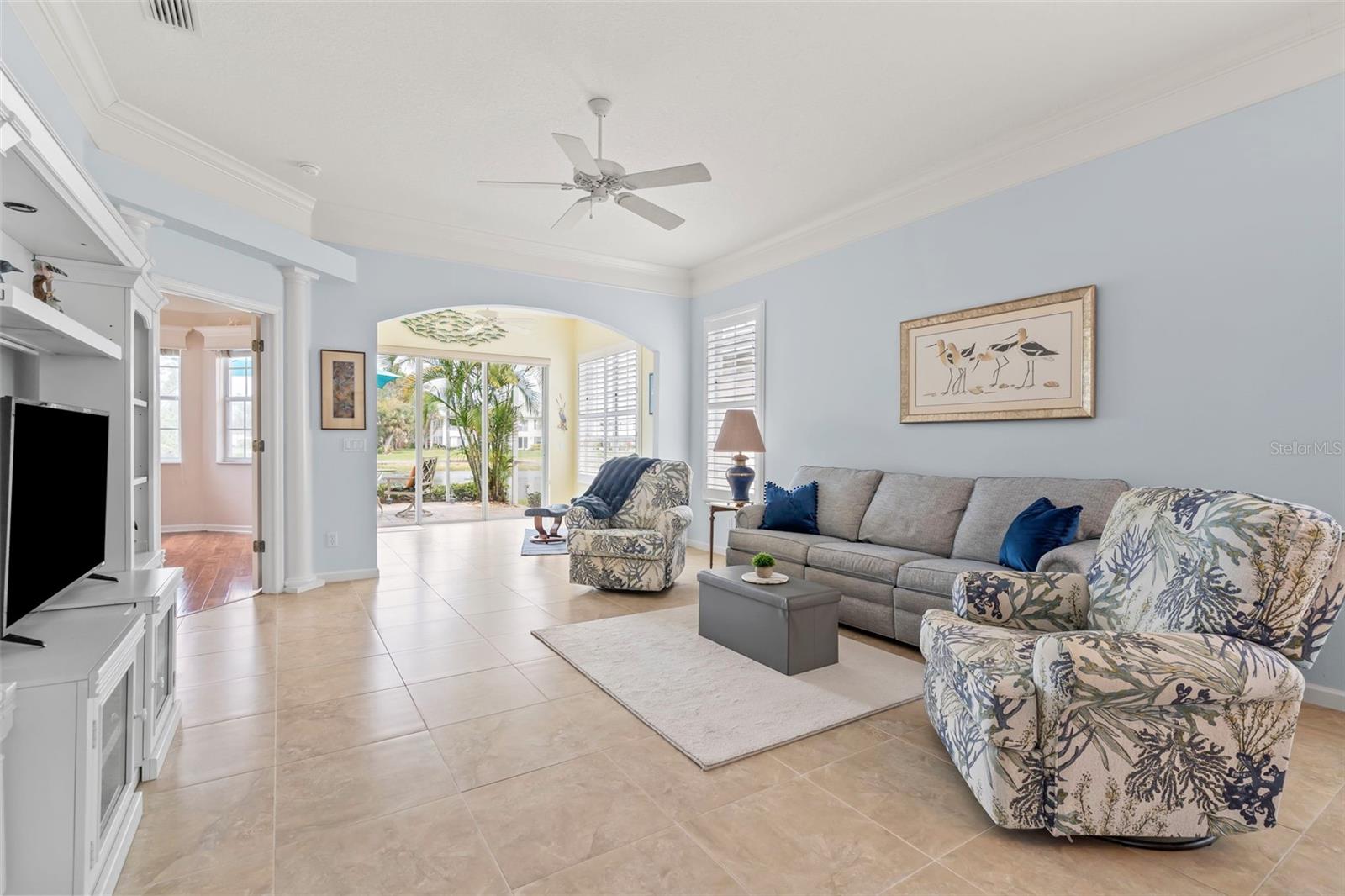 SWEEPING WATER VIEWS and oak-lined streets, all with convenient condo living! Nestled in the sought-after Villas II of St. Andrews Park at Plantation, this elegant single-family detached condo offers the perfect blend of Florida charm, privacy, and modern convenience. Offered partially furnished, featuring 3 bedrooms, 2.5 bathrooms, and over nearly 2000 sq. ft. of light-filled living space, this home is designed for both comfort and style. A new roof (2023) and new AC (2023) provide peace of mind, while abundant upgrades elevate its appeal. Step inside to find a bright and airy interior, where oversized windows welcome a flood of natural light. You'll also notice high ceilings, crown molding and plantation shutters in main living areas. All bedrooms are finished with luxury vinyl plank flooring—complemented by tile throughout the rest of the home for seamless, carpet-free living. One bedroom is perfect as a spacious den or home office, featuring space-saving, built-in cabinetry and desk. The screened front porch invites you to enjoy morning coffee, while the extended rear lanai showcases breathtaking lake views, perfect for unwinding, entertaining, or viewing abundant wildlife from your backyard. The primary suite is a true retreat, with a large bay window overlooking the water, massive walk-in closet, and a spa-like en suite bathroom featuring a soaking tub, walk-in shower with frameless glass door, and double vanity. The guest suite offers an additional walk-in closet and shares a convenient Jack & Jill bathroom with an attached half bath, making it ideal for guests. A versatile bonus room serves as a cozy reading nook, music room, or creative space. The choice is yours! The ergonomic chef’s kitchen is beautifully appointed with Noir stainless steel appliances, granite countertops, glass tile backsplash, sliding cabinet shelves, spacious closet pantry, and both a breakfast bar and a charming breakfast nook with bay window. The laundry room is equally impressive, featuring an upgraded washer and dryer, additional cabinetry, utility sink, and granite countertop. The two-car garage features an epoxied floor for a polished look and space for cabinets or storage on all three walls. Bedroom closets, storage nooks throughout the house, and spacious front hall closet meet additional storage needs. Living in this maintenance-free community means enjoying the quiet and privacy of a detached home with condo ownership that covers roof replacement reserves, structural insurance, exterior painting, full lawn care, and irrigation. Residents also have access to three St. Andrews Park community pools for relaxation and socializing. Two pools are within a short walking distance. The Villas II of St. Andrews Park at Plantation is nestled in the heart of Plantation Golf & Country Club, where OPTIONAL club membership levels are available, allowing you to take advantage of golf, additional pool, fitness center, pickleball / tennis, dining, and social opportunities if desired! Plantation G&CC features two 18-hole championship golf courses, 13 Har-Tru tennis courts, 6 pickleball courts, fitness center, Jr. Olympic pool, and exceptional dining / social activities. Tranquility meets convenience, as this serene neighborhood is just minutes from beaches, dining, shopping, Atlanta Braves stadium, and bustling Downtown Wellen Park. Take advantage of the best of Venice! Call today for your showing! (One or more photos may be virtually staged)