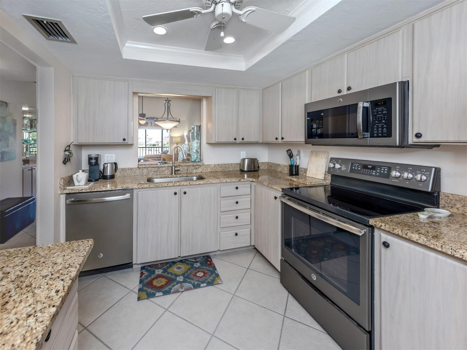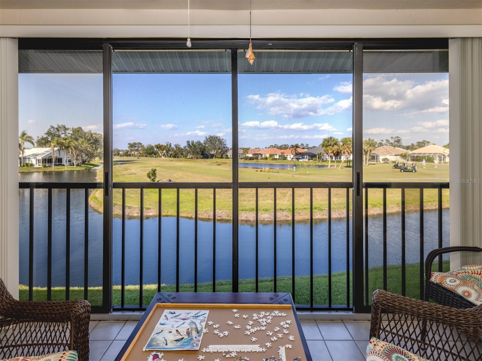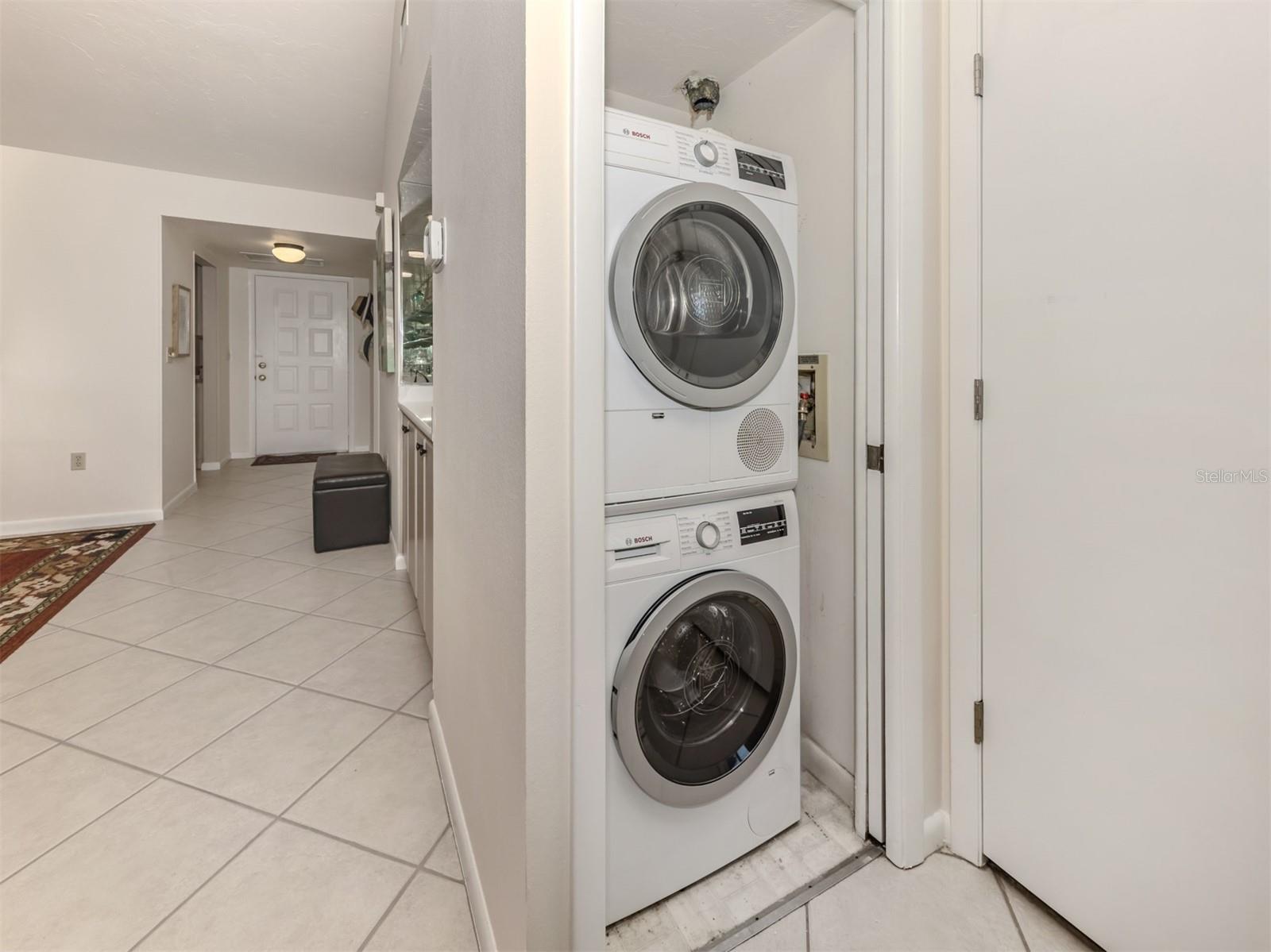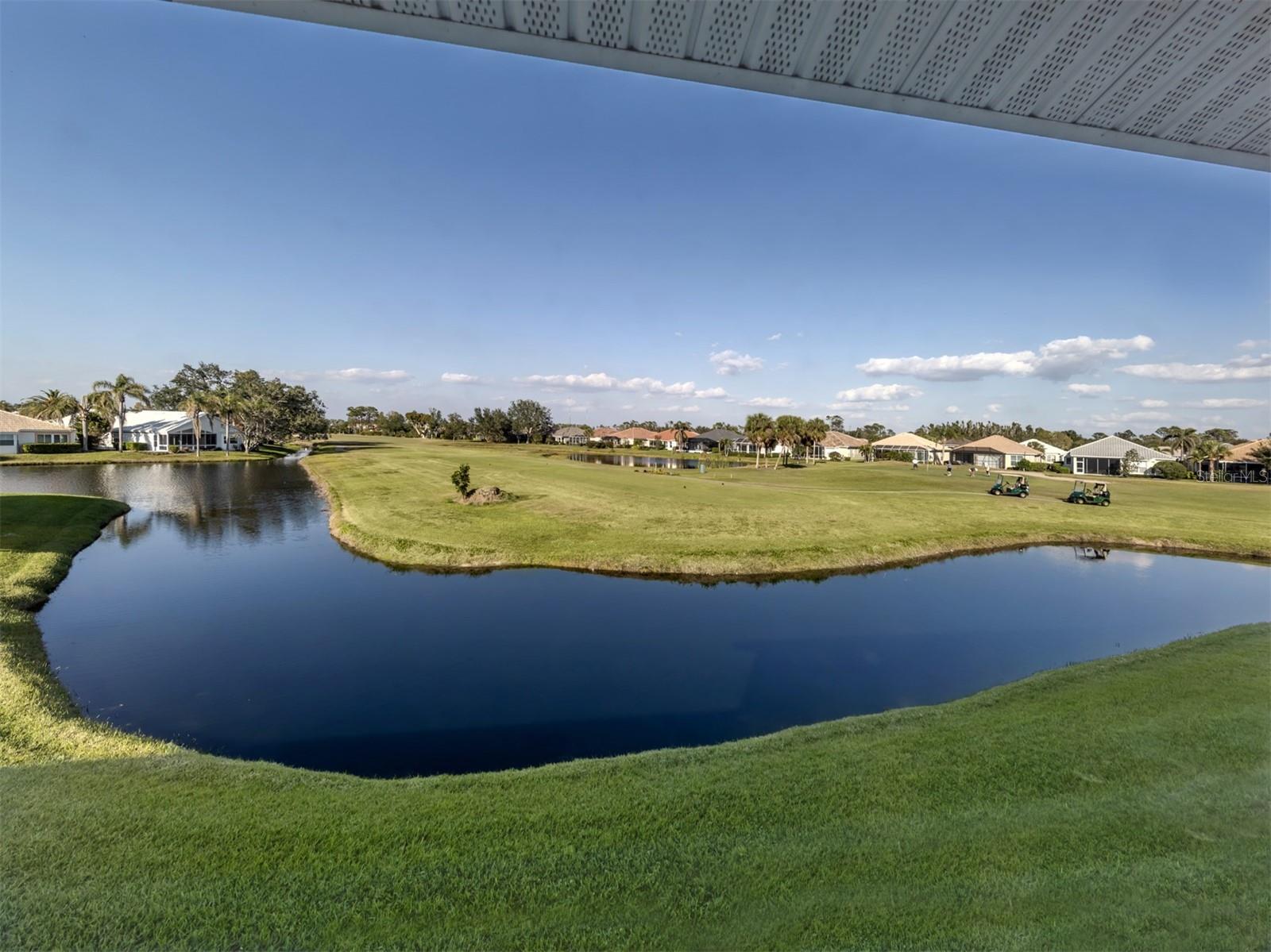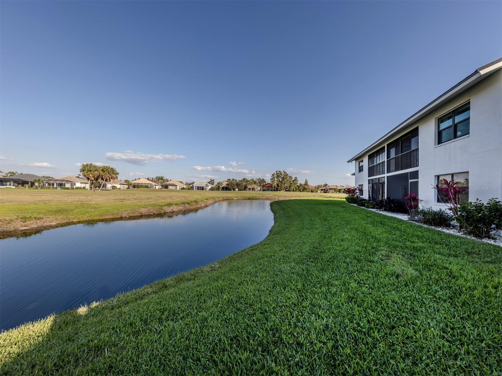 See this outstanding, updated condo with long views of a lake and golf course. Nothing left to do here but enjoy the Florida lifestyle, turnkey furnishings included. Kitchen and baths have been stylishly redone, newer flooring is in place, Euro-style Bosch stack washer and dryer is included, all windows replaced and condo roof recently replaced. Both baths have converted step-in showers with designer tile surround and multiple head faucets. Storage is no issue here, where the primary suite has a walk-in closet and linen closet, and there's another walk-in closet in the hallway. The kitchen has gleaming counters of granite on 3 sides, and more than ample cupboard space. HVAC is equipped with built-in humidistat. Each unit also has their own storage space on-site. Lakes of Capri is a friendly and well-managed community with a large, popular pool and recently updated clubhouse, manicured grounds and newer carports.