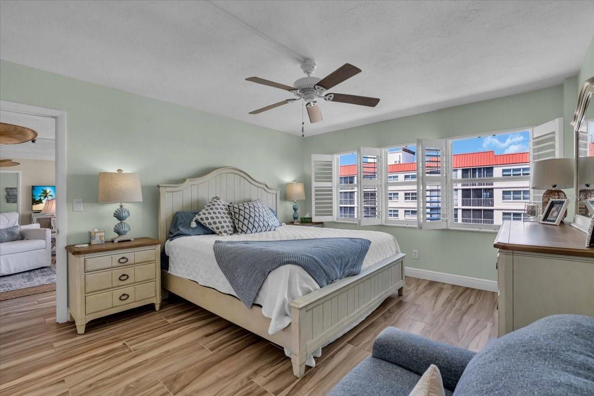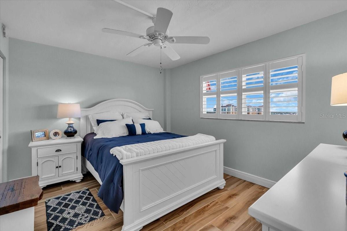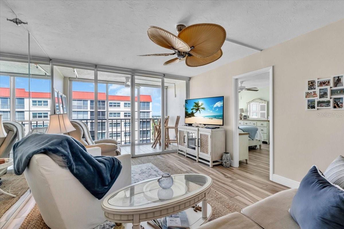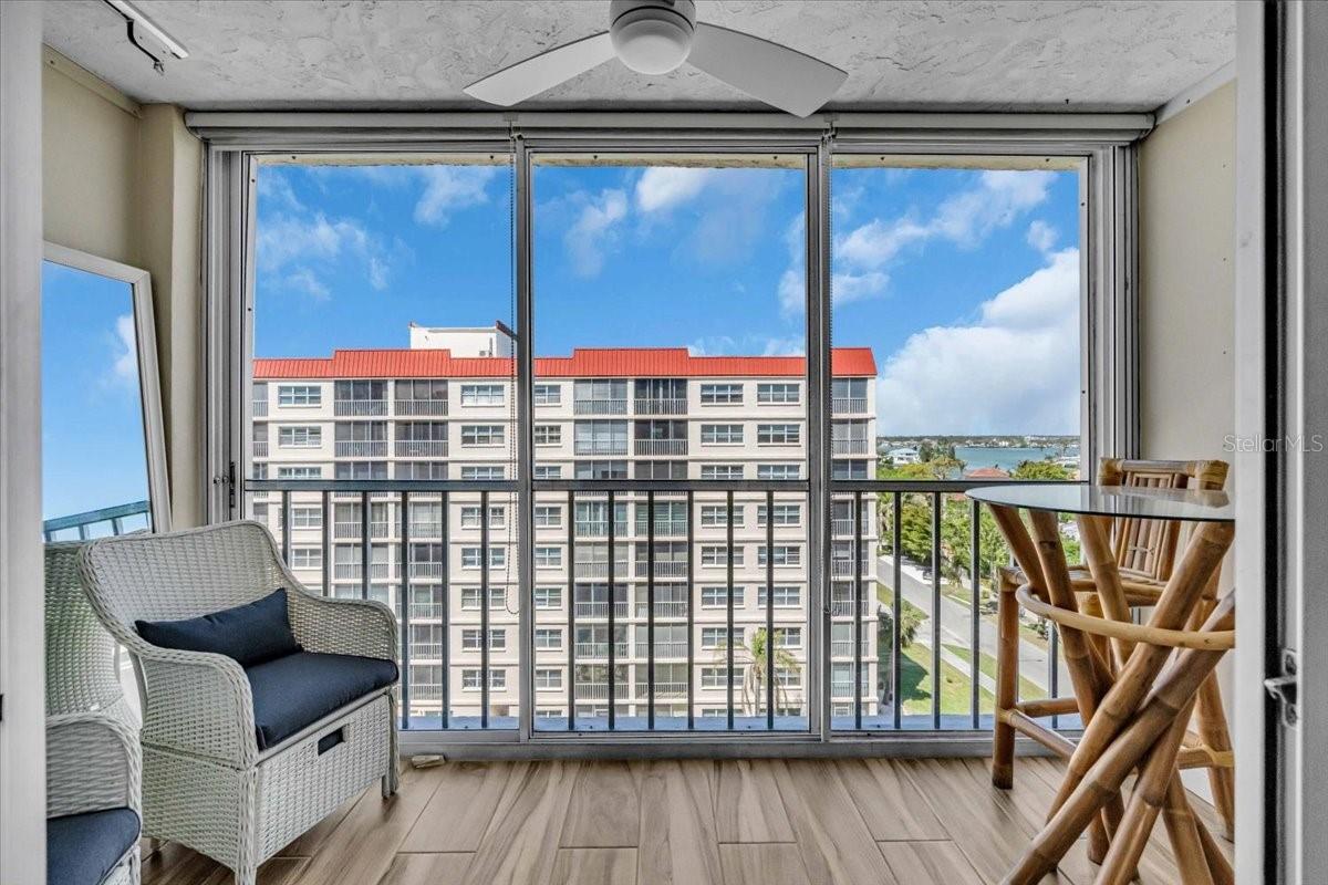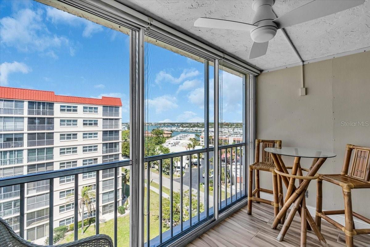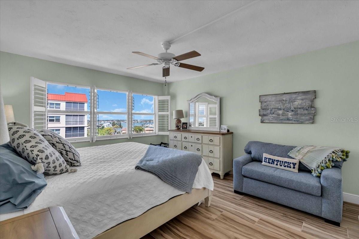 This stunning 8th-floor unit offers breathtaking water views of the Inter-coastal Water Way. Watch boats go by and enjoy the views Step inside to discover beautiful plank tile floors that add a modern touch throughout the space. The updated kitchen boasts newer appliances, a sleek deep sink, soft-close cabinets, and a stylish subway tile back splash, making it a delight for any home chef. The open-concept design seamlessly connects the dining area to the living room, creating a welcoming great room atmosphere. The spacious master bedroom is enhanced by plantation shutters and features an en suite bathroom with a walk-in shower and a walk-in closet. Enjoy picturesque views of the inter-coastal waterway from both the master bedroom and the living room, which opens onto a glass-enclosed lanai that is perfect for all-season living. The generous guest bedroom also features plantation shutters and its own en suite bathroom with a walk-in shower and a walk-in closet, offering privacy and comfort for visitors. This gorgeous, updated unit has plank tile flooring throughout, extending to the lanai, providing a cohesive and elegant look. With its fantastic location, you are a few blocks to the Historic Downtown Venice. Venice beaches, restaurants, and historic shops. Each unit includes a storage locker, and laundry facilities are conveniently located on each floor. This unit comes turn-key furnished, with the exception of a few personal items, making it ready for you to enjoy right away!