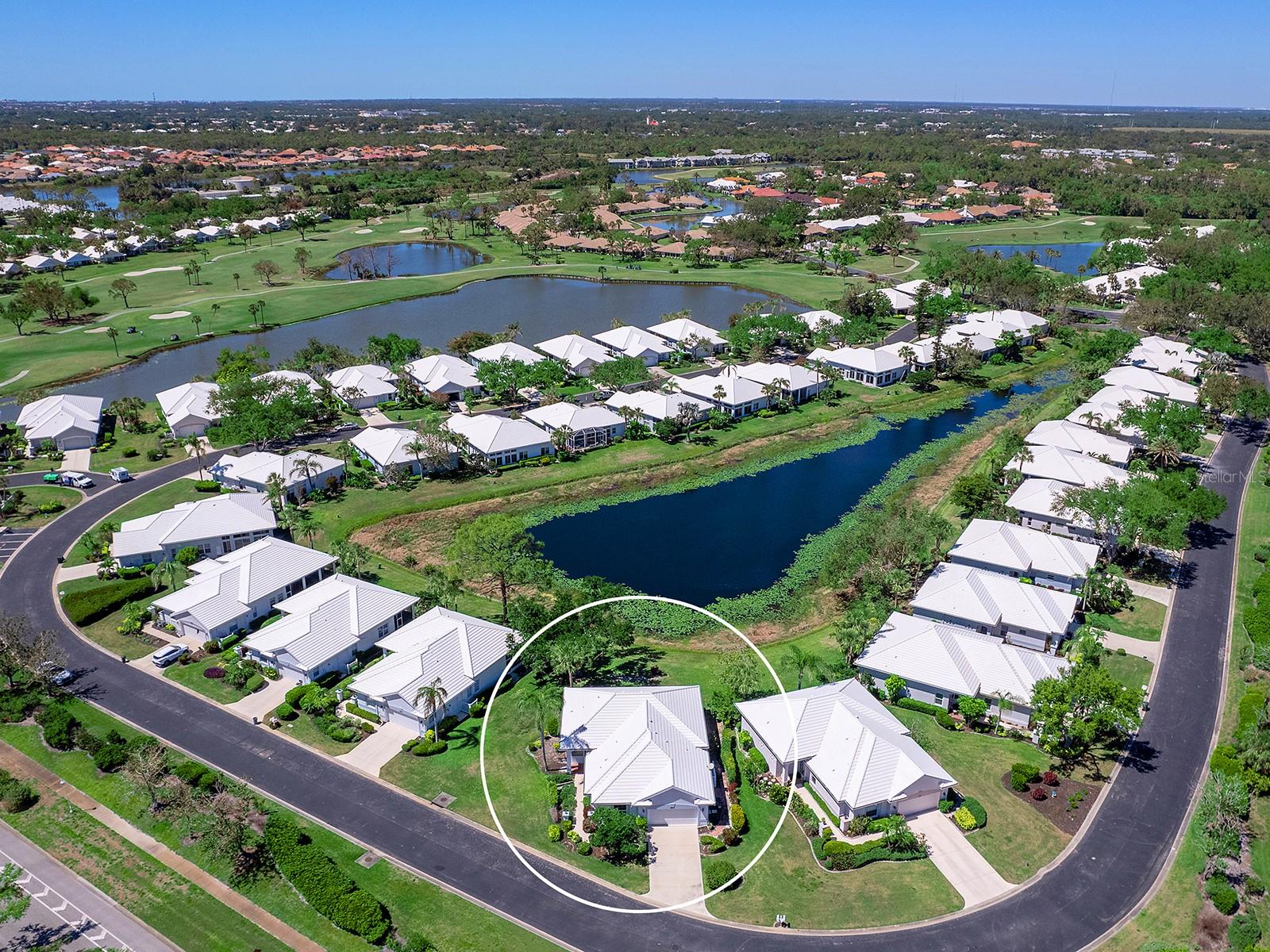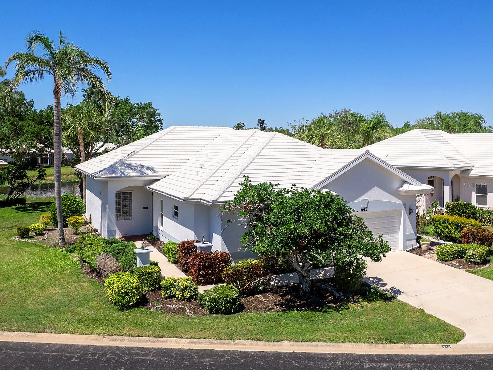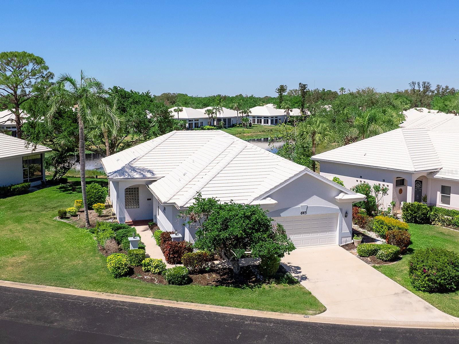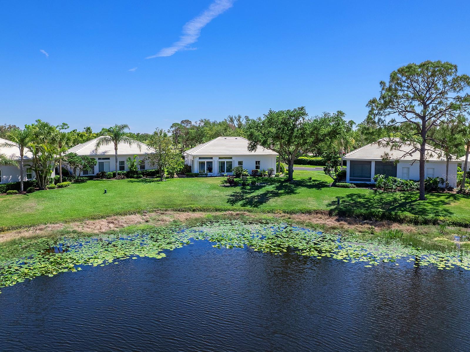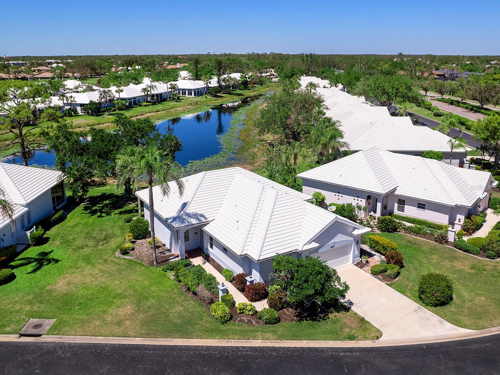 Unique maintenance-free single-family home treated as a condominium. The home was custom designed by first owners with vast open great room space, ideal for setting up different living areas, craft, artist studio or leisure game activities and wet bar for entertainment. Indirect lighting is also a feature of this home. An attached feature sheet shows many additional high-level construction or architectural elements that enhance the value of this home, such as block wall insulation more than R-5 and frame wall more than 5-11, whole-house attic fan, heat recovery unit with air conditioner and high efficiency water heater. For peace of mind windows are impact hurricane-resistant with shutters as well and provide much light and overlooks large pond. The home also has newer roof with exterior maintenance provided in condominium fee. The high ceilings add to the openness of the living space. The kitchen has large number of cabinets and two cabinets with lift shelving and power for appliances, and sprawling counter space and island for entertaining. The primary bedroom is at rear of home with views of the pond and large walk-in closet. The bath has dual vanities, and high-level walk-in Jacuzzi tub with shower and separate walk-in tile shower. The guest bedroom and bath are a split design for guest privacy and office with French doors and much light for working remotely. The home is a short distance to community clubhouse and pool. The Plantation Golf and Country Club provides equity ownership for all who desire social, tennis or golf membership sold separately. The club has fine dining, upscale fitness centers, bocci and 13 tennis and six pickleball courts. The community is convenient to shopping, area beaches, parks, and downtown Wellen Park center and Atlanta Braves spring training ballpark. So much more and ease of ownership to enjoy the wonderful Florida lifestyle. See, easy to show.