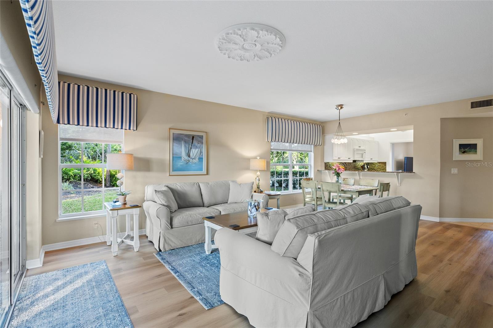 BUYER FINANCING FELL THROUGH - NO INSPECTION ISSUES - MOTIVATED SELLERS!! Welcome to this well-maintained and thoughtfully upgraded ground-level end-unit condo, offering breathtaking lake views and an abundance of natural light throughout the day. This move-in ready-TURNKEY home boasts a spacious layout with ample storage, including two walk-in closets, and a peaceful setting enhanced by a private garden area and a lush grassy space adjacent to the lanai. Inside, the cohesive decor and high-end finishes create an inviting and stylish atmosphere. The home features luxury vinyl plank flooring (2022) in the living, dining, and bedroom areas, complemented by ceramic tile in the remaining rooms. Plantation shutters adorn the front windows, while new valances and roller blinds (2024) grace the rear rooms, adding both beauty and functionality. The updated kitchen is a chef’s delight, showcasing granite countertops, a sleek glass tile backsplash, and modern fixtures. It is fully stocked with 12 place settings of dinnerware and cutlery, an array of glassware, and serving platters—perfect for entertaining! The upgrades continue with modernized lighting and fixtures in the dining room, kitchen, and both bathrooms. Comfort and convenience are at the forefront, with a WiFi-enabled AC/heat thermostat and dehumidifier control, allowing you to adjust temperature and humidity levels remotely from your phone or computer. This fully furnished, TURNKEY home also includes bedding, towels (including beach and pool towels), placemats, and cloth napkins, making your transition seamless. Don’t miss this opportunity to own a beautifully updated, light-filled condo in a prime Venice location at Waterside Village which features a main clubhouse with library, three pools-where one is 100 steps from your front door, pickleball, tennis, shuffleboard, pool aerobics, book club, euchre, bingo, ladies luncheons and more! Centrally located to all Venice, Sarasota and Wellen Park have to offer. Call for your tour today!