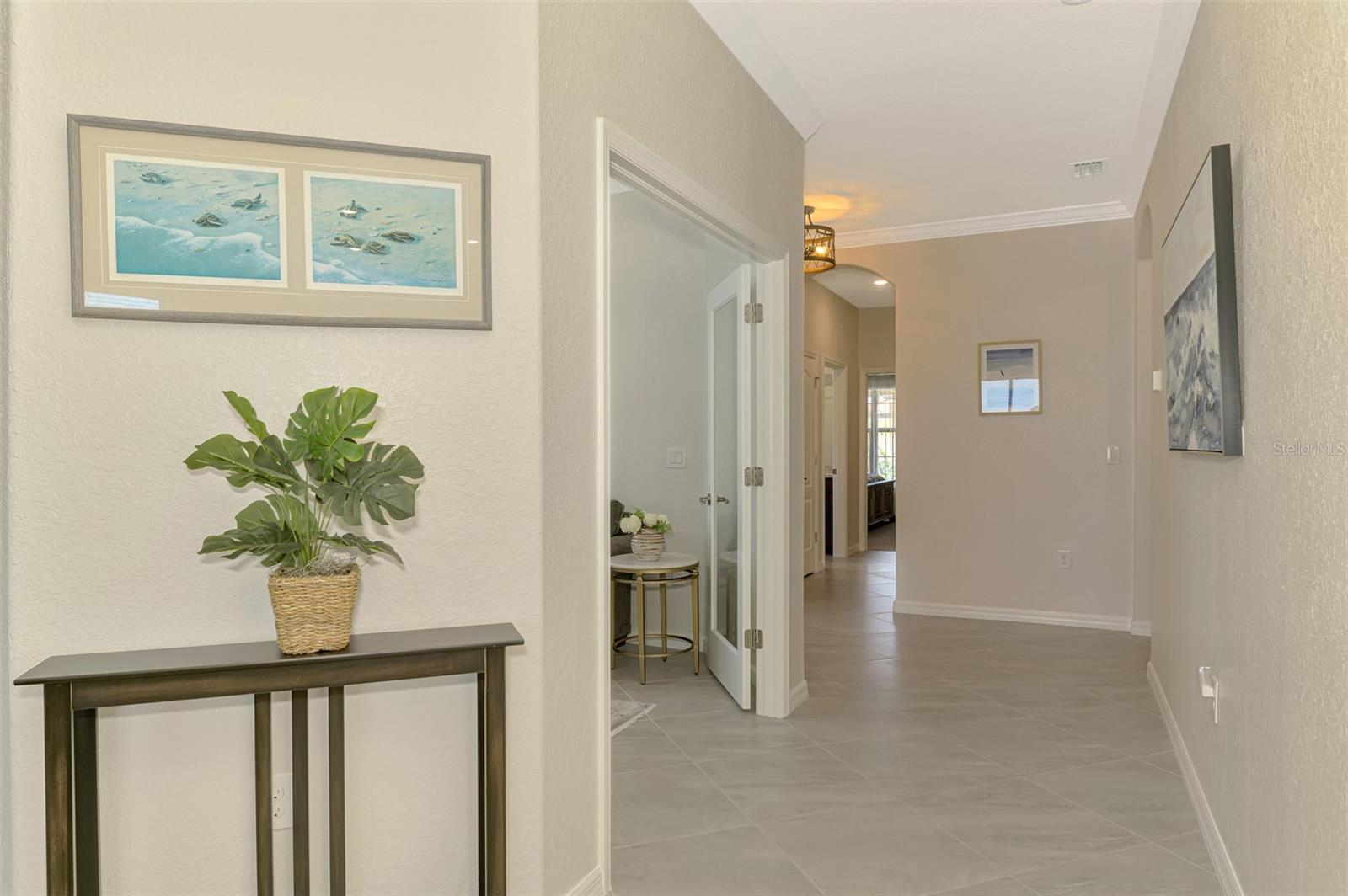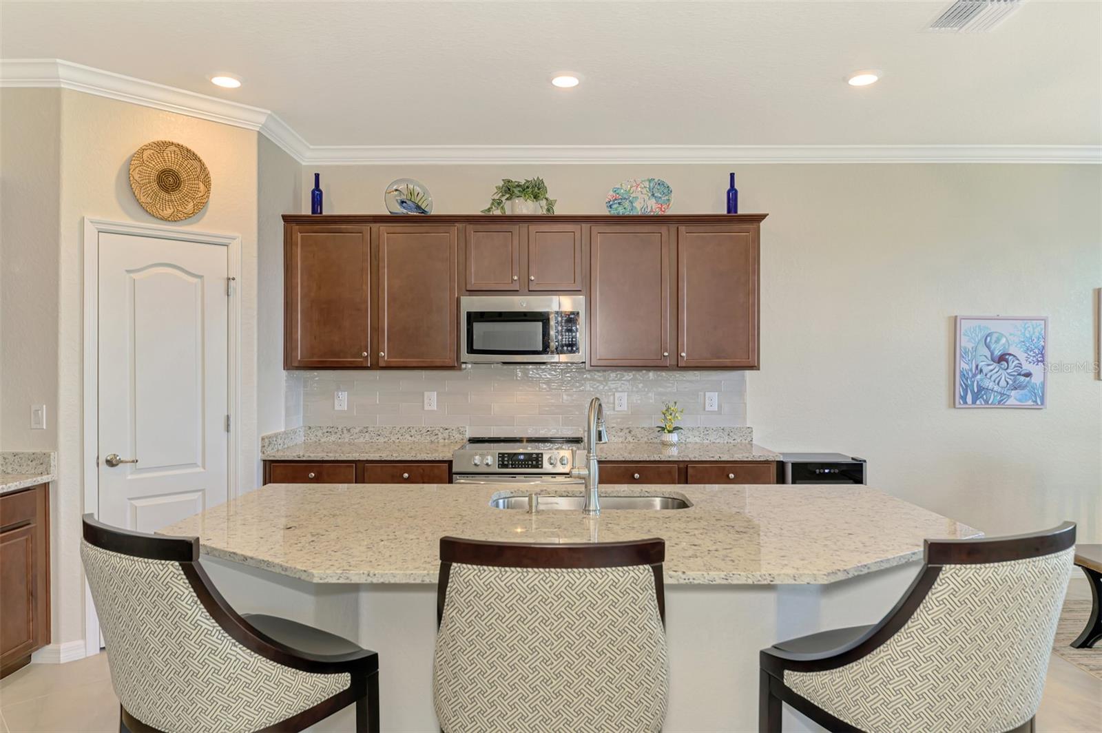 PRICE REDUCED! Seller will pay the entire Golf Course assessment of $15,600! Incredible Waterfront and Golf Course Views from the center of the largest lake in Sarasota National Golf and Country Club includes 2 Golf memberships for the 18-hole Gordon Lewis championship golf course and all amenities. Sarasota National is an Audubon International Certified Signature Sanctuary surrounded by lakes and wetlands with beautiful wildlife. Stylish home comes with Elegant High-End furnishings from Havertys, hosting 2 bedrooms, 2 baths, Den-Office with glass French doors, one of the best lake views and maintenance free. Private screened entrance to 8 ft. beveled glass door leads to the foyer with arched architecture, an extraordinary great room boasting high ceilings with decorative crown molding, Hunter ceiling fan, Whole house water filtration system, New Sun Shade for the 3 sliders. Screened lanai includes Storm Smart electric roll-down Hurricane Shutters leading to a large backyard with room for a pool! Chefs’ kitchen with 42-inch wood cabinets, granite counters, deep pot sink, Large Breakfast Island, upgraded stainless steel appliances, new oven with air-fryer, wine refrigerator, glass tile backsplash, under cabinet lighting and walk-in pantry. Spacious dining room has designer lighting and peaceful views of the lake. The king-sized primary suite boasts a large walk-in closet with built-in organizer, a beautiful glass walk-in shower, dual sink vanity with granite counters and private water closet. Separate guest area bedroom and new designer glass shower in the bath. The entire home is freshly painted with neutral colors, stylish lighting, custom window treatments, large tile on the diagonal throughout with carpet in the bedrooms, inside laundry has built-in sink and cabinets for storage, Security system, 2 car garage with sealed brick paver driveway and lanai. Fantastic open floor plan, perfect for entertaining! Amazing Amenity Campus has state-of-the-art clubhouse, 3 full-service restaurants, coffee lounge with TV’s-internet-library and pool side “Tiki Bar” to watch your favorite sports. “Dragonflies” on site Spa for facials and massage, well-appointed fitness center, locker room-showers and instructed classes, Resort style swimming pool, lap pool, water aerobics, tennis, pickle ball, bocce ball, playground, 2 dog parks and managed events for you to enjoy! Sarasota National is located close to the Atlanta Braves Spring training facility, Wellen Park for shopping and restaurants, historical downtown Venice and beautiful beaches. Call today for your private appointment to view this exceptional home!